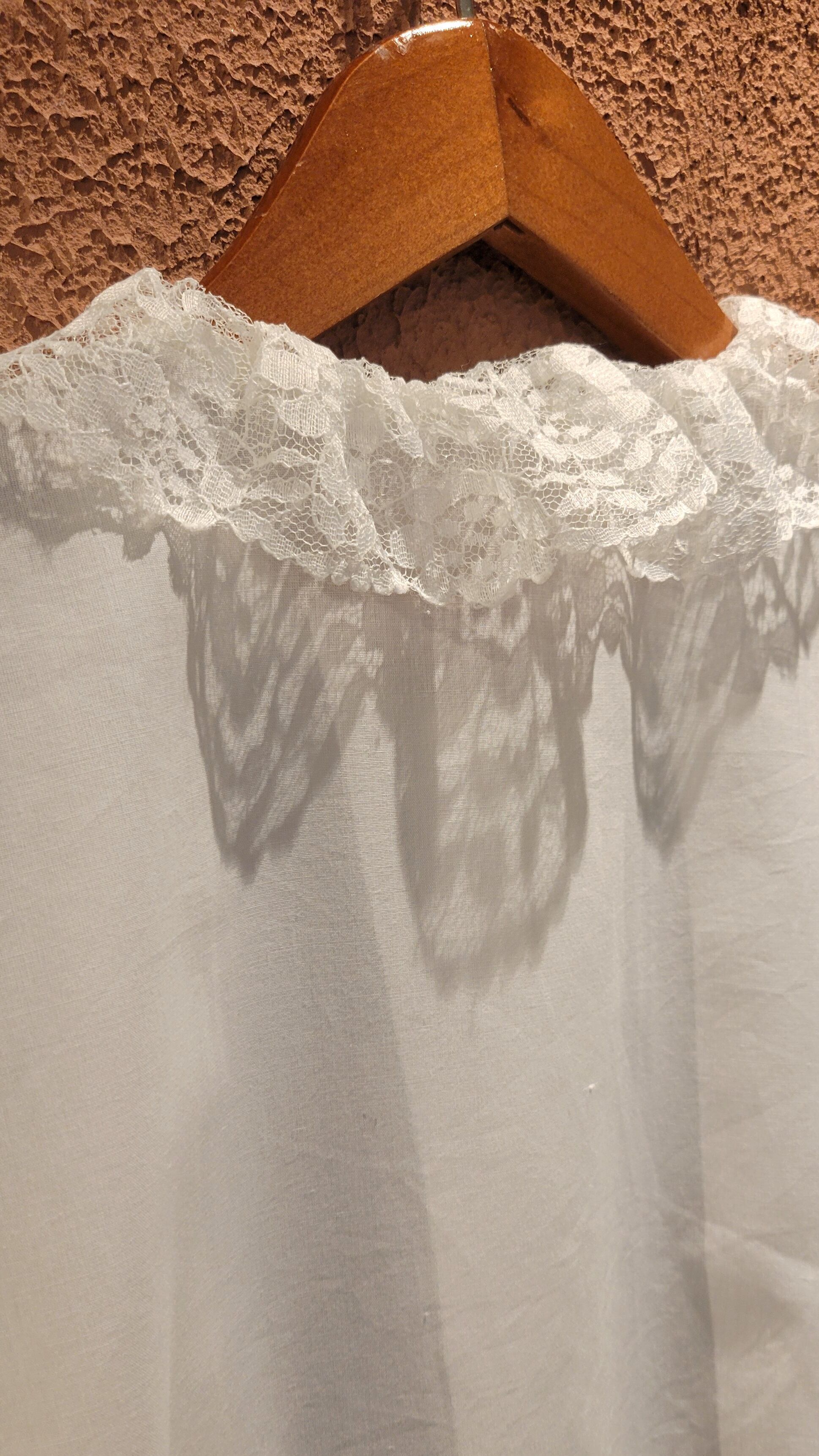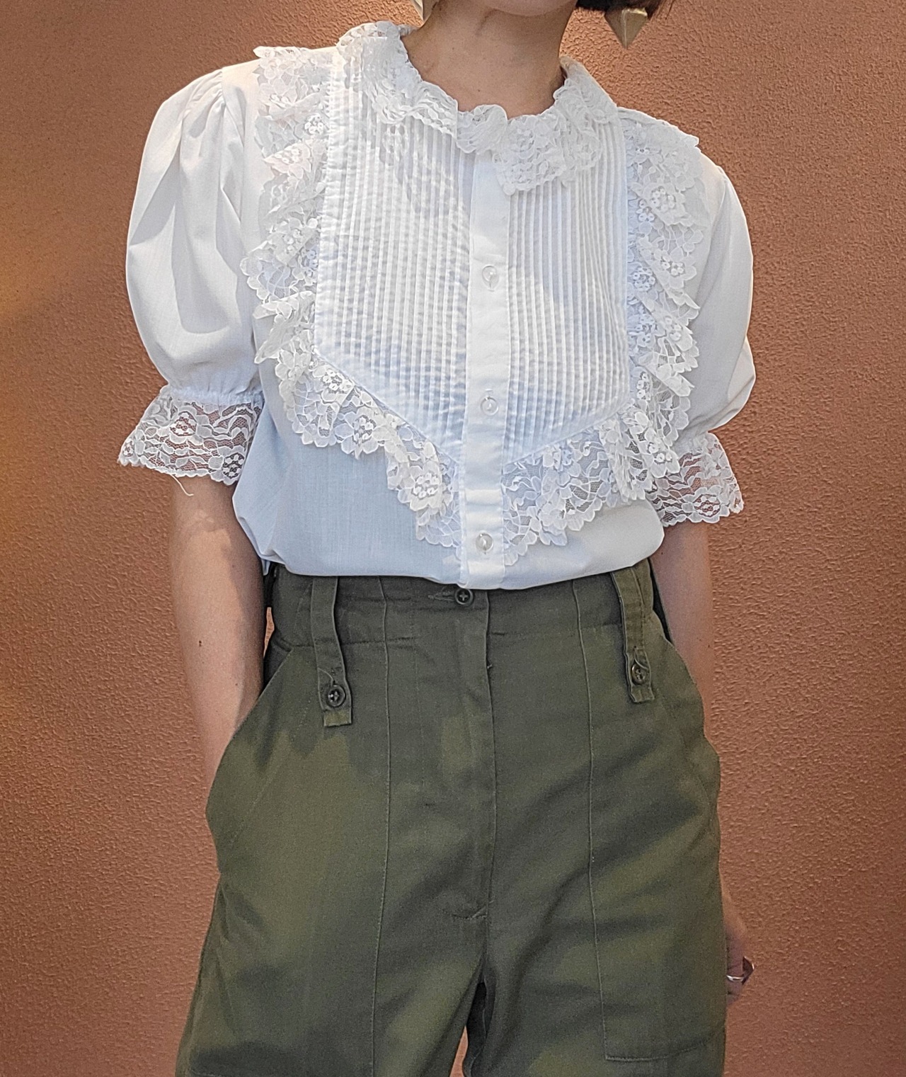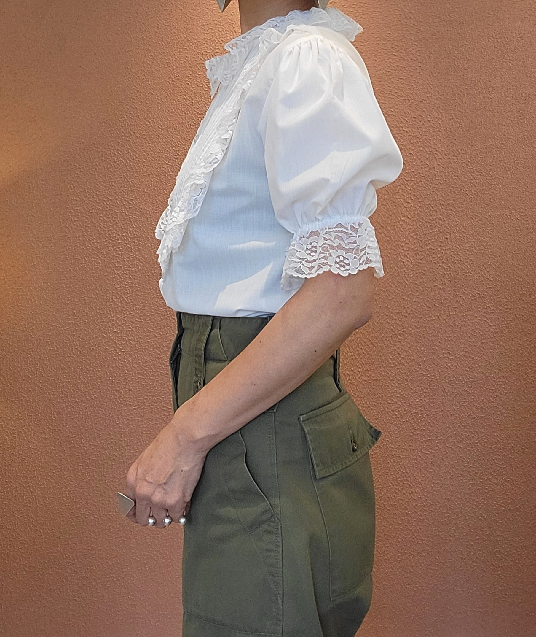 ヴィンテージのレースブラウス。素材表記はありませんがコットンとポリエステルの混紡素材のようです。コンパクトなサイズ感にボリュームスリーブがめりはりのあるシルエット。ボトムにインはもちろん、アウトで着てもバランスの取りやすい丈感でスタイリングの幅が広がります。