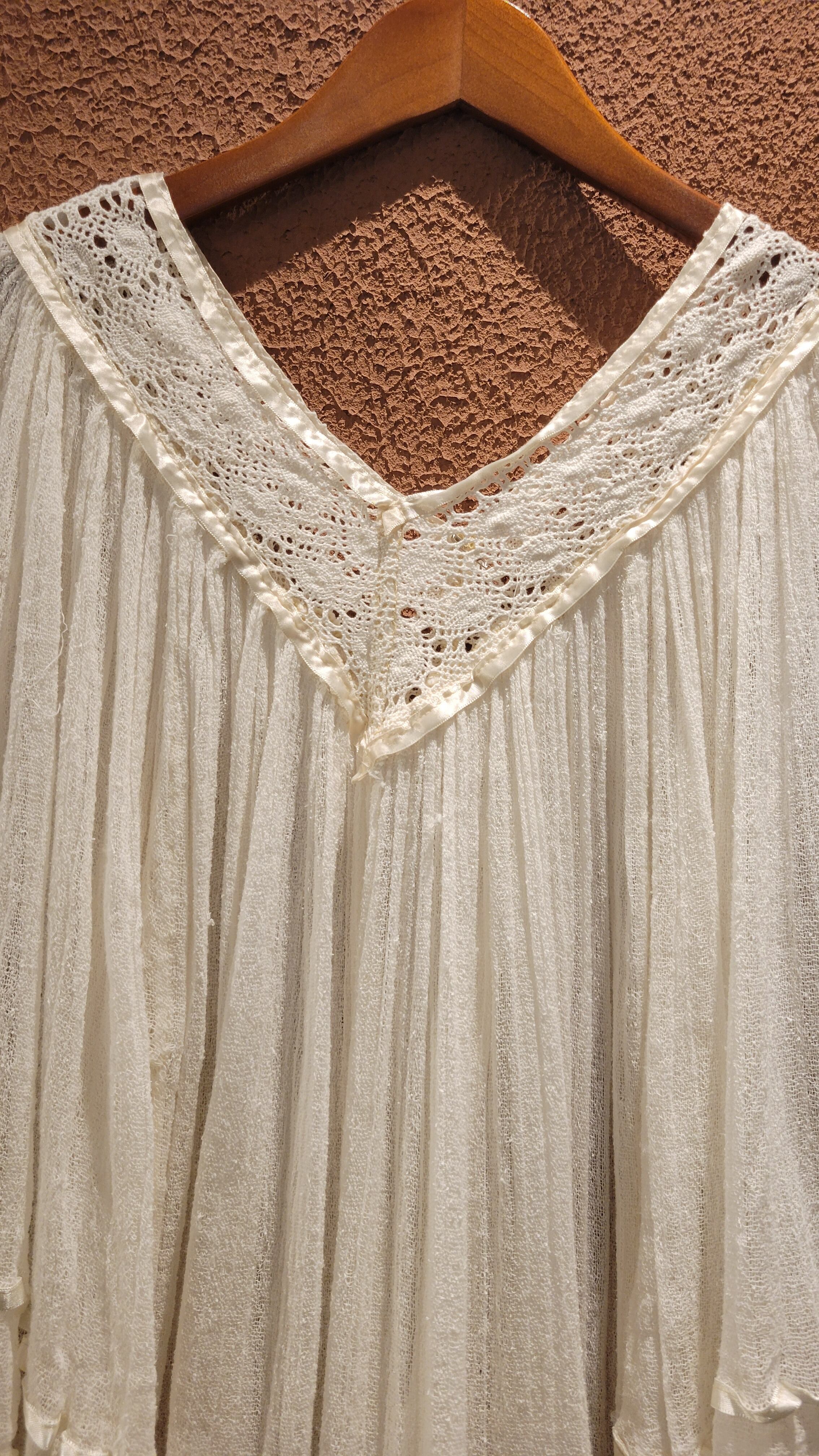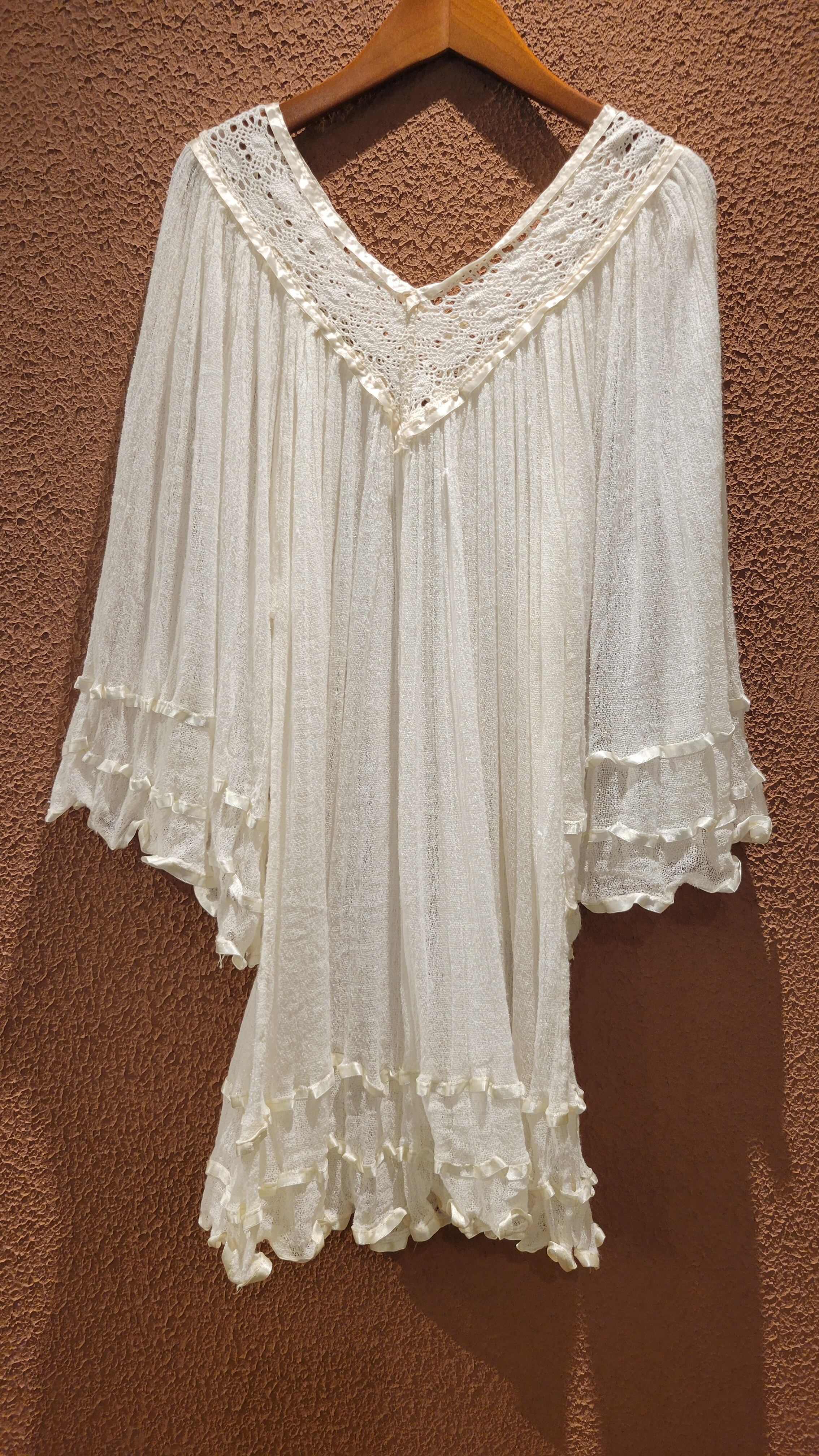 ヴィンテージのギリシャチュニック。素材表記はありませんがとても薄手のコットンガーゼです。透け感があります。細かいギャザーが施され動きに合わせて揺れる様が儚げで美しい1枚。
