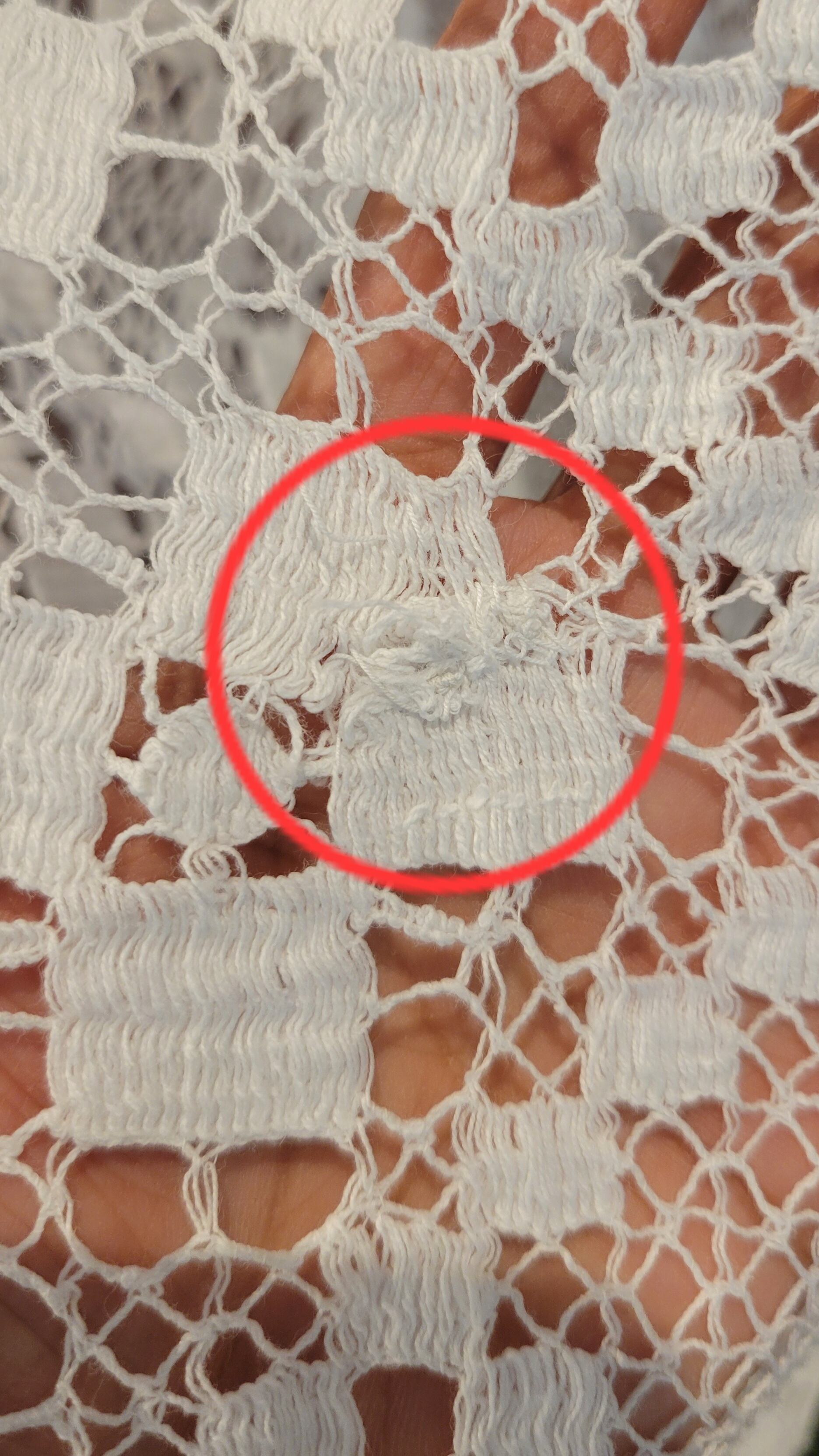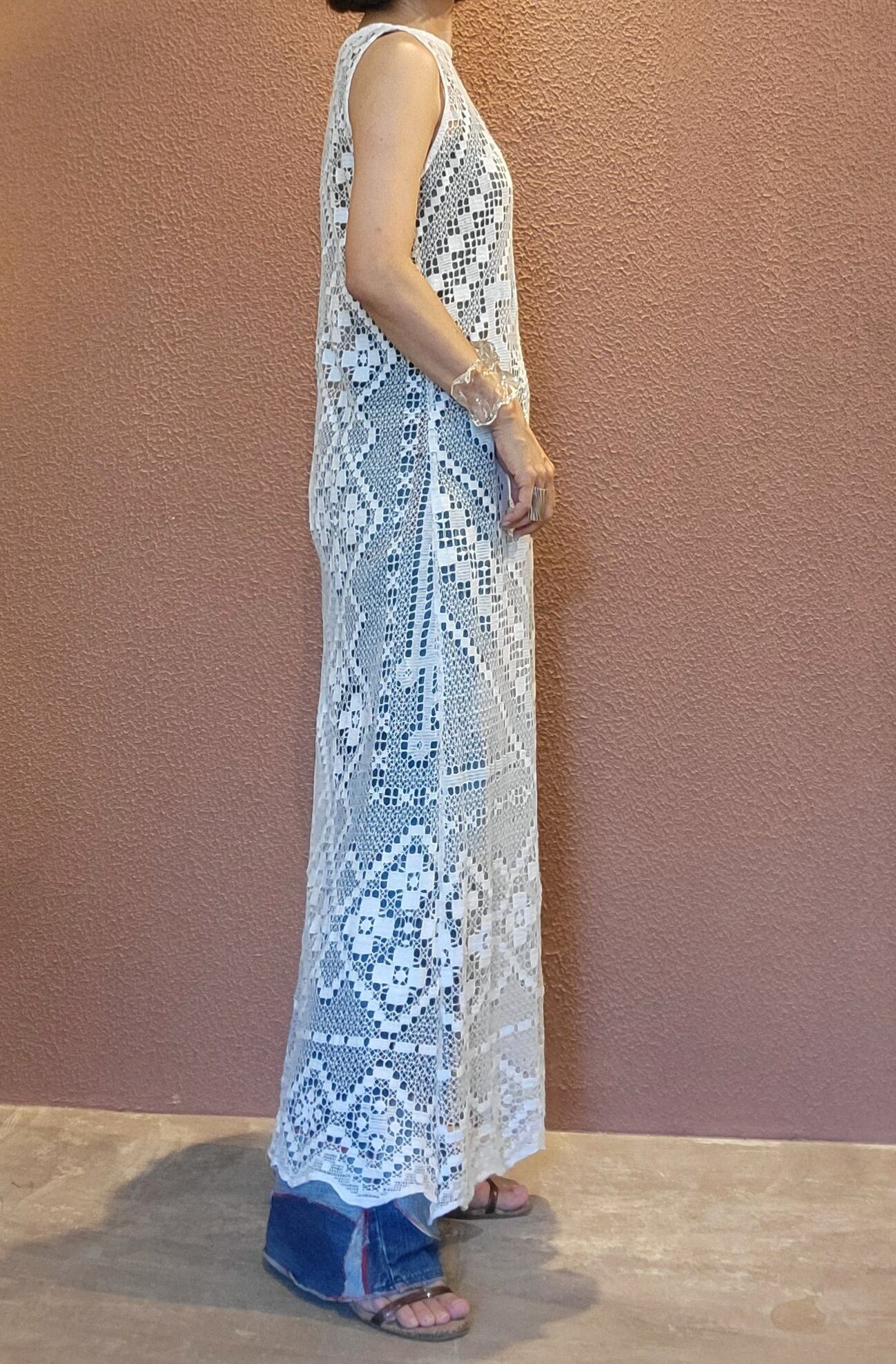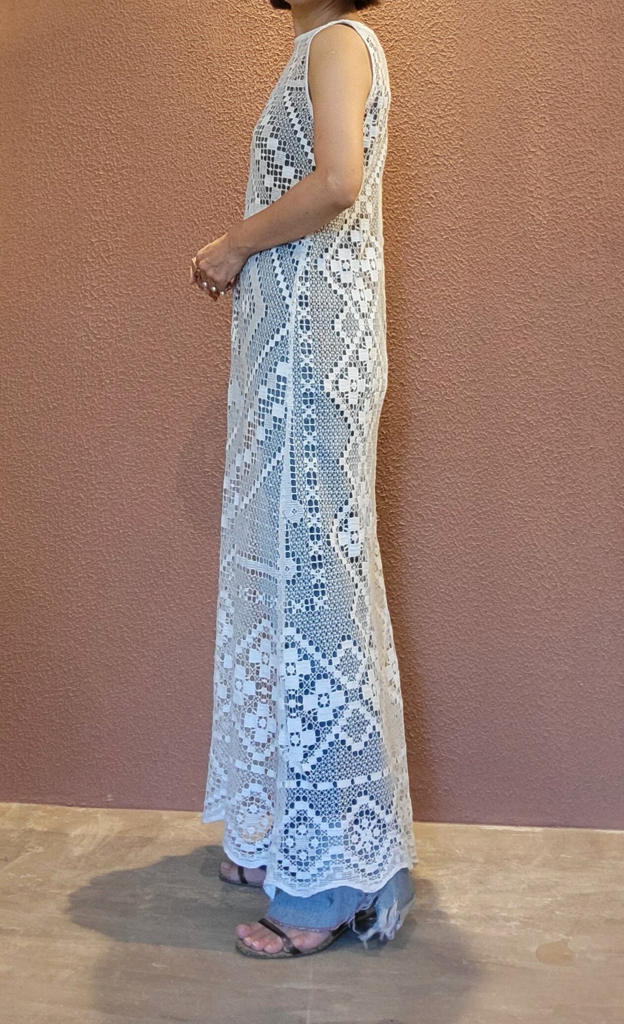 ヴィンテージレースを使用したリメイクワンピース。素材表記はありませんがコットンのようです。バックファスナー付き。繊細なレースにたっぷりのマキシ丈、すっきりしたIラインシルエットが大人っぽい雰囲気です。*レースの修繕跡が数カ所あります。画像でご確認ください。