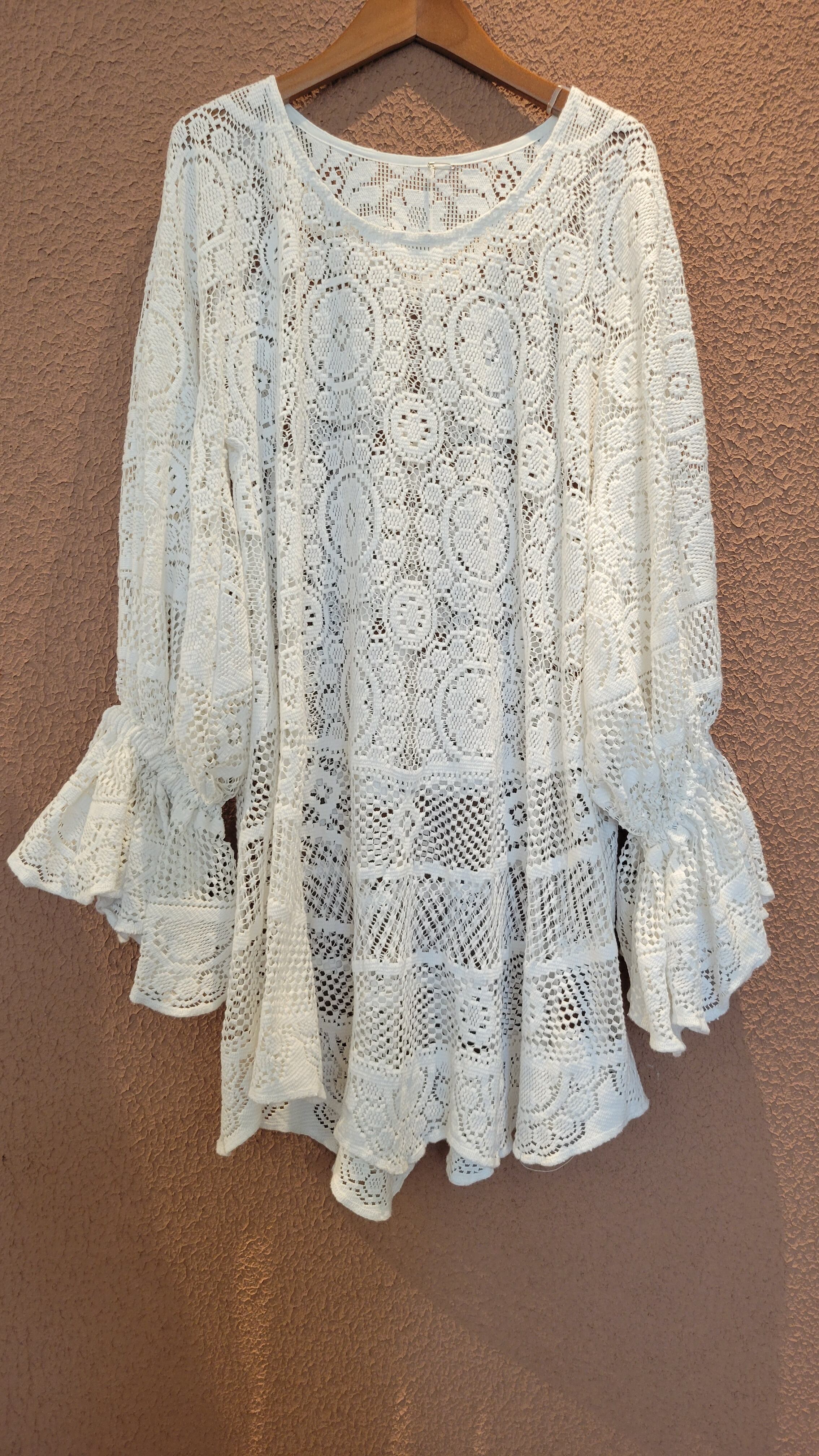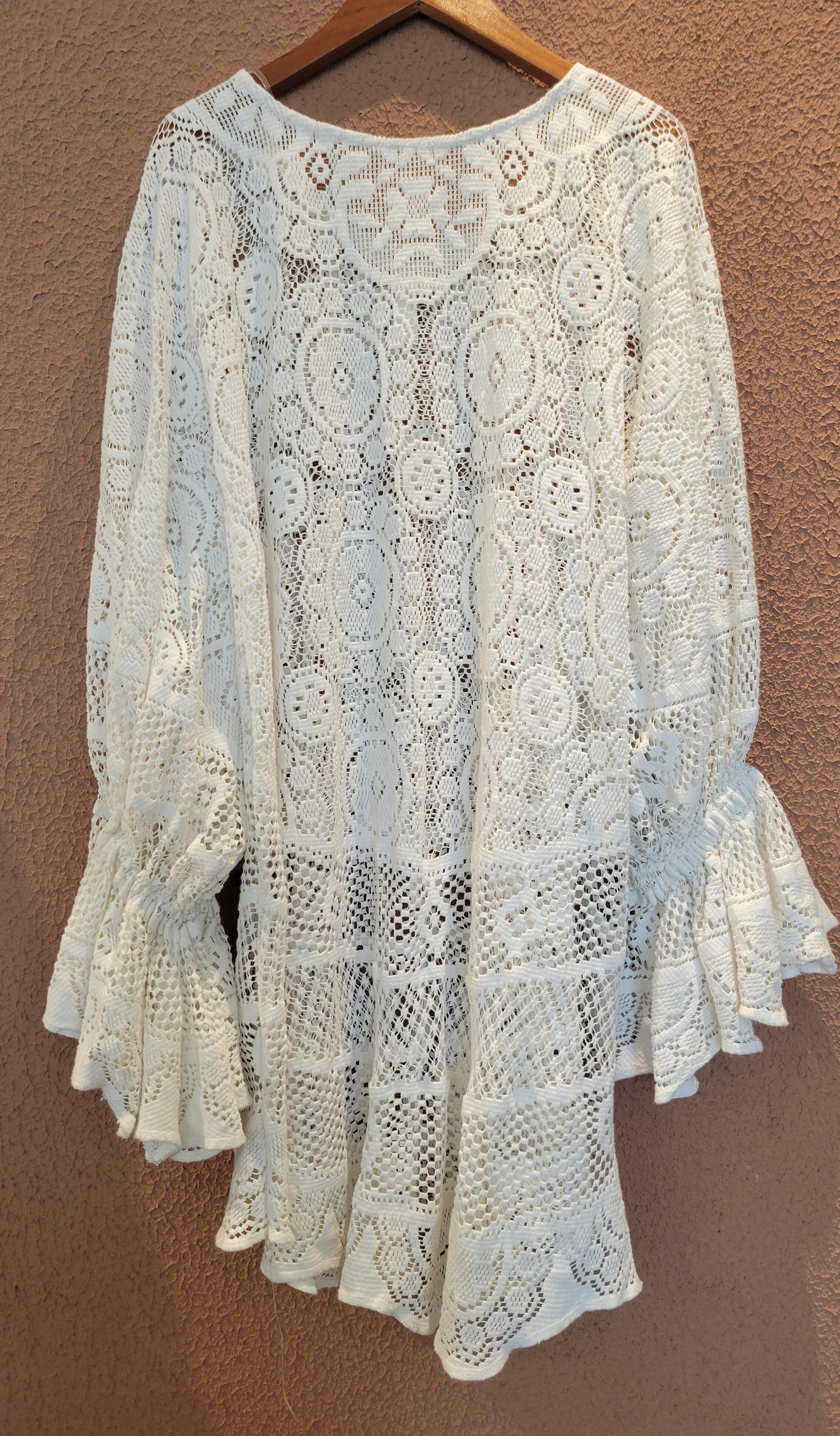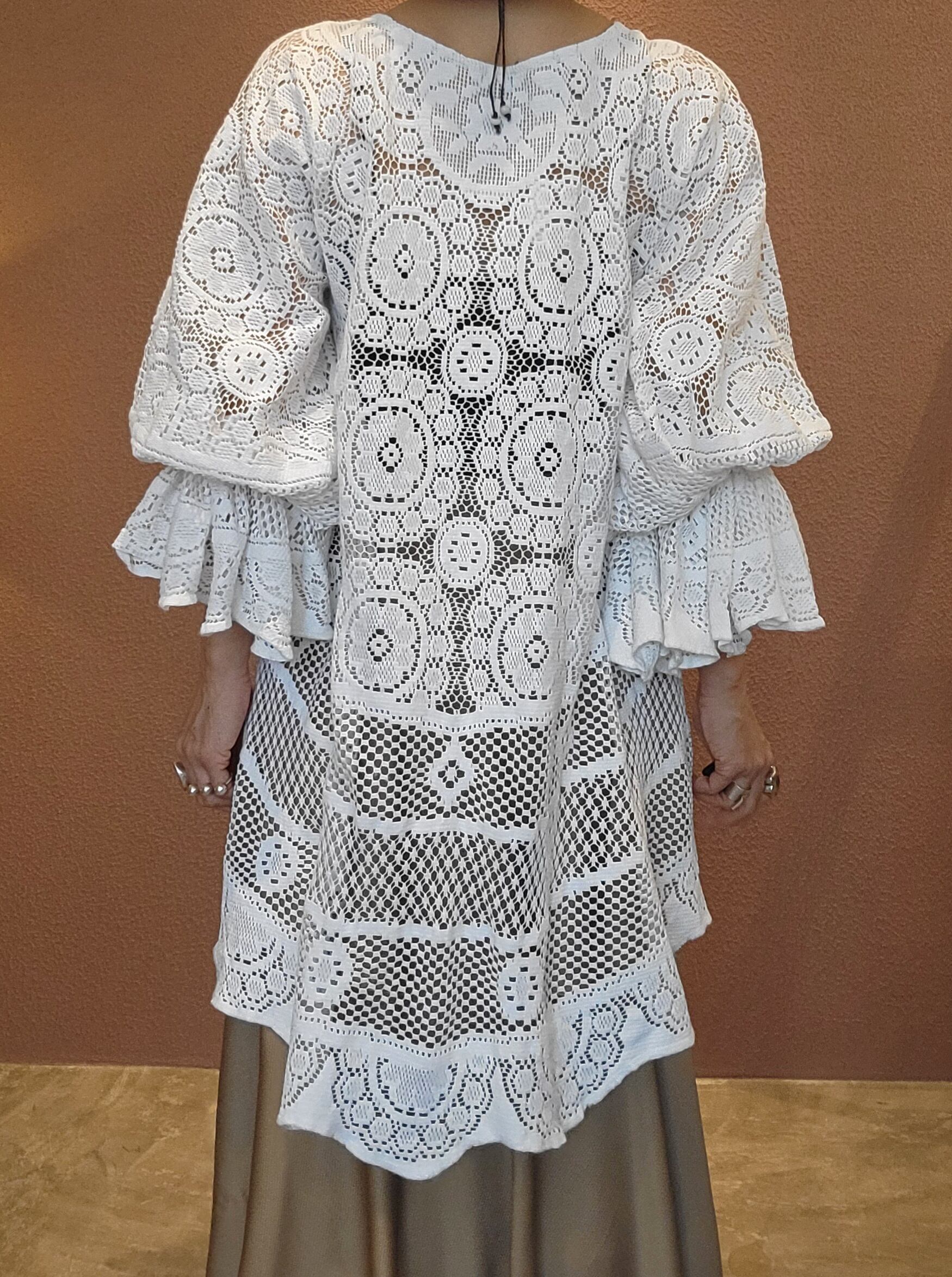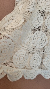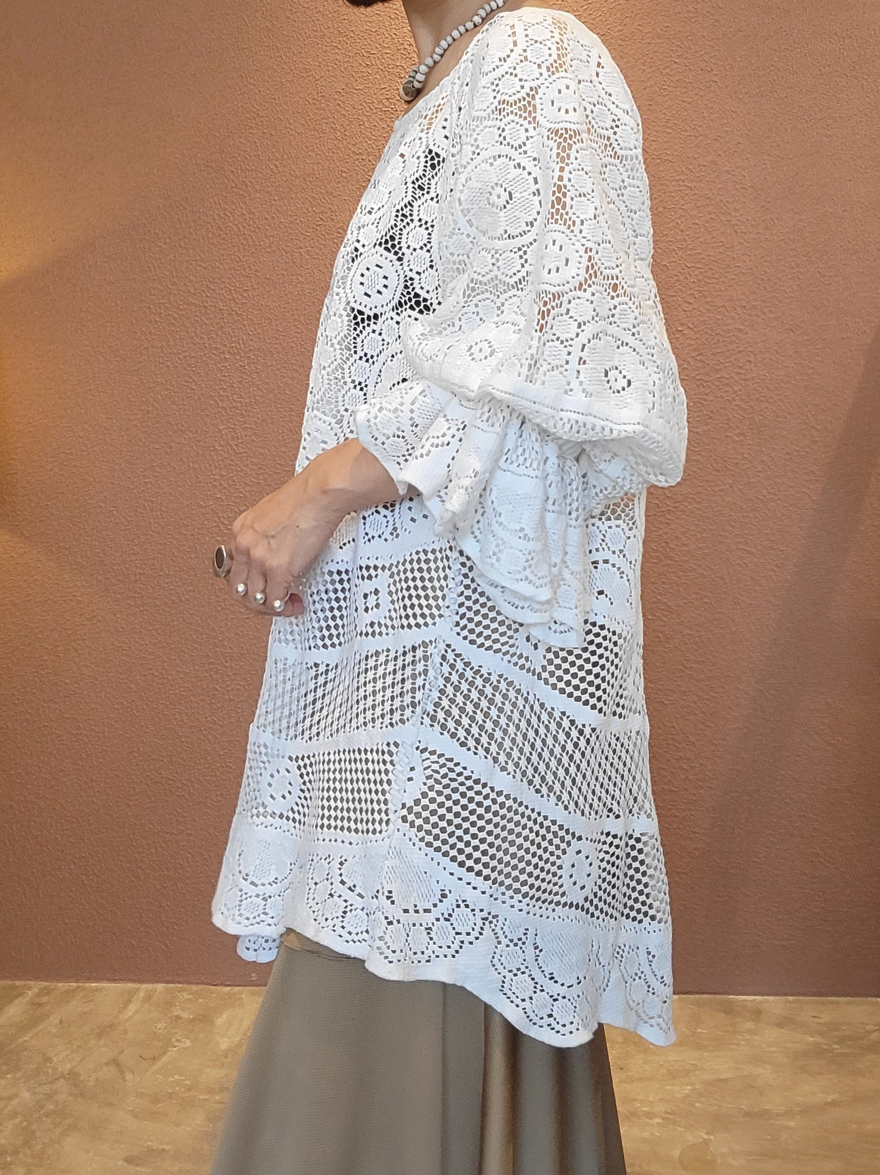 ヴィンテージレースを使用したリメイクトップス。素材表記はありませんがしっかりしたコットンのようです。袖口ゴム、身ごろはフレアがかかりボリューム感のあるシルエット。デニムやミリタリーパンツ等の無骨なボトムにも良く合います。