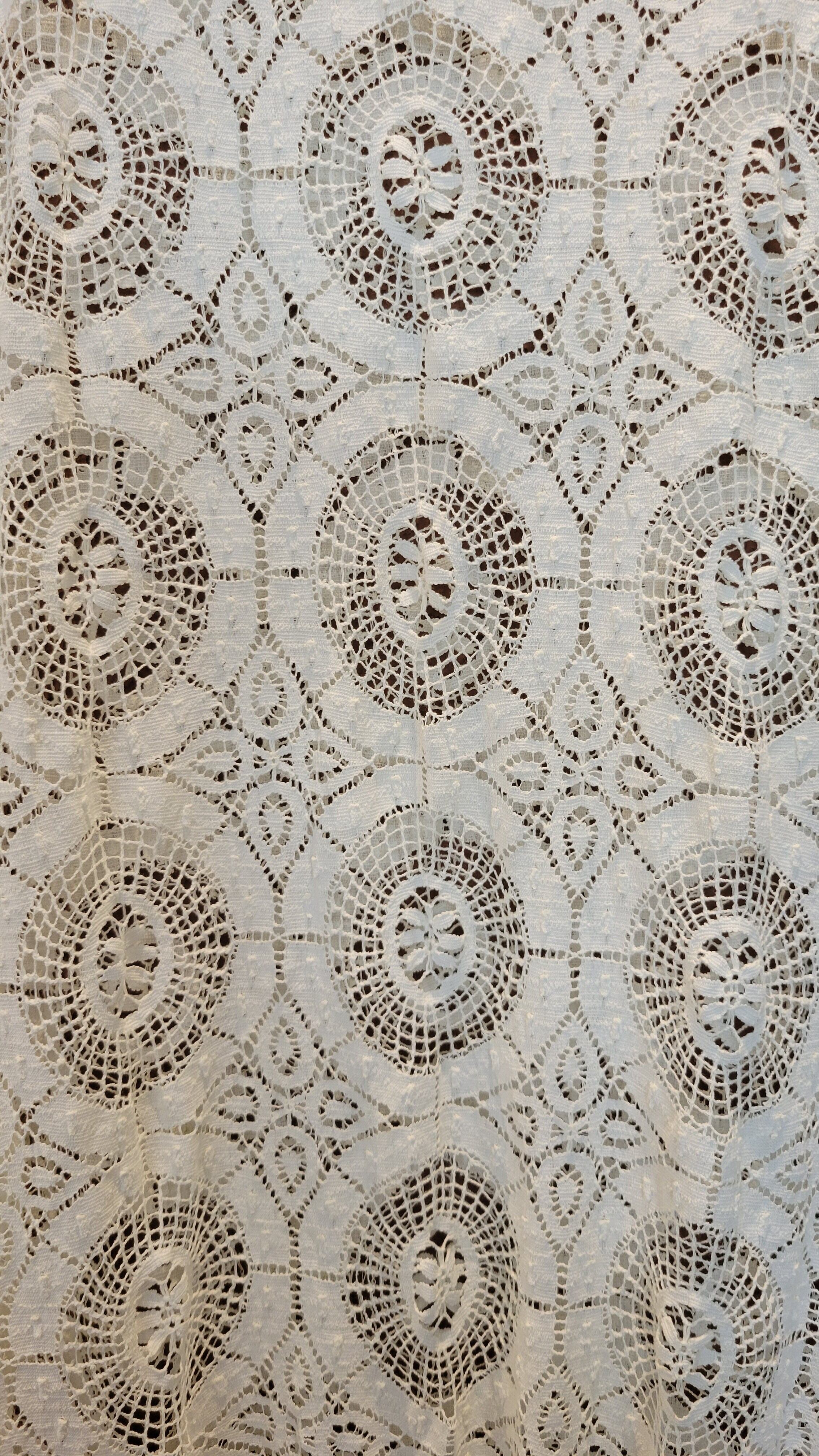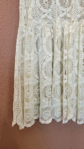 ヴィンテージレースを使用したリメイクワンピース。素材表記はありませんがコットンのようです。ファスナーは付いておらず頭から被って着用するプルオーバータイプ。アームホール広めです。裾のたっぷりのギャザーがふんわり可愛いらしいです。甘めのスタイリングはもちろんデニムやミリタリーパンツ等、無骨なボトムに合わせてカジュアルにスタイリングもできます。