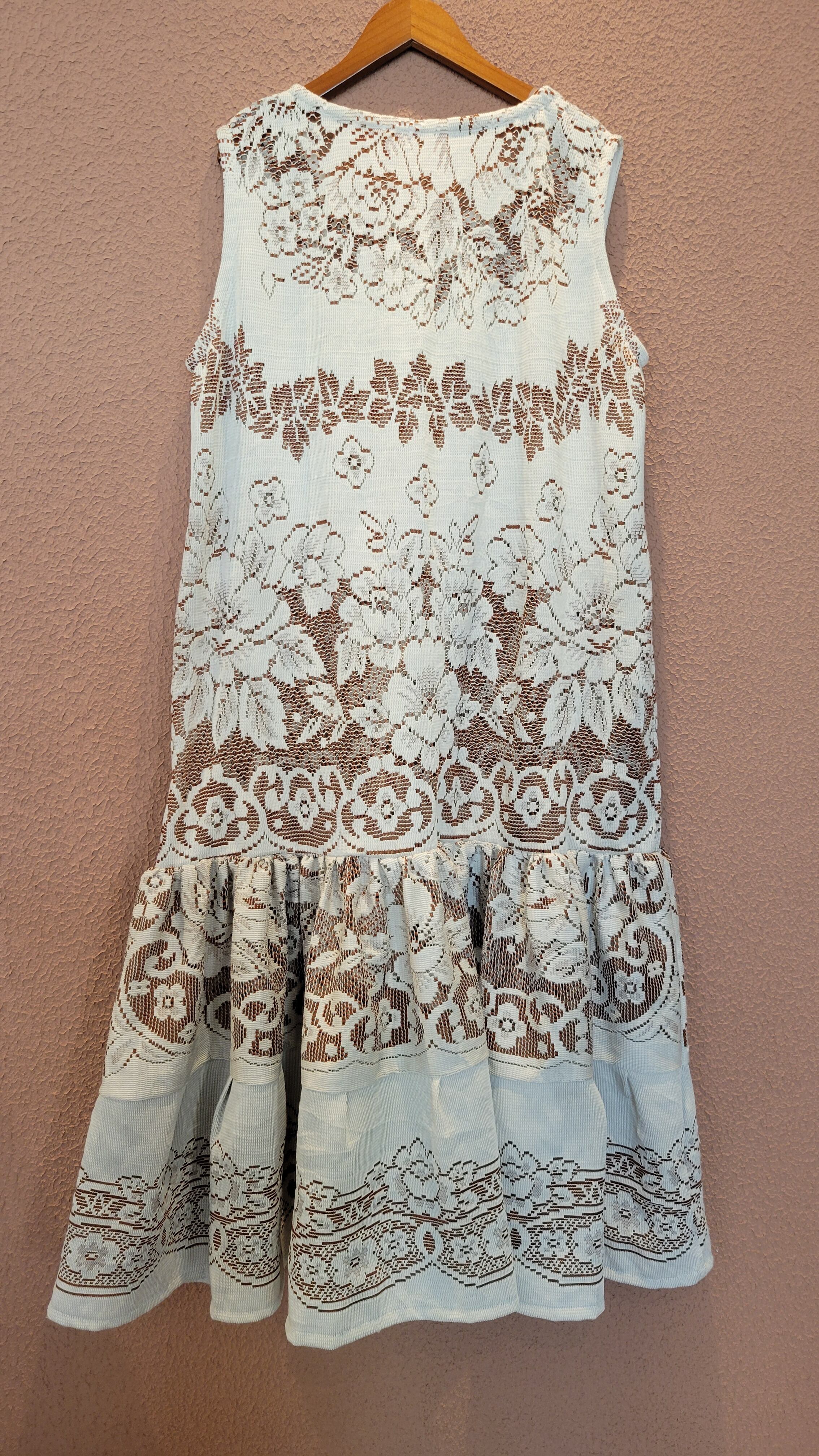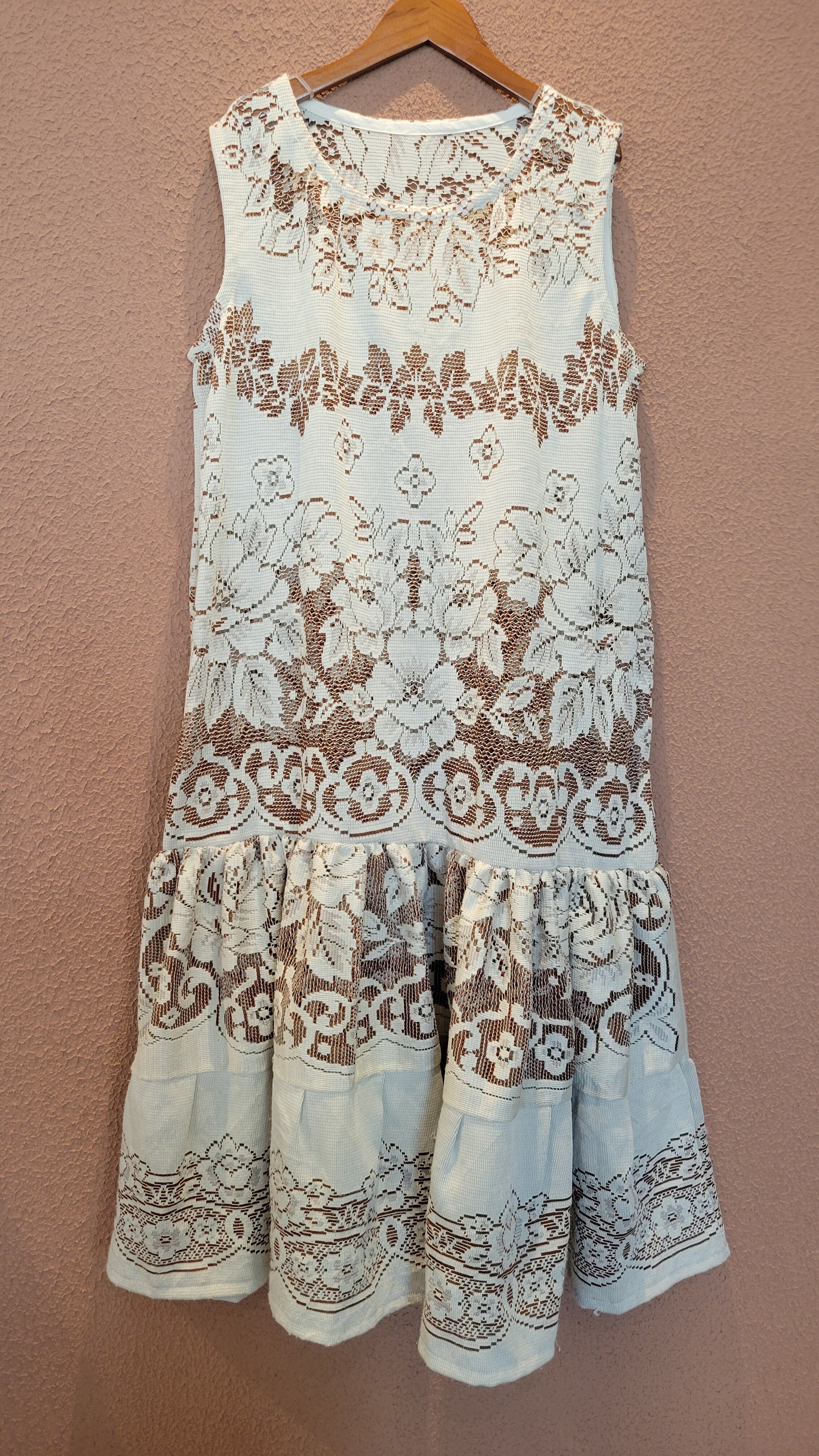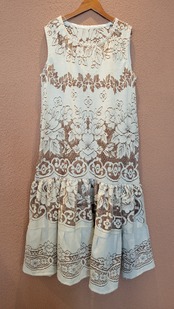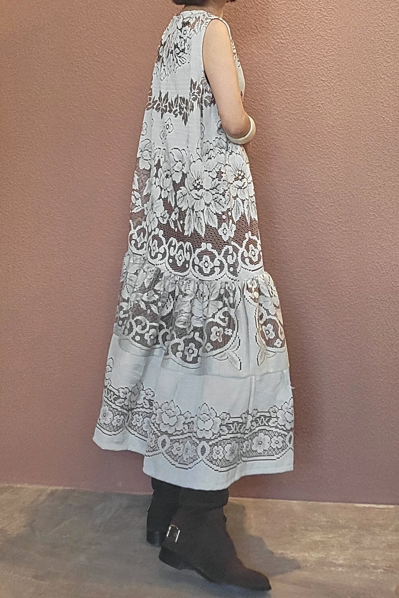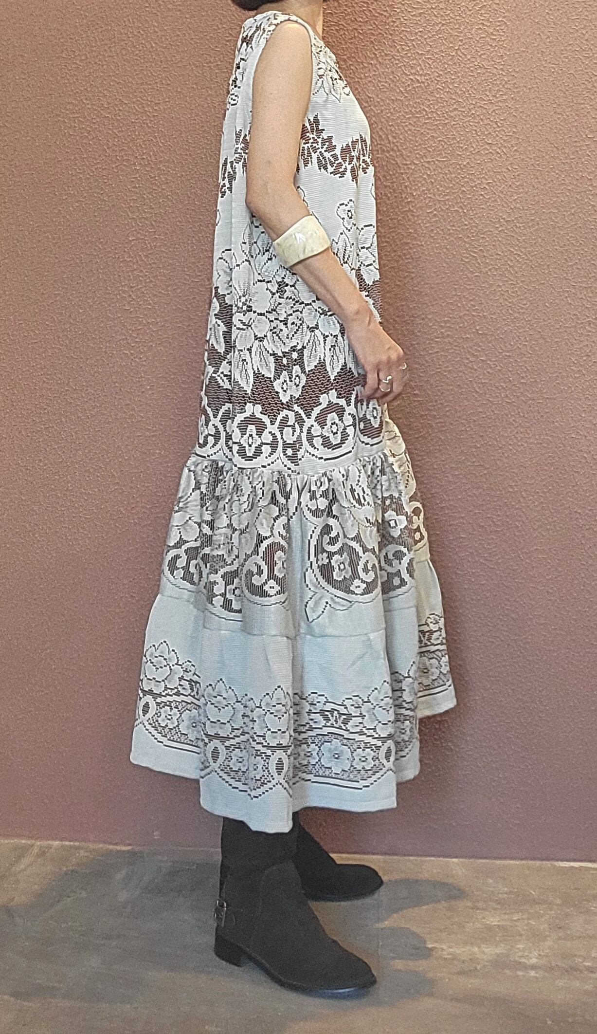 ヴィンテージレースを使用したリメイクワンピース。素材表記はありませんがポリエステルのようです。ファスナーは付いておらず頭から被って着用するプルオーバータイプ。アームホール広めです。裾のたっぷりのギャザーがふんわり可愛いらしいです。甘めのスタイリングはもちろんデニムやミリタリーパンツ等、無骨なボトムに合わせてカジュアルにスタイリングもできます。