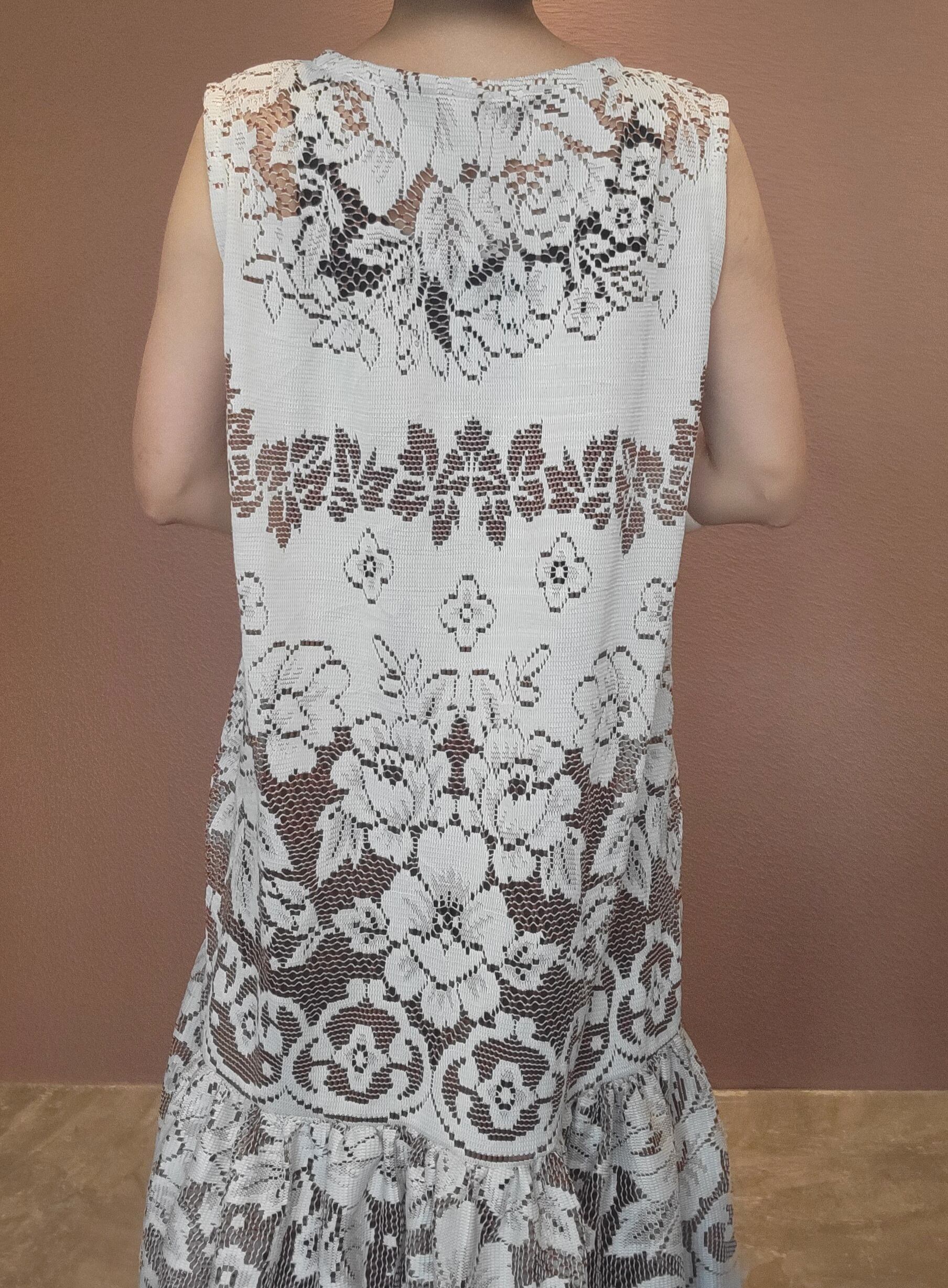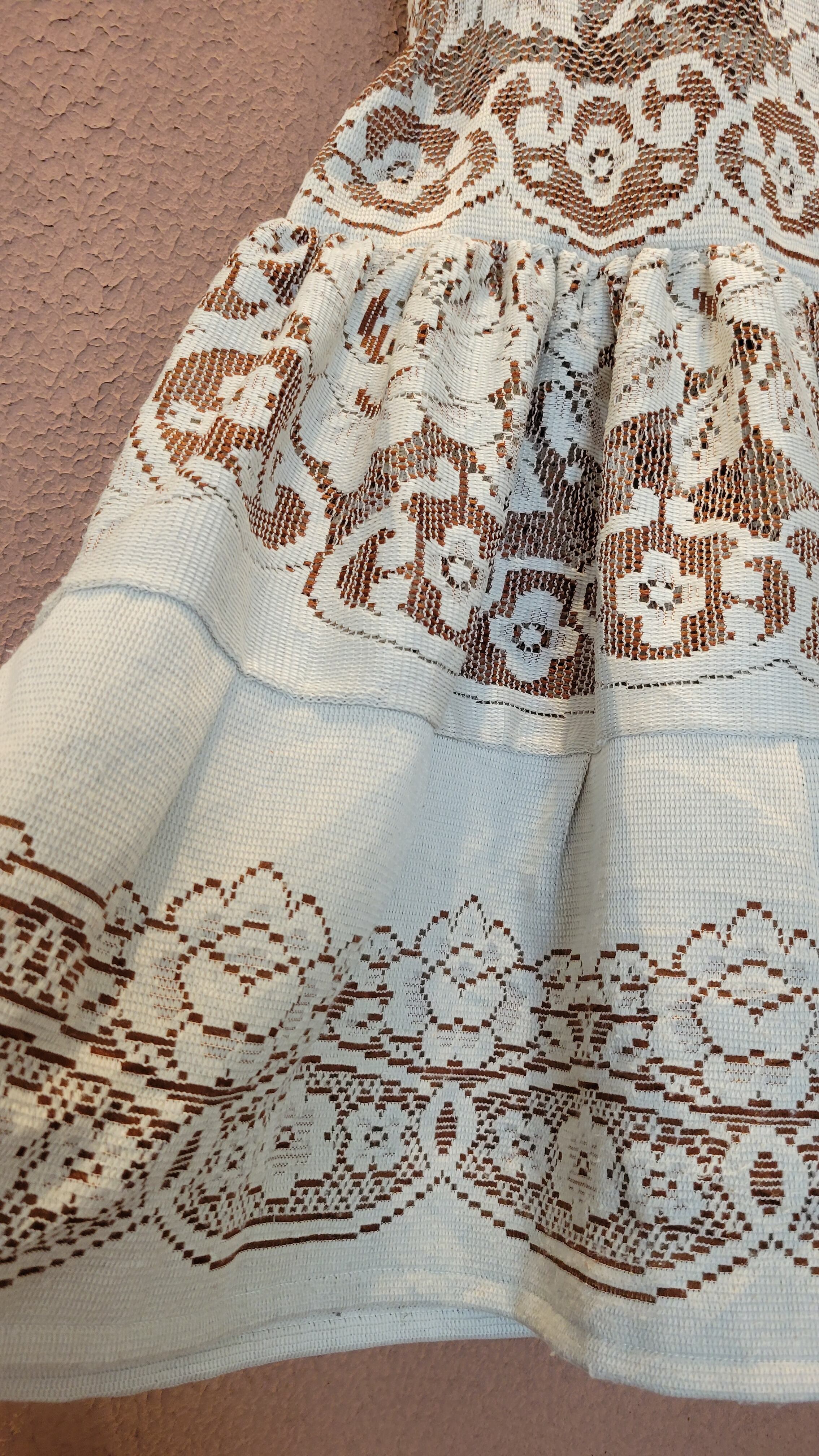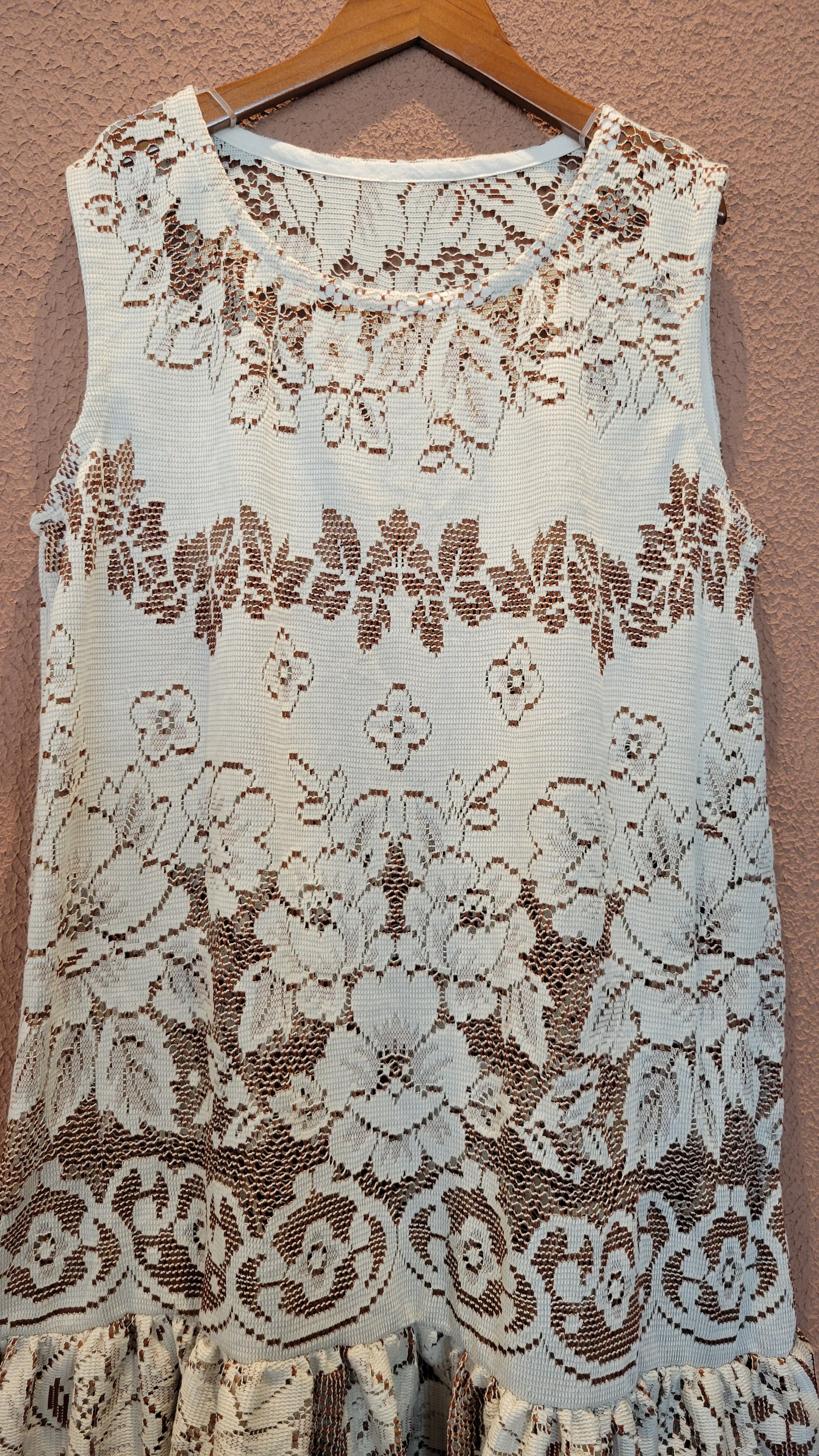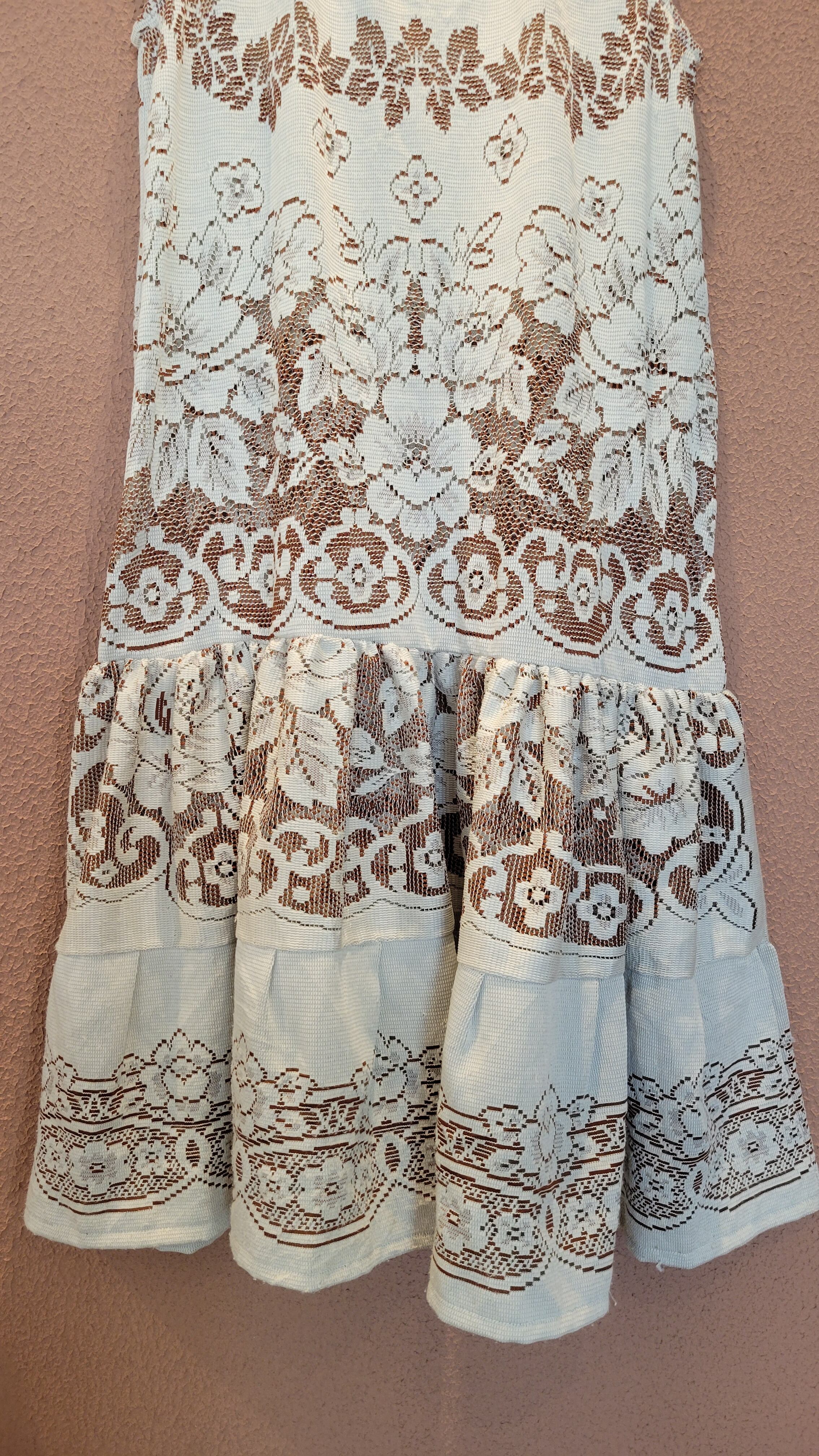 ヴィンテージレースを使用したリメイクワンピース。素材表記はありませんがポリエステルのようです。ファスナーは付いておらず頭から被って着用するプルオーバータイプ。アームホール広めです。裾のたっぷりのギャザーがふんわり可愛いらしいです。甘めのスタイリングはもちろんデニムやミリタリーパンツ等、無骨なボトムに合わせてカジュアルにスタイリングもできます。