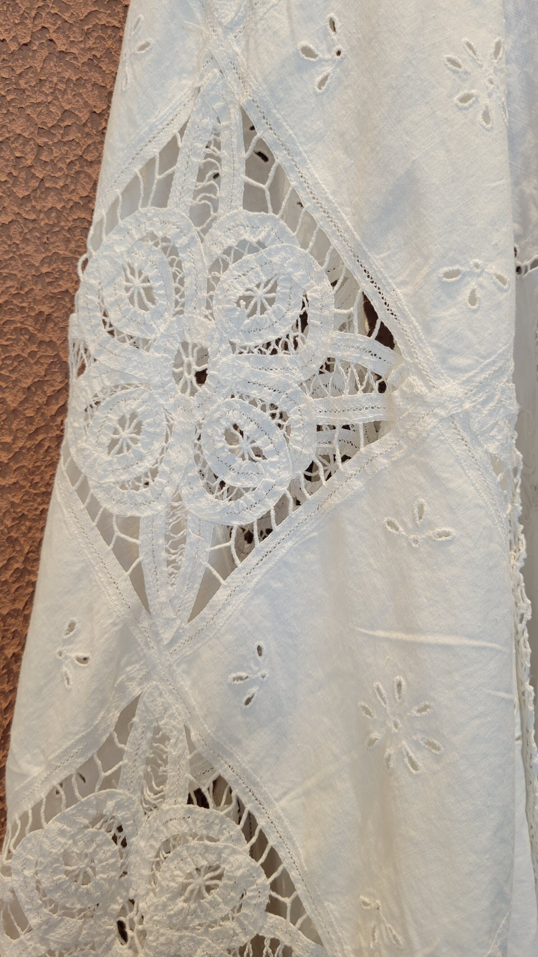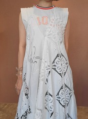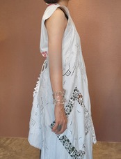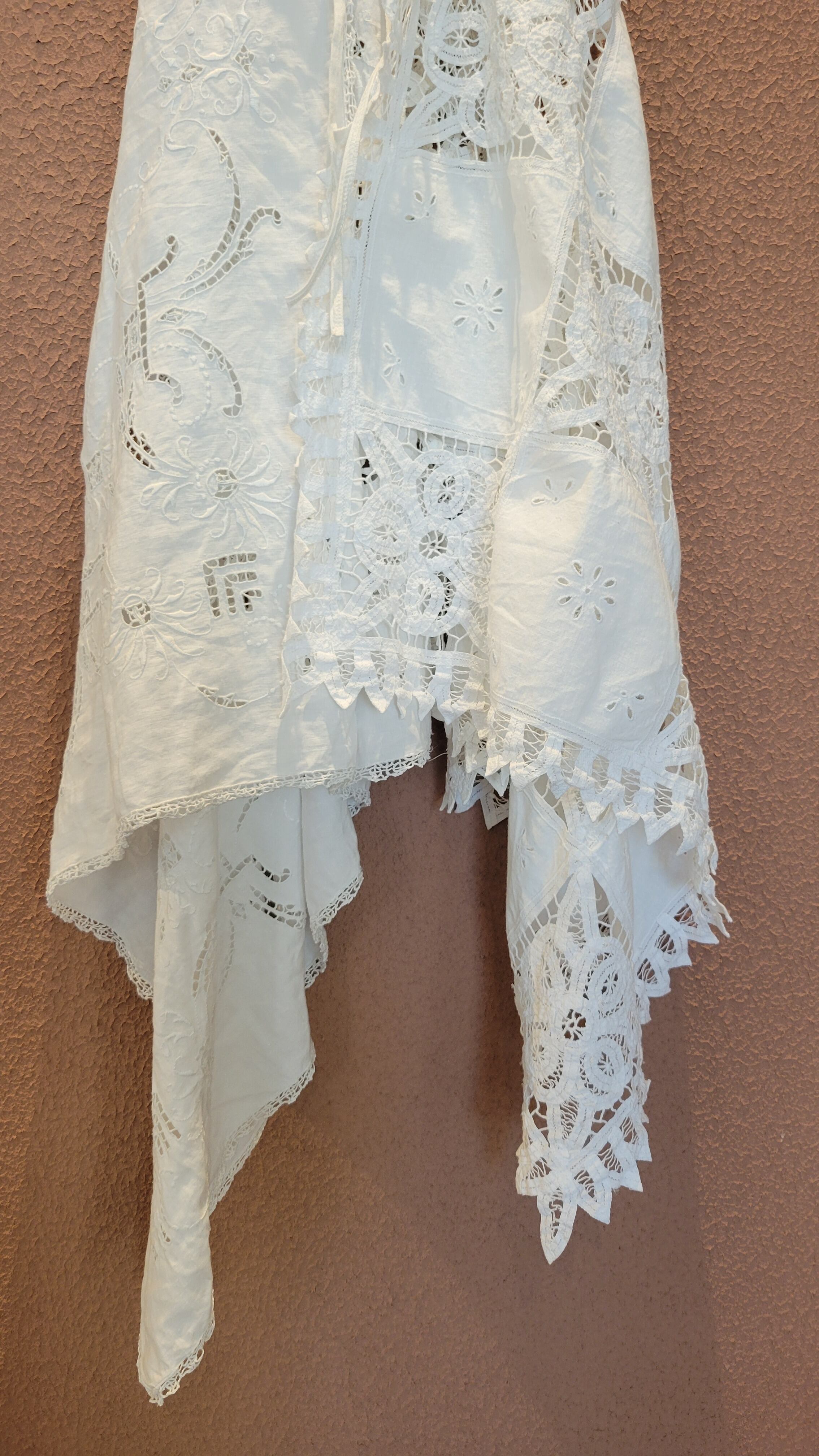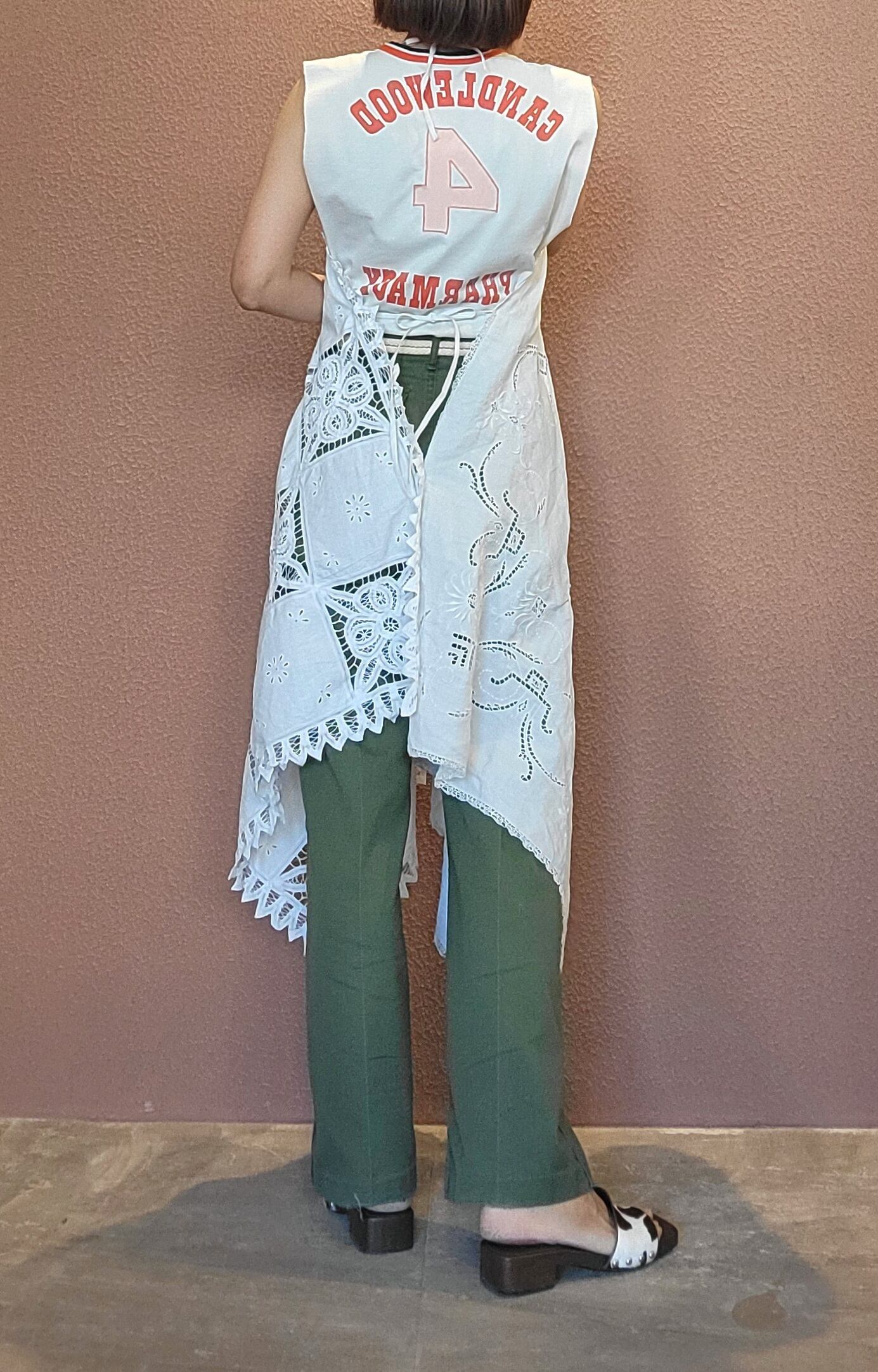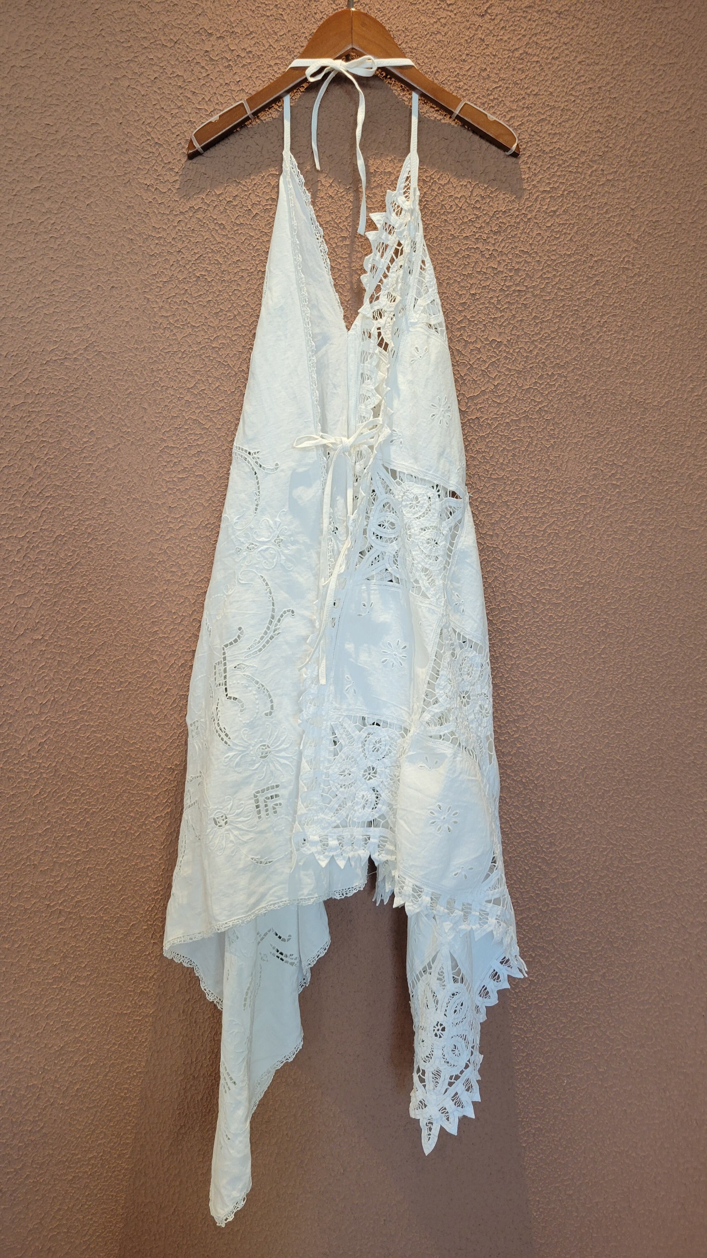 ヴィンテージのレースクロスを繋ぎ合わせたリメイクワンピース。素材表記はありませんがコットンのようです。ファスナーやボタンは付いていません。スカートをはくように足から入れ、首後ろとウエスト後ろのお好きな位置で紐を結んで着用します。キャミソールやタンクトップ、Tシャツ等色々なアイテムとのレイヤードをお楽しみいただけます。