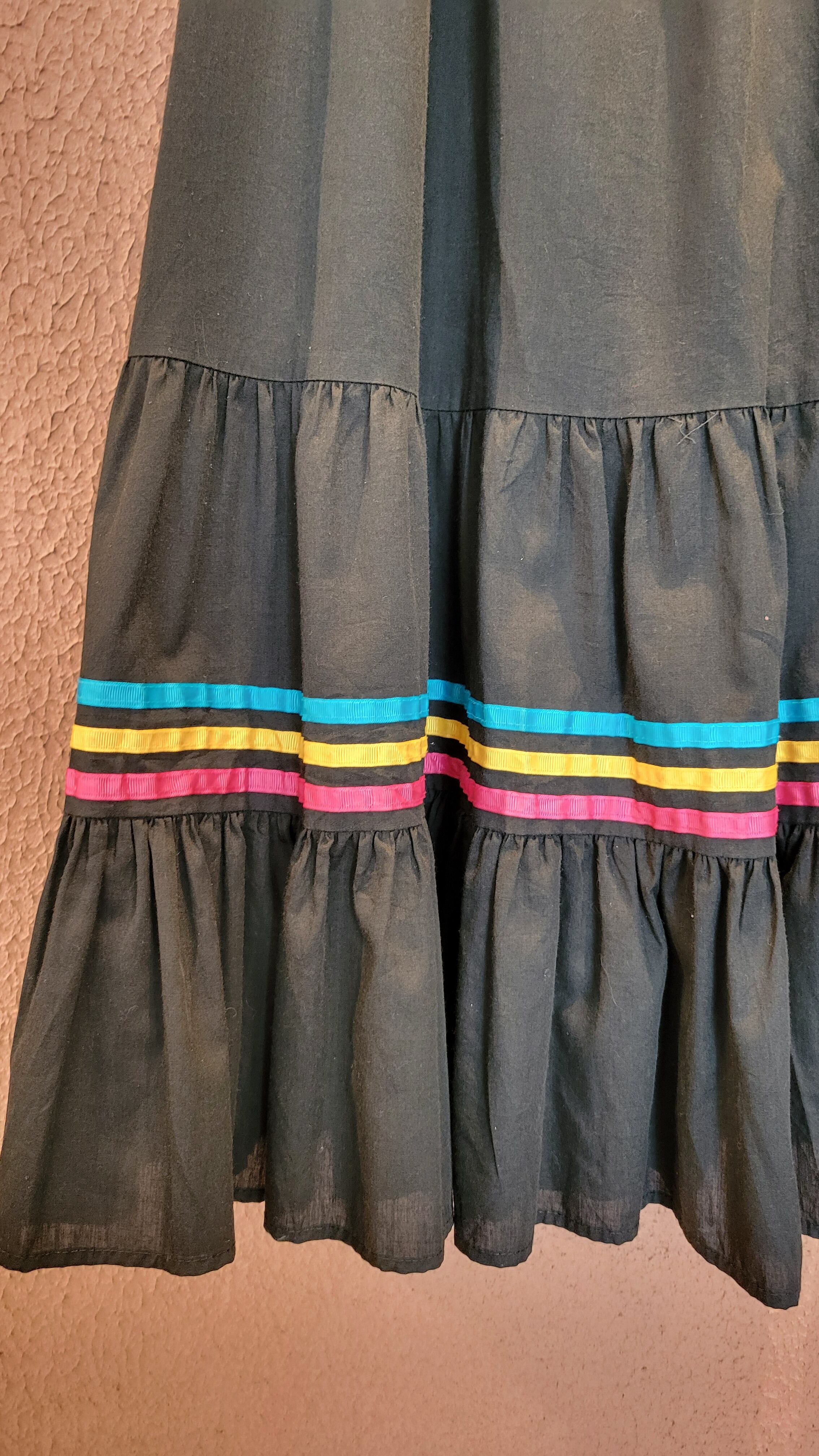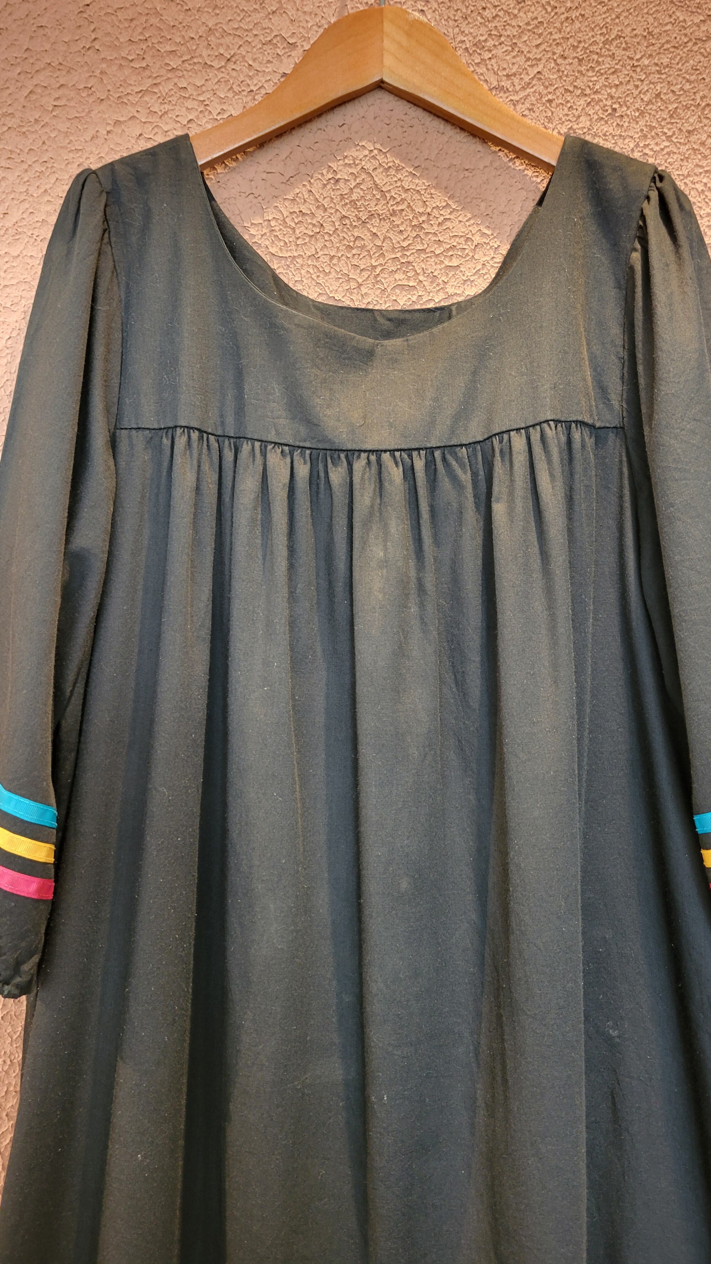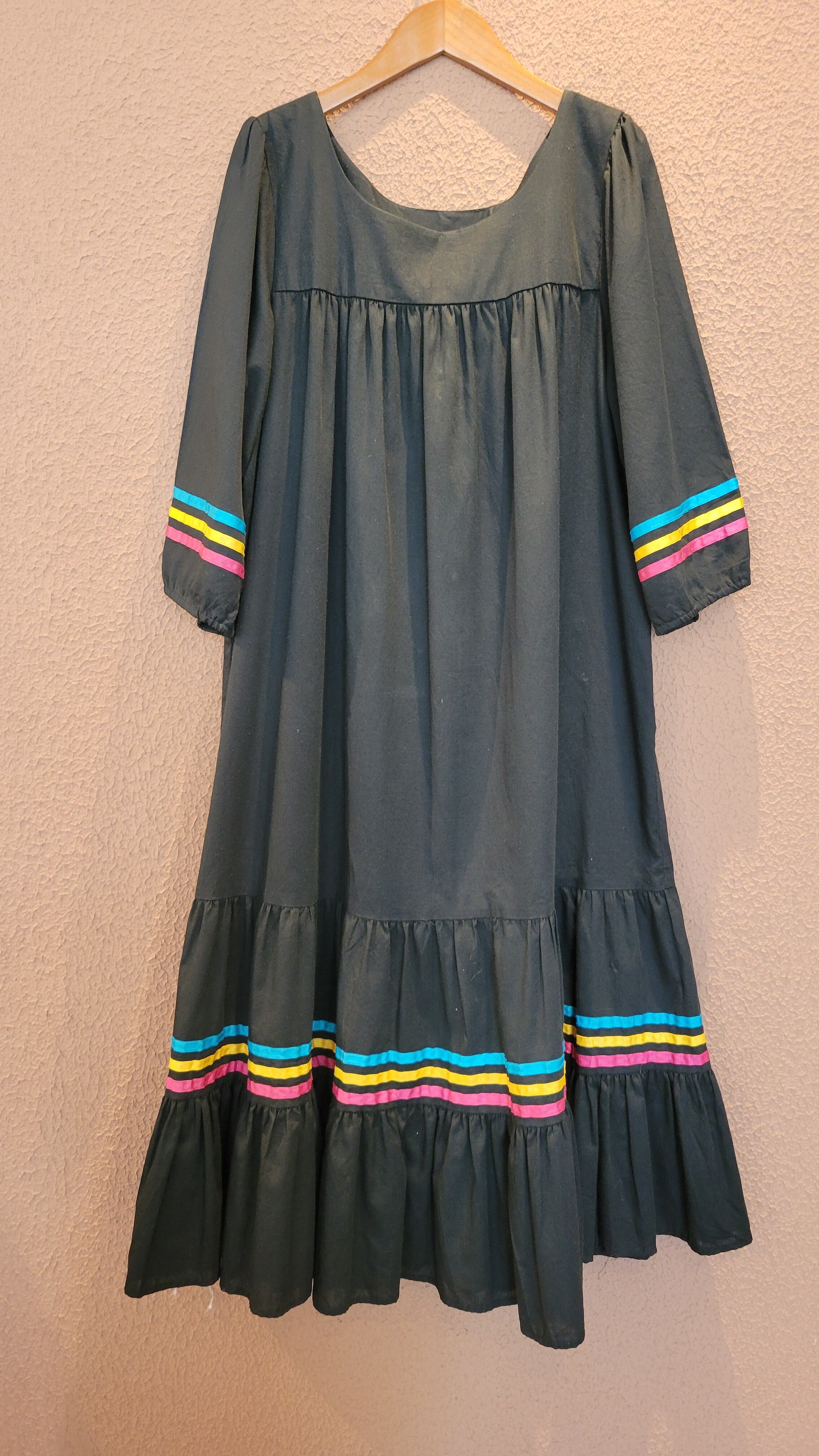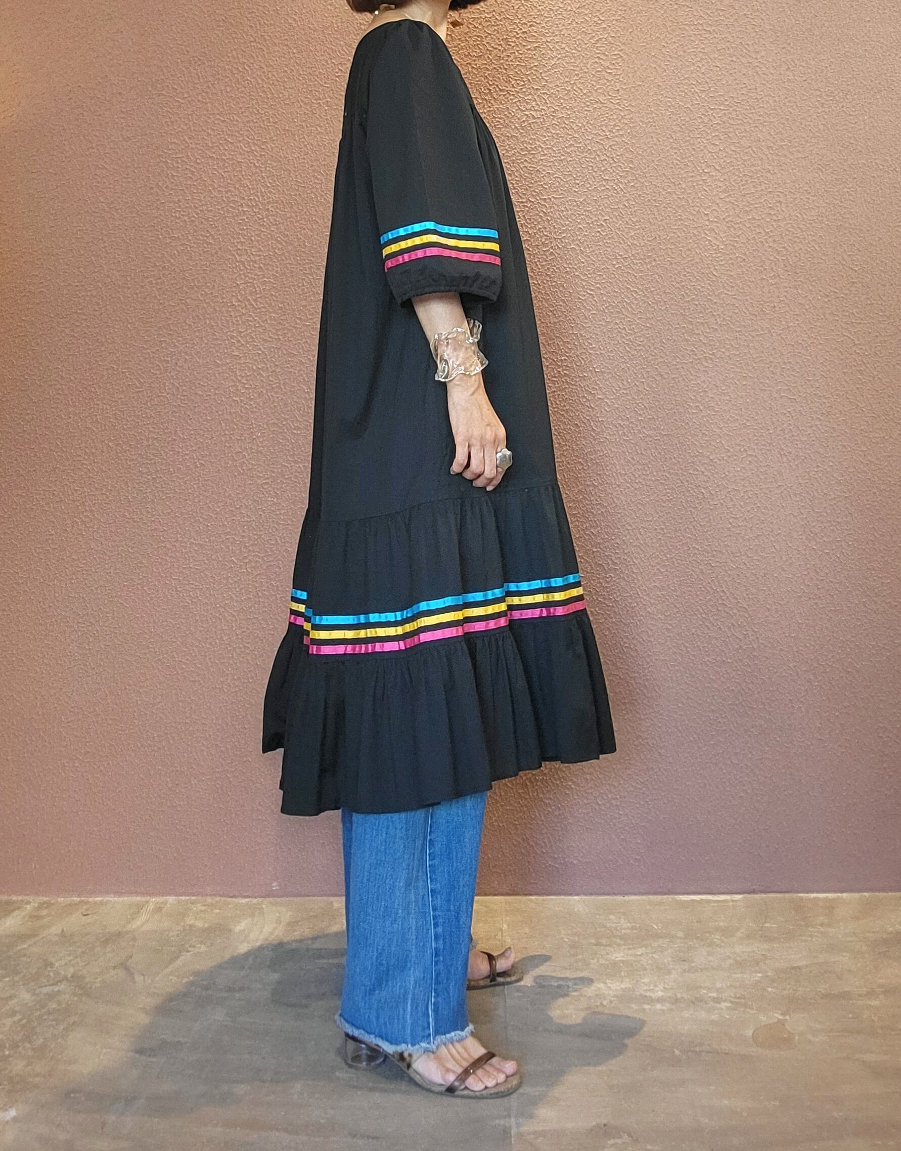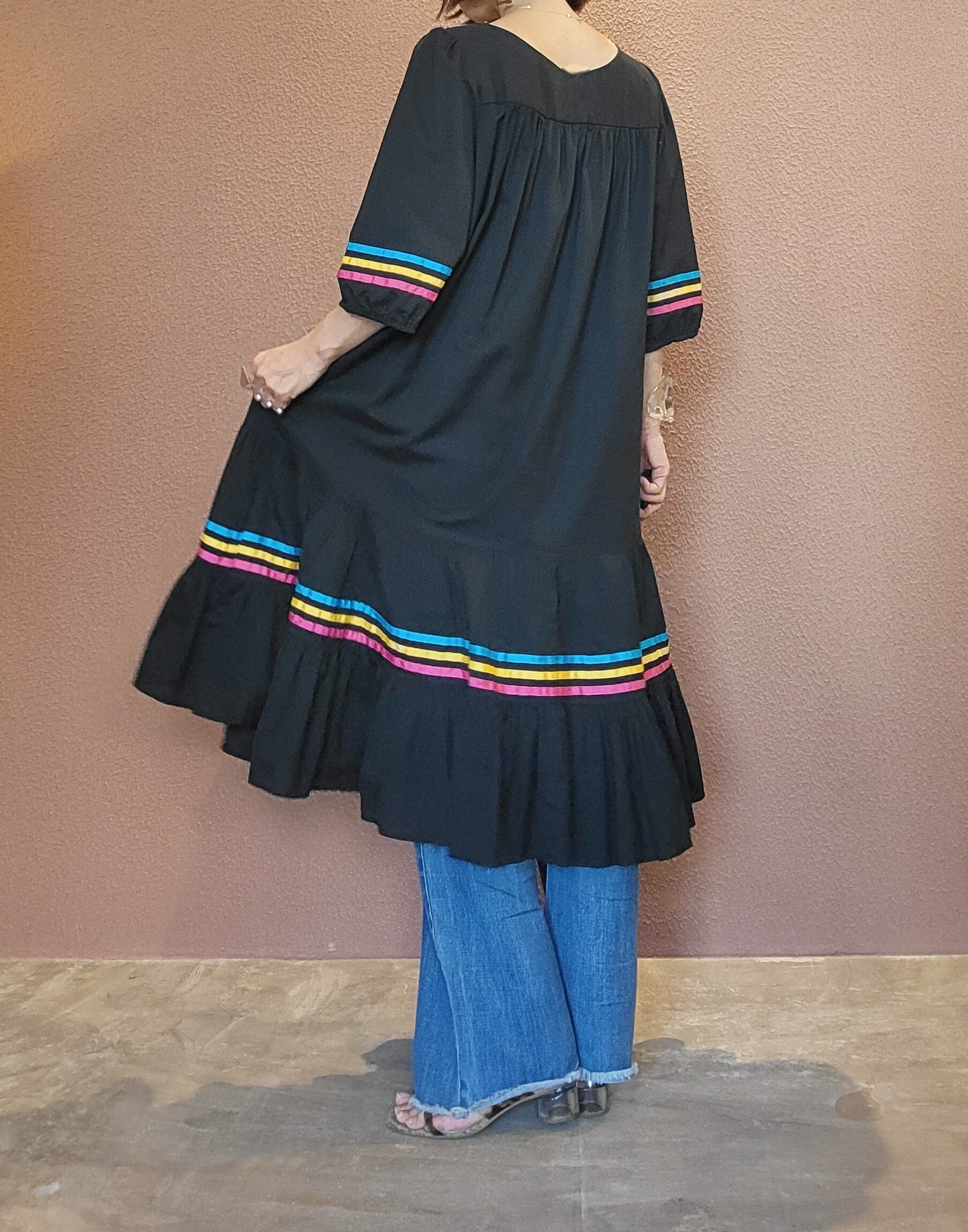 Made in USA のヴィンテージワンピース。タグの素材表記は消えてしまっていますがさらりとした肌触りのコットンのような素材感です。頭からすっぽり被り、ふんわり締め付け感の無い楽な着心地のワンピースです。3色のカラーテープ装飾が良いアクセントになっています。