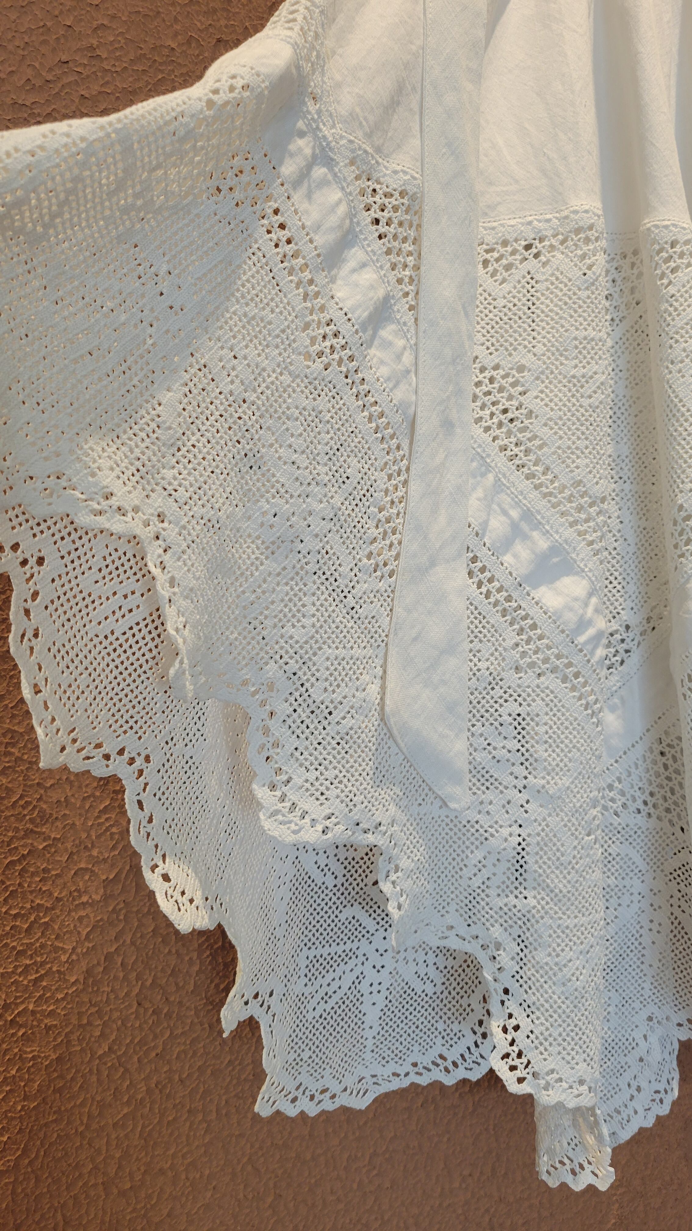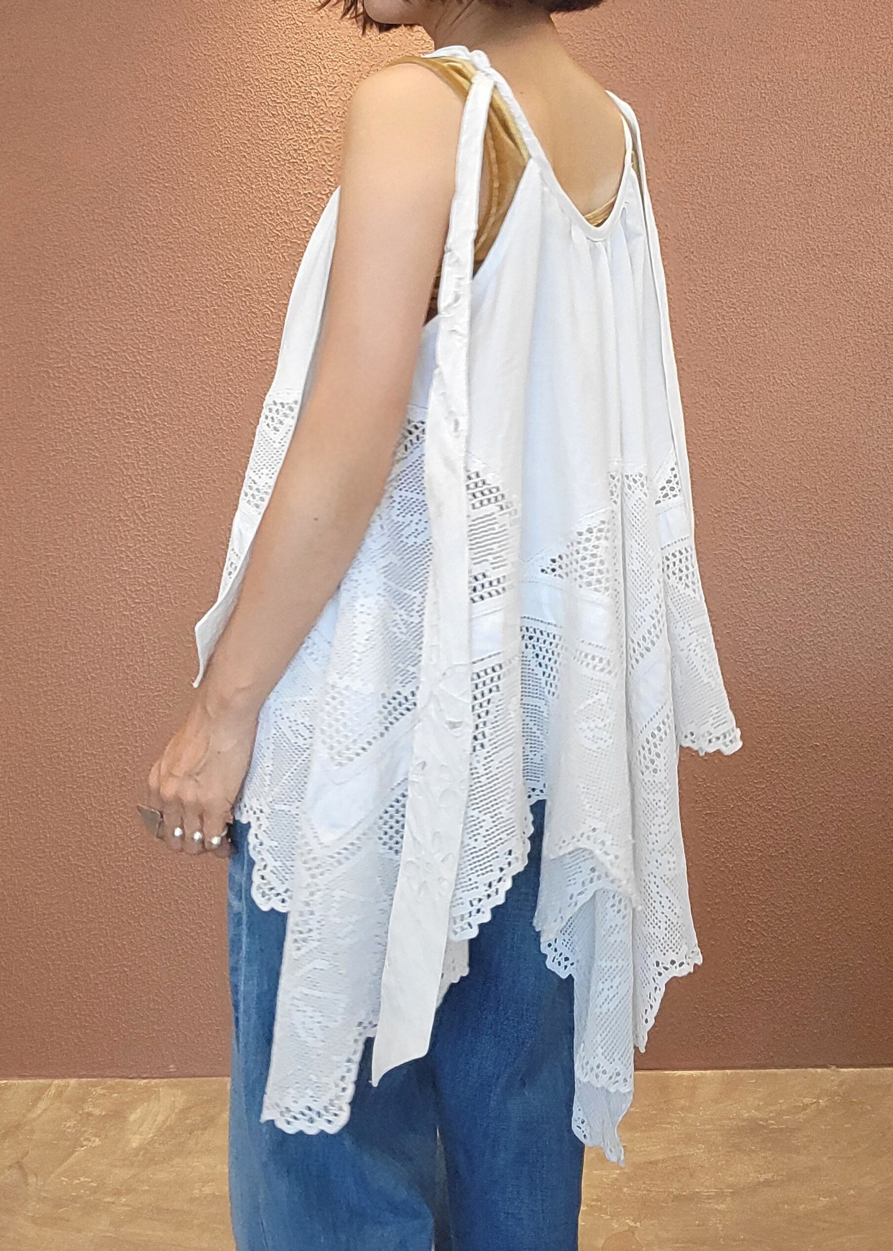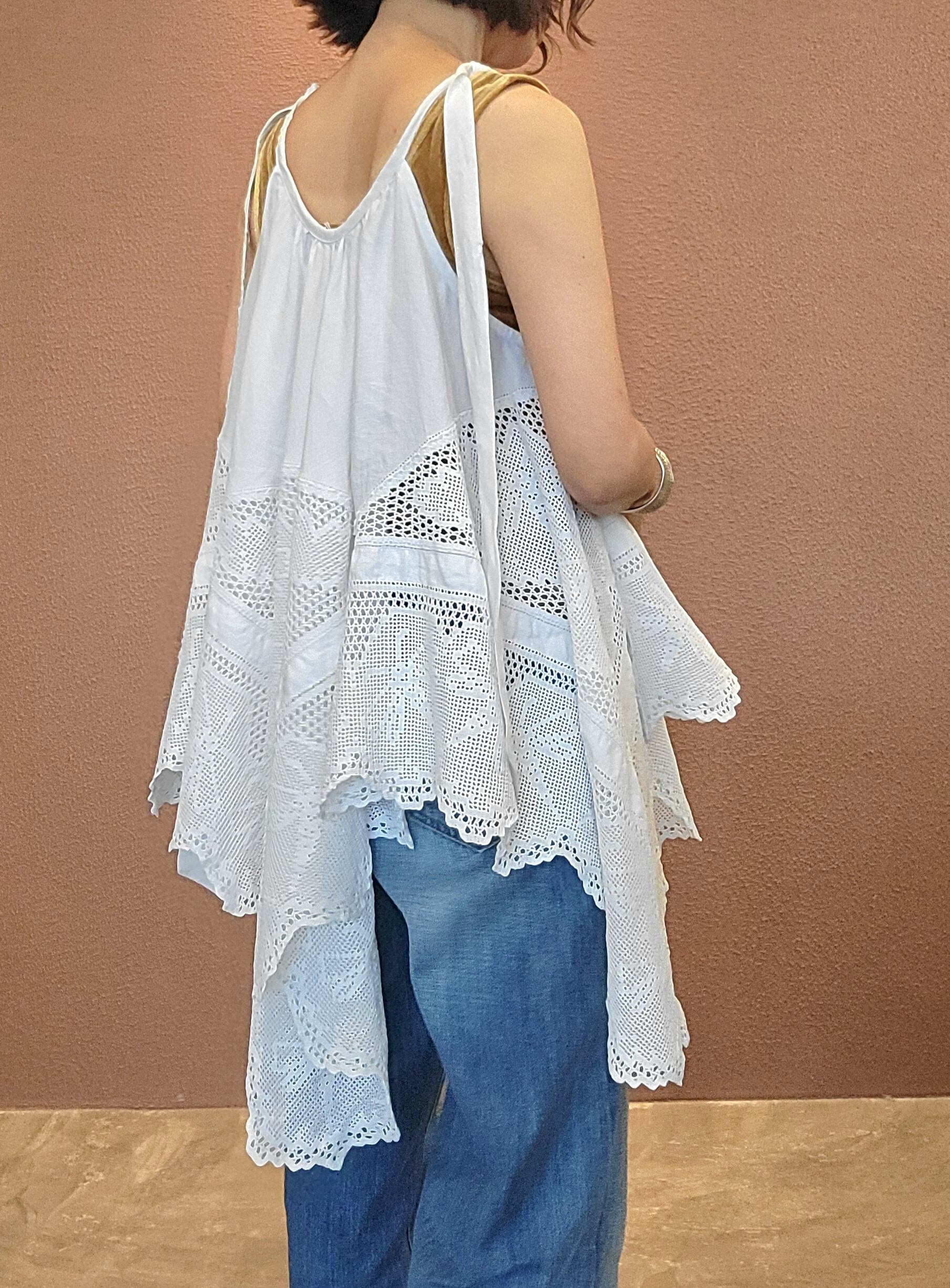 ヴィンテージのレースクロスをたっぷり使用したリメイクトップス。素材表記はありませんがコットンのようです。着丈は肩紐はお好きな長さで結んで調整できます。たっぷり寄せたギャザーがボリューミーなシルエット。動きに合わせて揺れる様も素敵です。Tシャツの上に合わせてカジュアルなスタイリングにも。