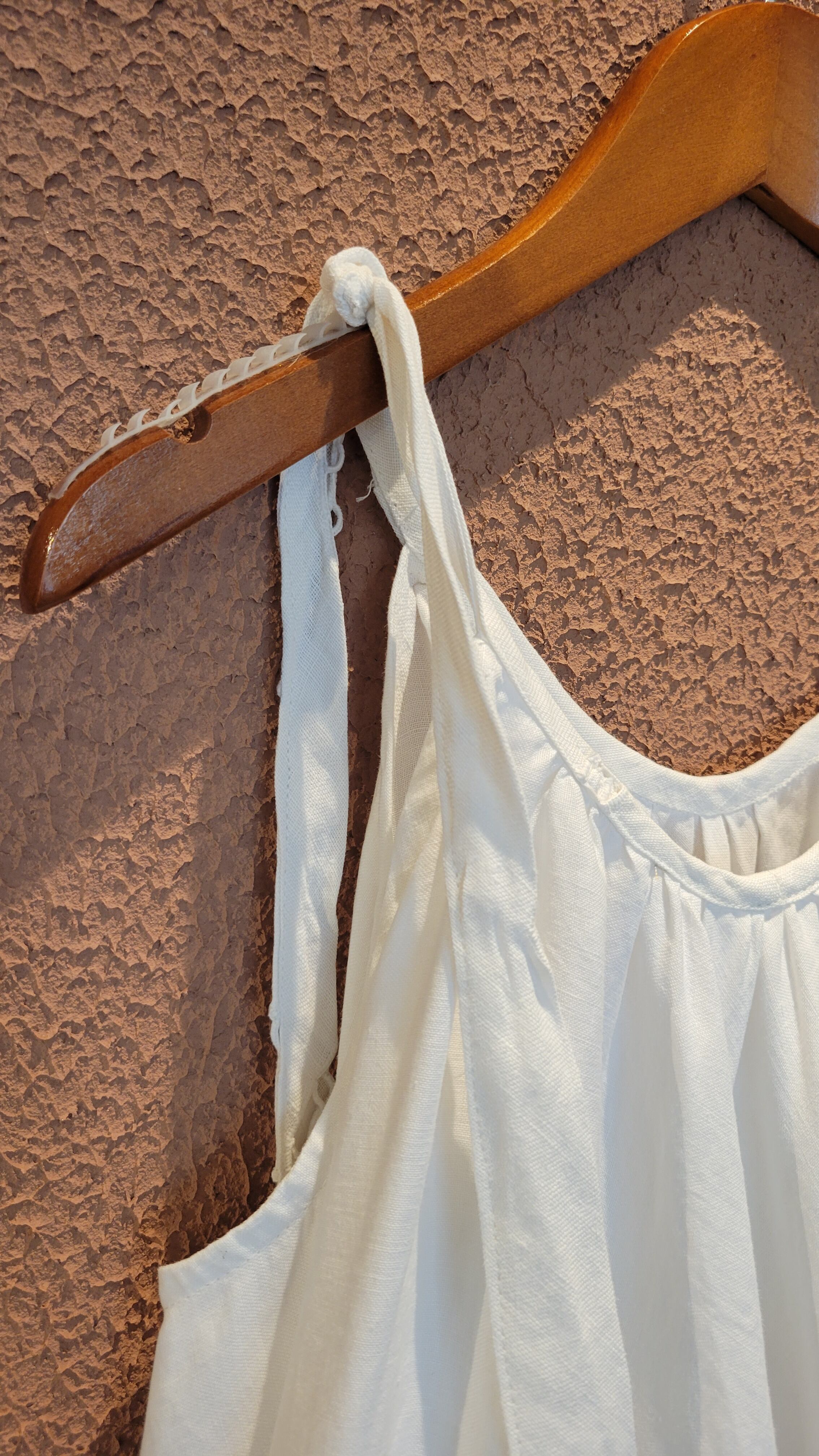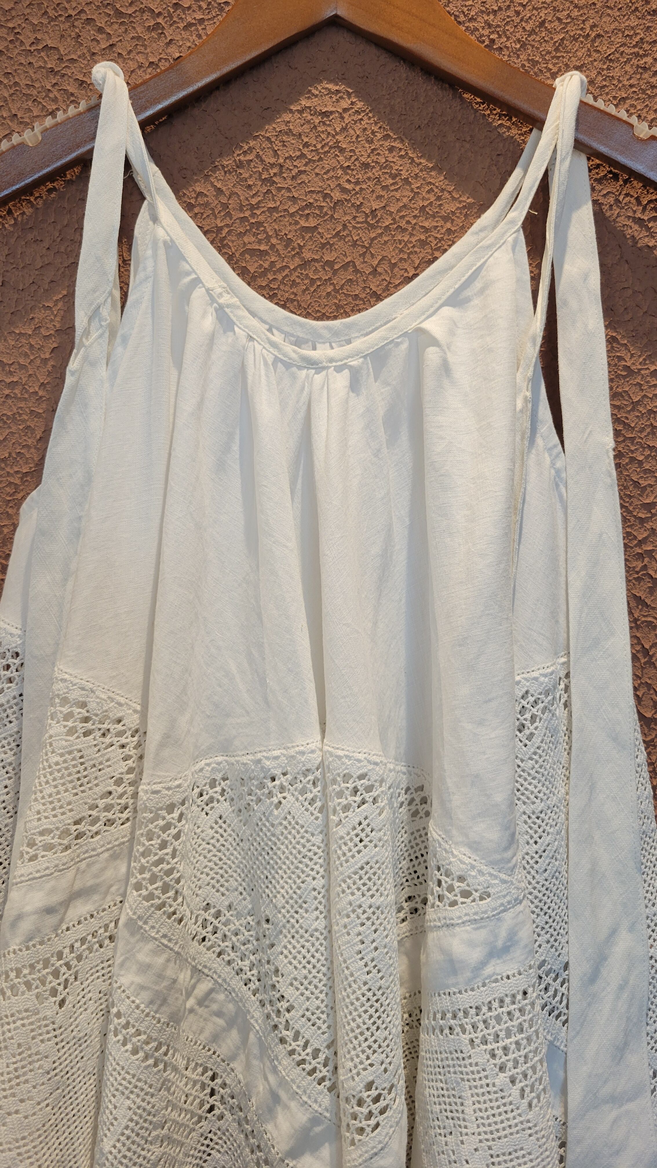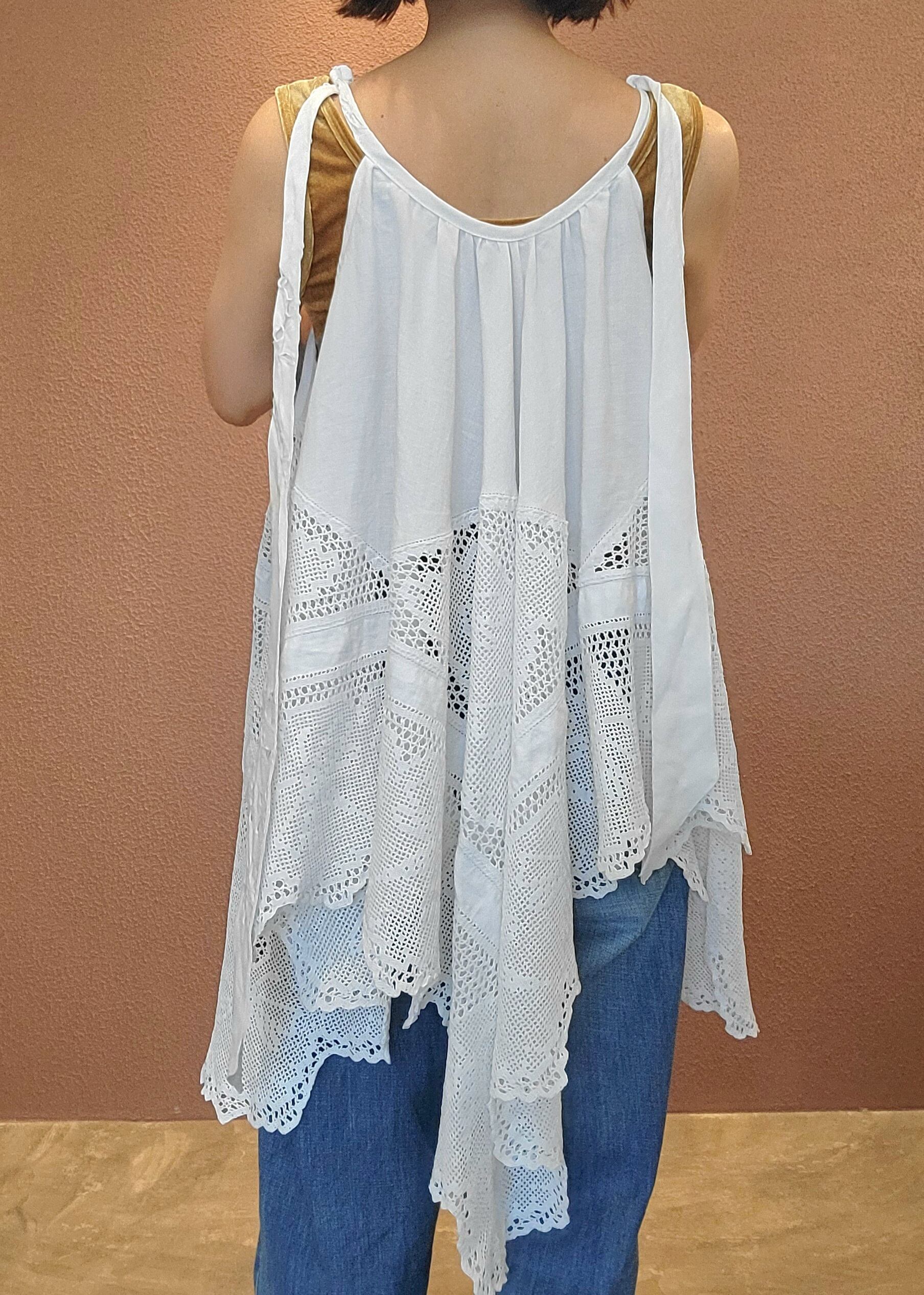 ヴィンテージのレースクロスをたっぷり使用したリメイクトップス。素材表記はありませんがコットンのようです。着丈は肩紐はお好きな長さで結んで調整できます。たっぷり寄せたギャザーがボリューミーなシルエット。動きに合わせて揺れる様も素敵です。Tシャツの上に合わせてカジュアルなスタイリングにも。