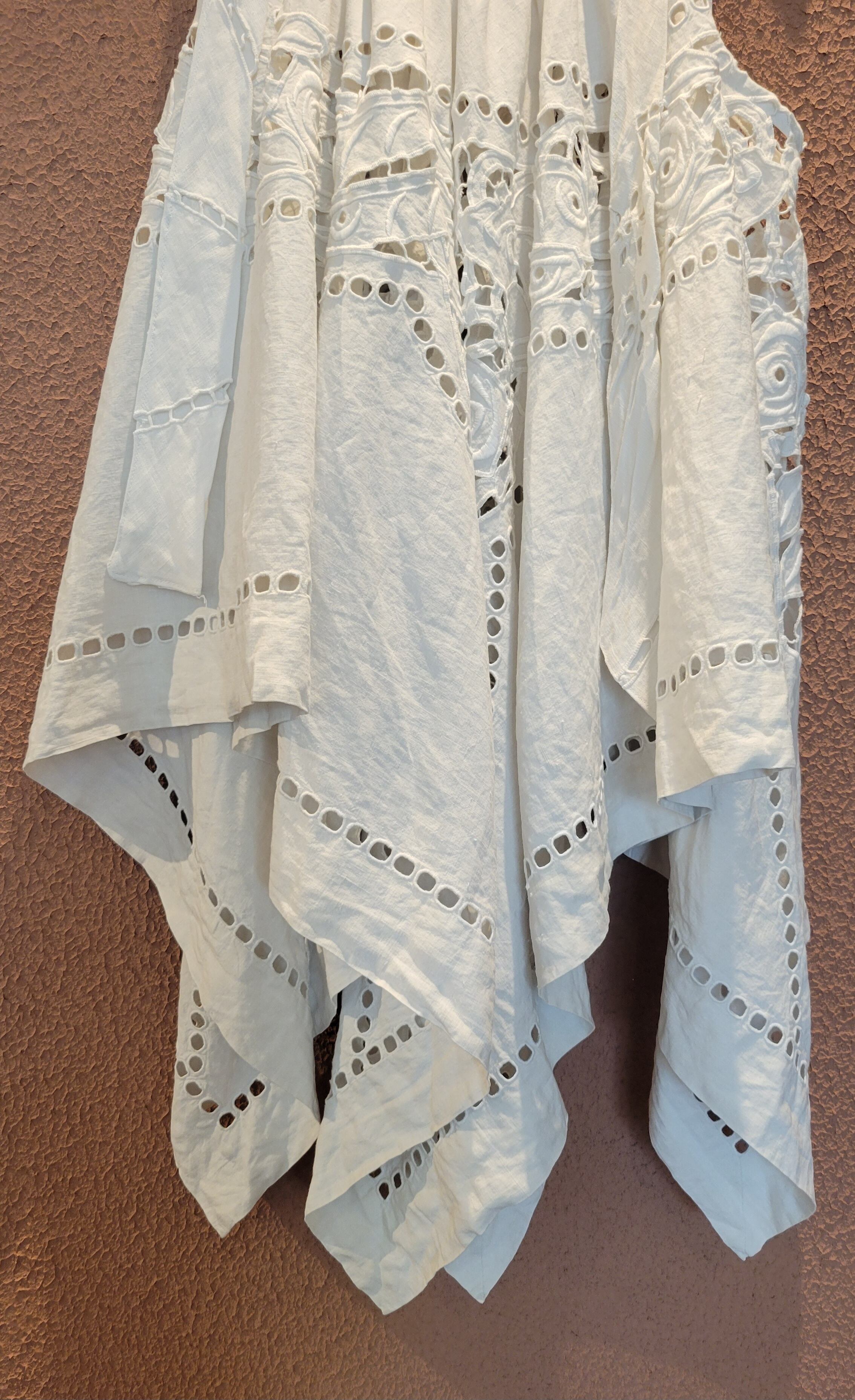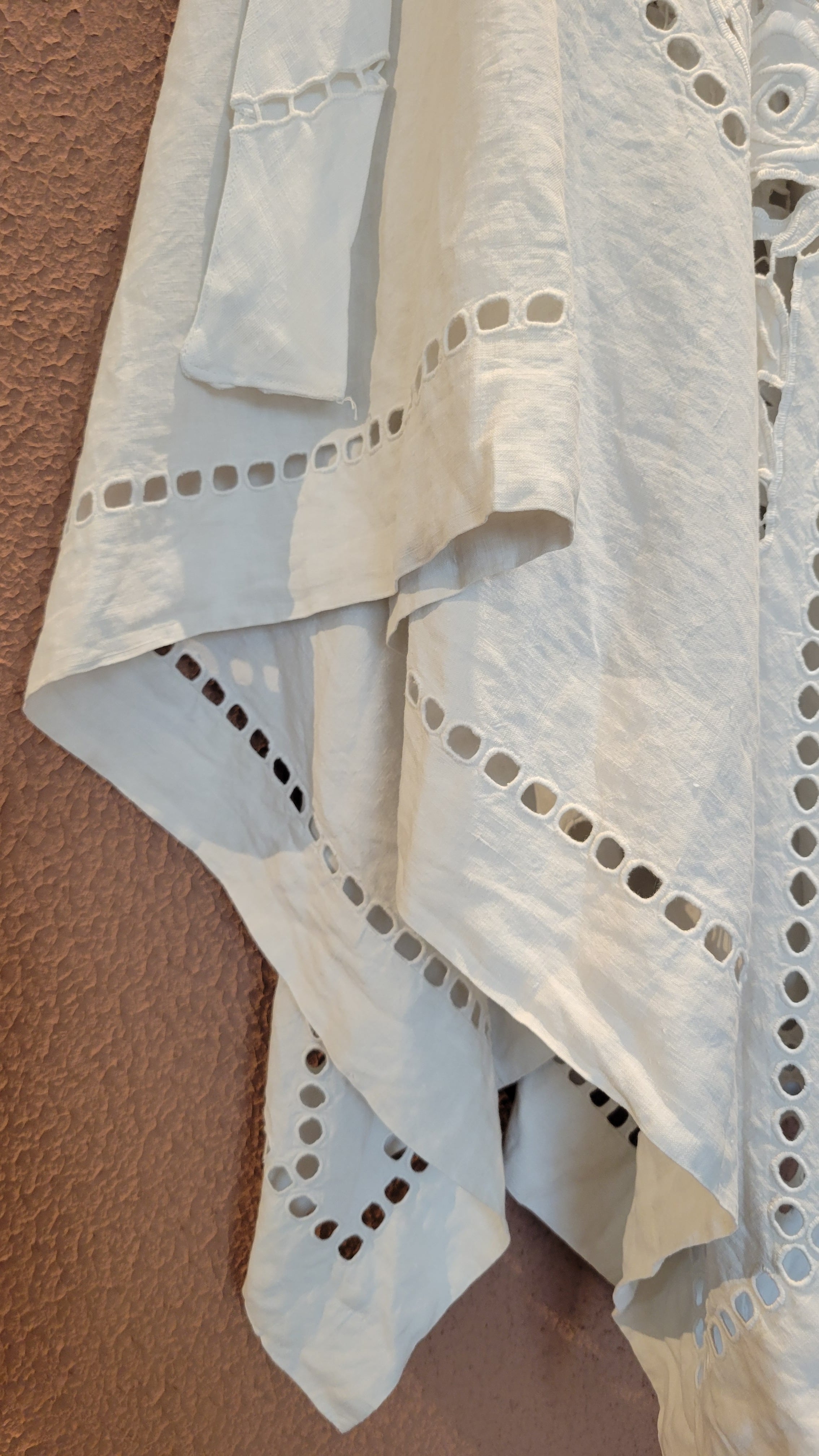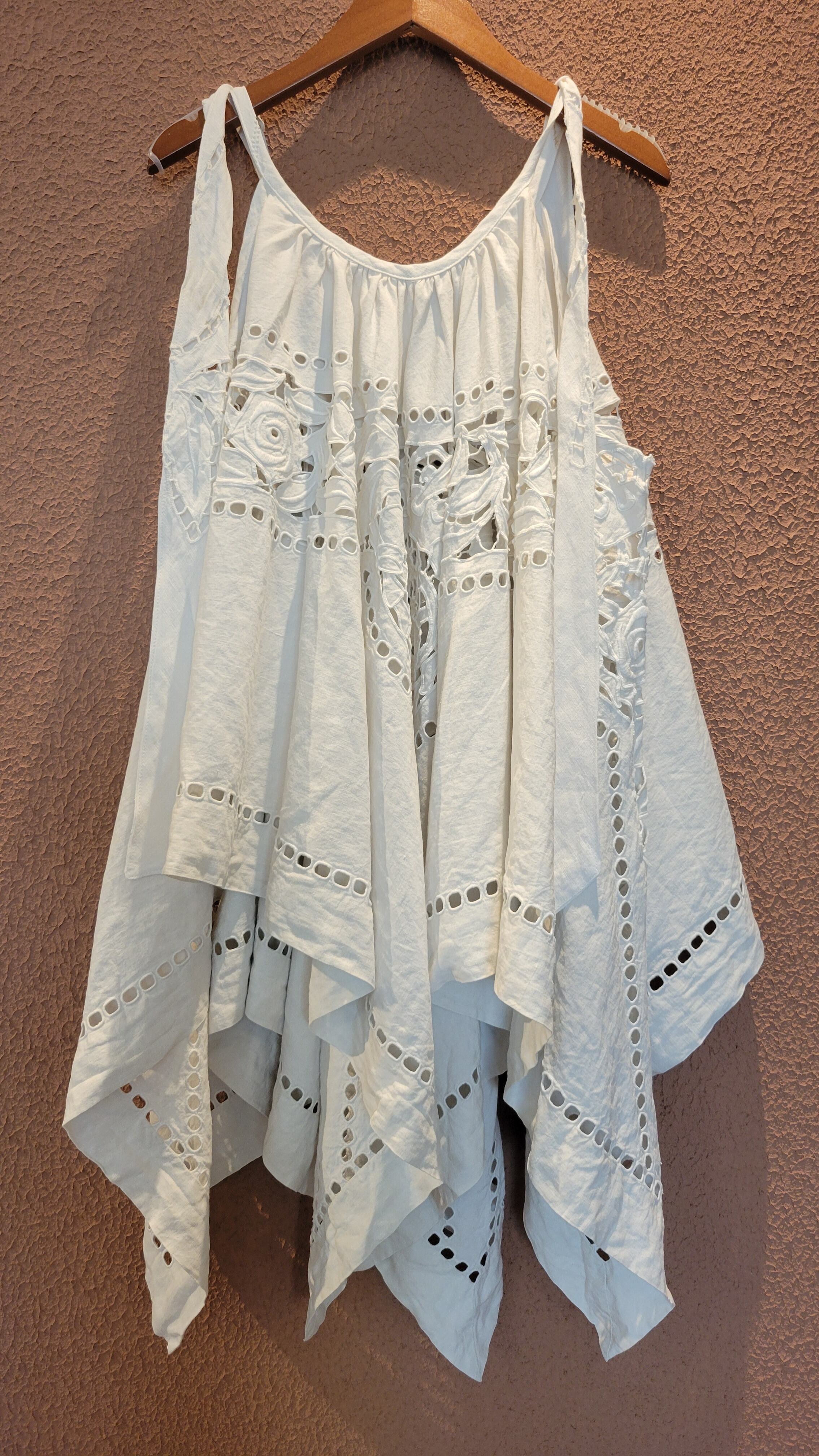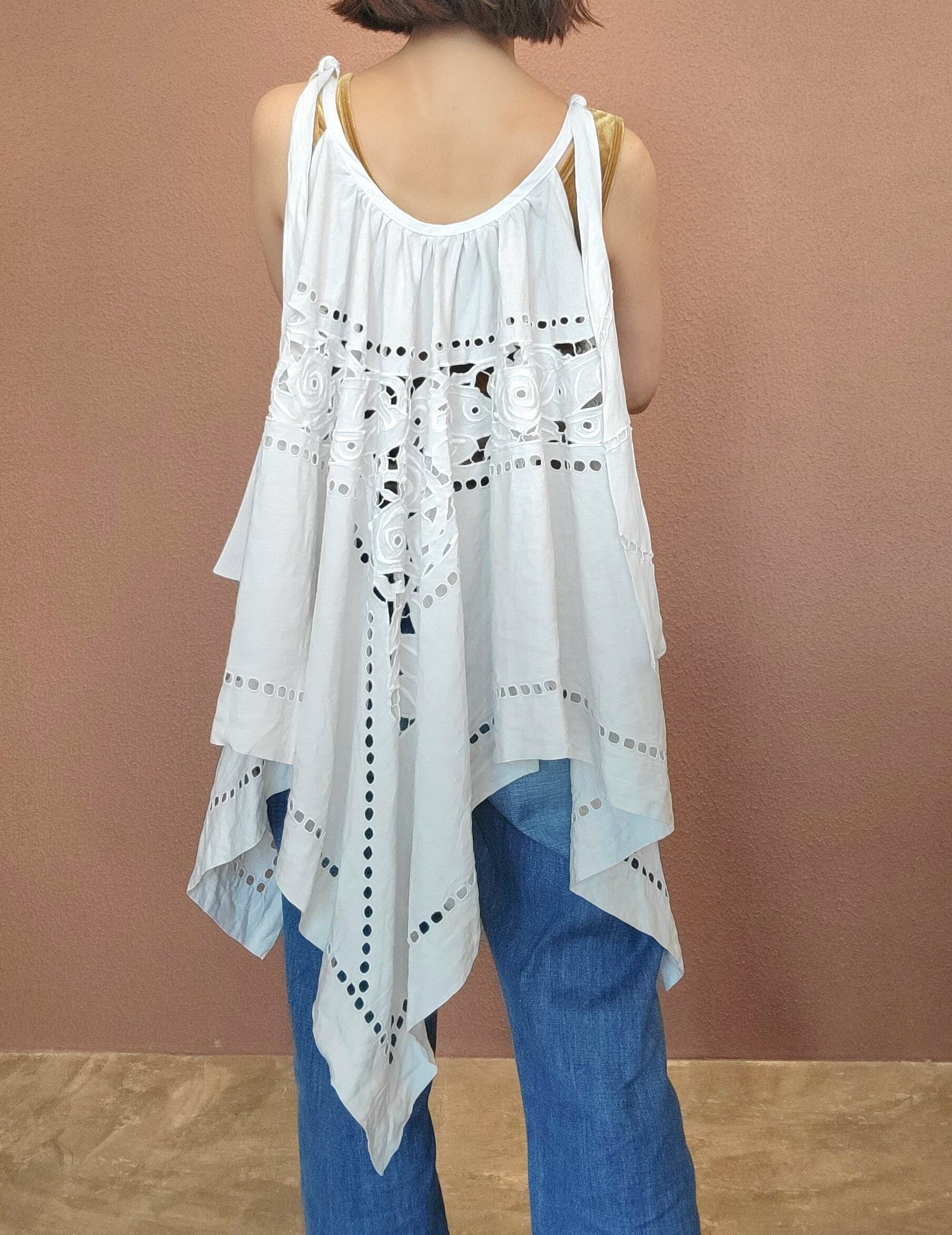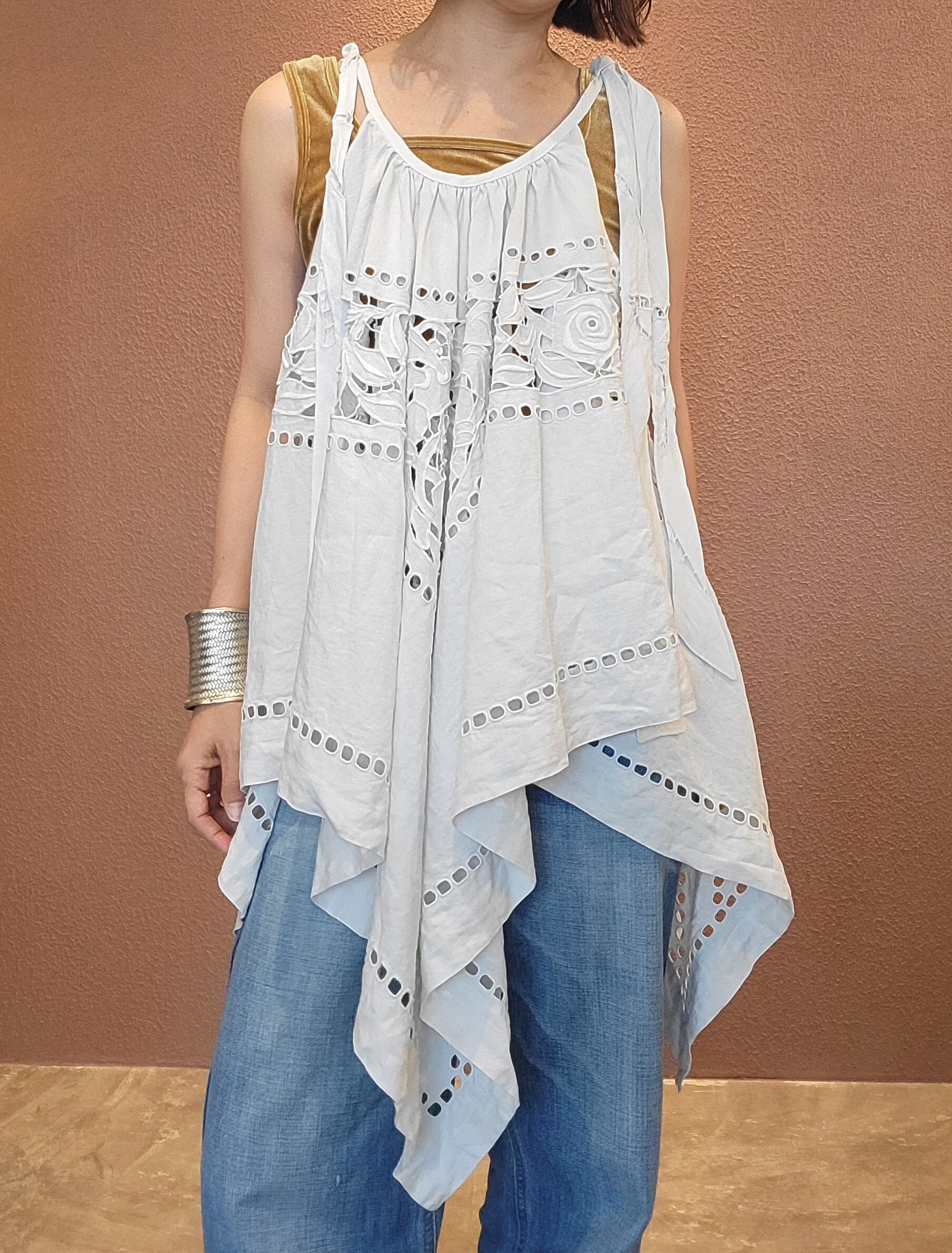 ヴィンテージのレースクロスをたっぷり使用したリメイクトップス。素材表記はありませんがコットンのようです。着丈は肩紐はお好きな長さで結んで調整できます。たっぷり寄せたギャザーがボリューミーなシルエット。動きに合わせて揺れる様も素敵です。Tシャツの上に合わせてカジュアルなスタイリングにも。