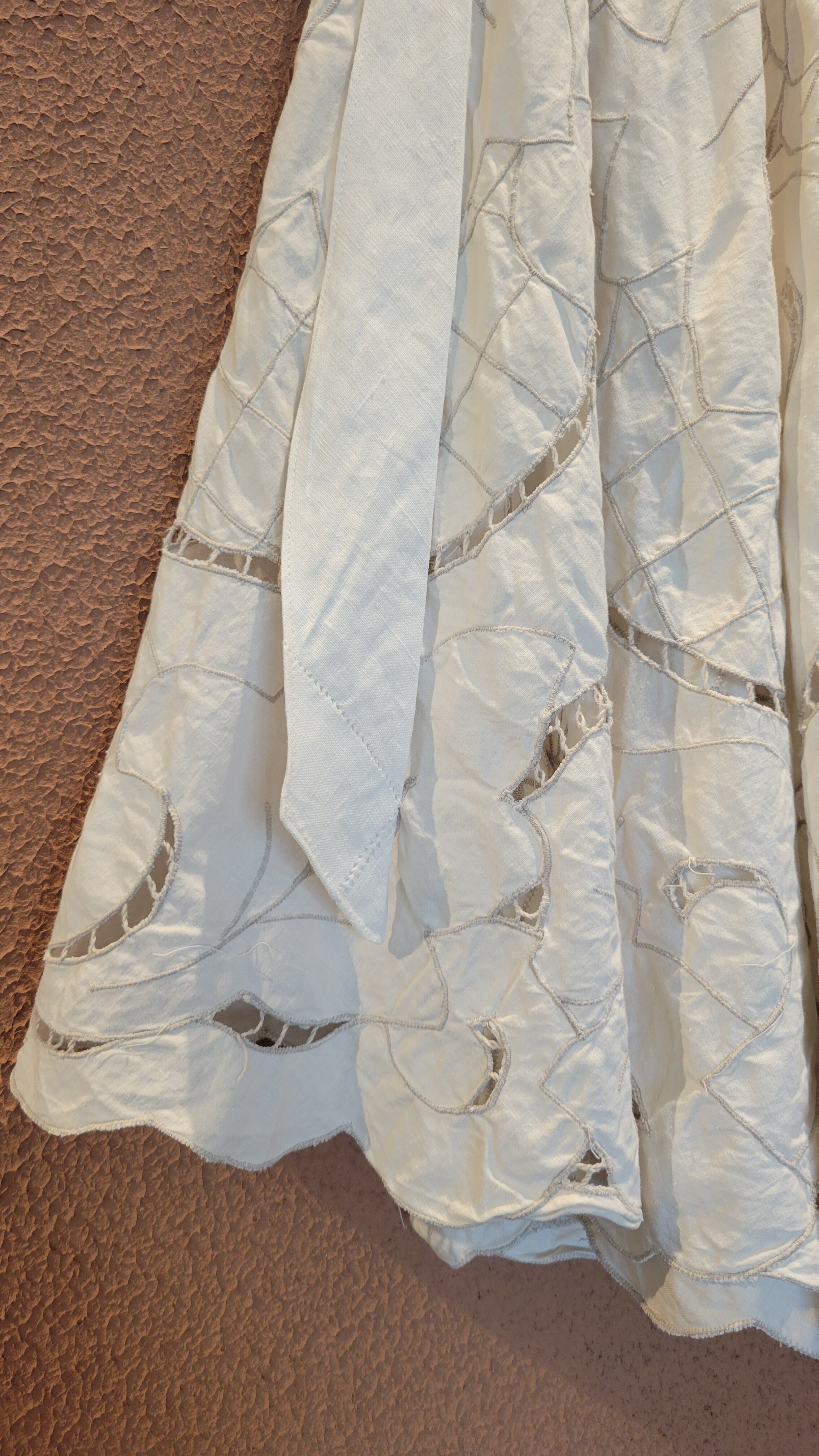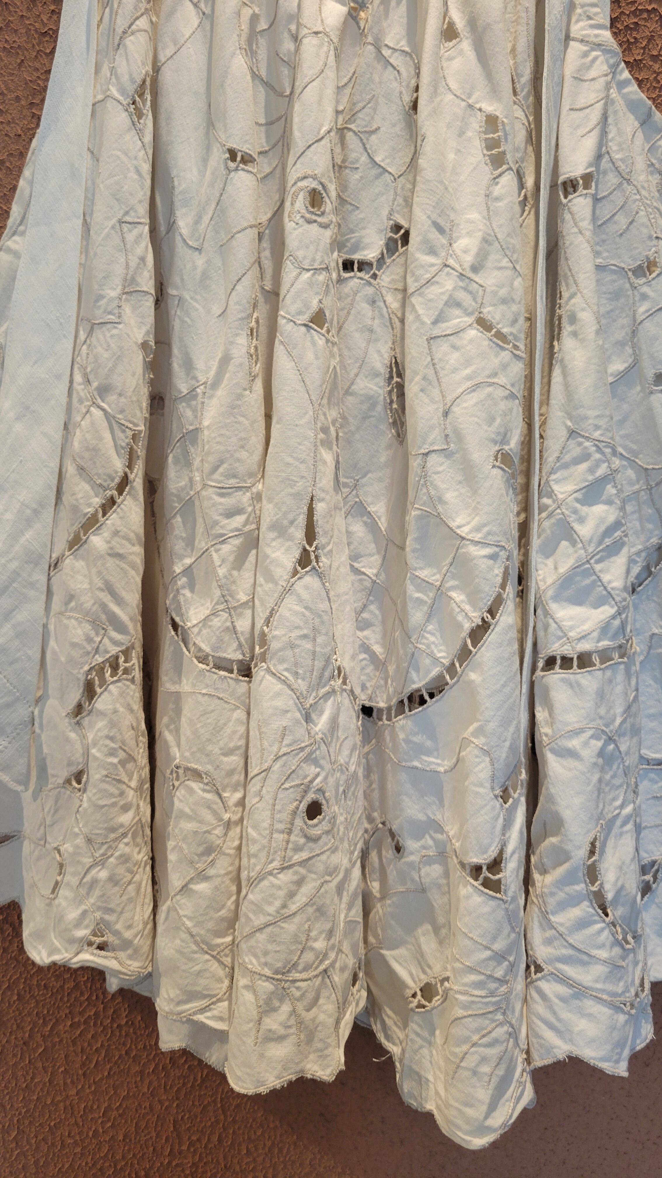 ヴィンテージのレースクロスをたっぷり使用したリメイクトップス。素材表記はありませんがコットンのようです。着丈は肩紐はお好きな長さで結んで調整できます。たっぷり寄せたギャザーがボリューミーなシルエット。動きに合わせて揺れる様も素敵です。Tシャツの上に合わせてカジュアルなスタイリングにも。