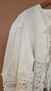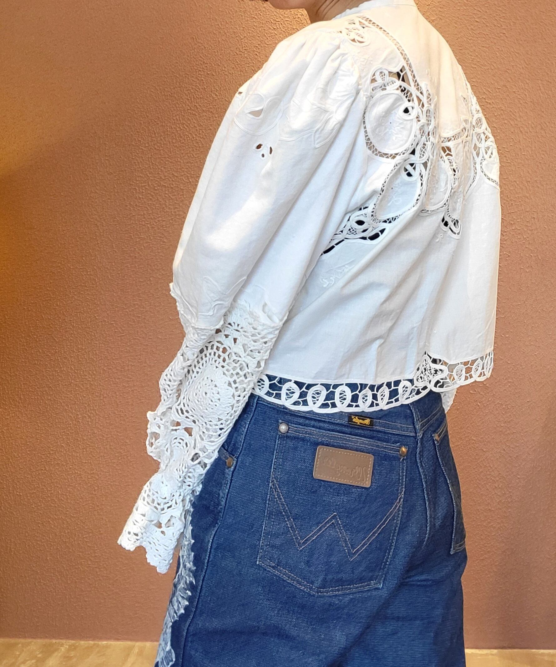 ヴィンテージのカットワークレース生地を利用したリメイクトップス。素材表記はありませんがコットンのようです。ほどよい張り感があります。カフスはゴム仕様です。ブラウスとしても羽織りとしても着用できます。
