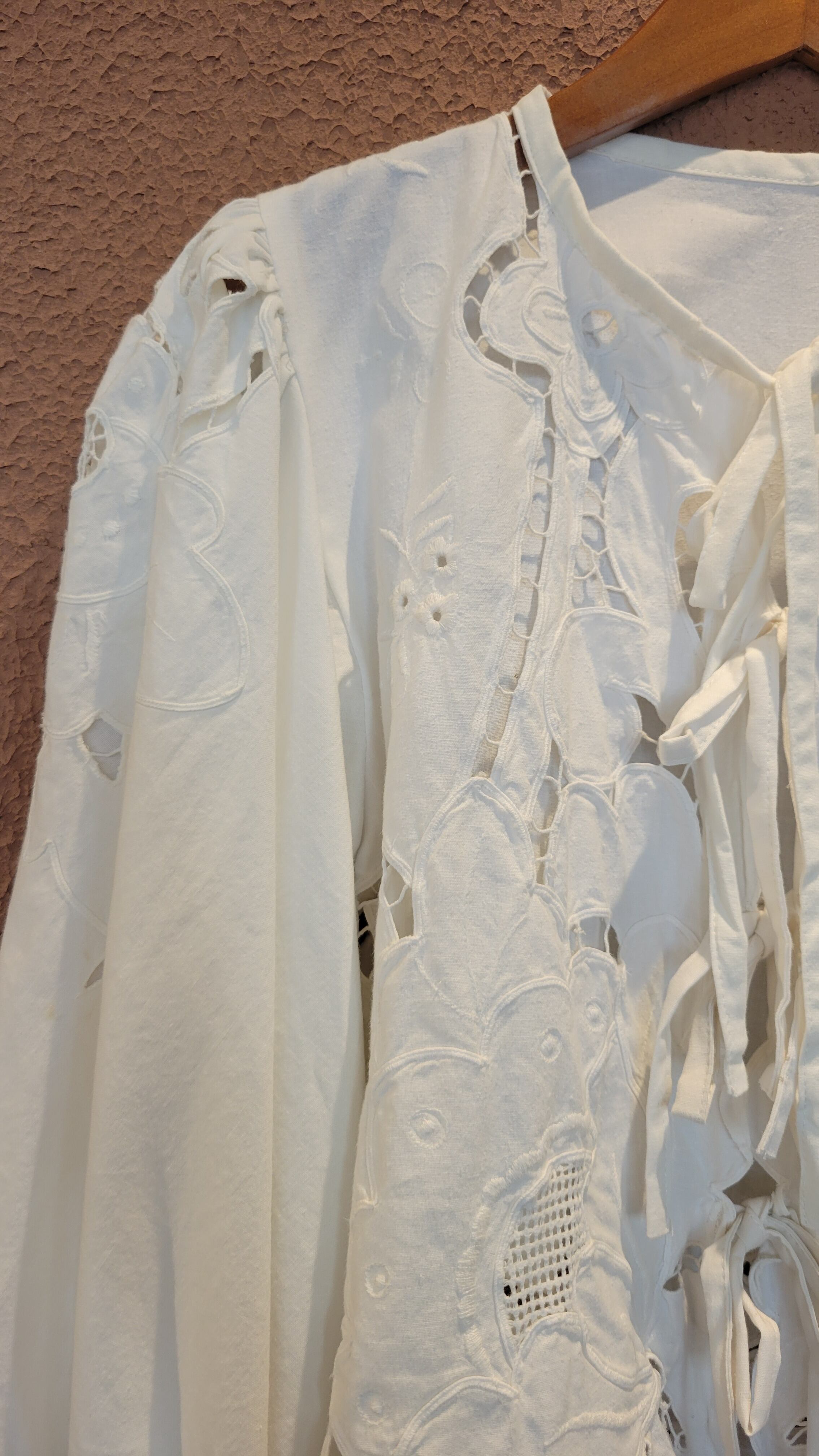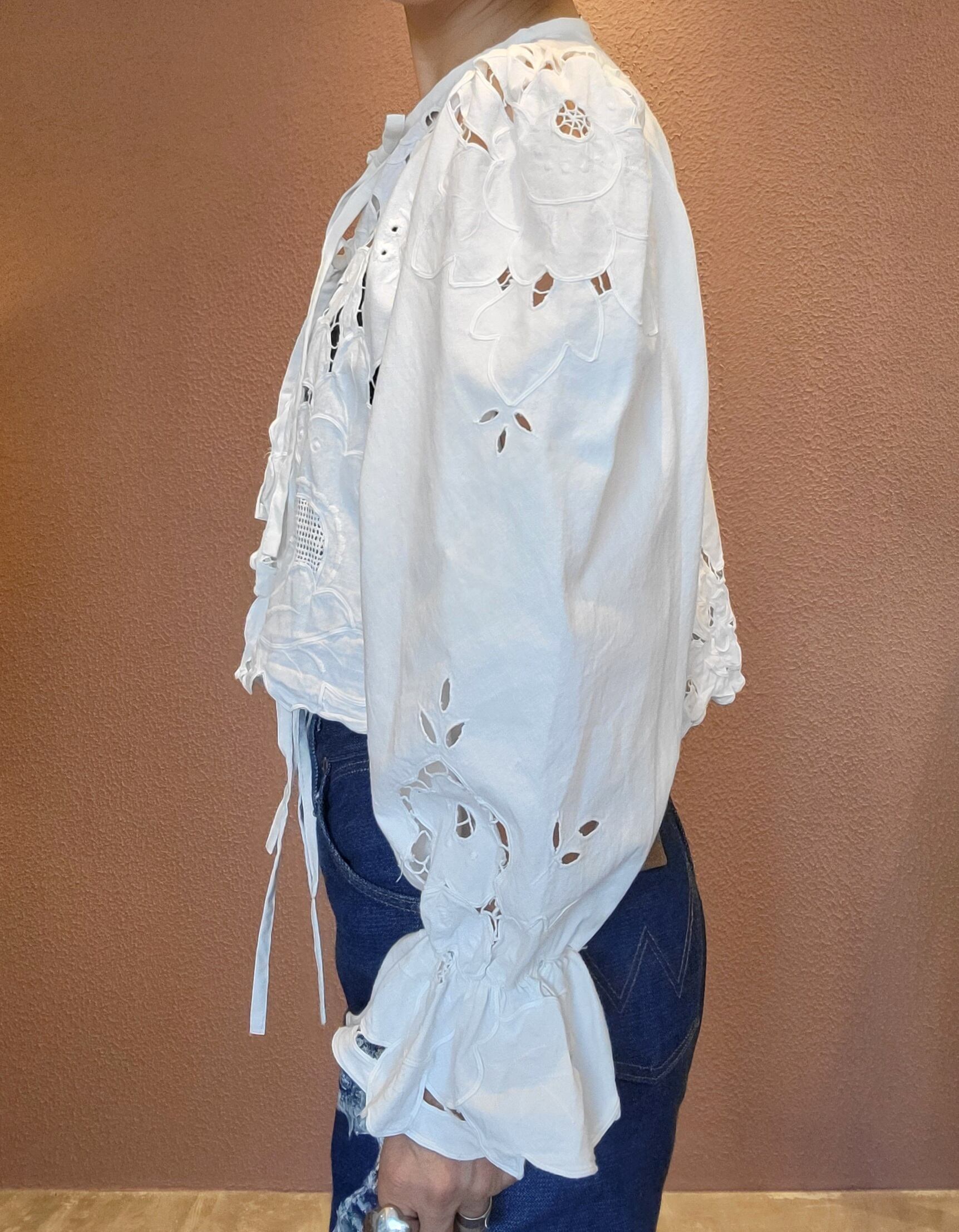 ヴィンテージのカットワークレース生地を利用したリメイクトップス。素材表記はありませんがコットンのようです。ほどよい張り感があります。カフスはゴム仕様です。ブラウスとしても羽織りとしても着用できます。