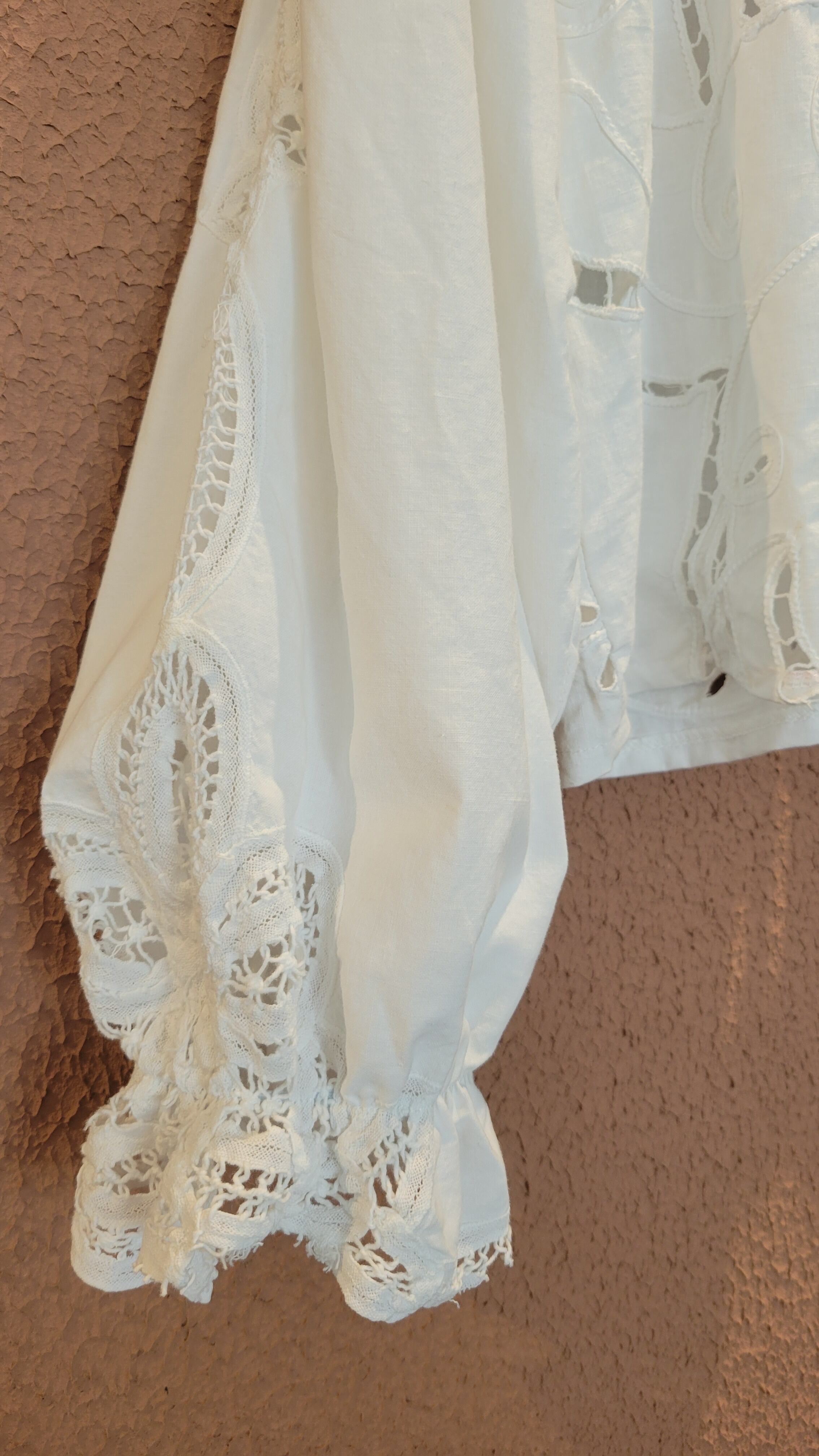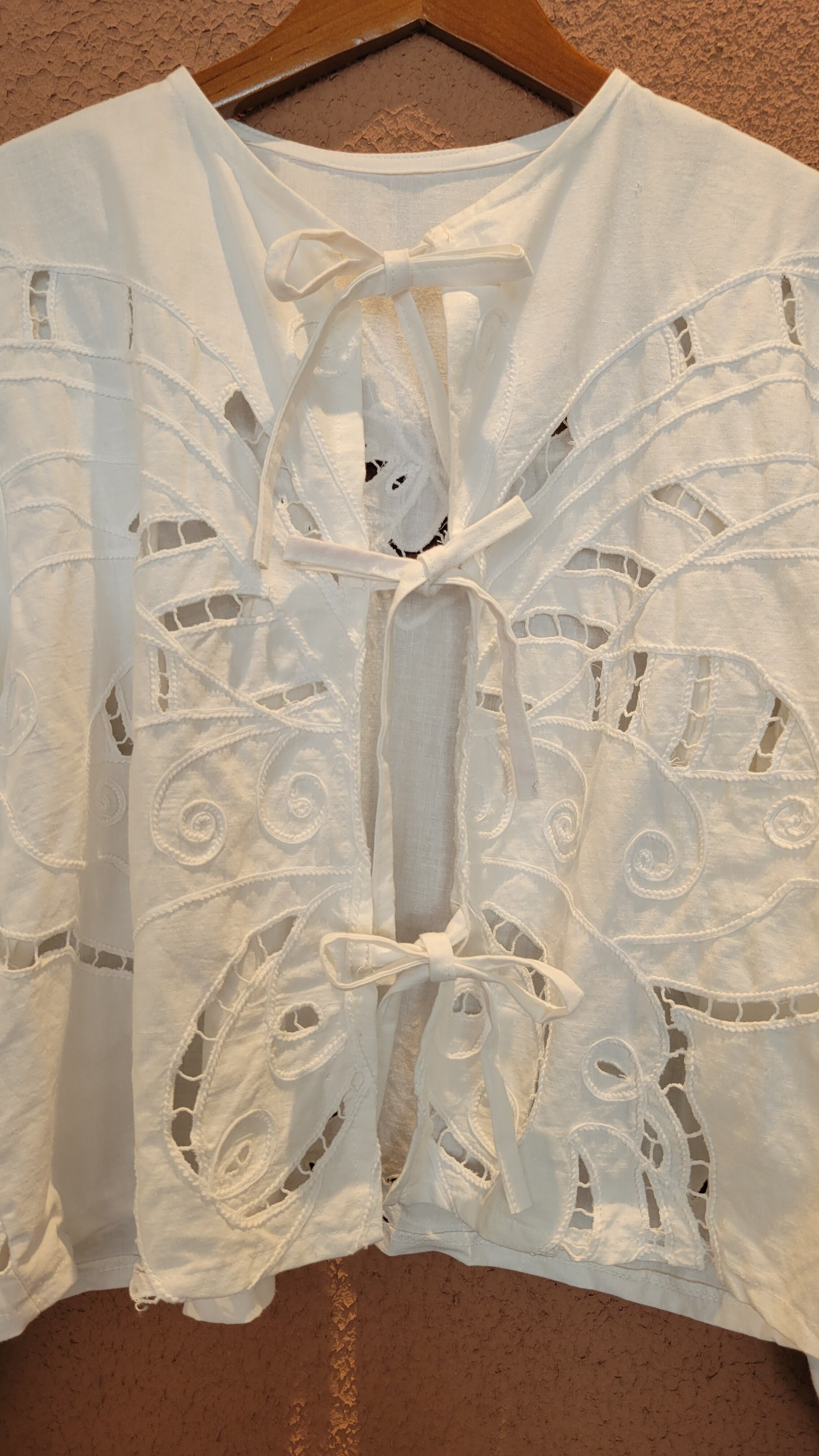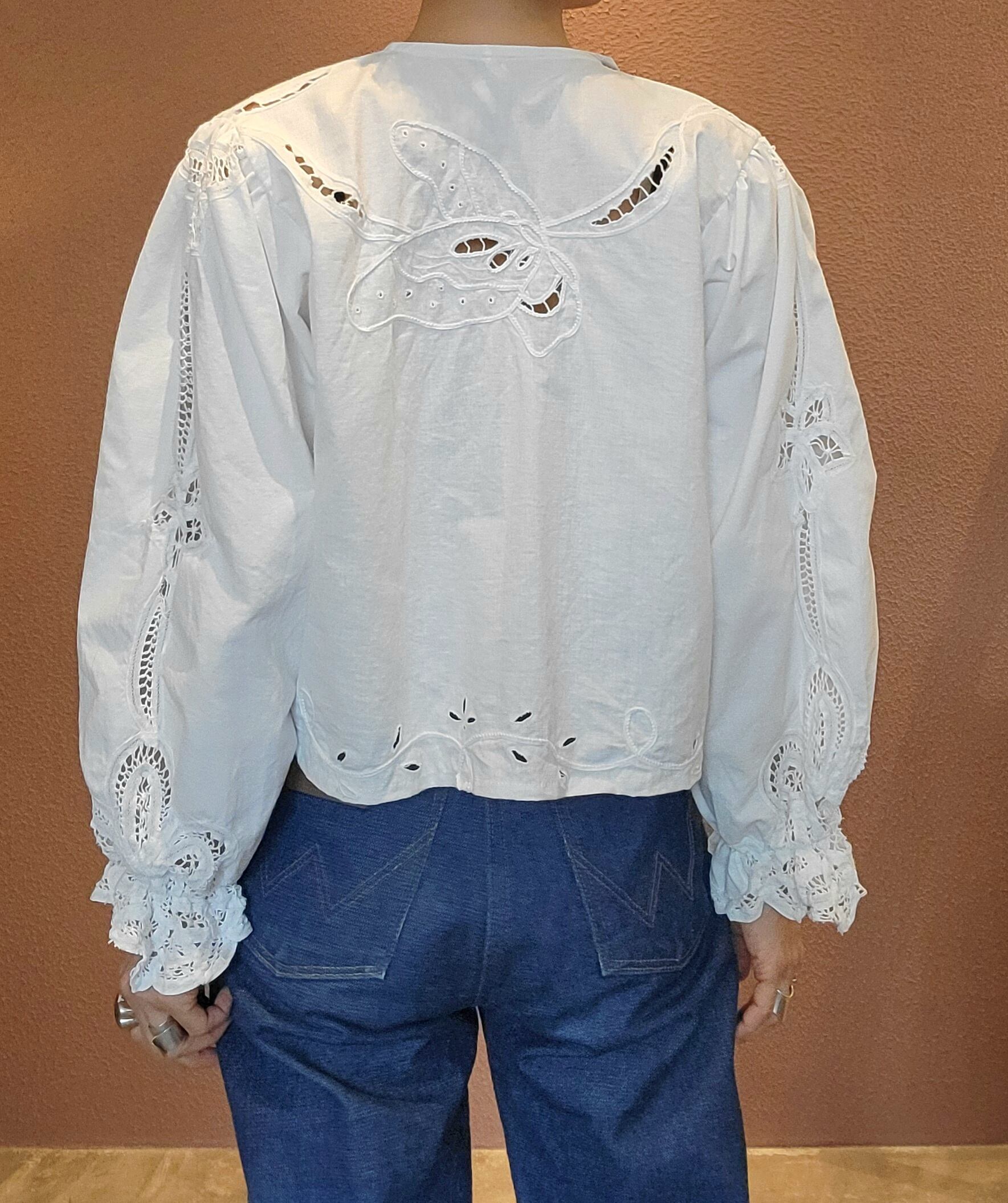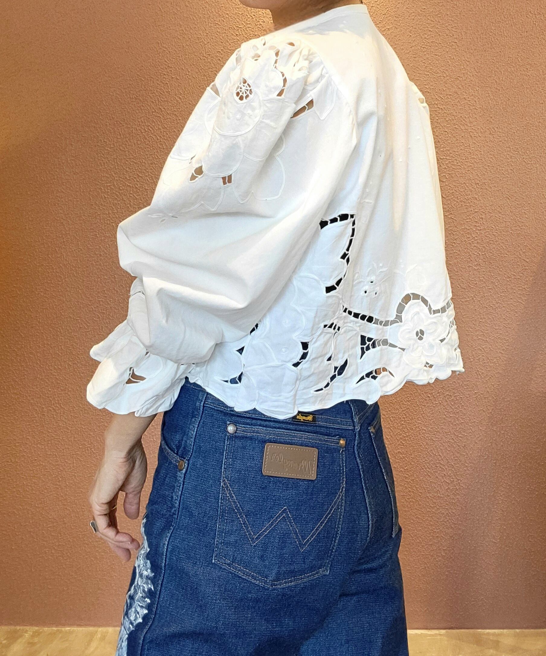 ヴィンテージのカットワークレース生地を利用したリメイクトップス。素材表記はありませんがコットンのようです。ほどよい張り感があります。カフスはゴム仕様です。ブラウスとしても羽織りとしても着用できます。