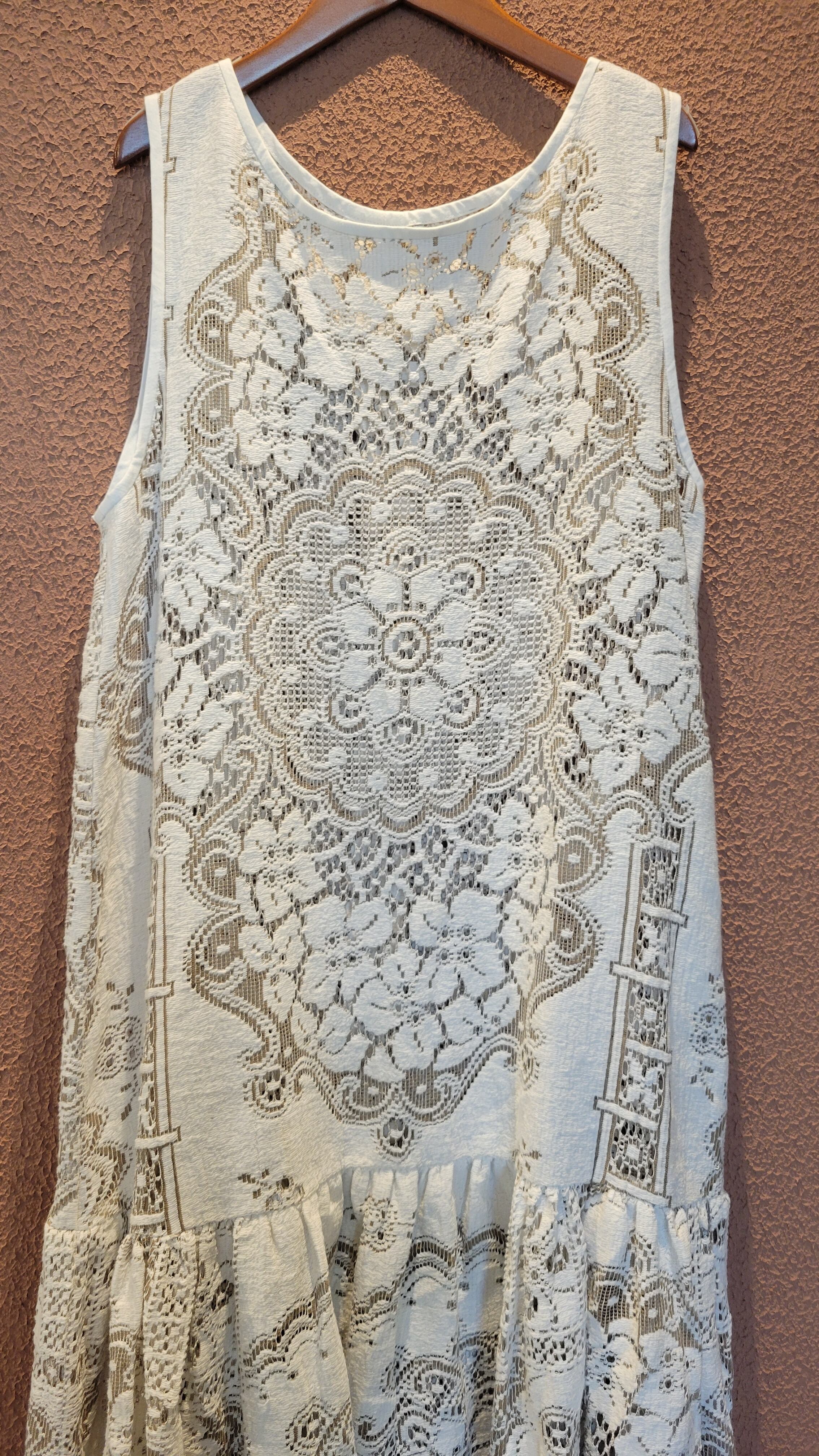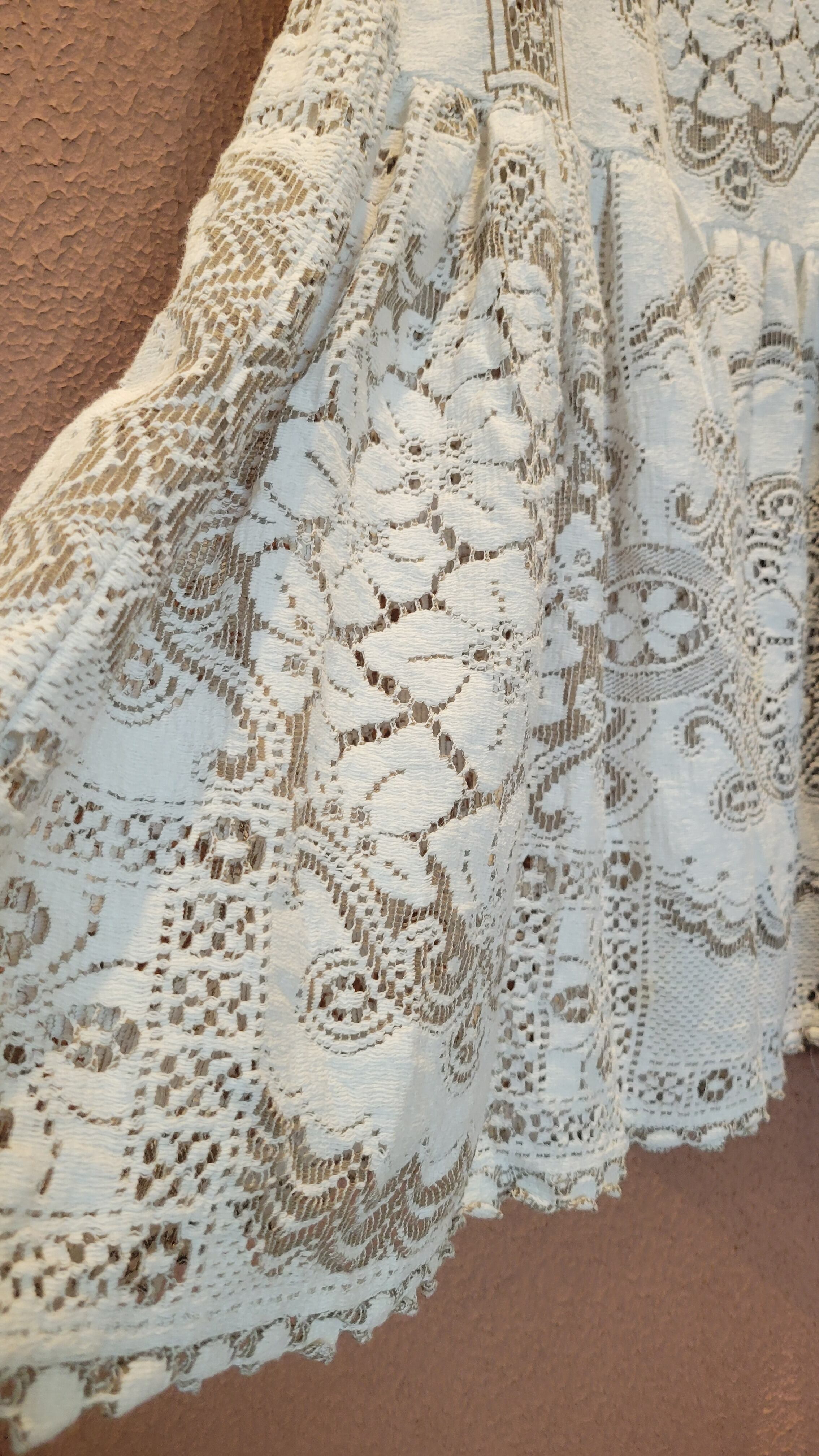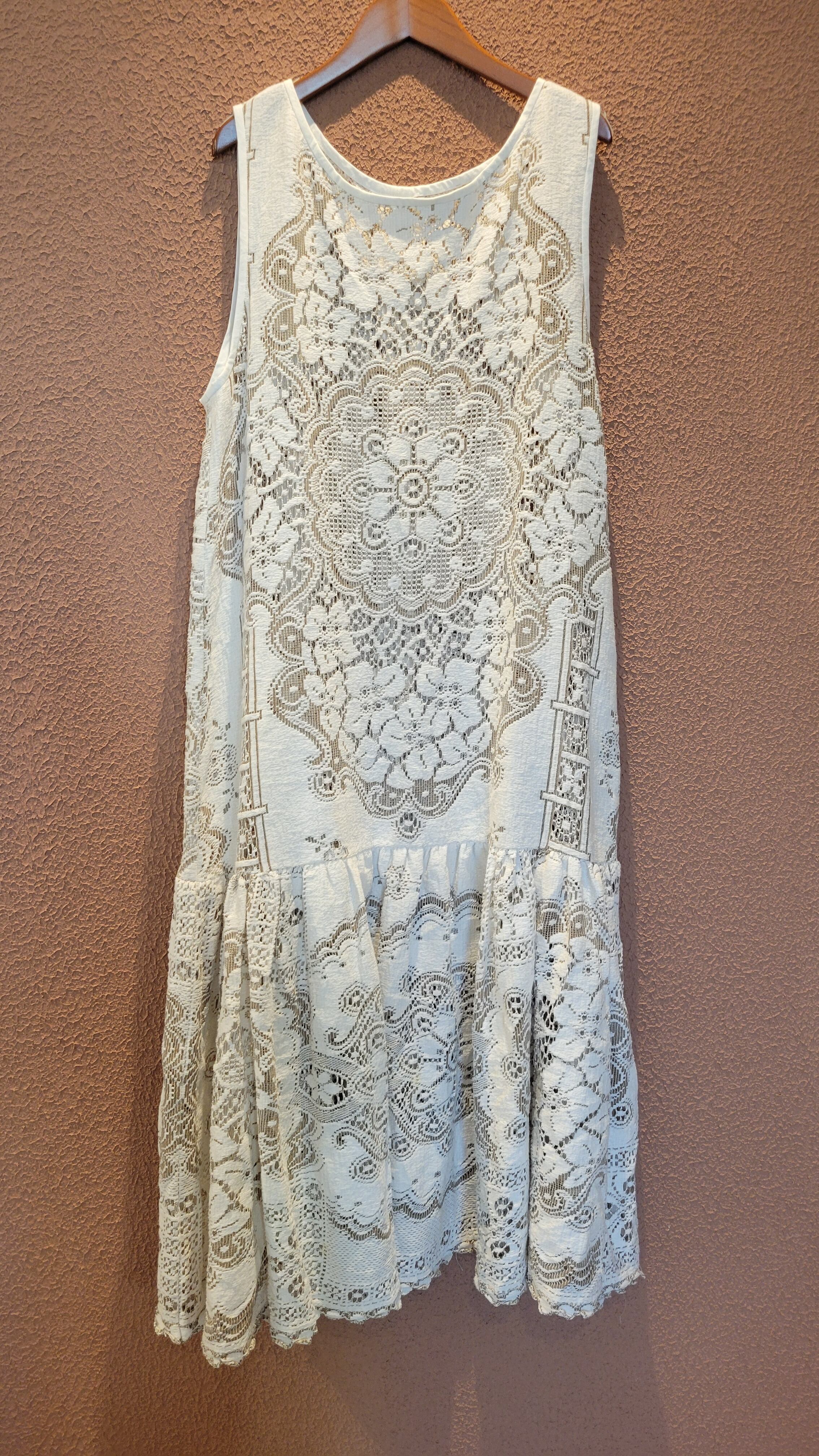 ヴィンテージレースを使用したリメイクワンピース。素材表記はありませんがコットンのような素材感です。ファスナーは付いておらず頭から被って着用するプルオーバータイプ。アームホール広めです。裾にはたっぷりのギャザー。1枚で甘めのスタイリングはもちろん、デニムやミリタリーパンツ等、無骨なボトムに合わせてカジュアルなスタイリングもおすすめです。
