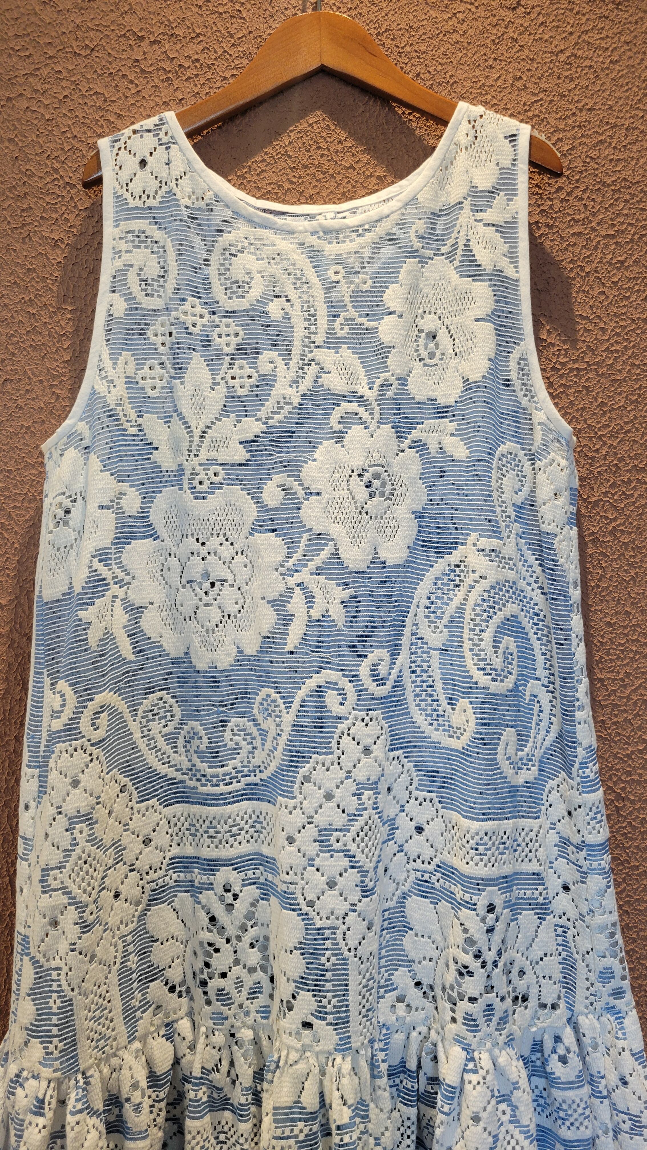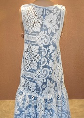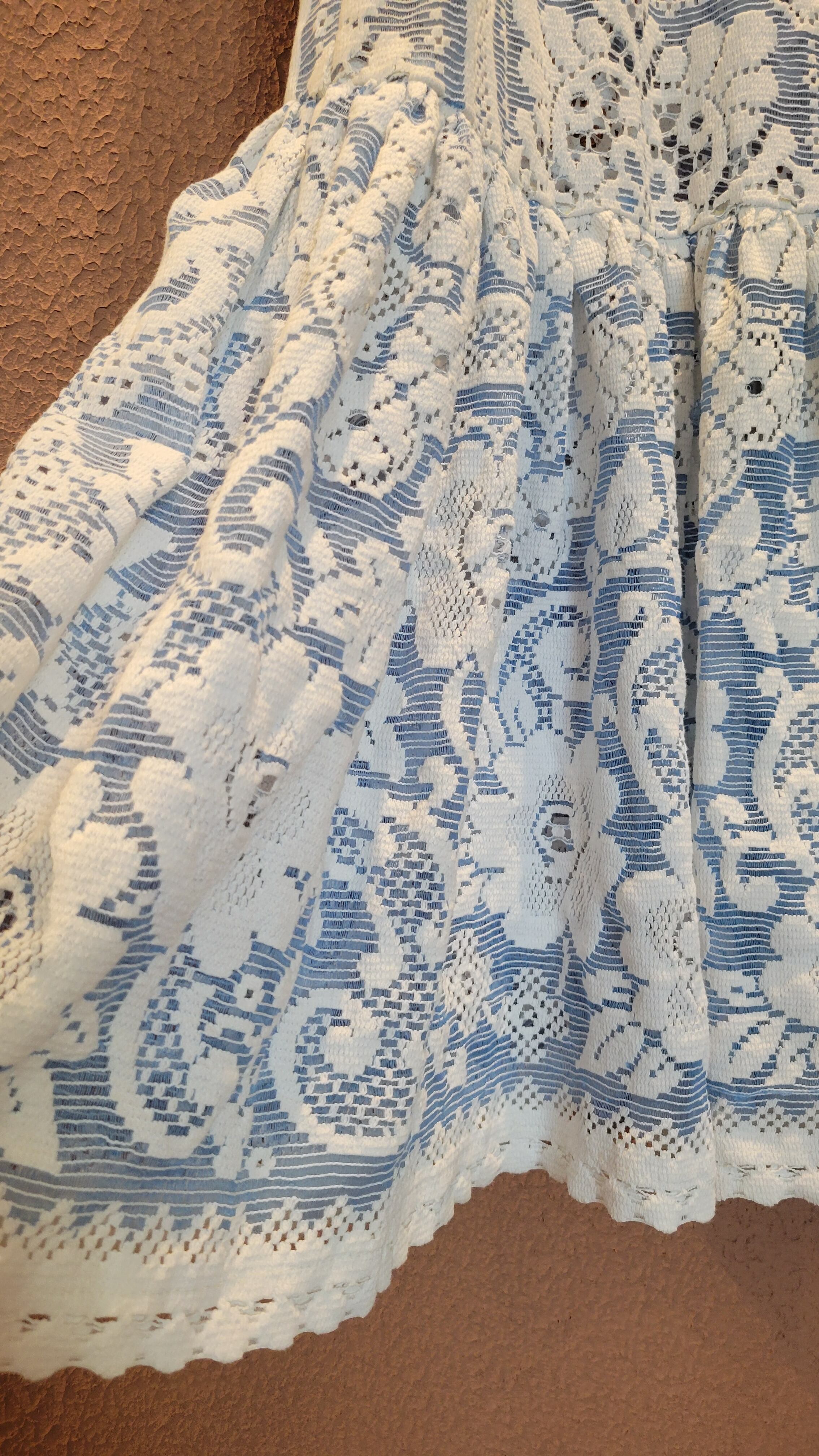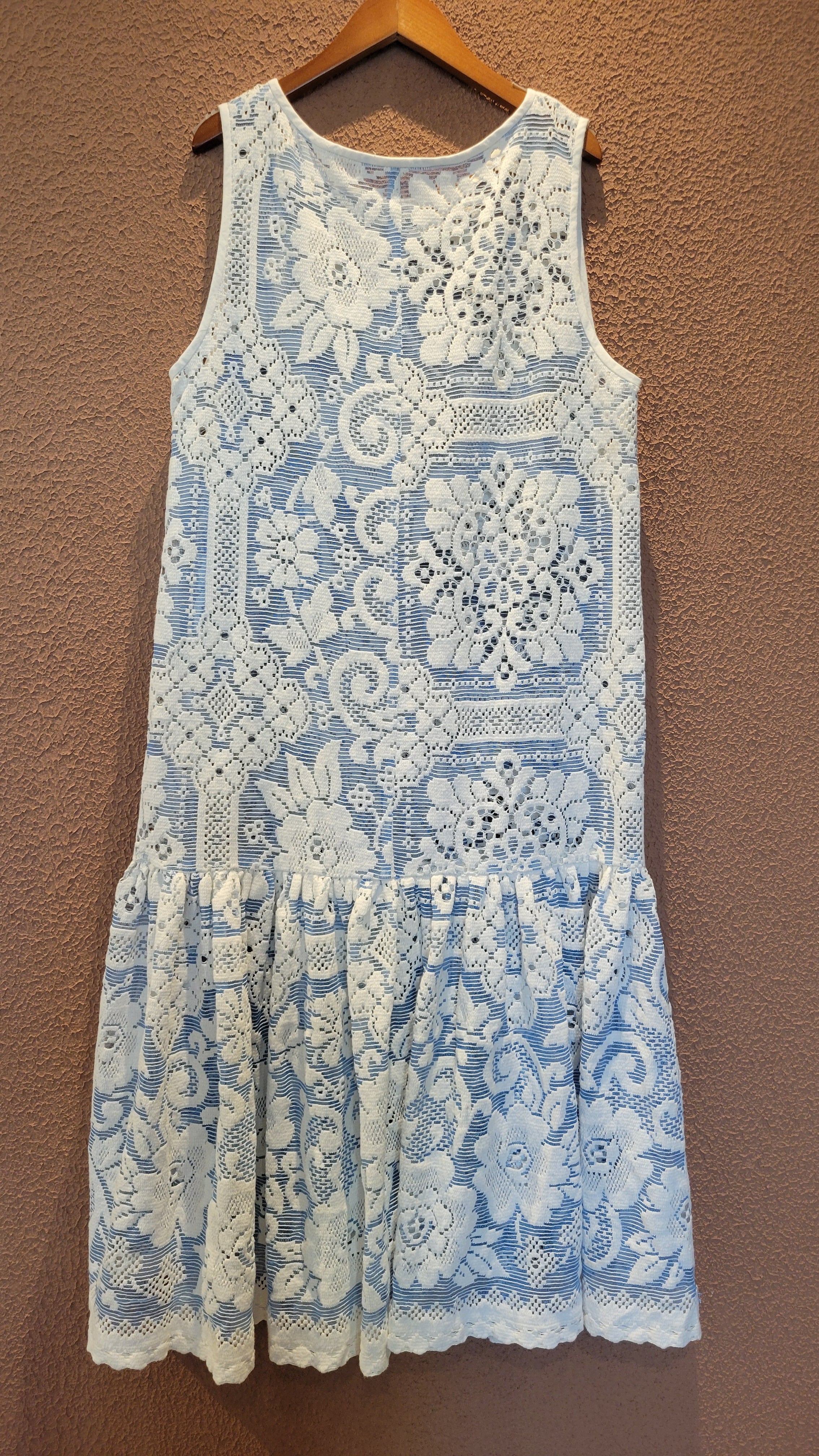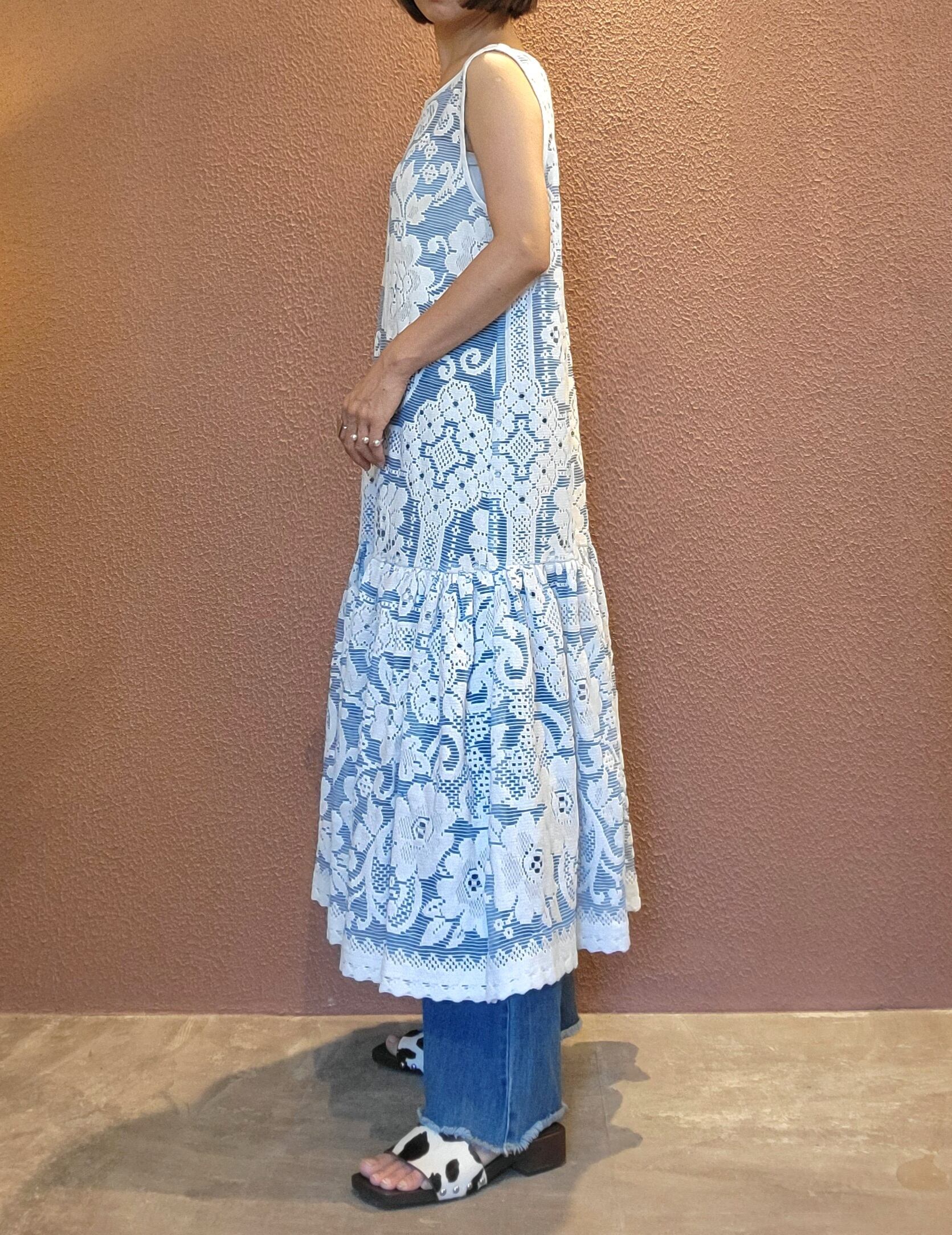 希少なヴィンテージのカラーレースを使用したリメイクワンピース。素材表記はありませんがコットンとポリエステルの混紡のような素材感です。ファスナーは付いておらず頭から被って着用するプルオーバータイプ。アームホール広めです。裾にはたっぷりのギャザー。1枚で甘めのスタイリングはもちろん、デニムやミリタリーパンツ等、無骨なボトムに合わせてカジュアルなスタイリングもおすすめです。