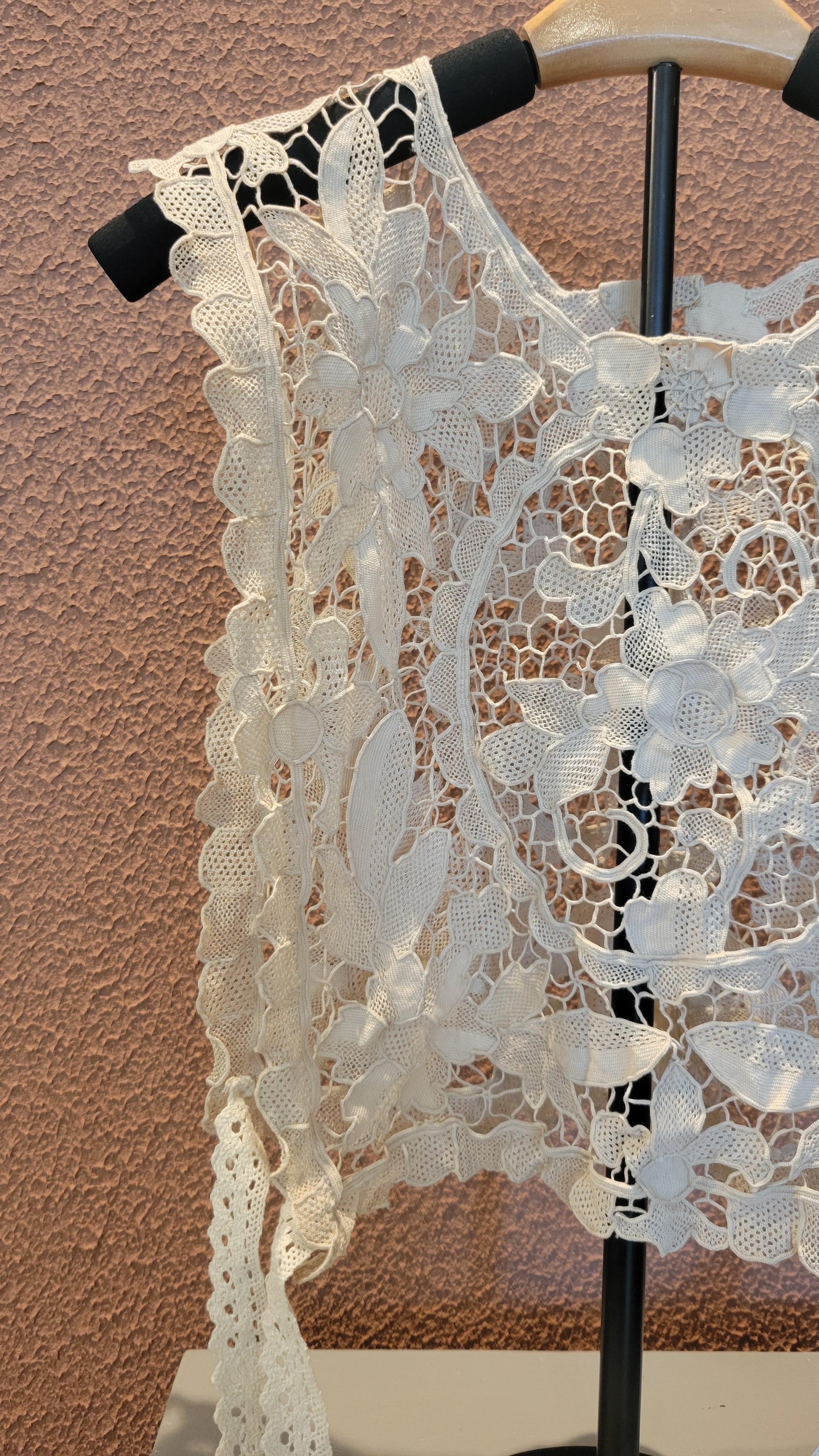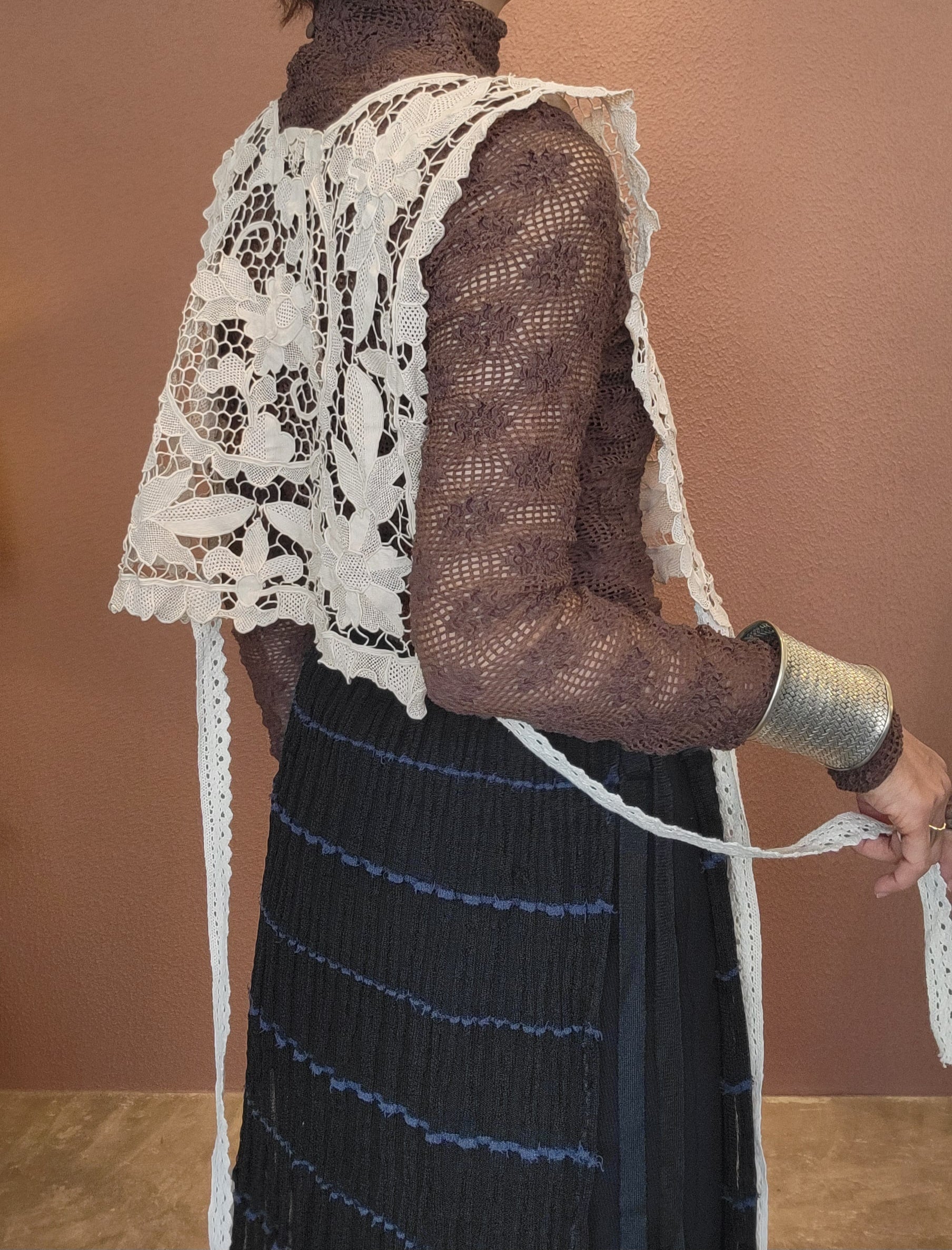 ヴィンテージレースを使用したリメイク付け襟。素材はコットンのようです。サイドリボンは結んでもそのまま垂らしても素敵です。インナーとのコントラストにより繊細なレースの模様が美しく引き立ちます。派手さとは一味違う上品な存在感はヴィンテージレースならでは。
