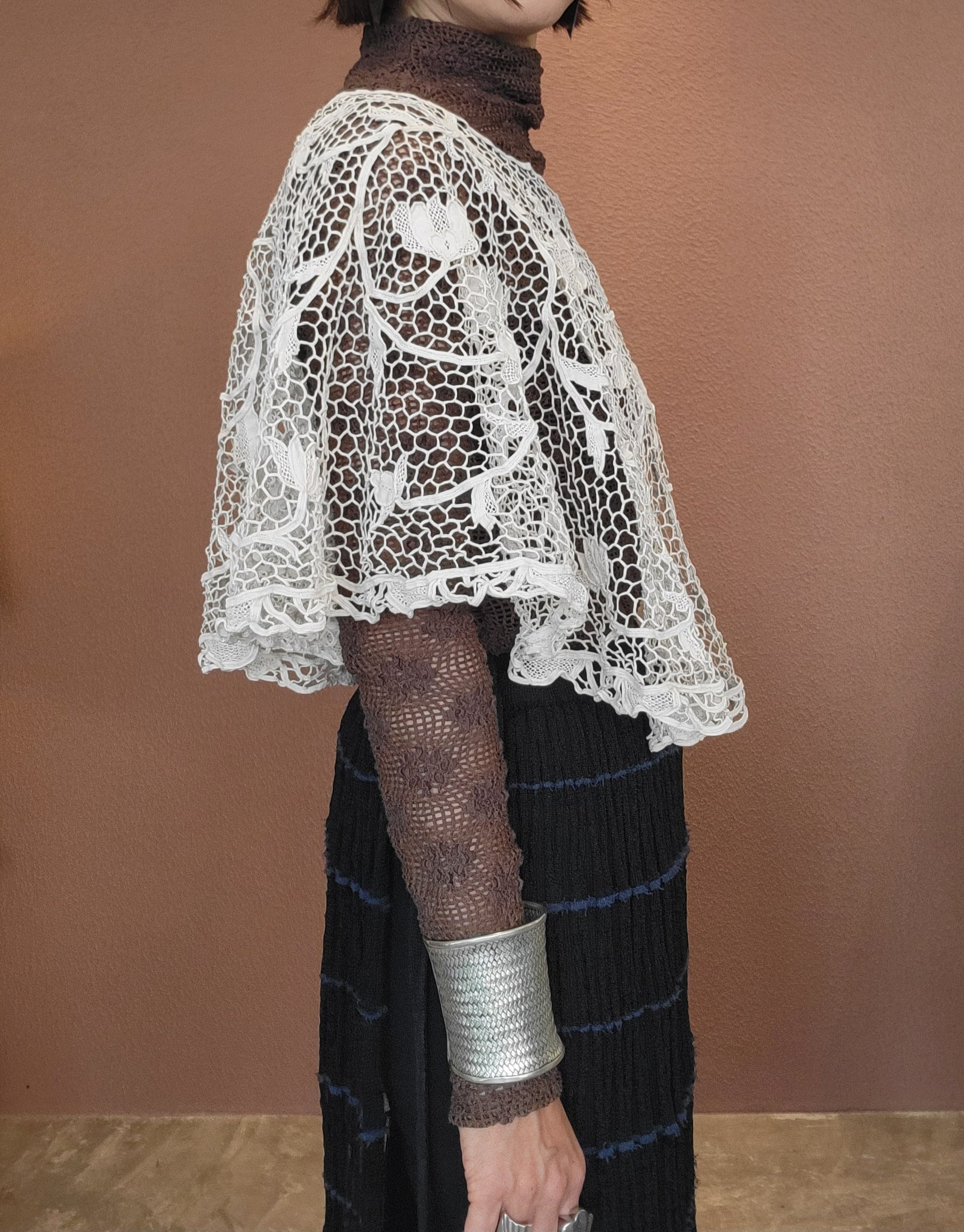ヴィンテージレースを使用したリメイク付け襟。素材はコットンのようです。頭からすっぽり被るだけでいつものスタイリングが華やかに。インナーとのコントラストにより繊細なレースの模様が美しく引き立ちます。派手さとは一味違う上品な存在感はヴィンテージレースならでは。