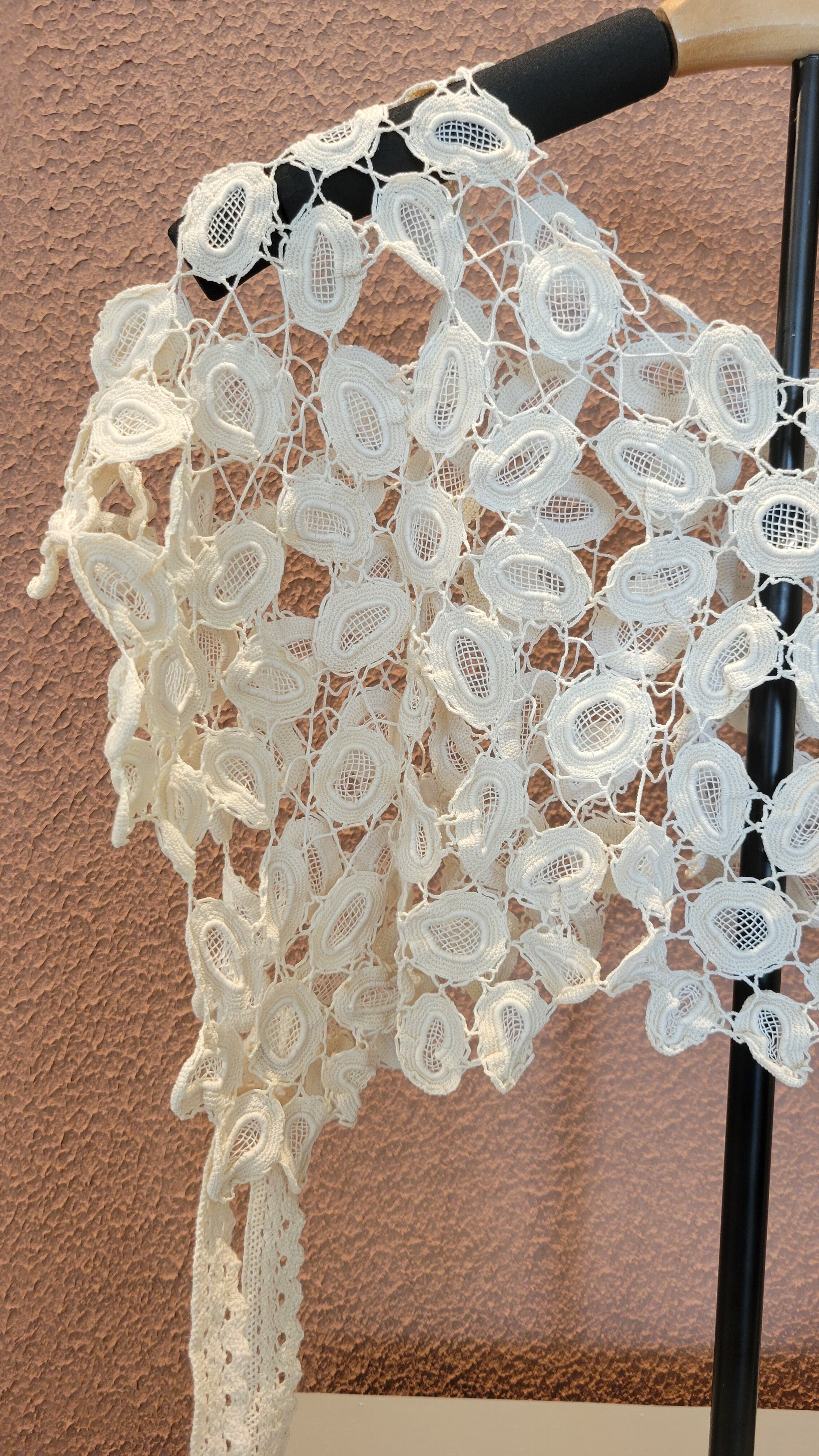 ヴィンテージレースを使用したリメイク付け襟。素材はコットンのようです。サイドリボンは結んでもそのまま垂らしても素敵です。インナーとのコントラストにより繊細なレースの模様が美しく引き立ちます。派手さとは一味違う上品な存在感はヴィンテージレースならでは。