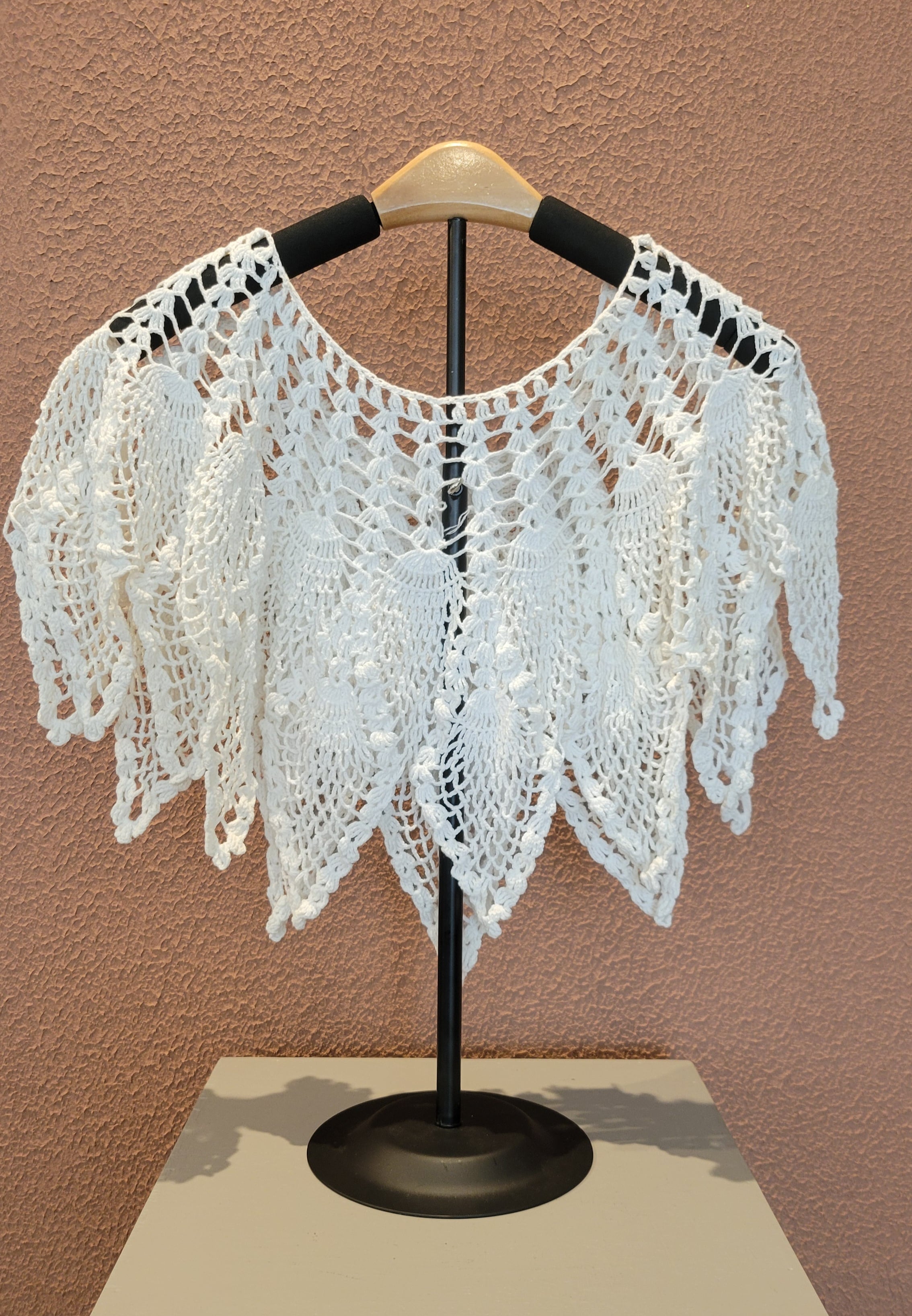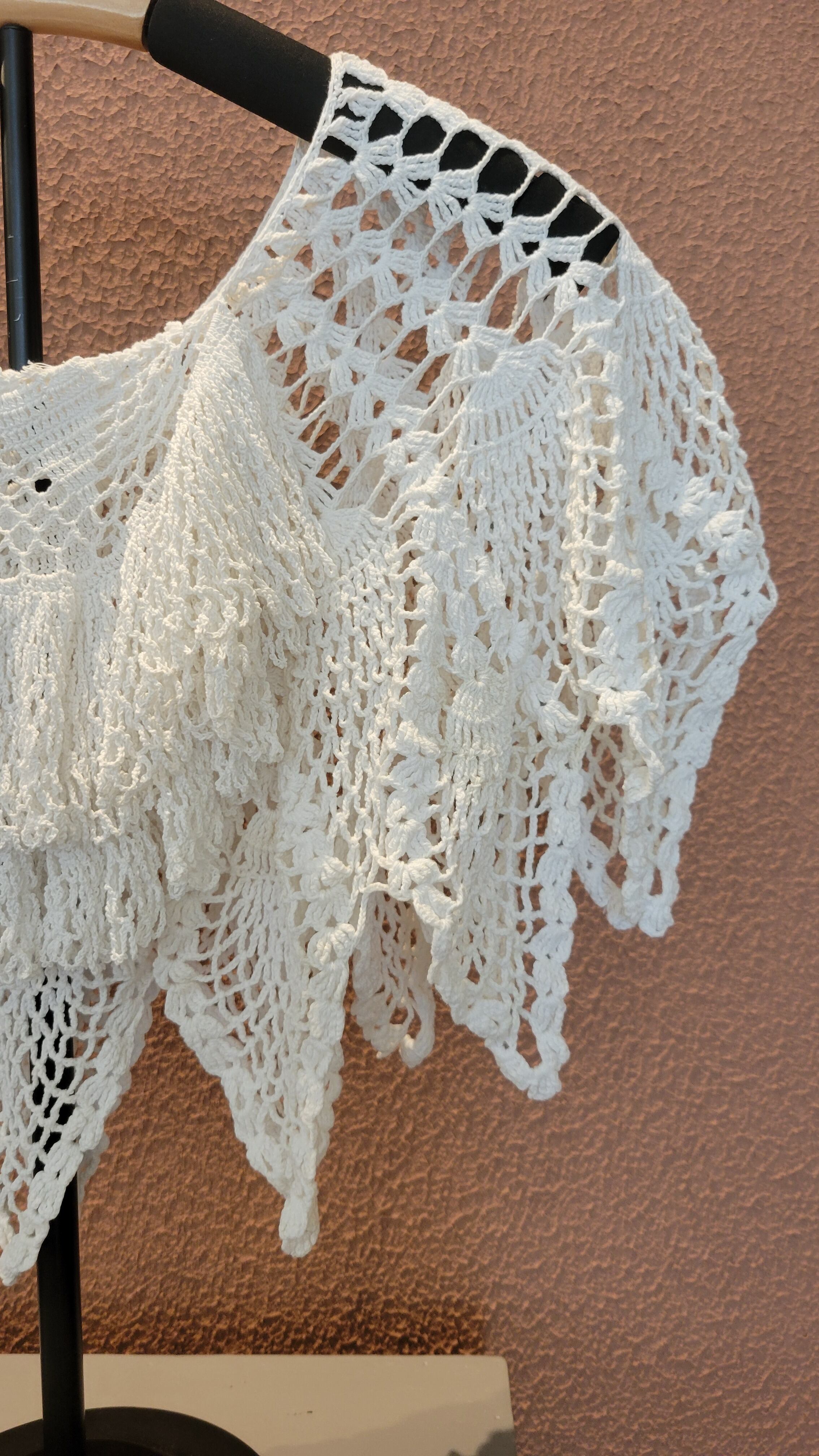 ヴィンテージのクロシェ生地を使用したリメイク付け襟。素材はコットンのようです。頭からすっぽり被るだけのプラスワンアイテム。胸元のフリルがいつものスタイリングを華やかに。古着のTシャツに合わせてカジュアルダウンもおすすめです。