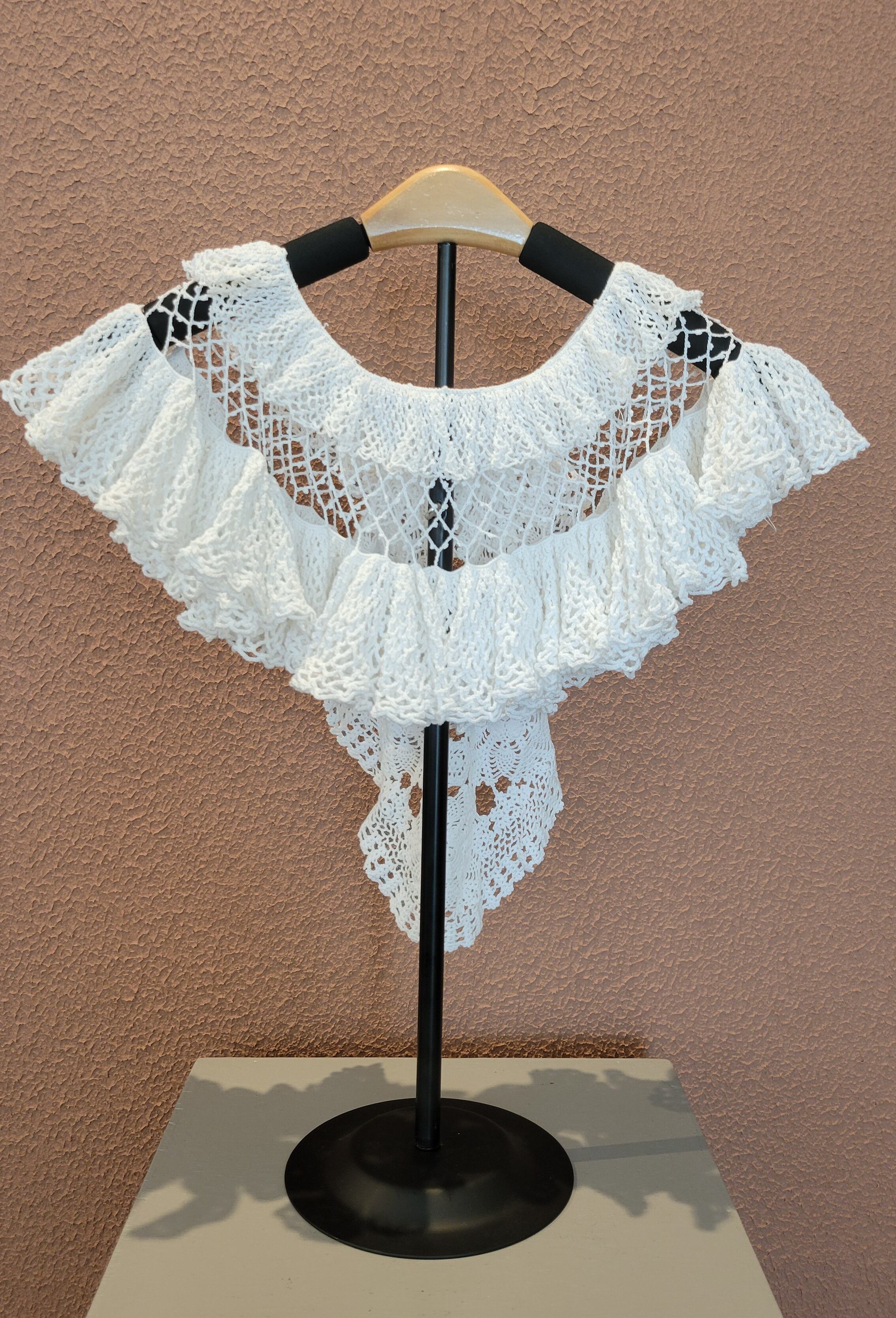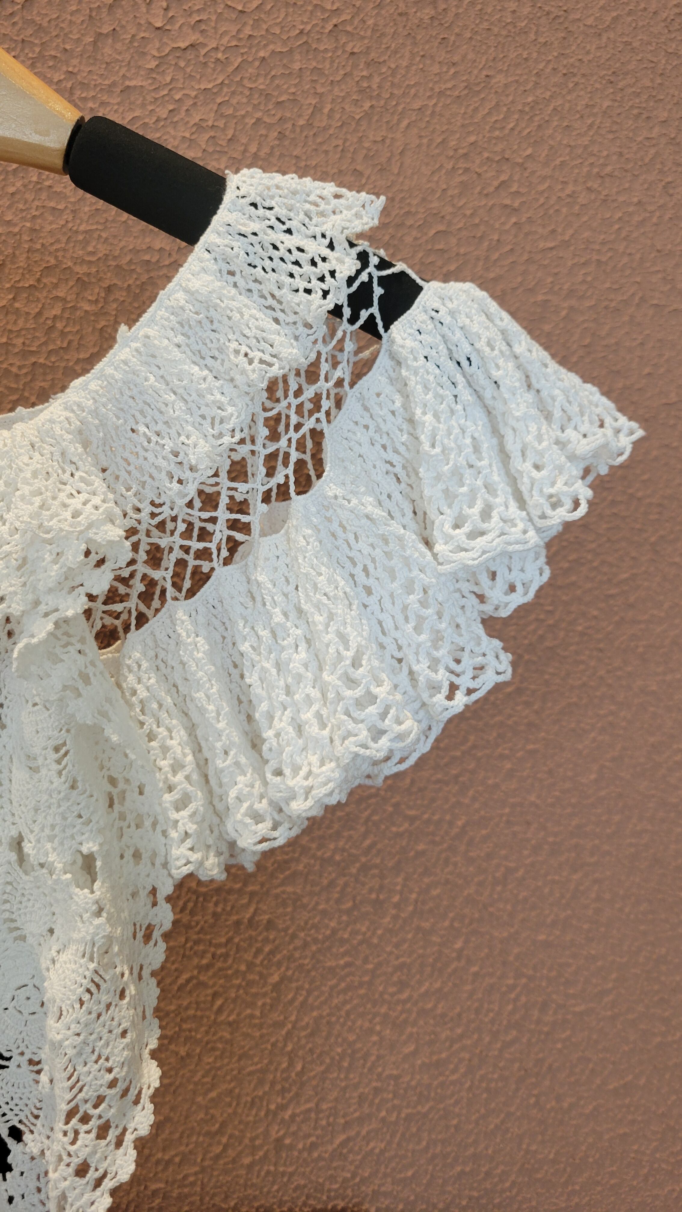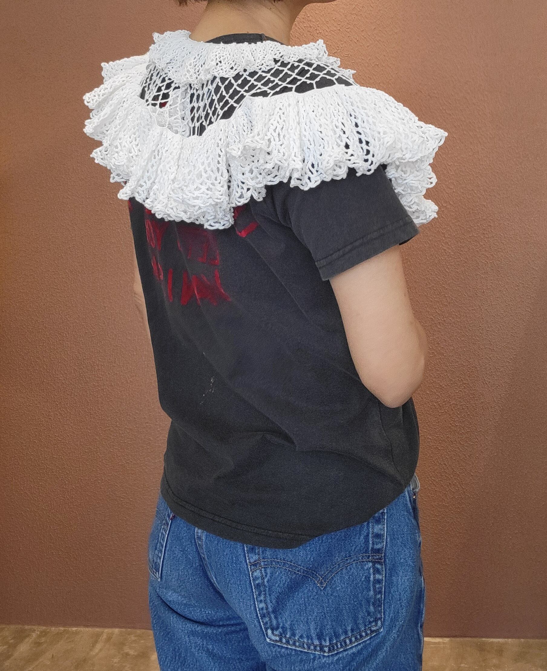 ヴィンテージのクロシェ生地を使用したリメイク付け襟。素材はコットンのようです。頭からすっぽり被るだけのプラスワンアイテム。胸元のフリルがいつものスタイリングを華やかに。古着のTシャツに合わせてカジュアルダウンもおすすめです。