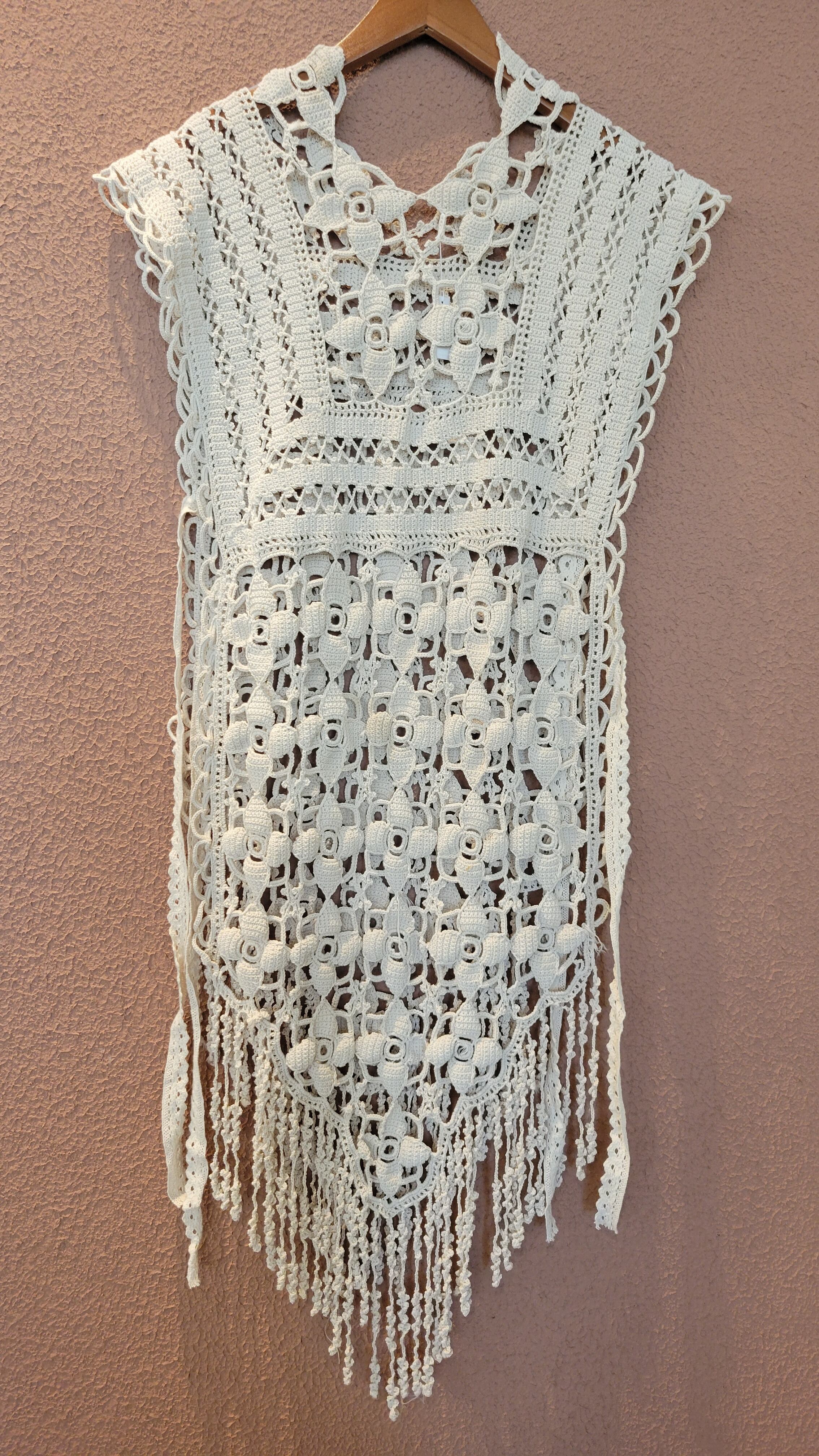 ヴィンテージのクロシェ生地を使用したリメイクワンピース/ポンチョ。素材不明ですがしっかりしたコットンのようです。やや重量感がありますが着用時に気になるほどではありません。サイドオープンのポンチョタイプで左右にリボンが付いています。肉厚で重厚感のあるヴィンテージクロシェが魅力の1枚です。