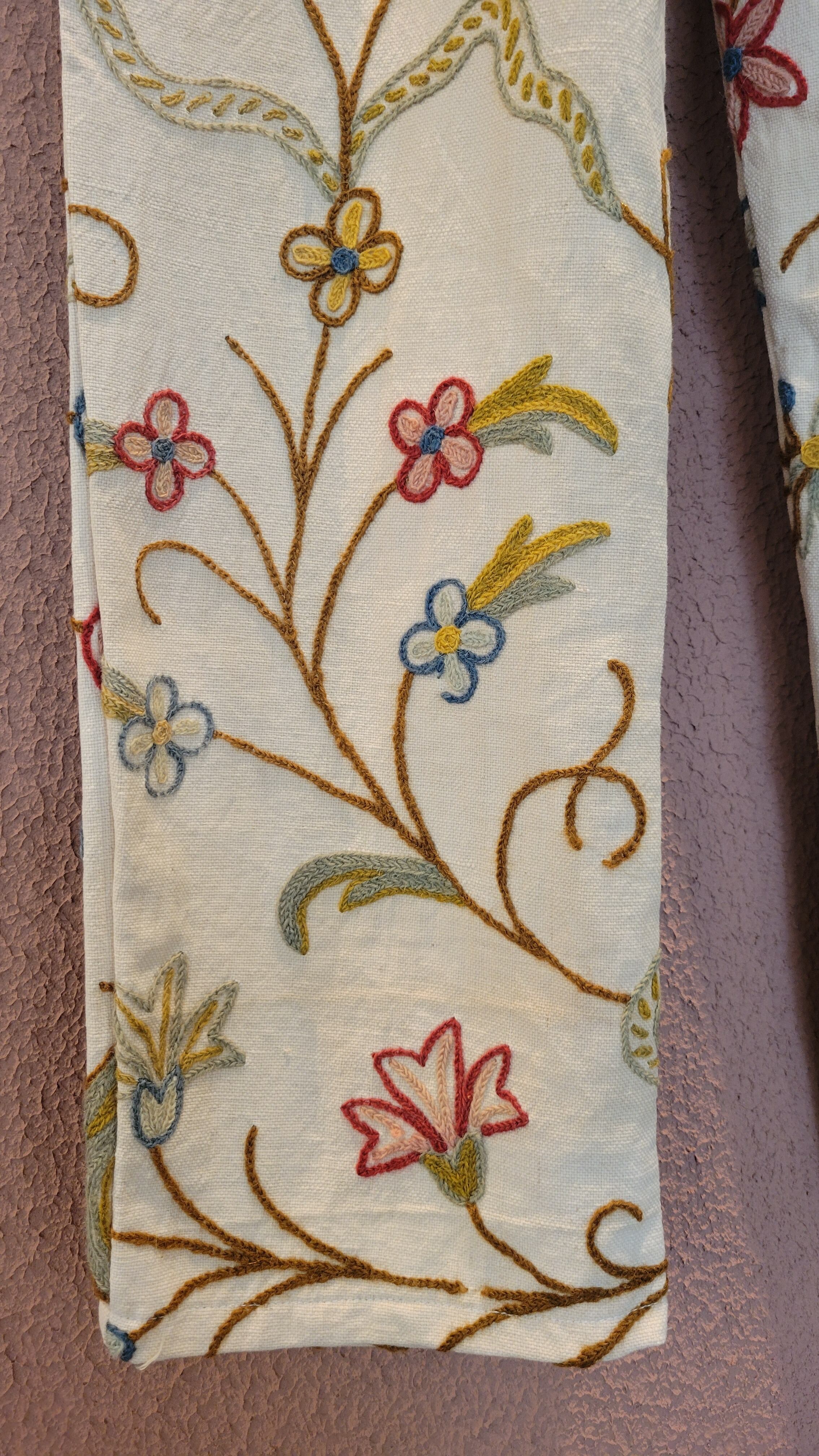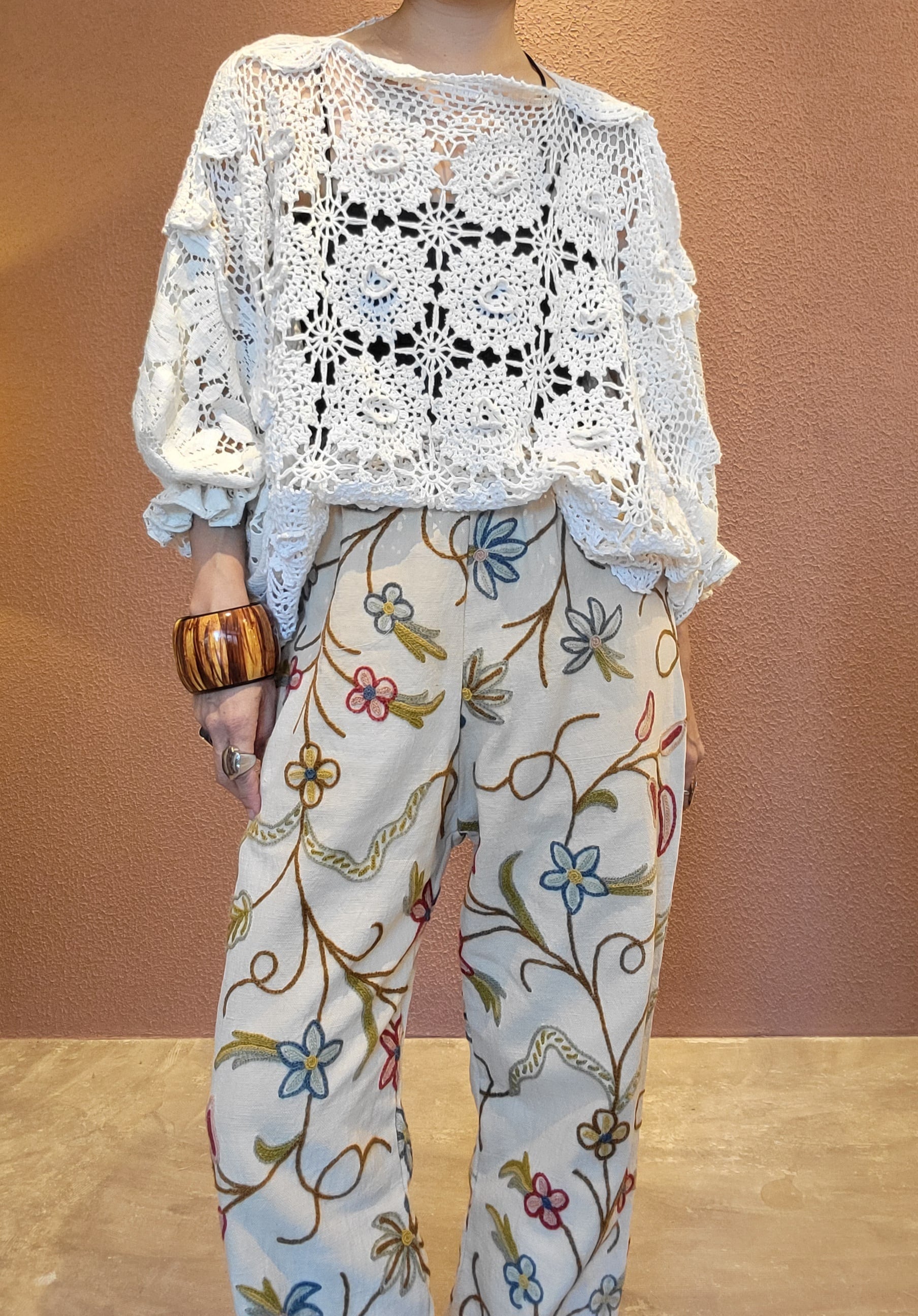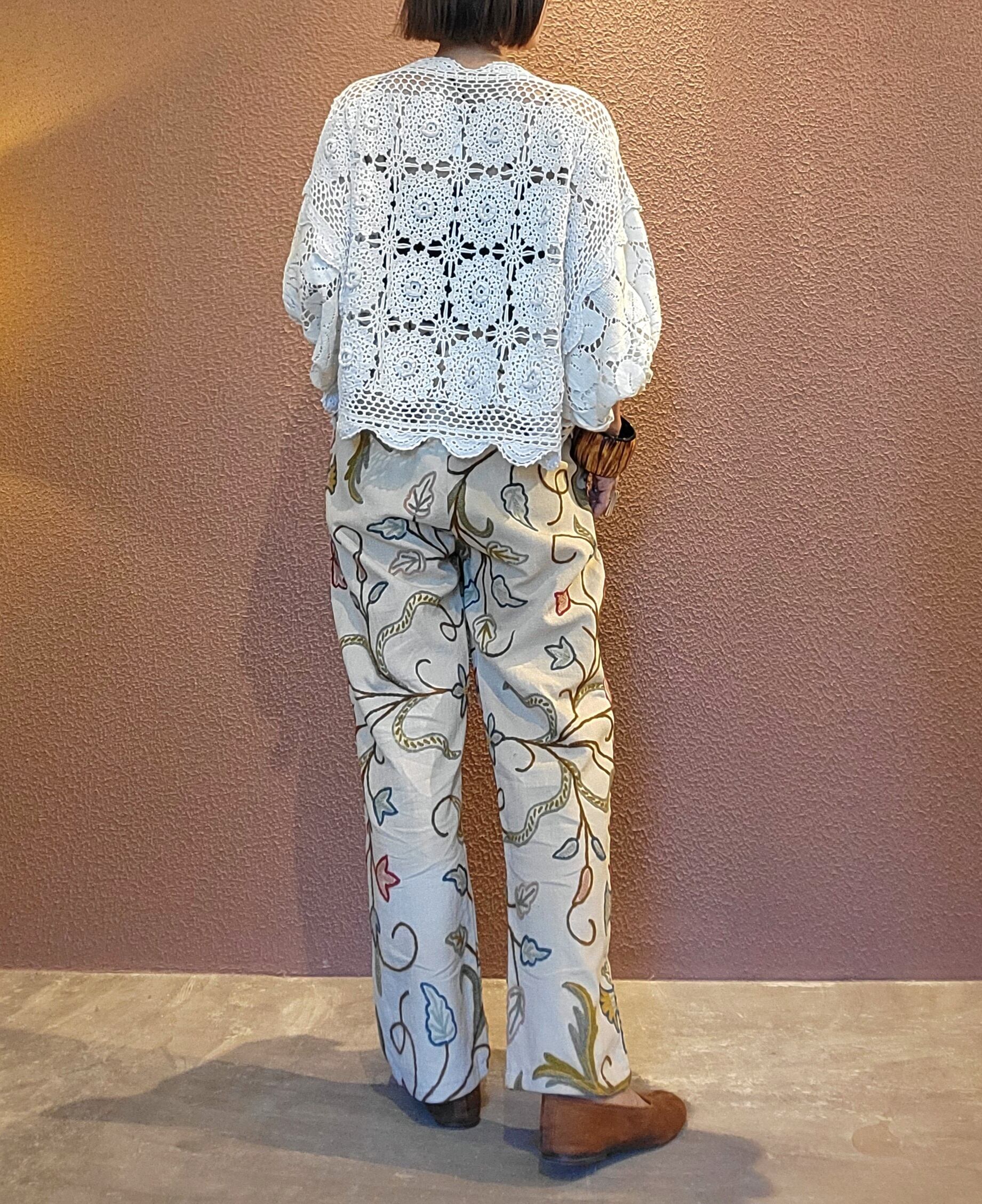 ヴィンテージの刺繍クロスを使用したリメイクイージーパンツ。素材はコットンとリネンの混紡のようです。ウエストゴム、左右シームポケット付き。やや薄めのベージュカラーでナチュラルな印象。着脱しやすく日常着にもぴったりなパンツです。