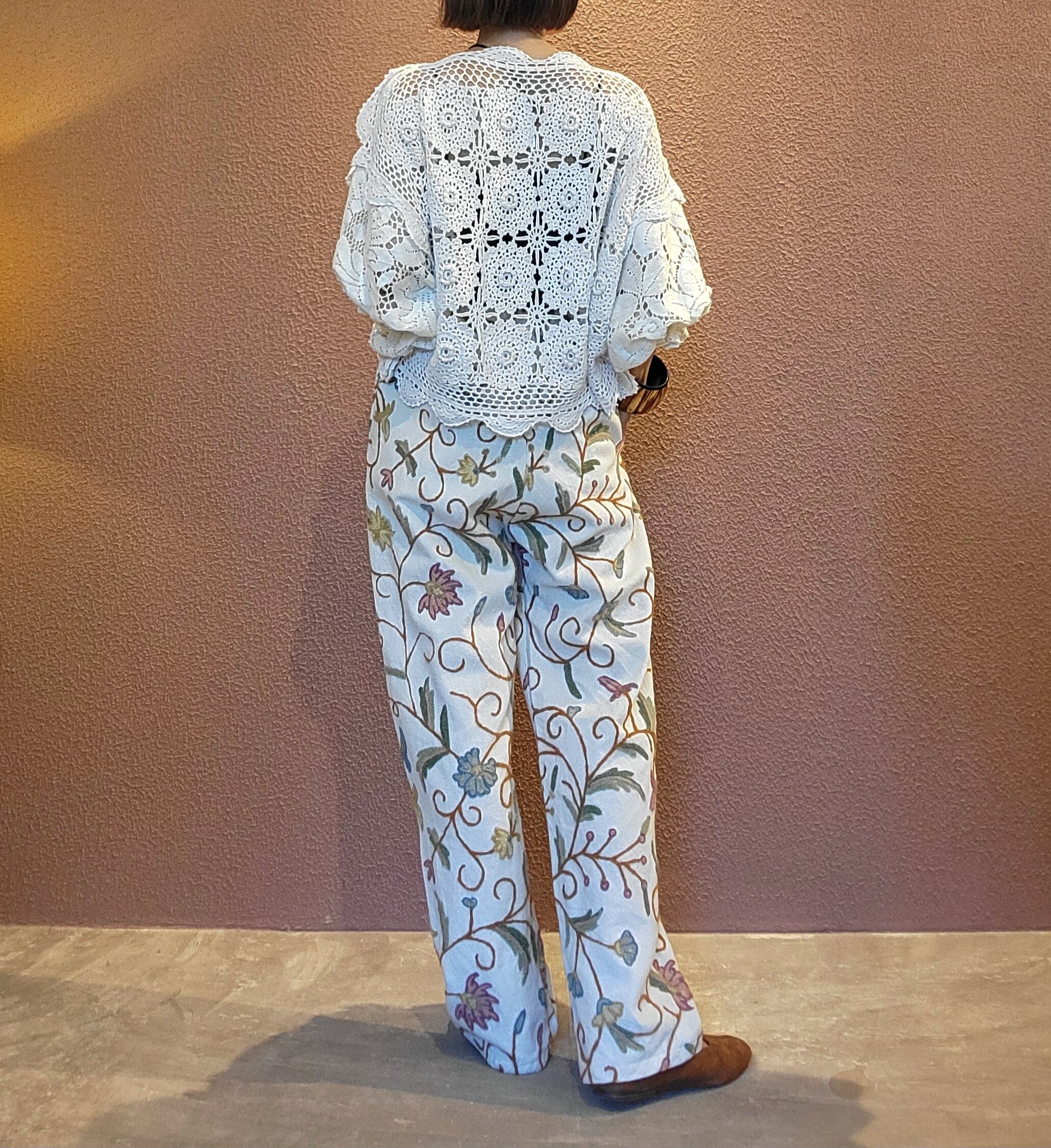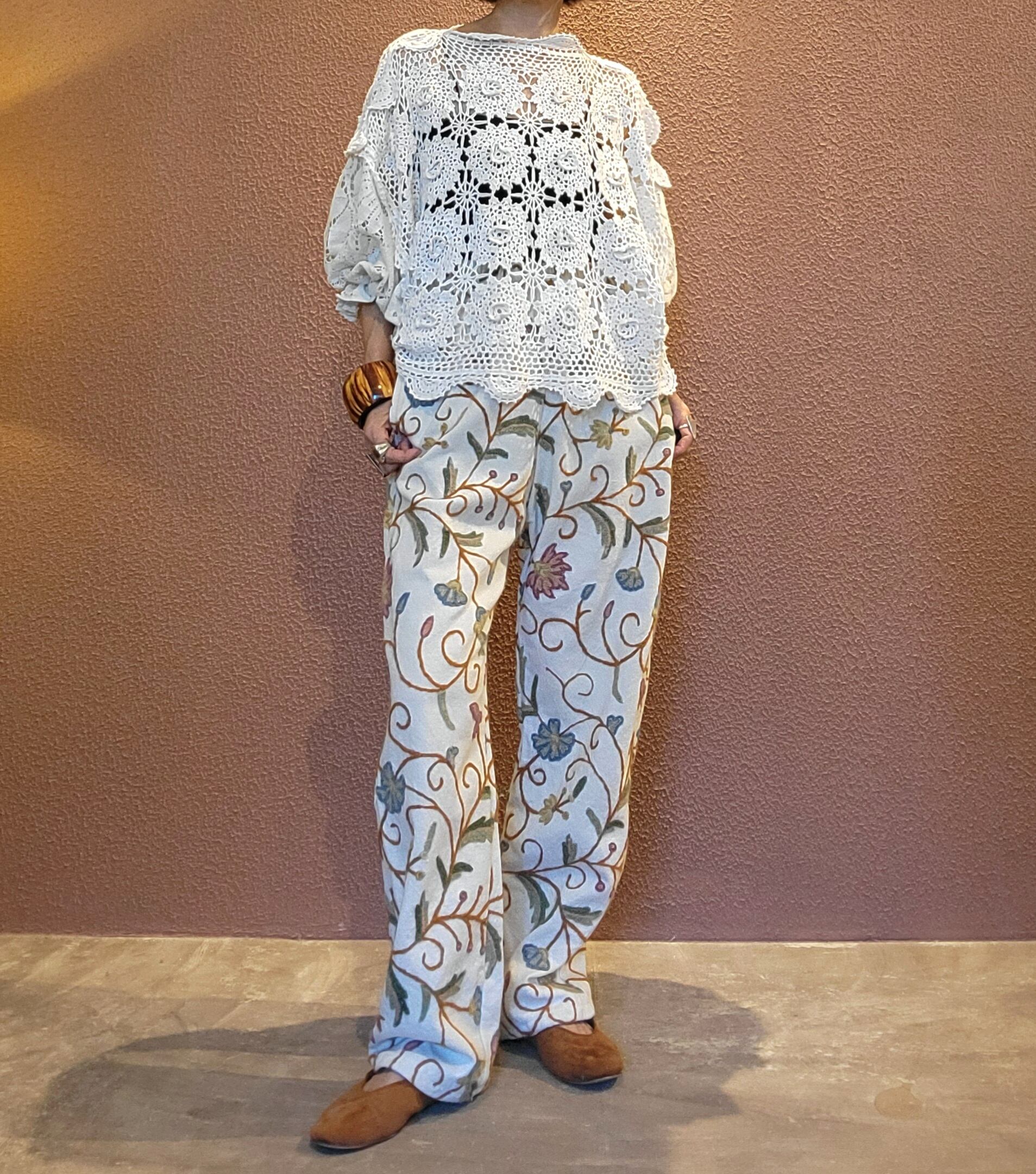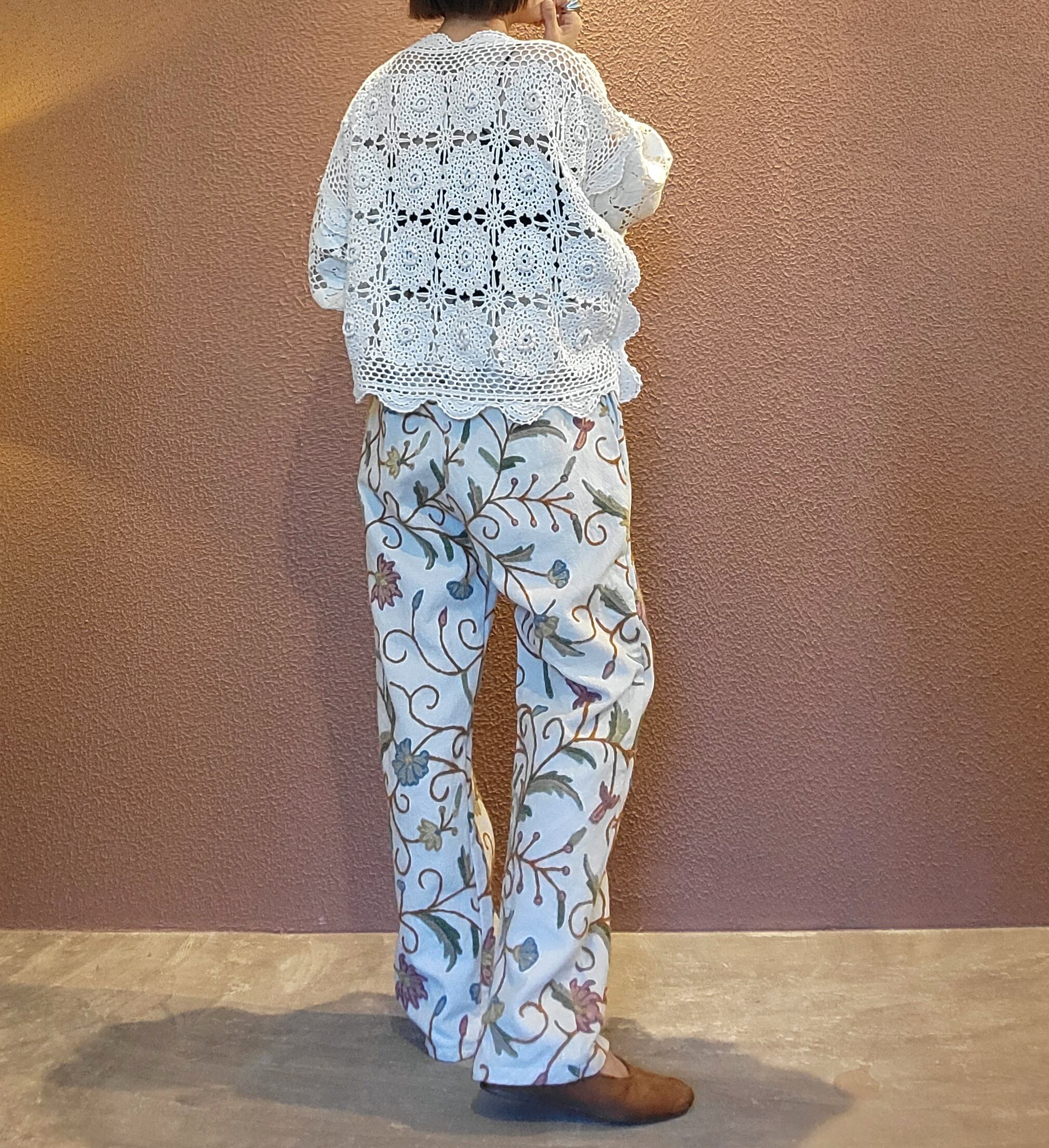 ヴィンテージの刺繍クロスを使用したリメイクイージーパンツ。素材はコットンとリネンの混紡のようです。少し起毛したような柔らかい肌触りの素材です。ウエストゴム、左右シームポケット付き。白地でナチュラルな印象です。着脱しやすく日常着にもぴったりなパンツです。