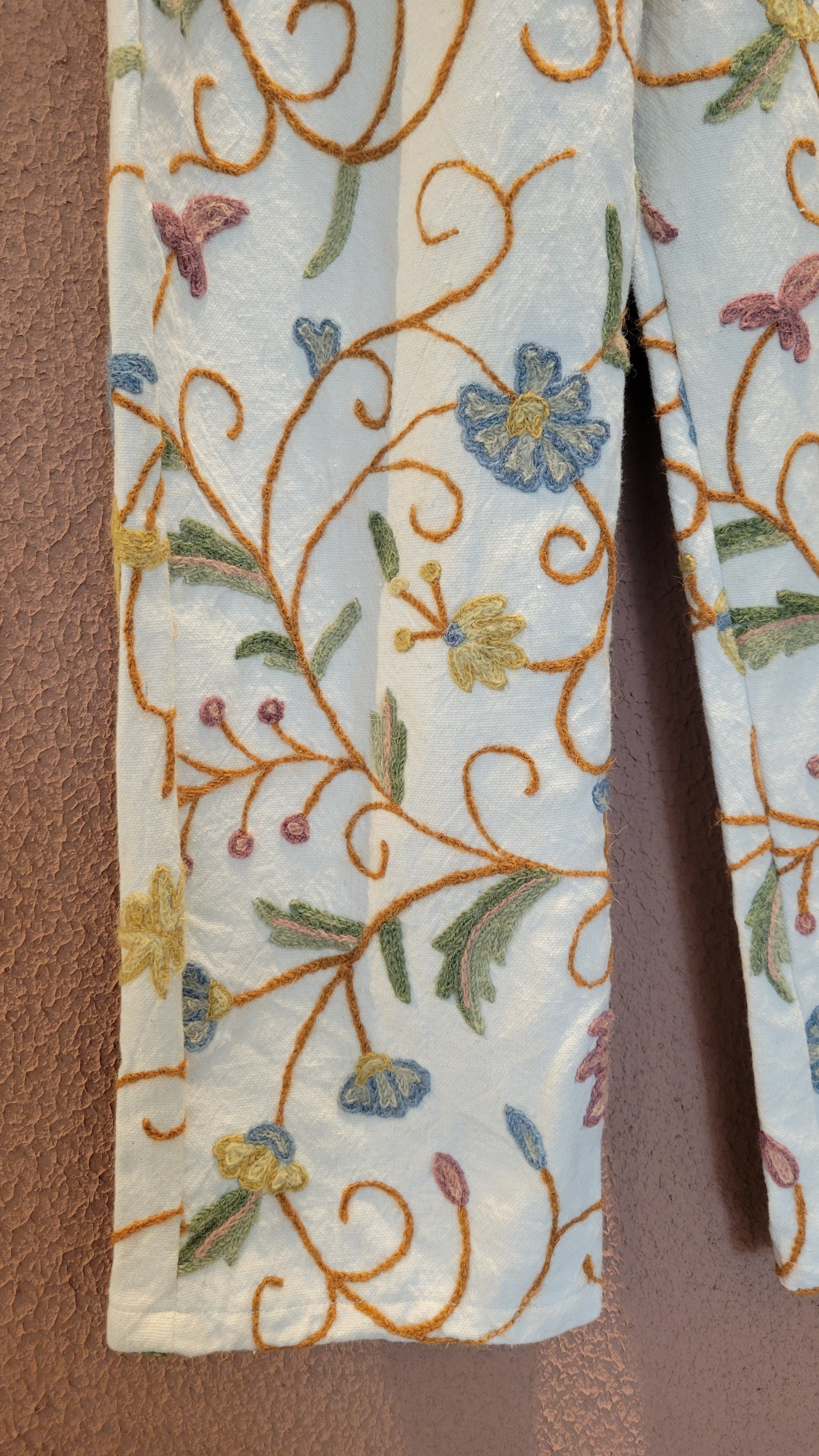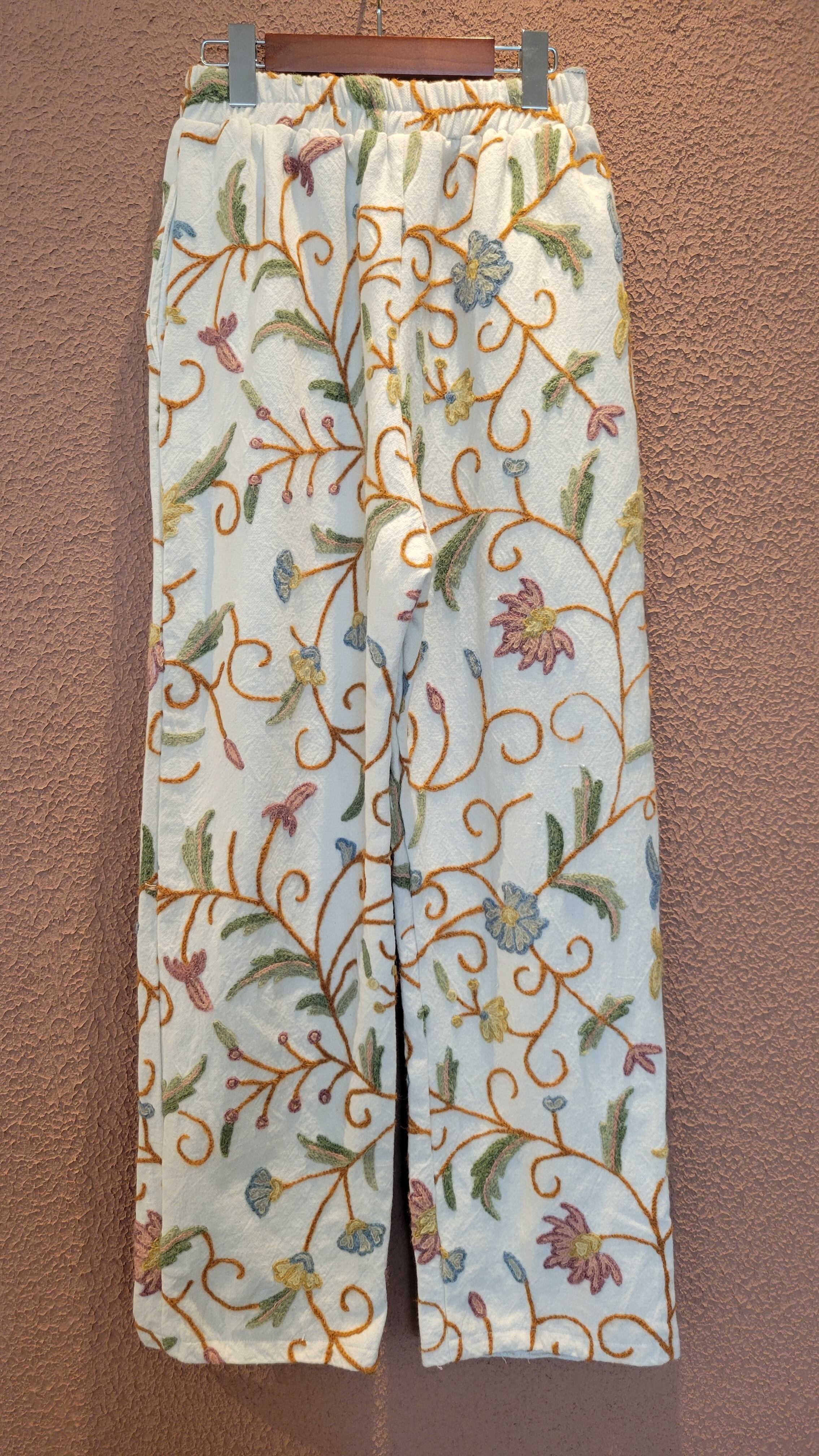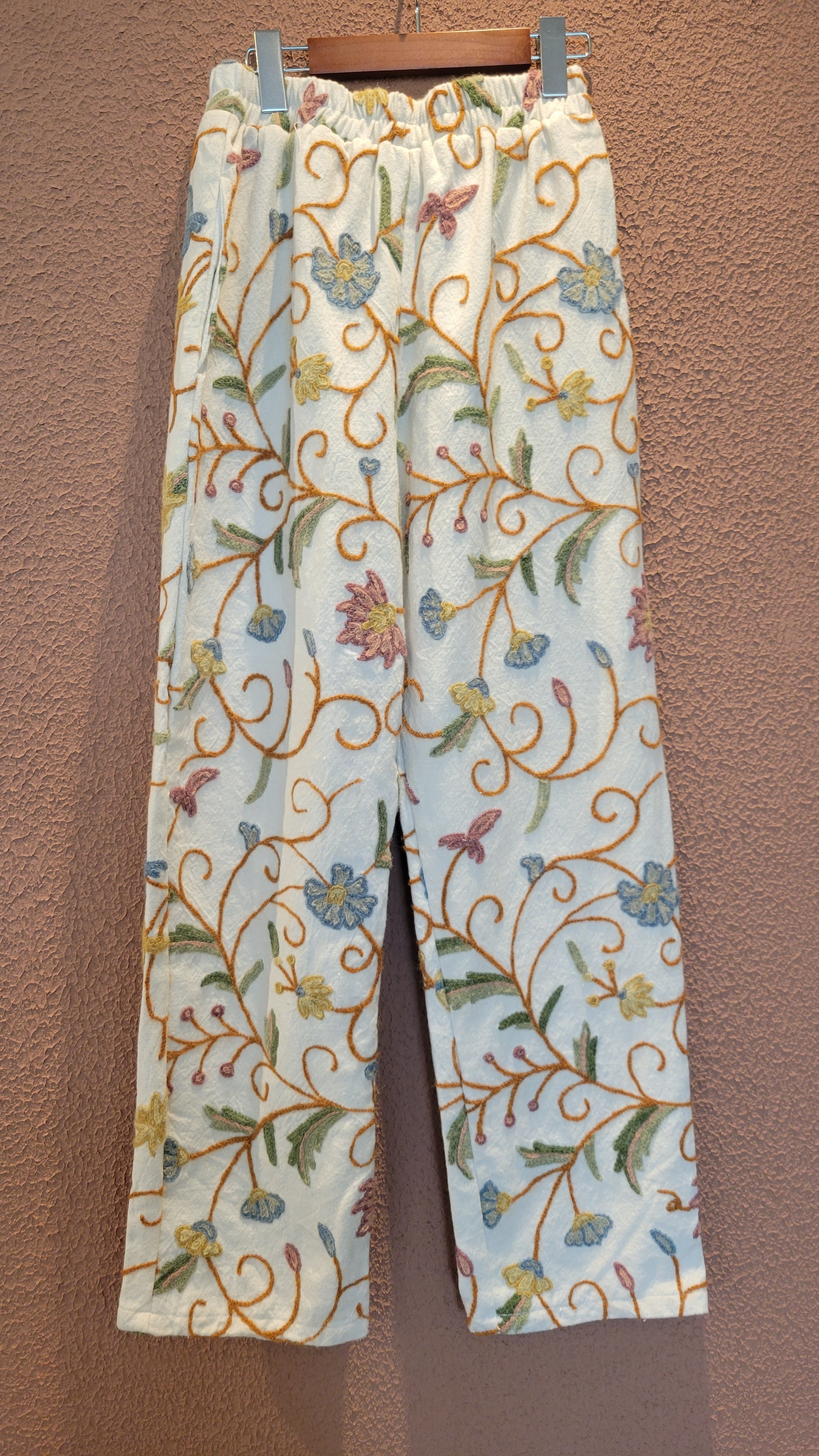 ヴィンテージの刺繍クロスを使用したリメイクイージーパンツ。素材はコットンとリネンの混紡のようです。少し起毛したような柔らかい肌触りの素材です。ウエストゴム、左右シームポケット付き。白地でナチュラルな印象です。着脱しやすく日常着にもぴったりなパンツです。