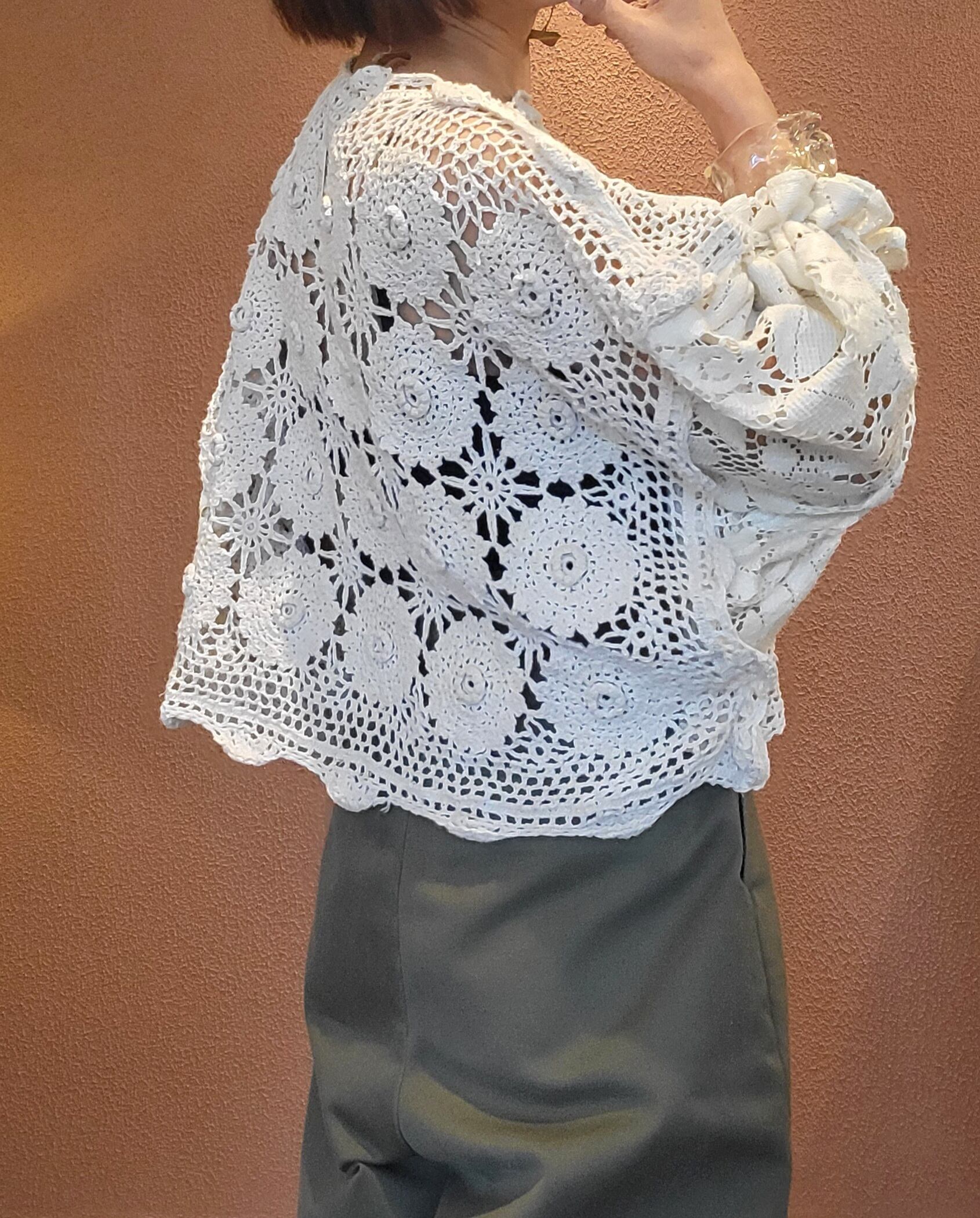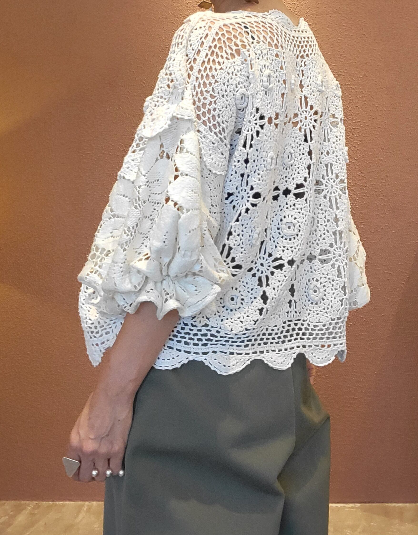 ヴィンテージのクロシェ生地を使用したリメイクトップス。素材はコットンのようです。袖はドルマンスリーブ、アームホールと身幅がフリーサイズのゆったりとしたシルエット。ほどよい抜け感がありカジュアルにもきれいめにもスタイリングができます。前後どちらでも着用可能です。
