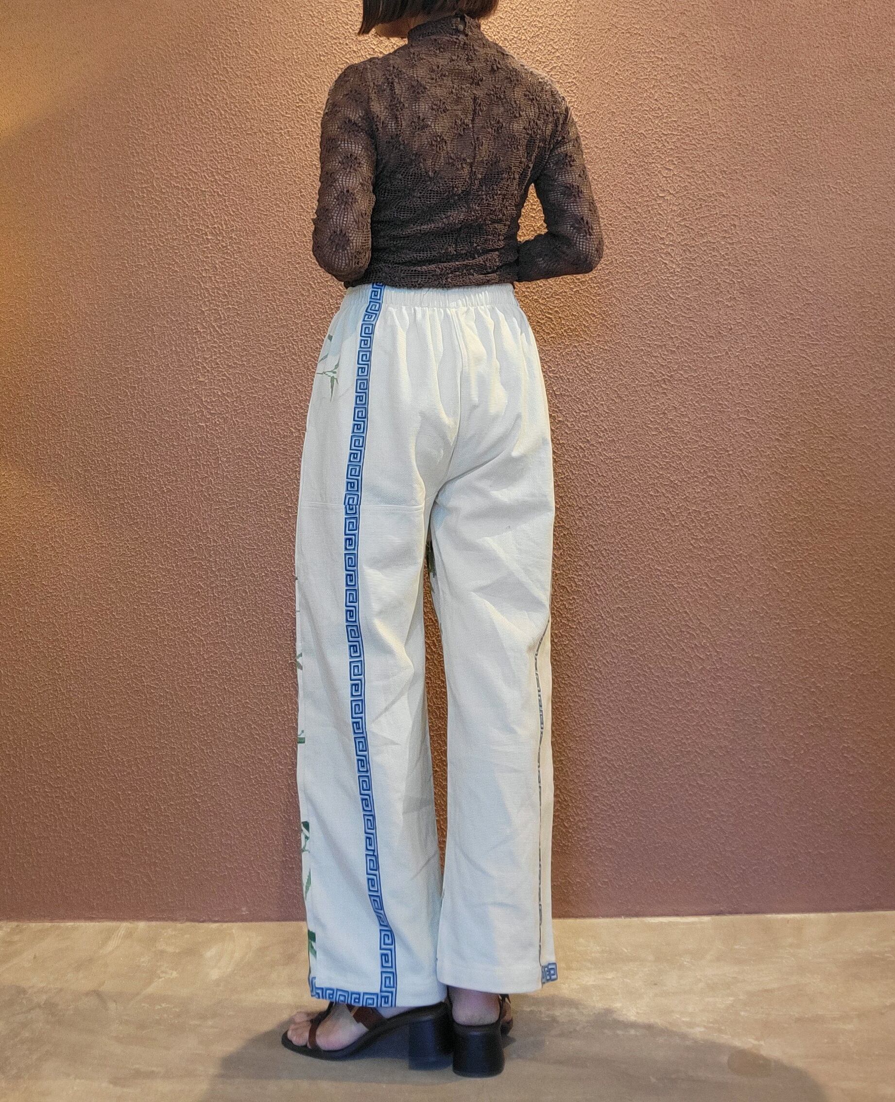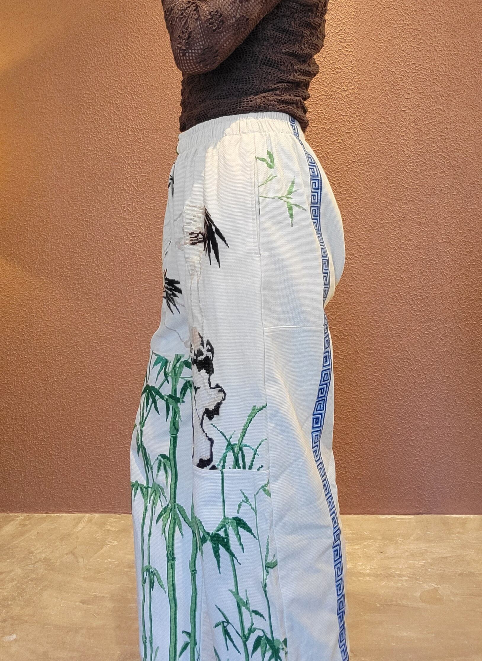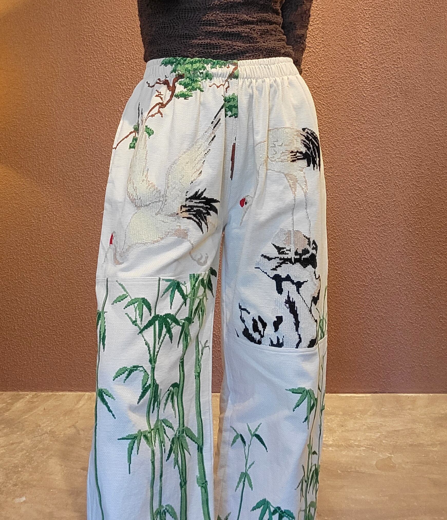 希少なヴィンテージクロスを使用したリメイクイージーパンツ。素材はコットンのようです。やや粗めに織られたしっかりした生地です。ウエストゴム、左右にシームポケット付き。太すぎず細すぎないすっきりとしたシルエットですら、鶴と竹の珍しい織り柄はまさに一点もの。*後ろヒップ右付近にシ幅約7cmほどのシミがあります。画像でご確認ください。