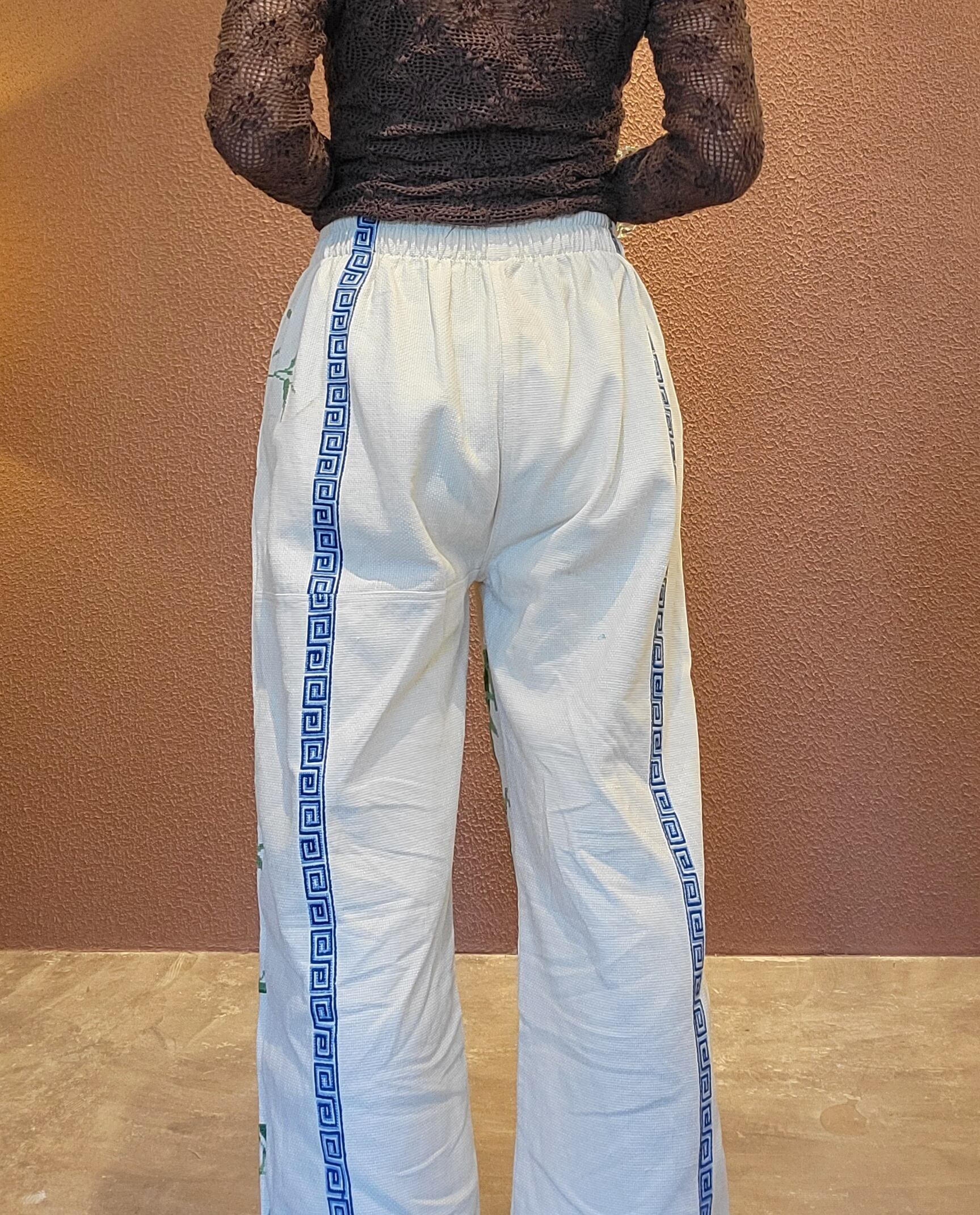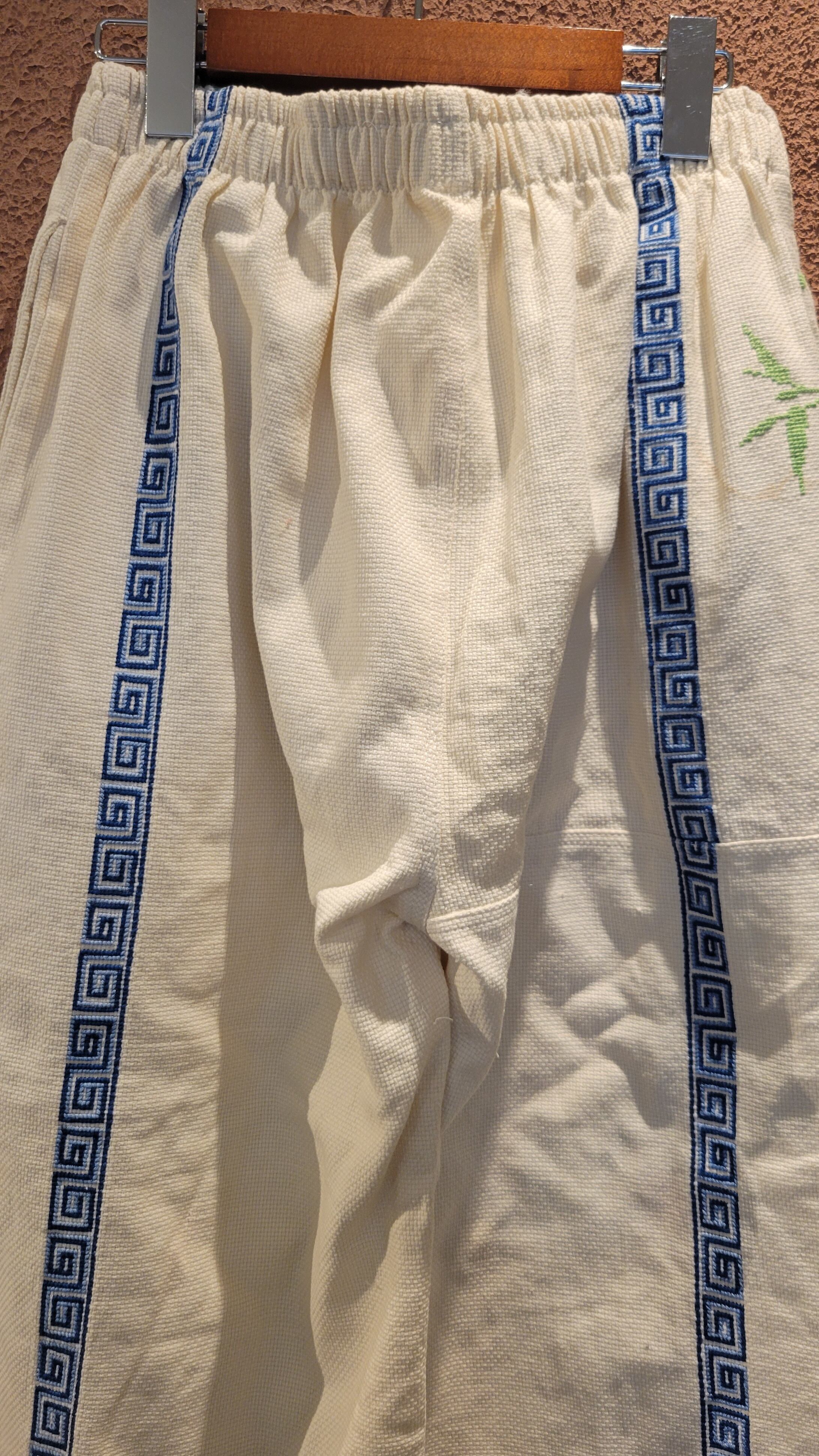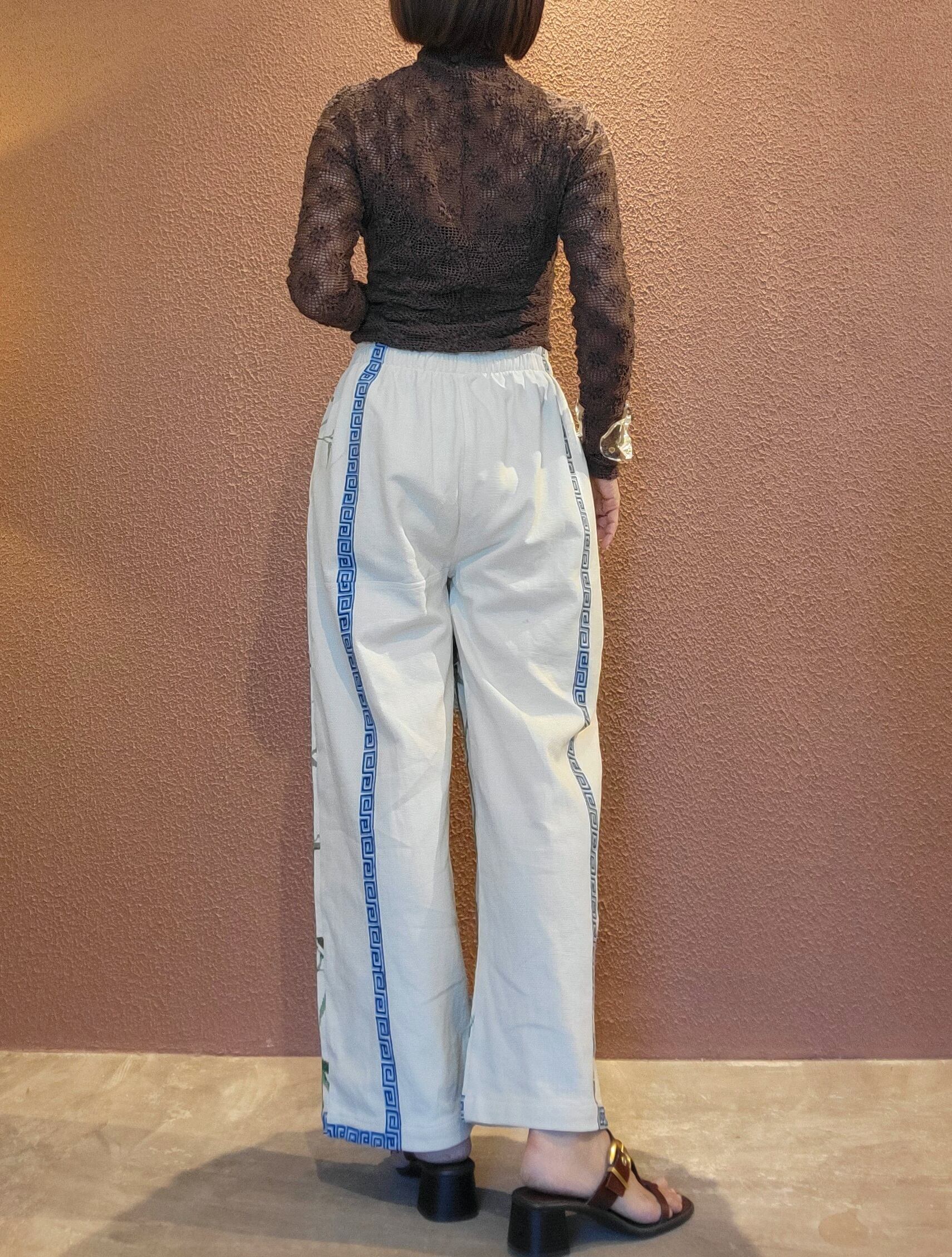 希少なヴィンテージクロスを使用したリメイクイージーパンツ。素材はコットンのようです。やや粗めに織られたしっかりした生地です。ウエストゴム、左右にシームポケット付き。太すぎず細すぎないすっきりとしたシルエットですら、鶴と竹の珍しい織り柄はまさに一点もの。*後ろヒップ右付近にシ幅約7cmほどのシミがあります。画像でご確認ください。