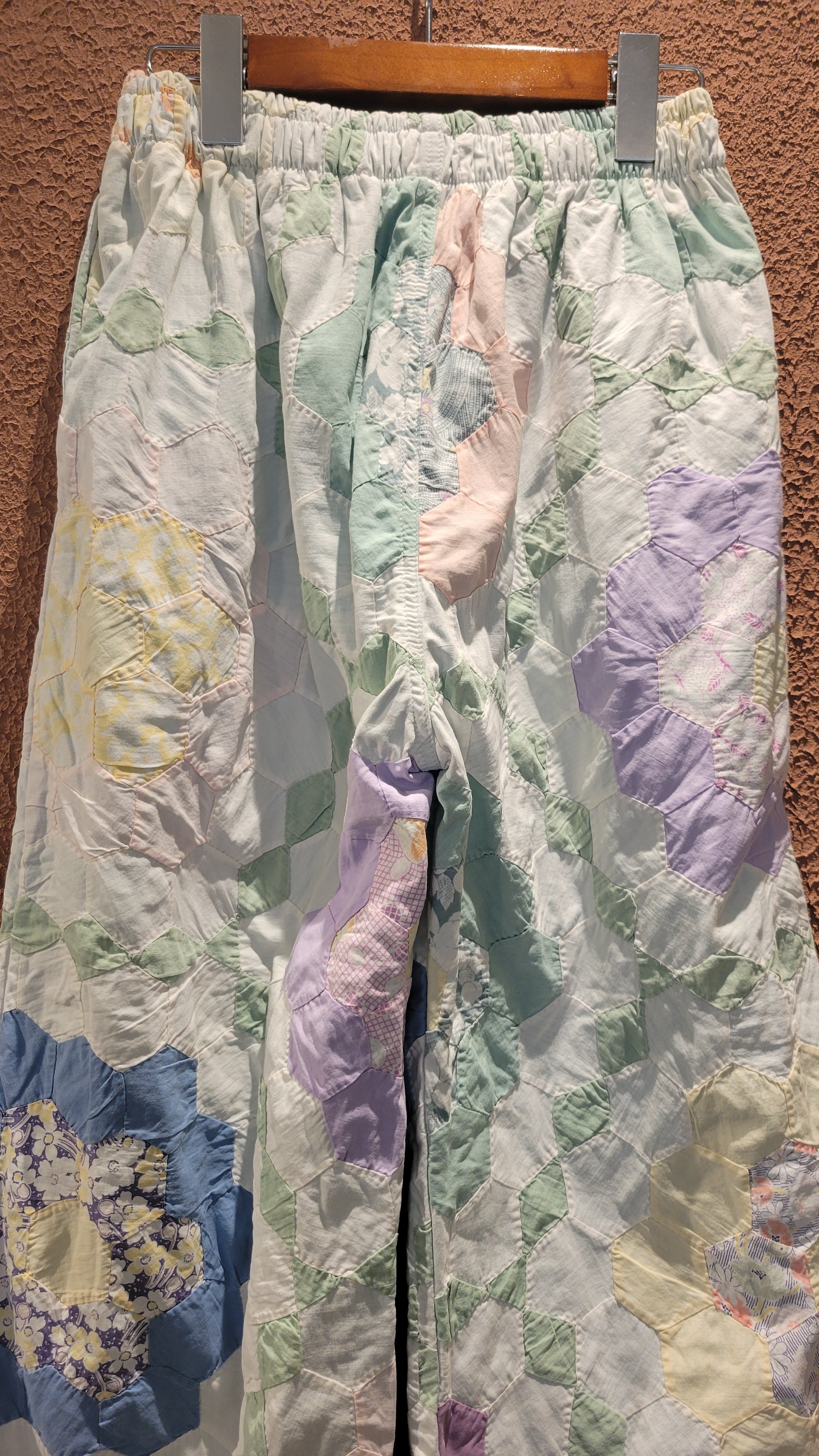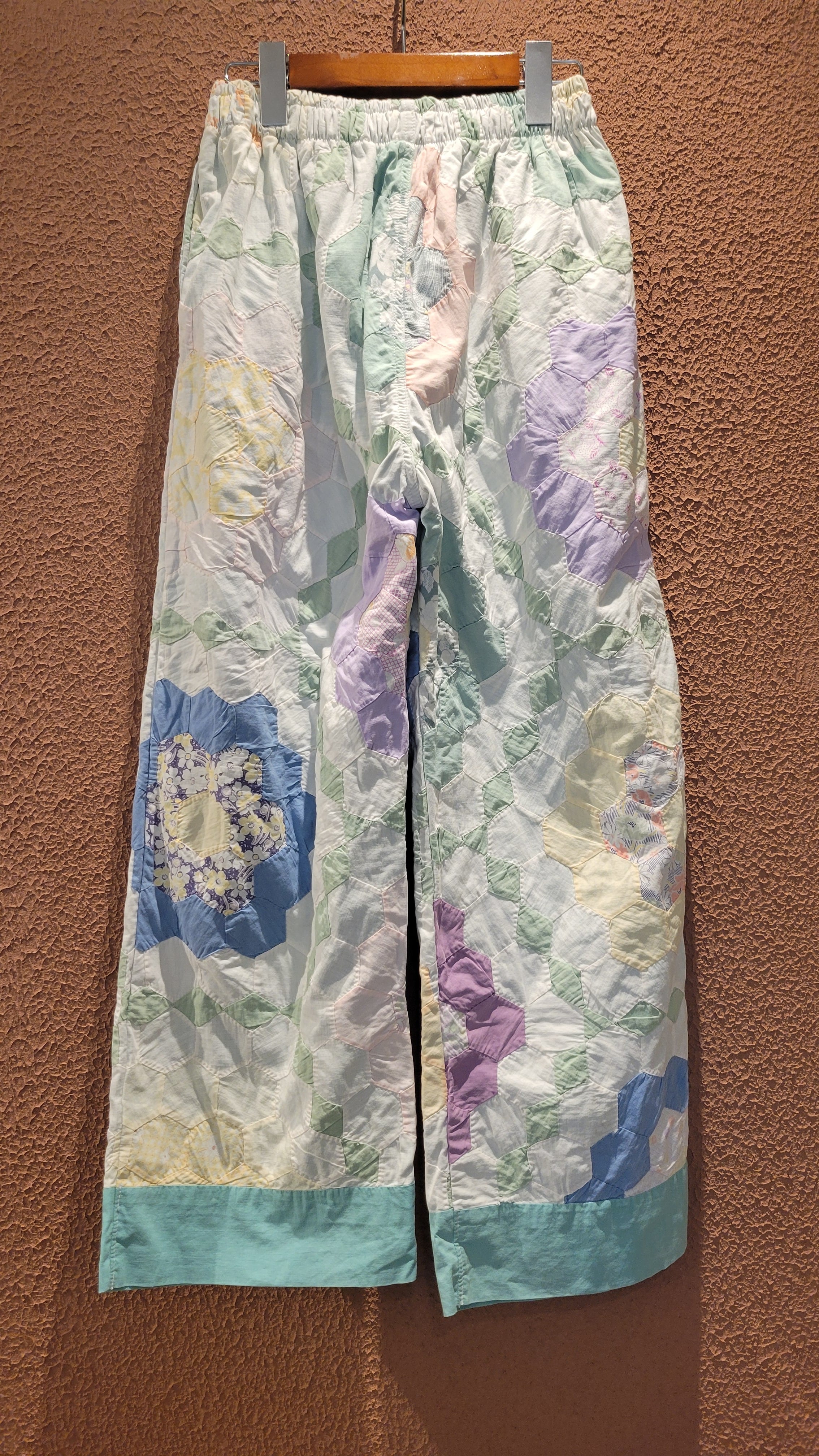 ヴィンテージのパッチワークキルト生地を使用したリメイクイージーパンツ。素材はコットンです。ウエストゴム、左右にシームポケット付き。キルトは全てハンドステッチによるもです。ヴィンテージキルト独特のシボ感が味わいのある1本。