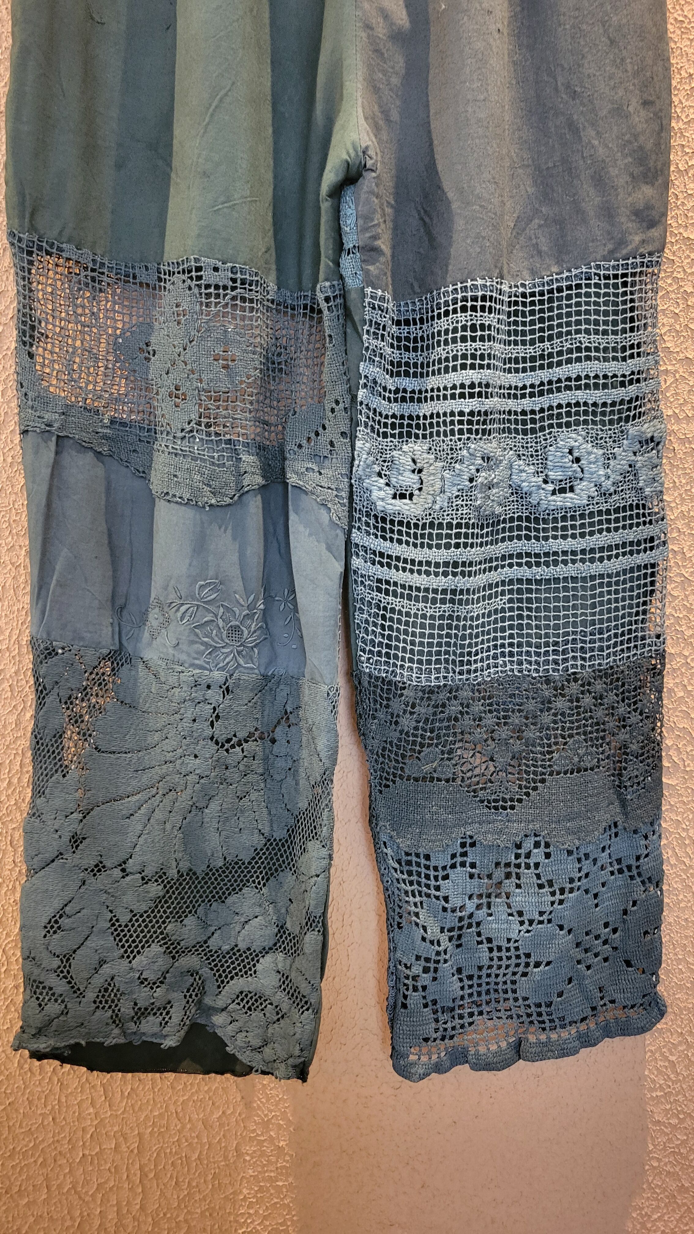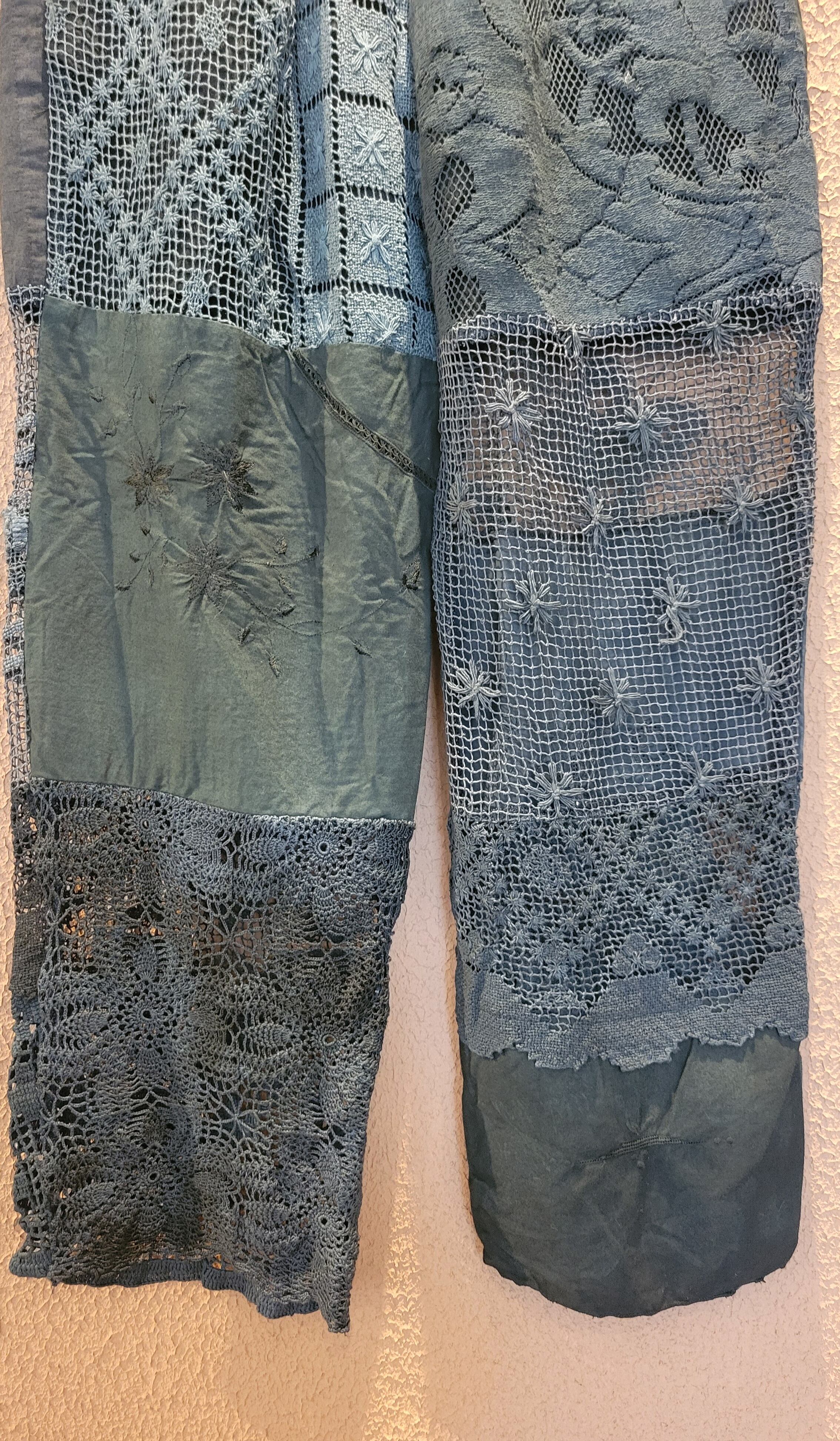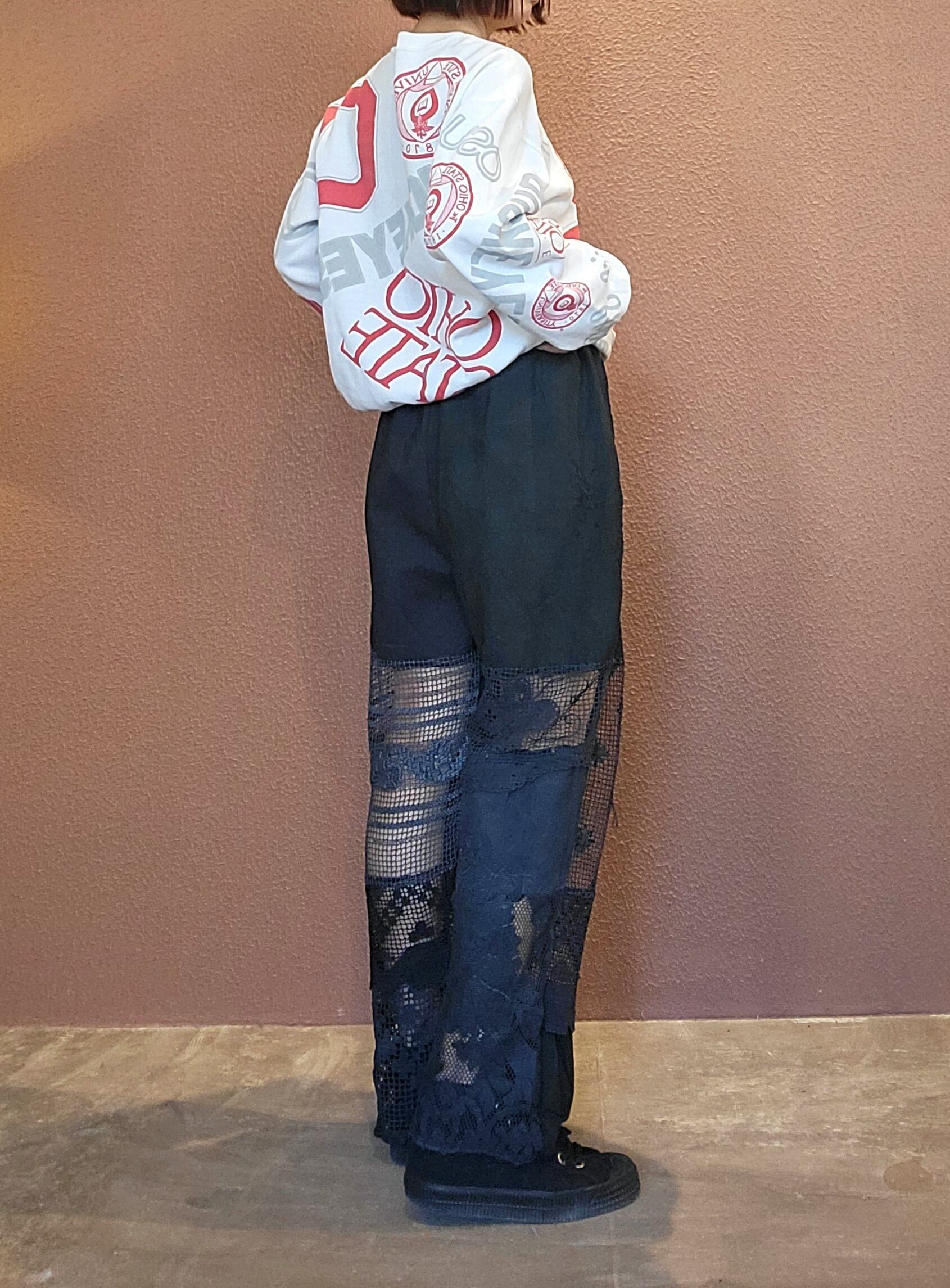 ヴィンテージレースをブラックに後染めしたリメイクイージーパンツ。素材はコットンです。ウエストゴム、左右シームポケット付き、ハーフ丈の裏地付きです(裏地の素材はポリエステル)。異なる種類のレースのパーツを何枚も繋ぎ合わせておりそれぞれのパーツで微妙に黒のトーンが違う味わいのある仕上がりになっています。腰周り緩めのシルエットで抜け感がありこなれた雰囲気のスタイリングが叶います。*摩擦、水濡れ、汗により他のものに移染する可能性があるため淡色との組み合わせにご注意ください。お洗濯は中性洗剤で優しく単体押し洗いしてください。