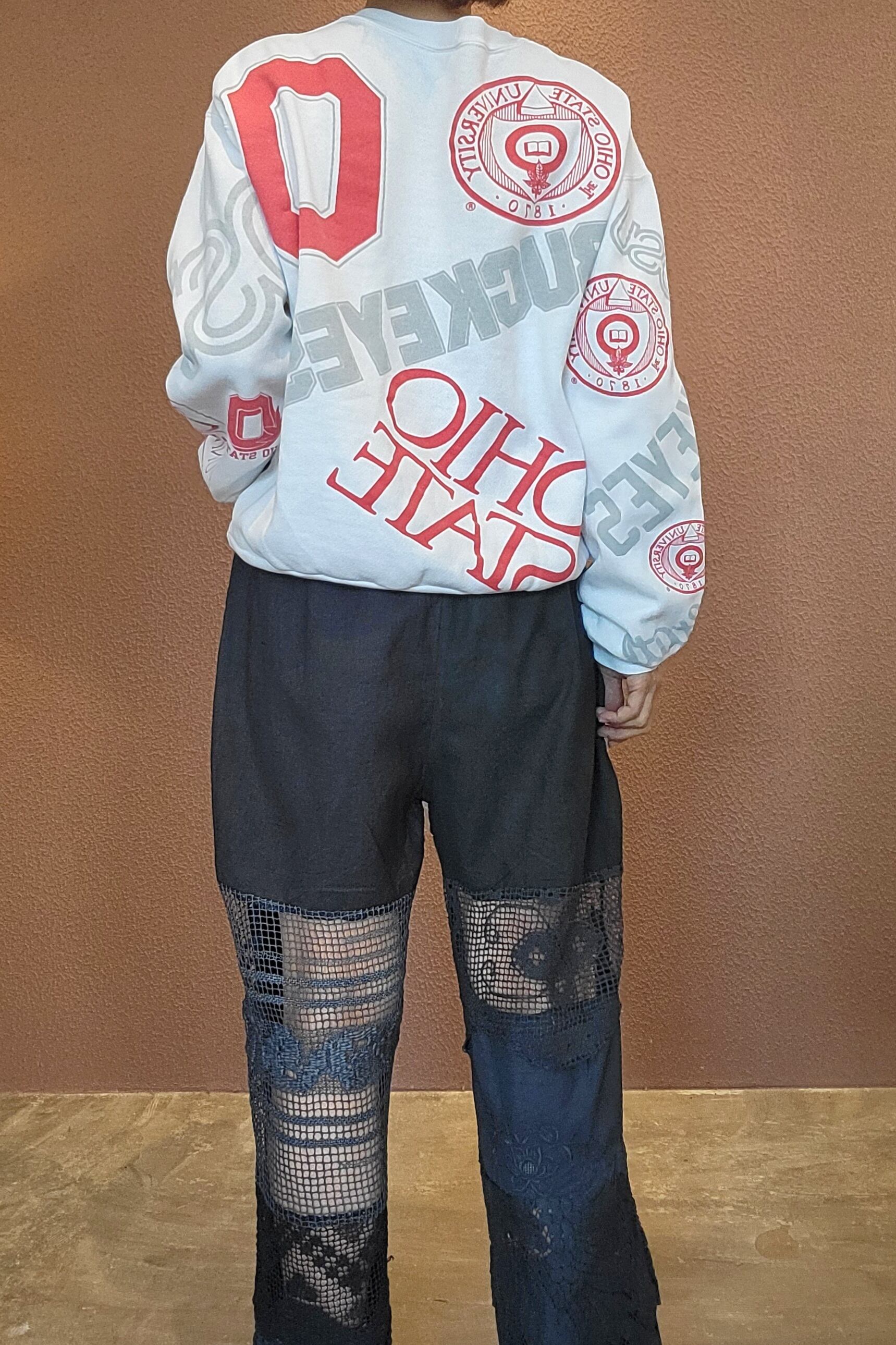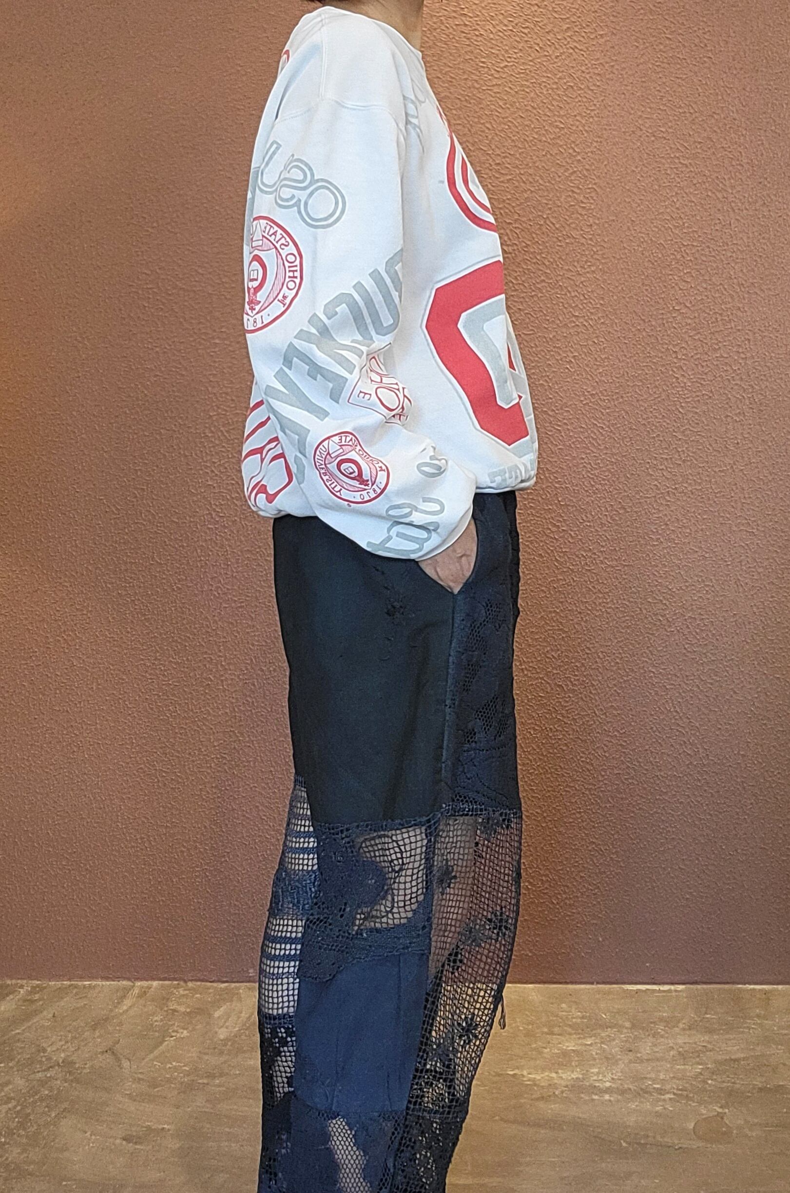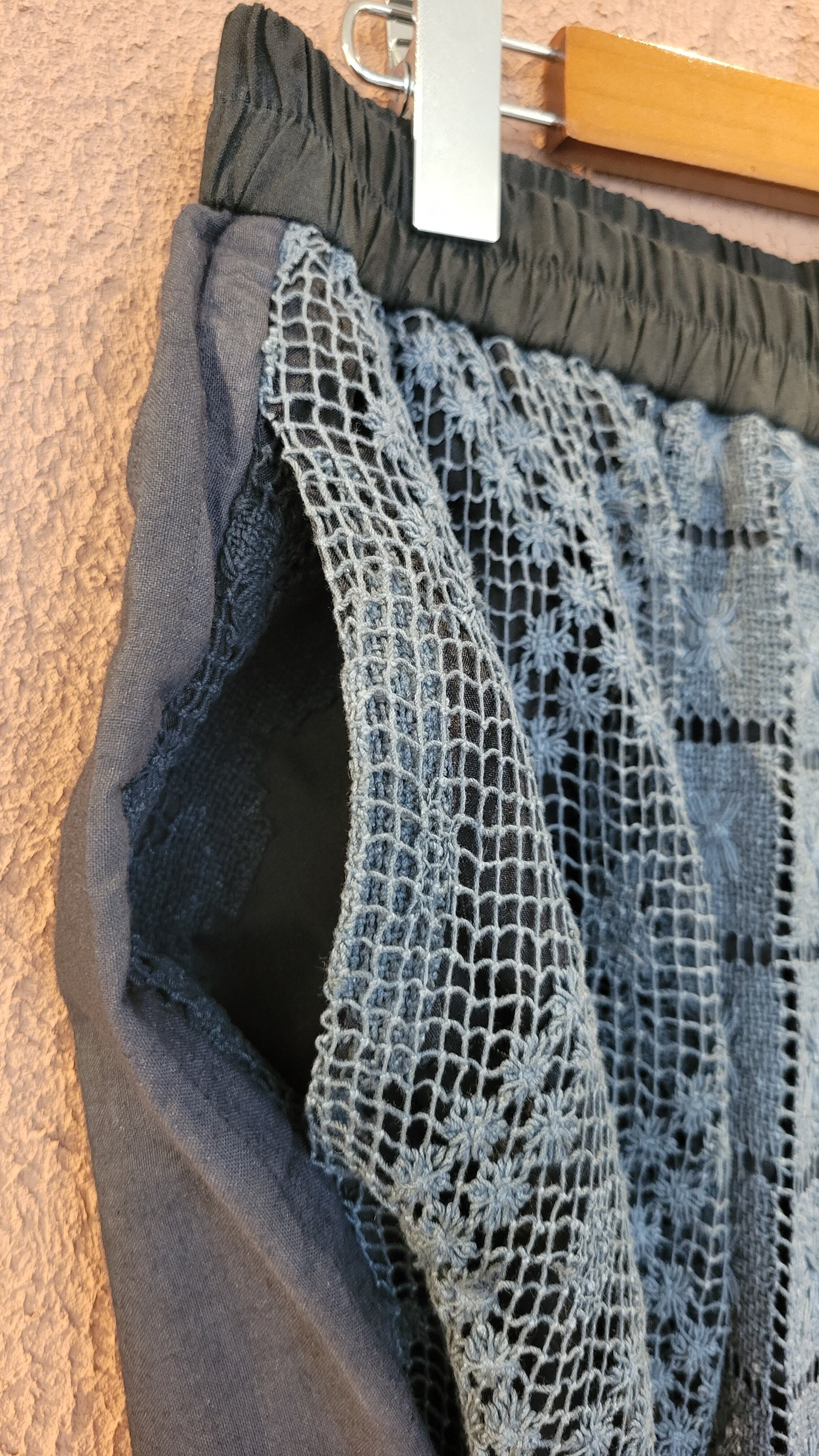 ヴィンテージレースをブラックに後染めしたリメイクイージーパンツ。素材はコットンです。ウエストゴム、左右シームポケット付き、ハーフ丈の裏地付きです(裏地の素材はポリエステル)。異なる種類のレースのパーツを何枚も繋ぎ合わせておりそれぞれのパーツで微妙に黒のトーンが違う味わいのある仕上がりになっています。腰周り緩めのシルエットで抜け感がありこなれた雰囲気のスタイリングが叶います。*摩擦、水濡れ、汗により他のものに移染する可能性があるため淡色との組み合わせにご注意ください。お洗濯は中性洗剤で優しく単体押し洗いしてください。