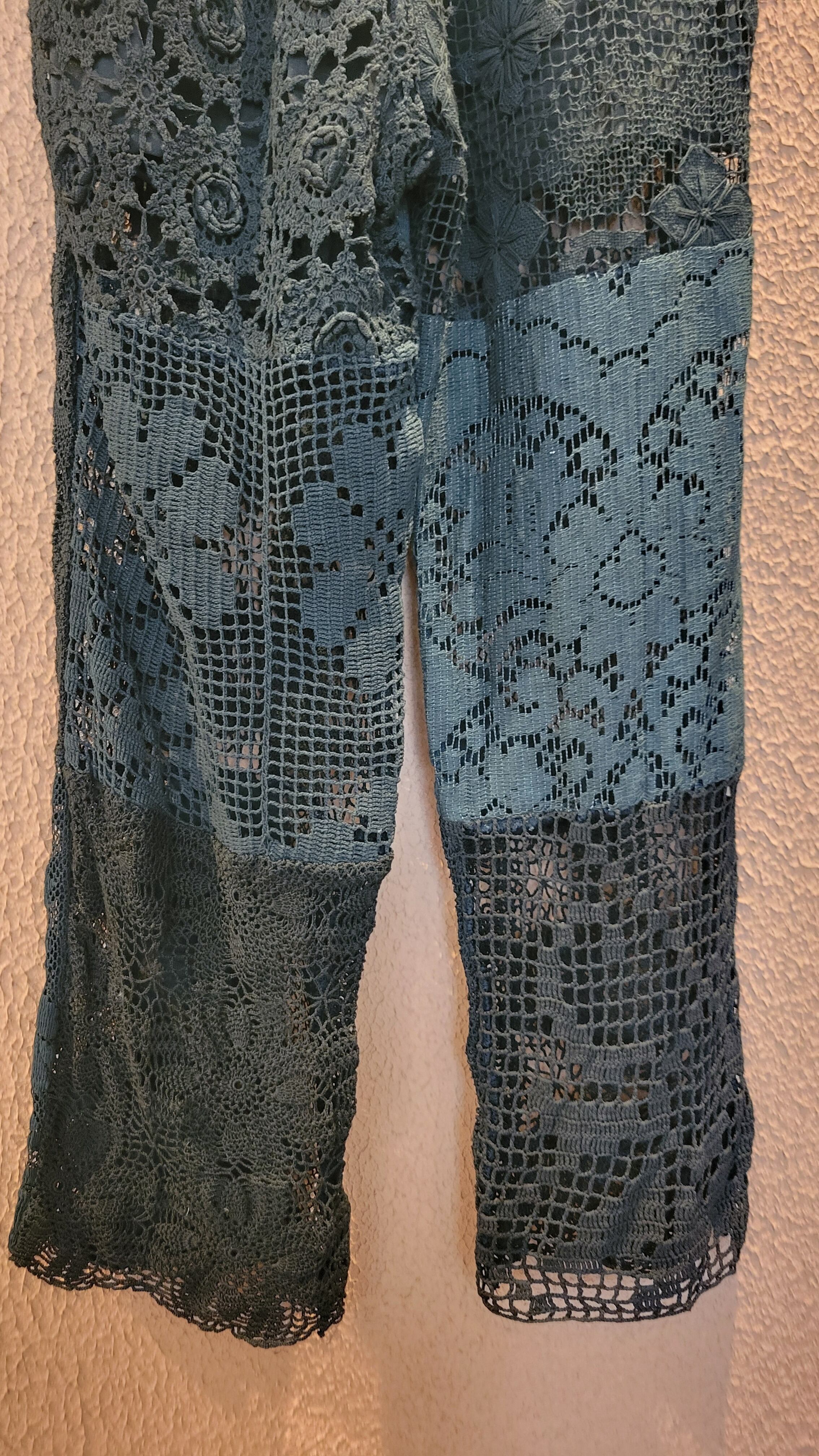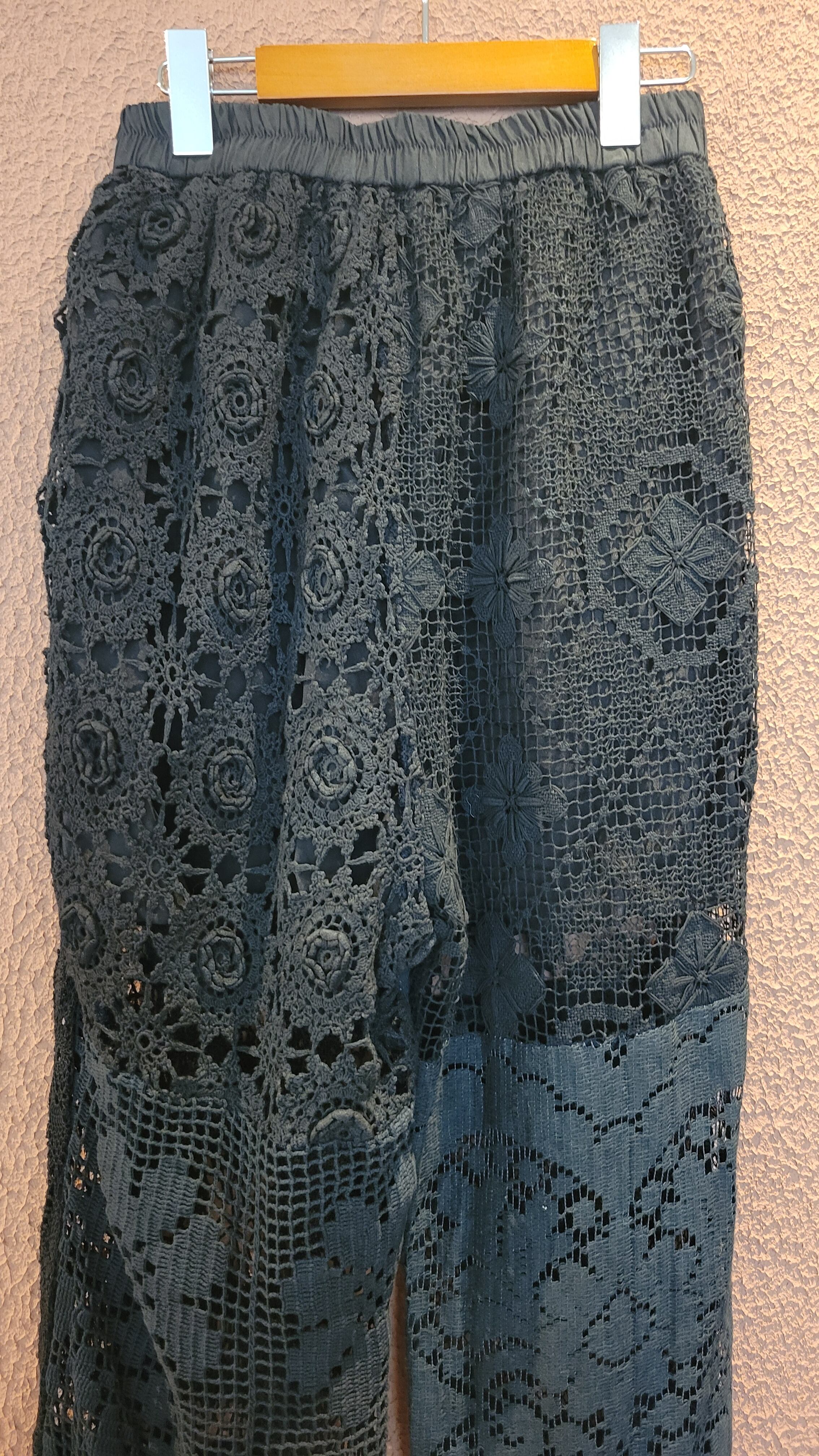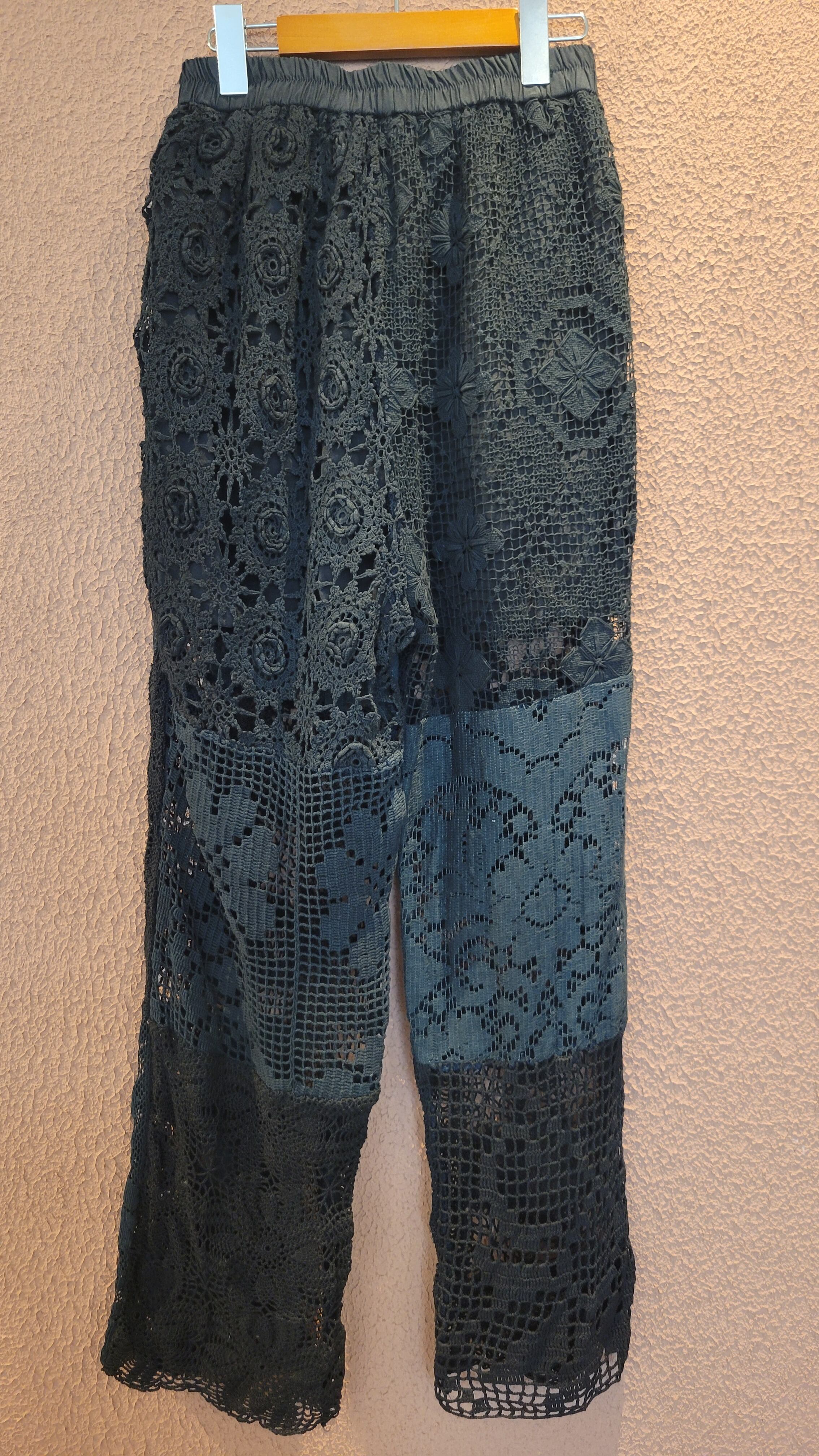 ヴィンテージレースをブラックに後染めしたリメイクイージーパンツ。素材はコットンです。ウエストゴム、左右シームポケット付き、ハーフ丈の裏地付きです(裏地の素材はポリエステル)。異なる種類のレースのパーツを何枚も繋ぎ合わせており、それぞれのパーツで微妙に黒のトーンが違う味わいのある仕上がりになっています。腰周り緩めのシルエットで抜け感がありこなれた雰囲気のスタイリングが叶います。*摩擦、水濡れ、汗により他のものに移染する可能性があるため淡色との組み合わせにご注意ください。お洗濯は中性洗剤で優しく単体押し洗いしてください。