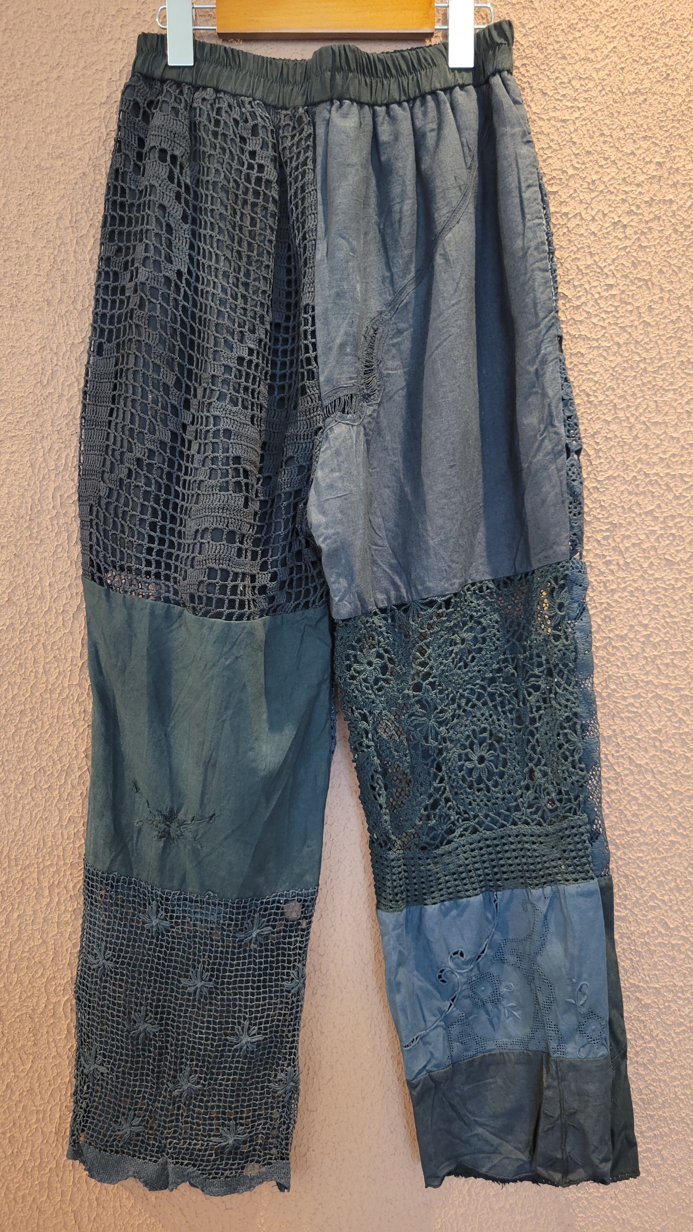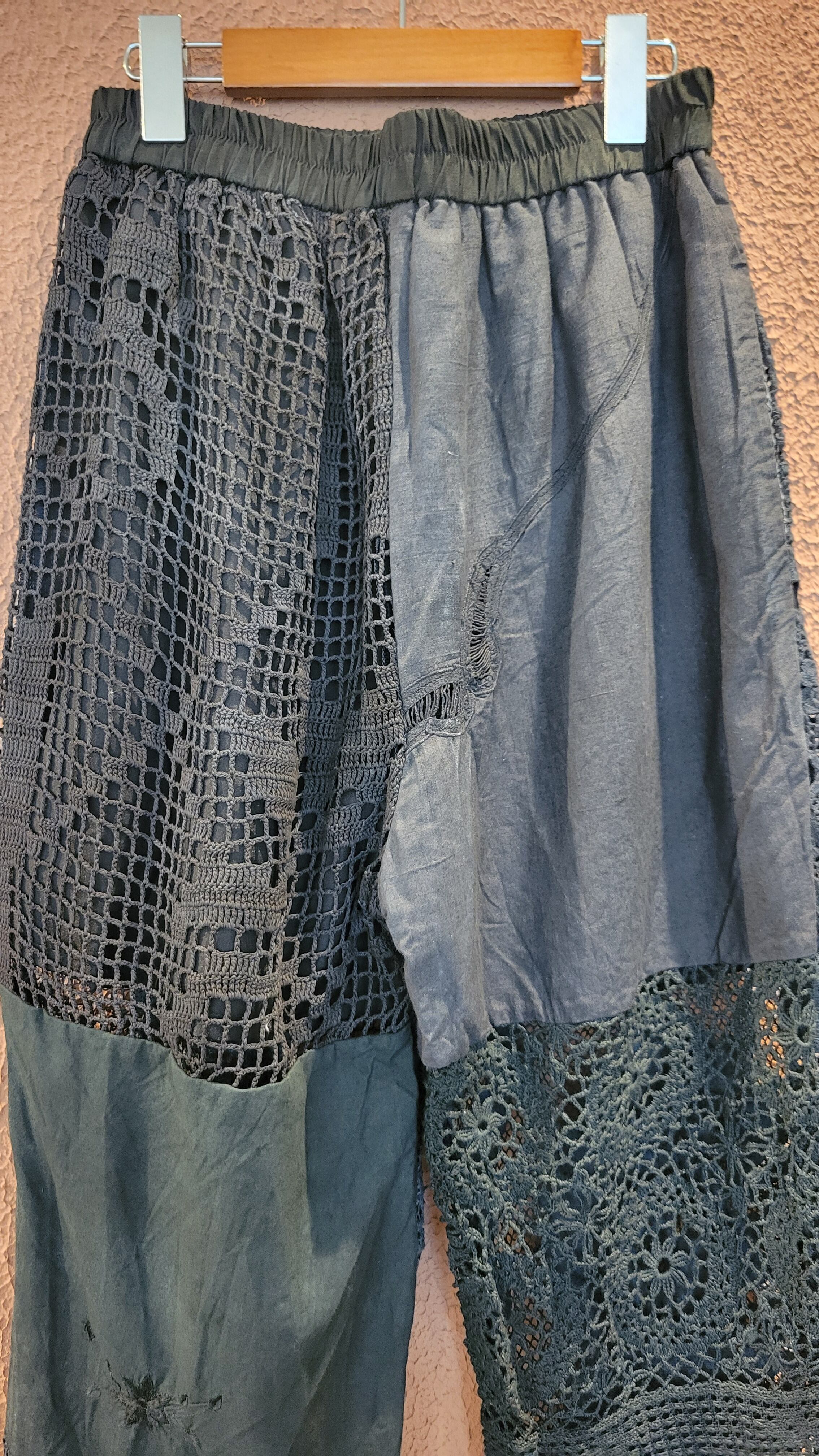 ヴィンテージレースをブラックに後染めしたリメイクイージーパンツ。素材はコットンです。ウエストゴム、左右シームポケット付き、ハーフ丈の裏地付きです(裏地の素材はポリエステル)。異なる種類のレースのパーツを何枚も繋ぎ合わせており、それぞれのパーツで微妙に黒のトーンが違う味わいのある仕上がりになっています。腰周り緩めのシルエットで抜け感がありこなれた雰囲気のスタイリングが叶います。*摩擦、水濡れ、汗により他のものに移染する可能性があるため淡色との組み合わせにご注意ください。お洗濯は中性洗剤で優しく単体押し洗いしてください。