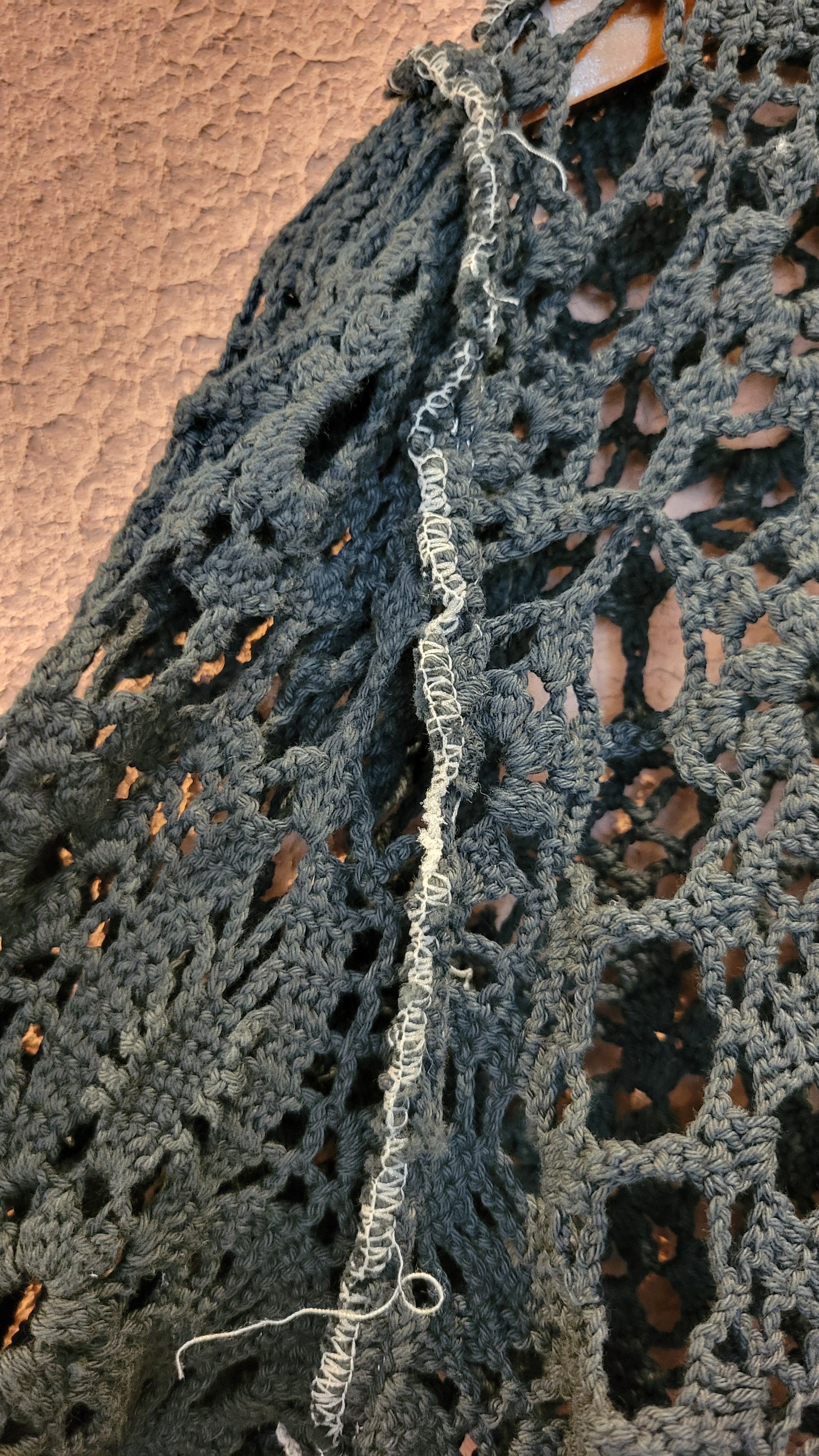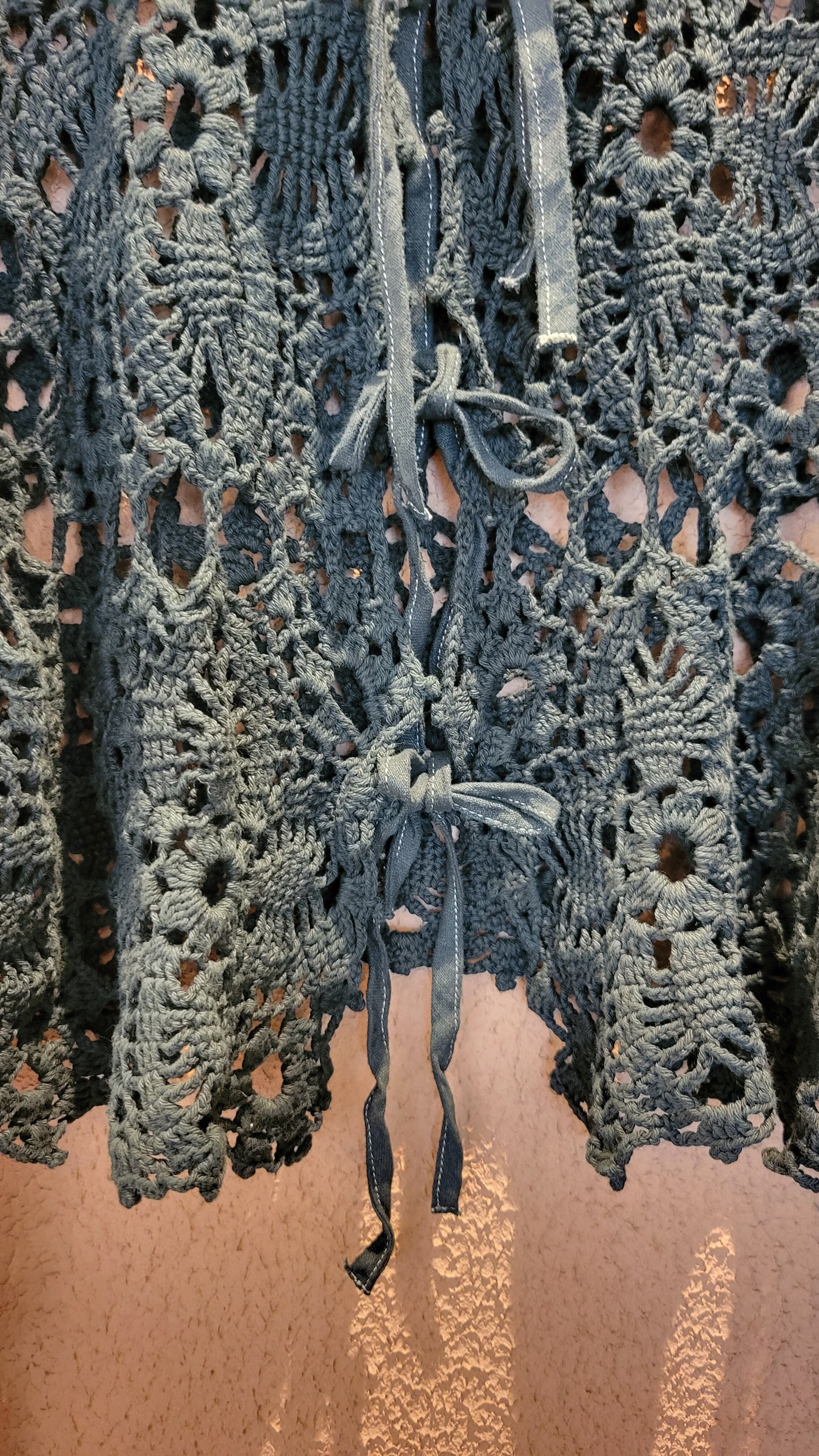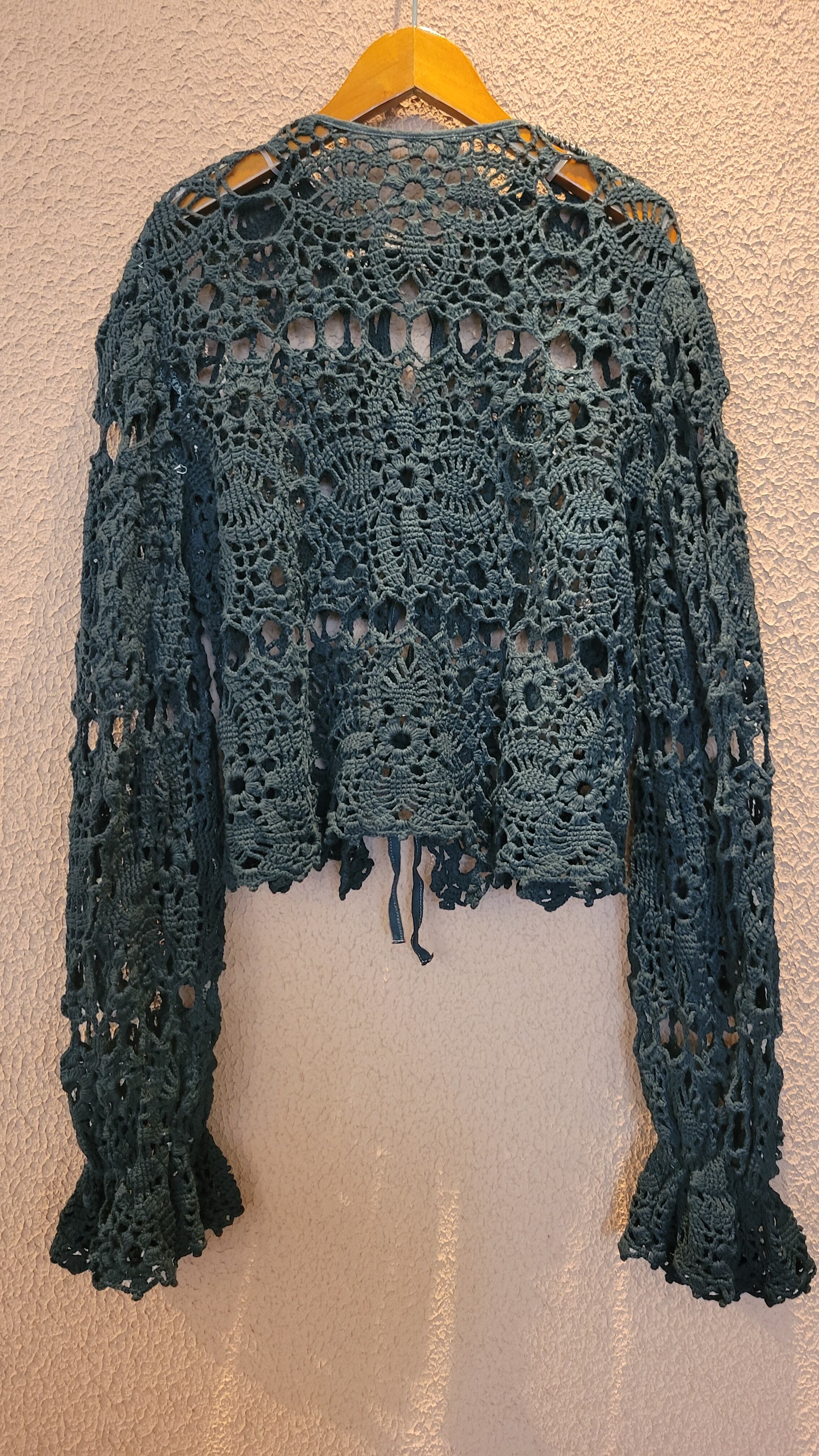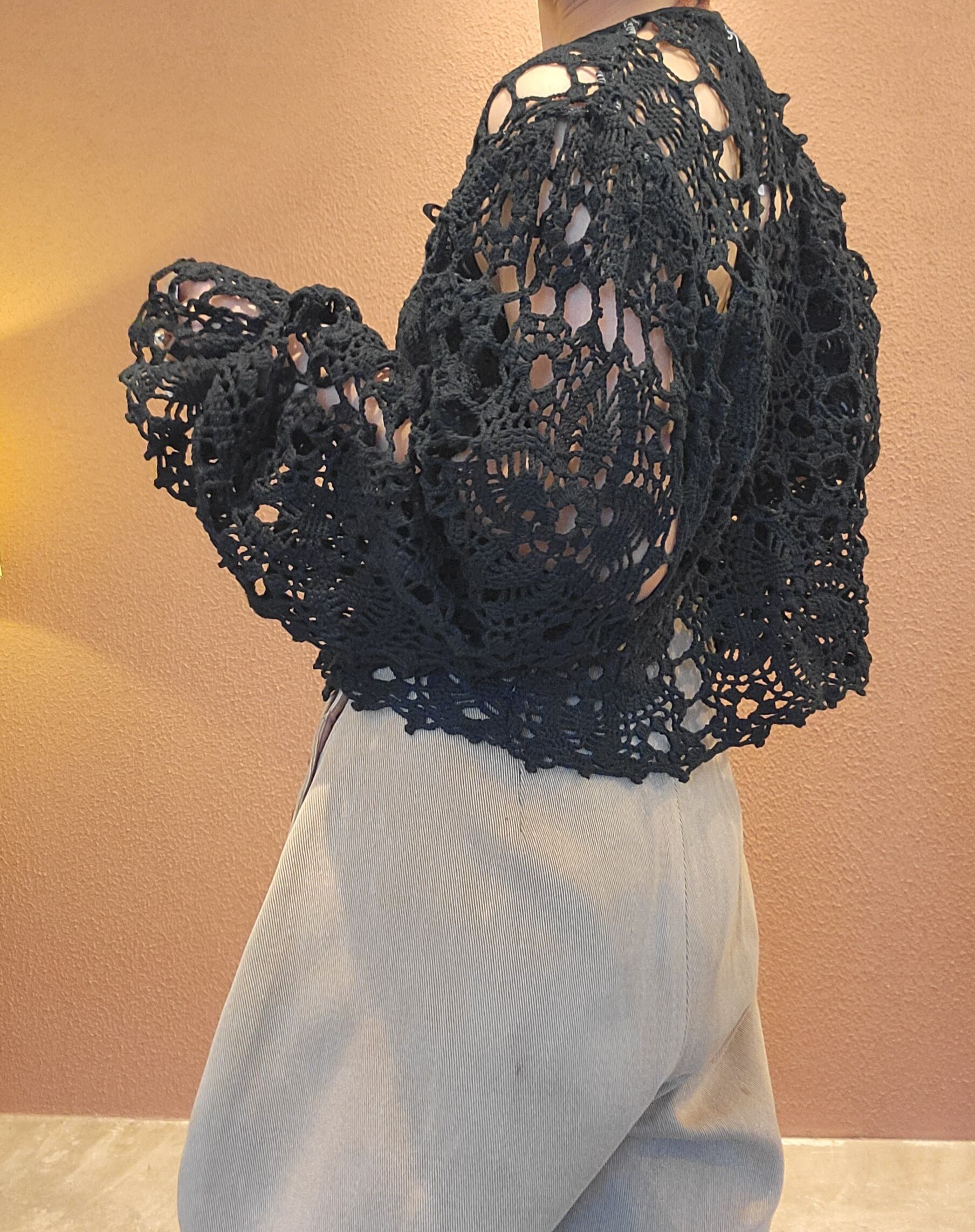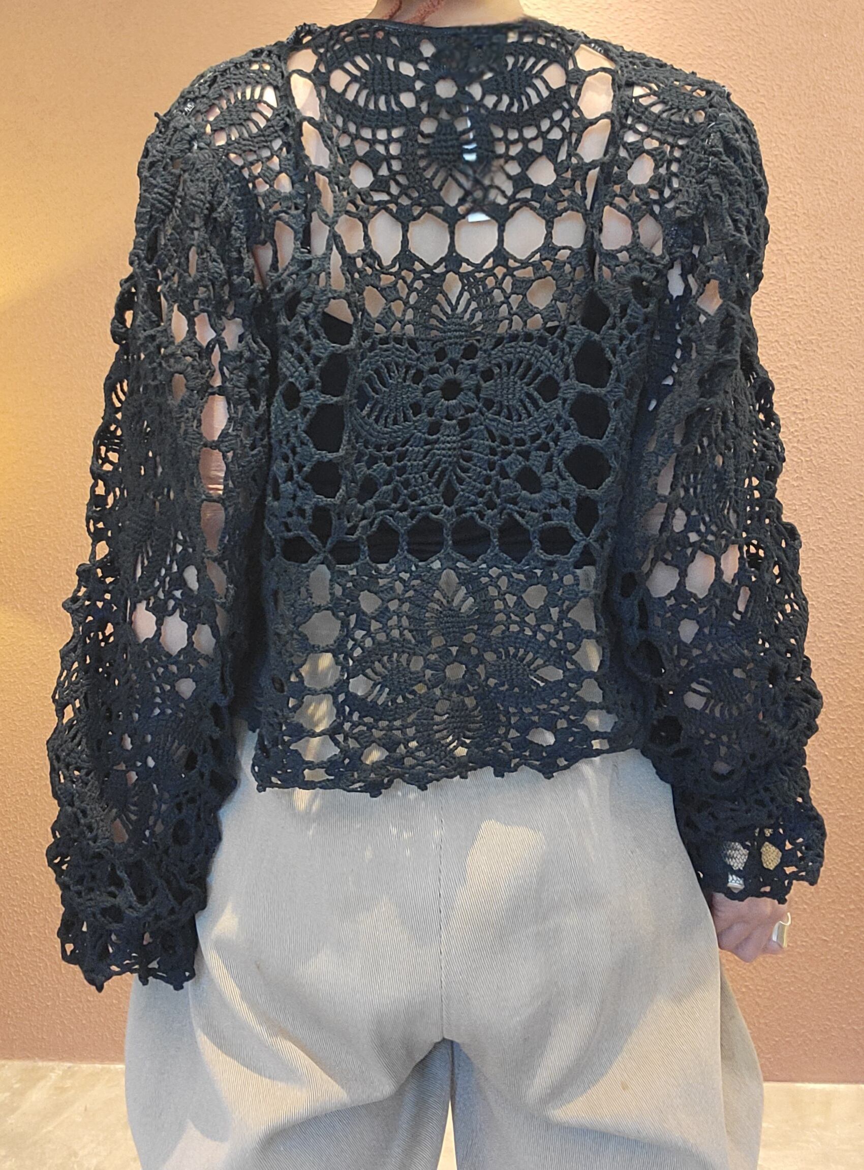 ヴィンテージのクロシェ生地をブラックに後染めしたリメイクトップス/ カーディガン。素材はコットンです。袖口はゴムが通っています。裏地は付いていないためインナーを合わせてレイヤードでお楽しみください。*フロントリボンのステッチと裏側の縫い糸が黒く染まらず白いままになっている部分があります。画像でご確認ください。*摩擦、水濡れ、汗により他のものに移染する可能性があるため淡色との組み合わせにご注意ください。お洗濯は中性洗剤で優しく単体押し洗いしてください。