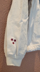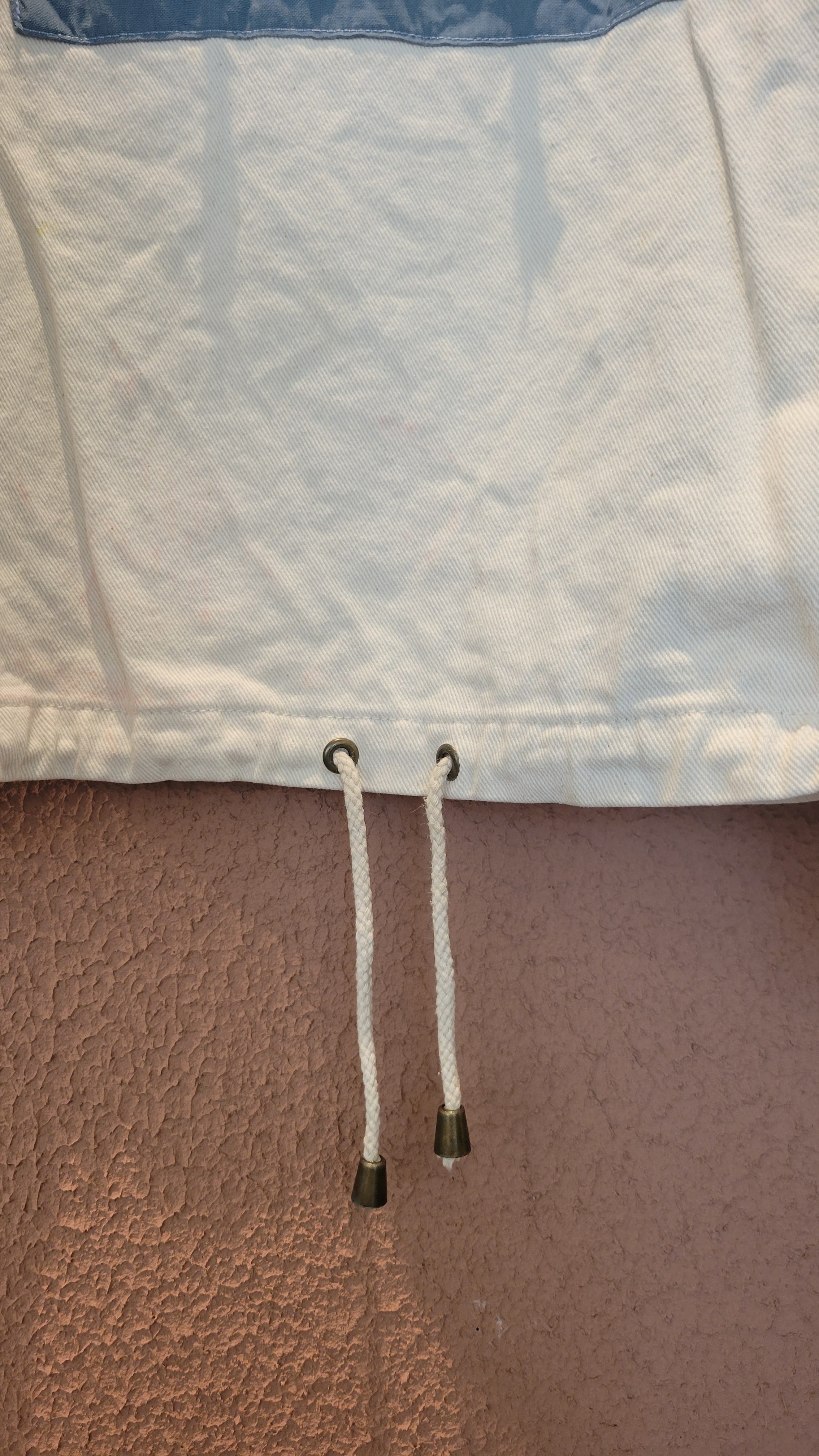 usedのレースアップトップスにカラーパッチワークとステンシルを施したリメイクトップス。素材はやや厚手のしっかりしたコットンで張り感があります。袖口はリブ仕様。男女兼用です。アウトドアテイストを取り入れたカジュアルなスタイリングにぴったりです。*薄い赤の色移りのある部分が複数あります。画像でご確認ください。