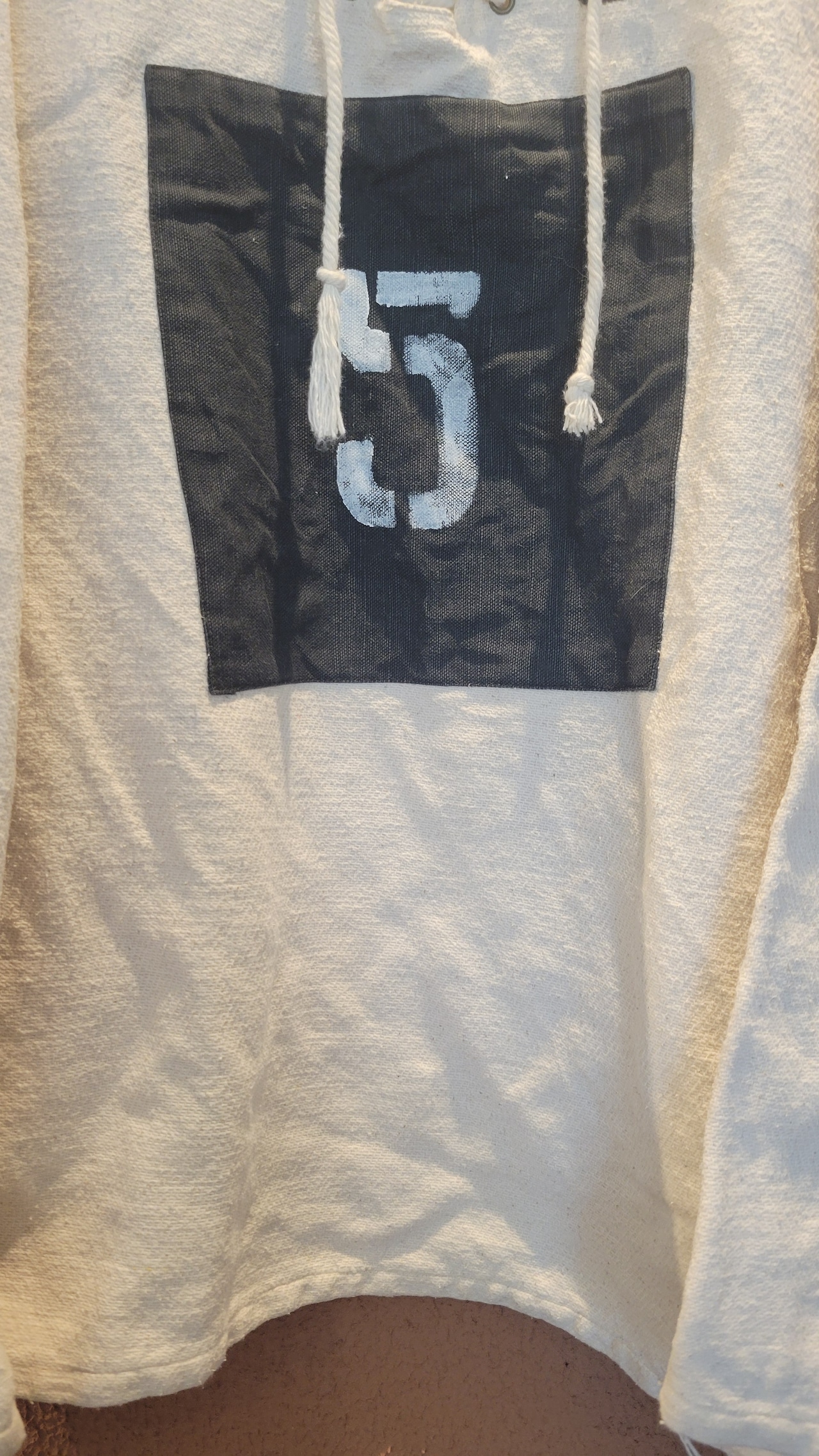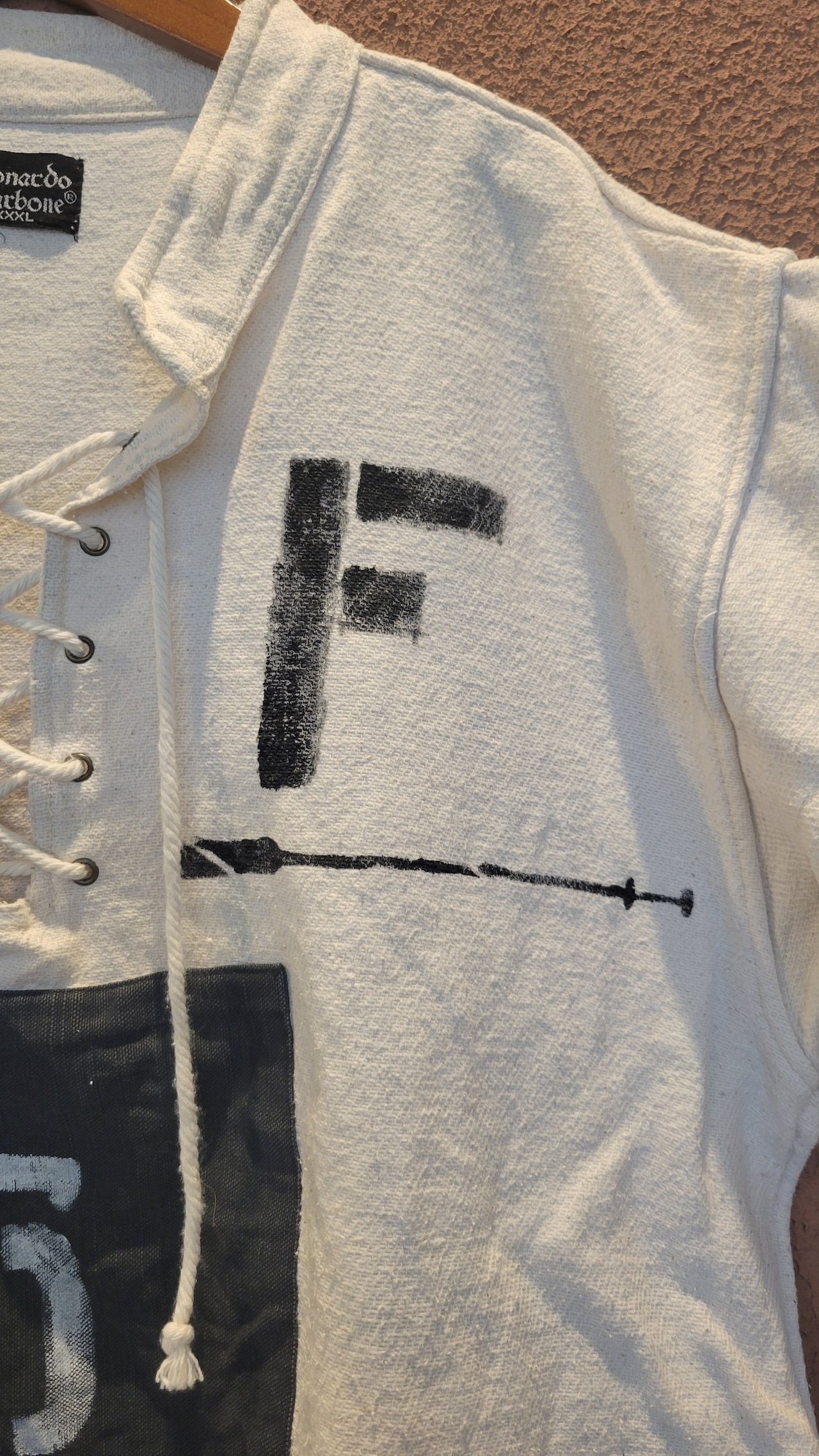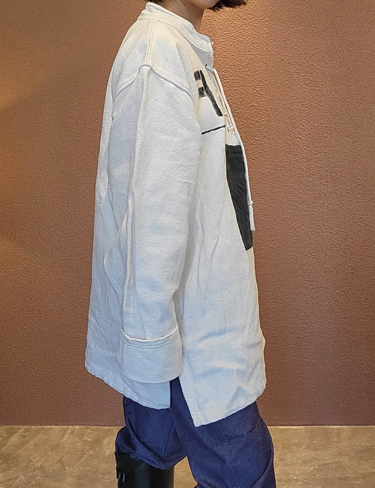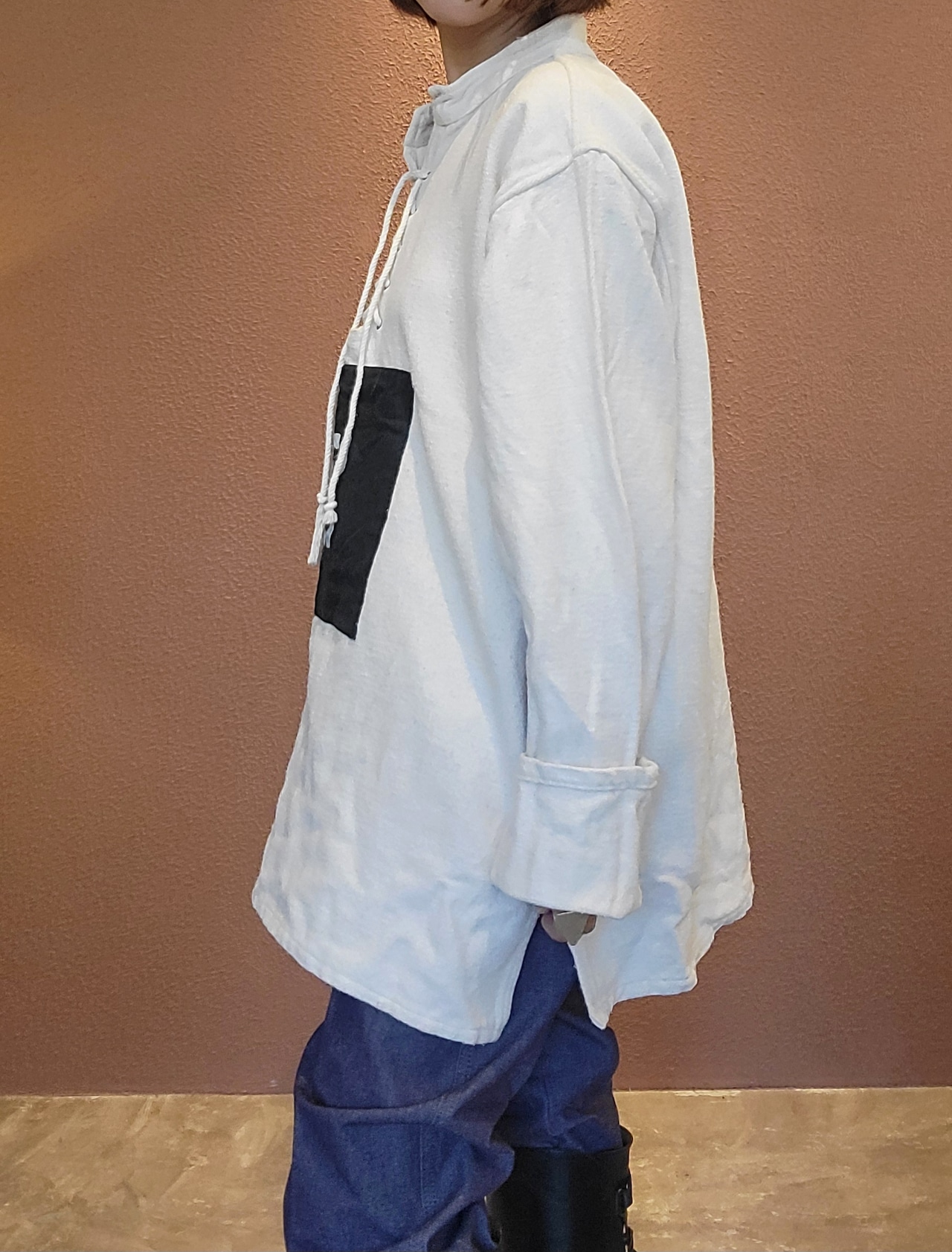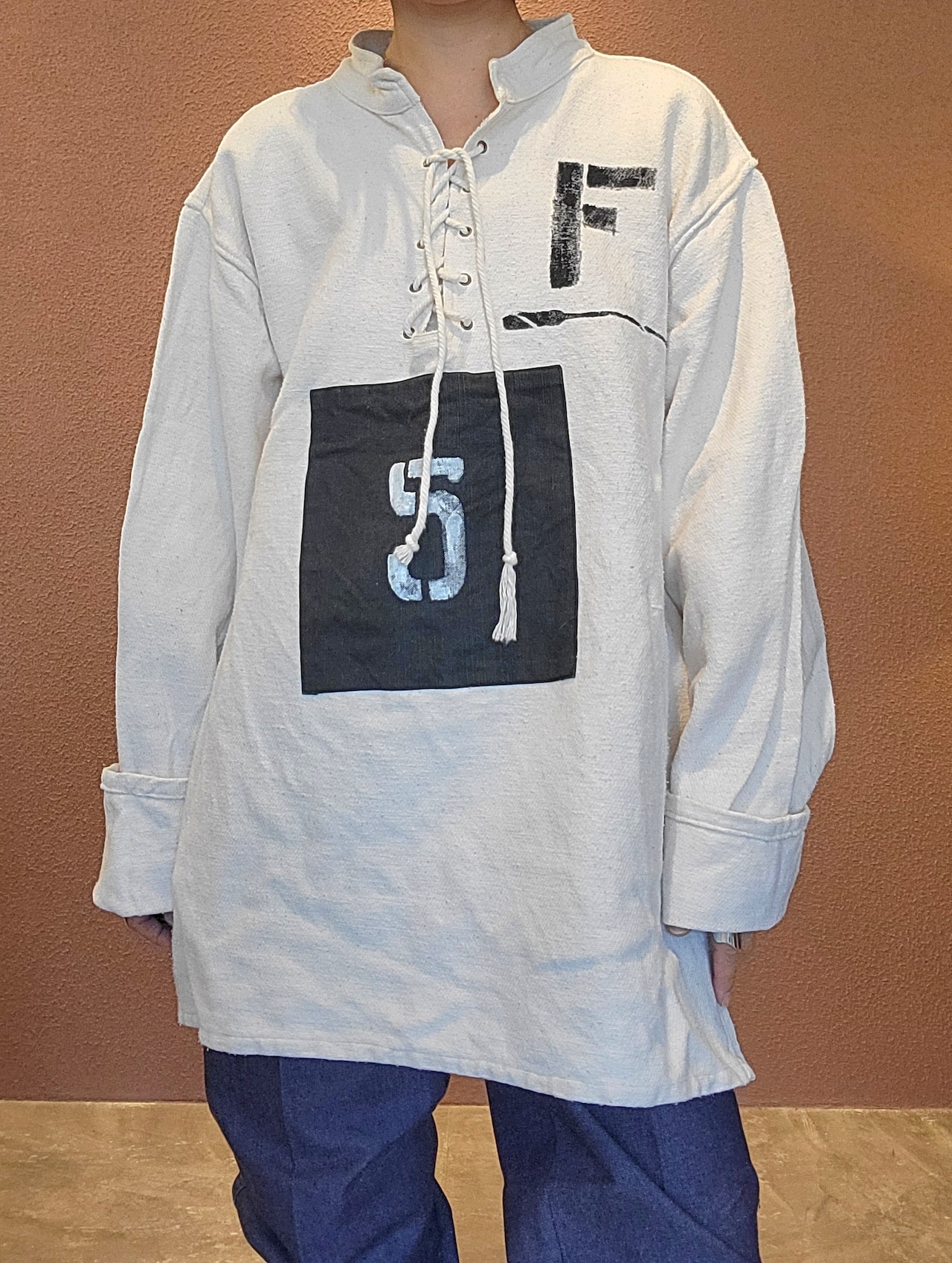 usedのレースアップトップスにカラーパッチワークとステンシルを施したリメイクトップス。素材はやや厚手のしっかりしたコットンです。男女兼用です。アウトドアテイストを取り入れたカジュアルなスタイリングにぴったりです。*右袖に薄い赤の色移りのある部分があります。画像でご確認ください。