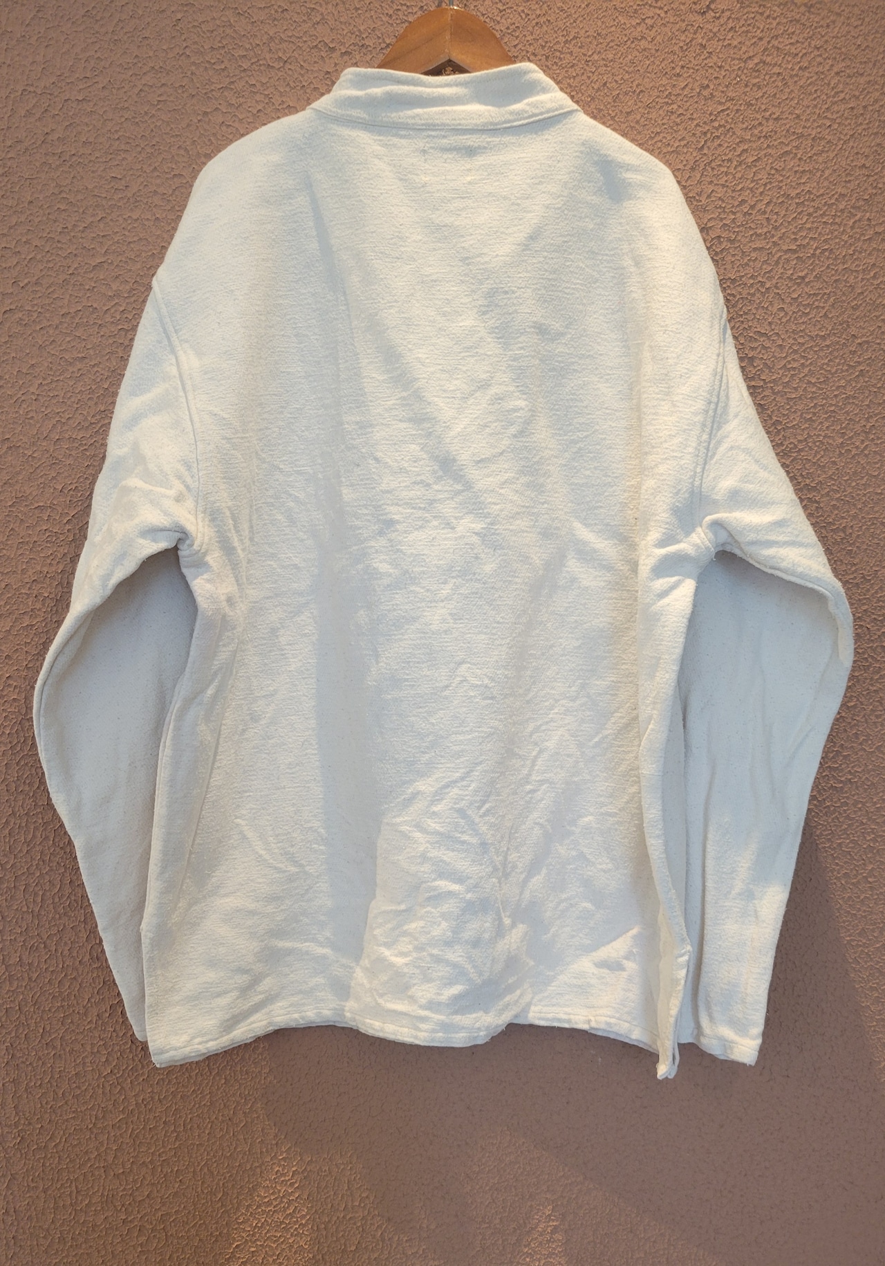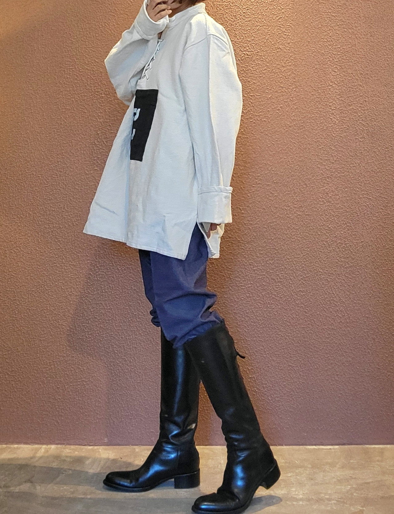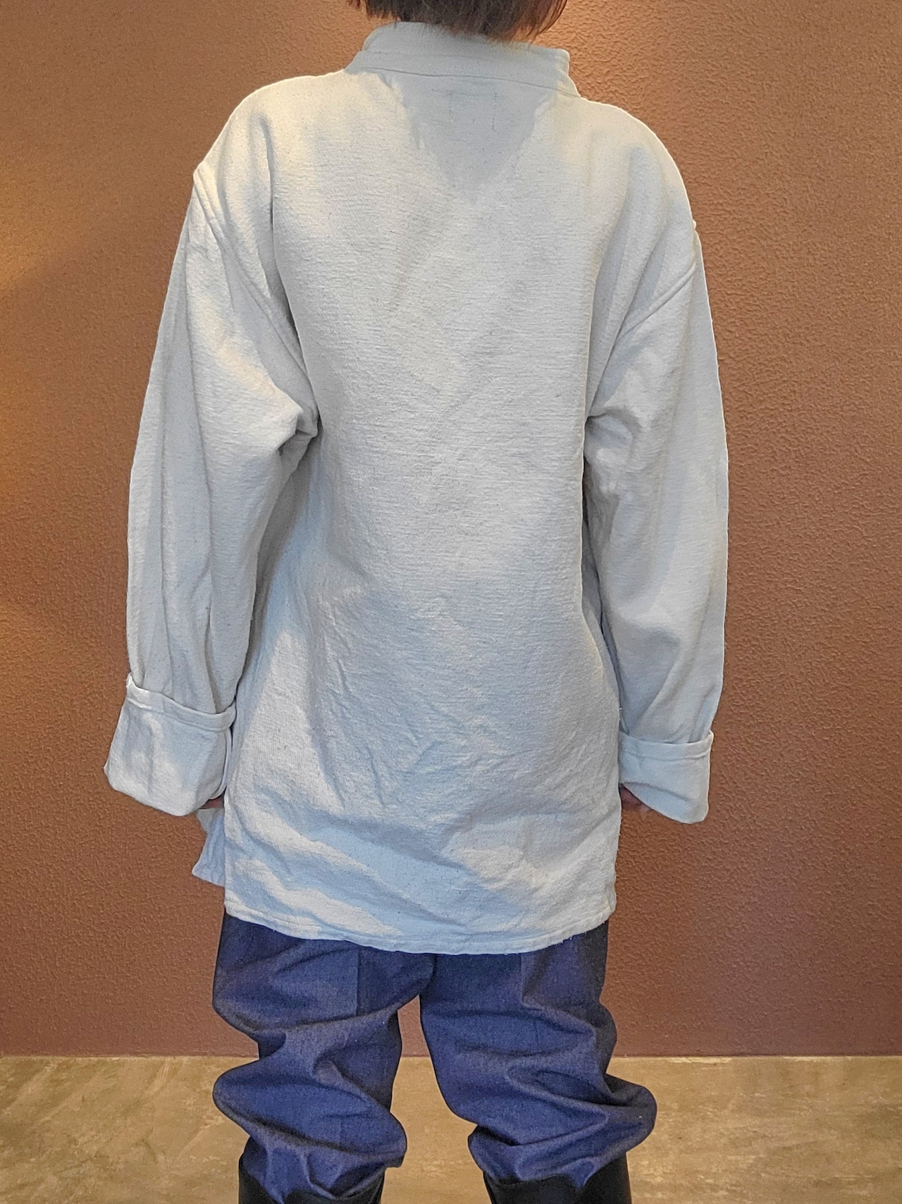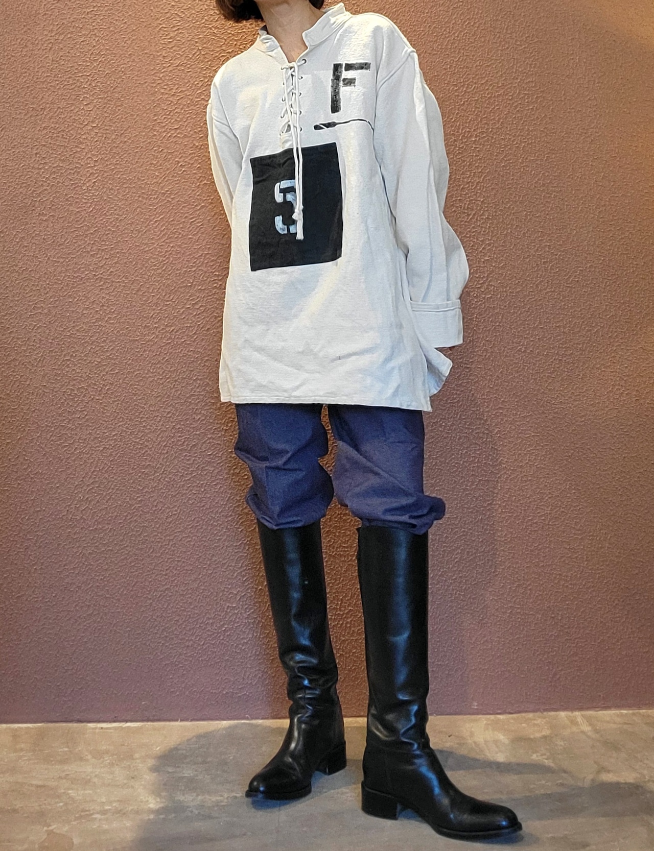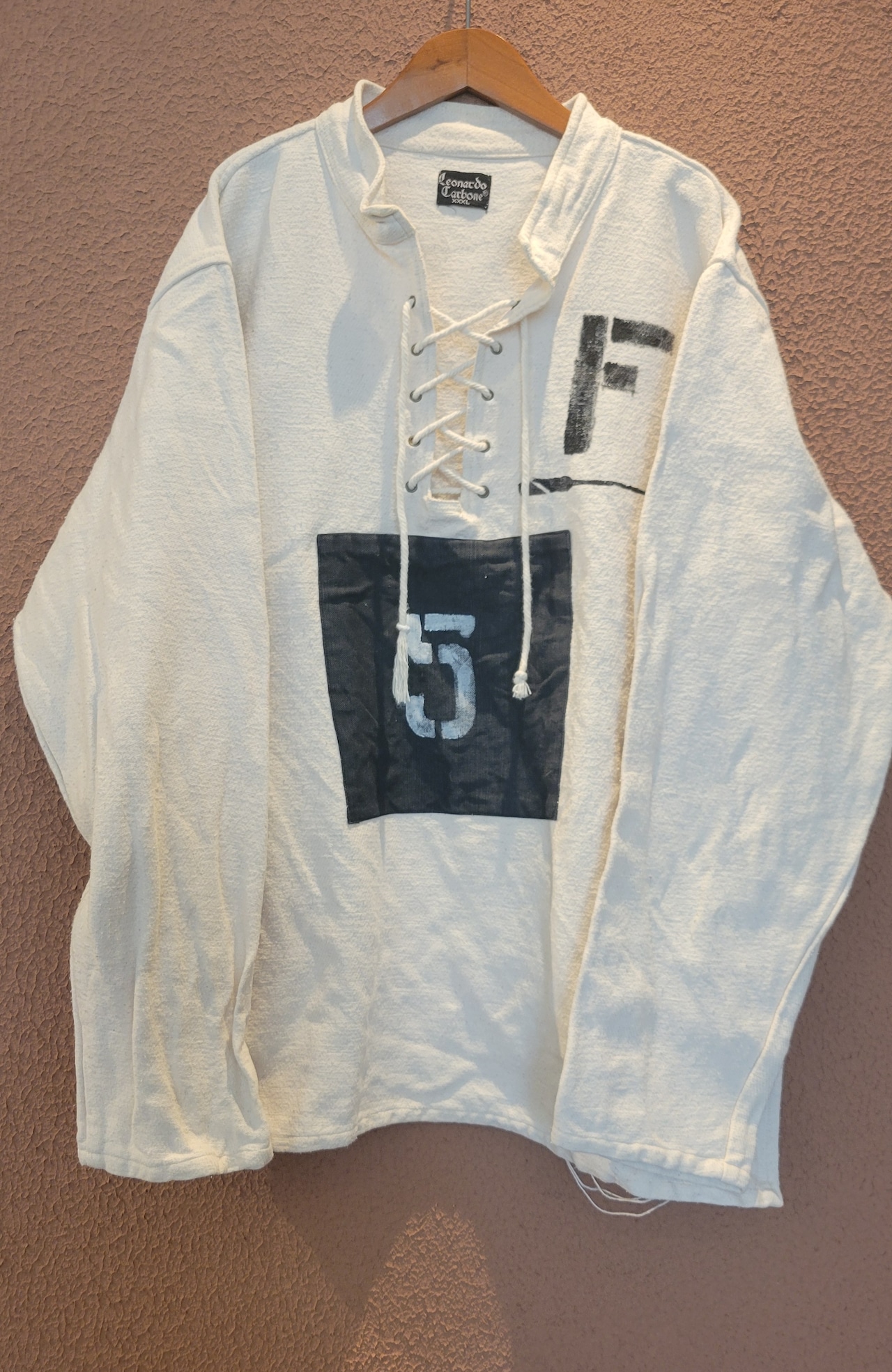 usedのレースアップトップスにカラーパッチワークとステンシルを施したリメイクトップス。素材はやや厚手のしっかりしたコットンです。男女兼用です。アウトドアテイストを取り入れたカジュアルなスタイリングにぴったりです。*右袖に薄い赤の色移りのある部分があります。画像でご確認ください。