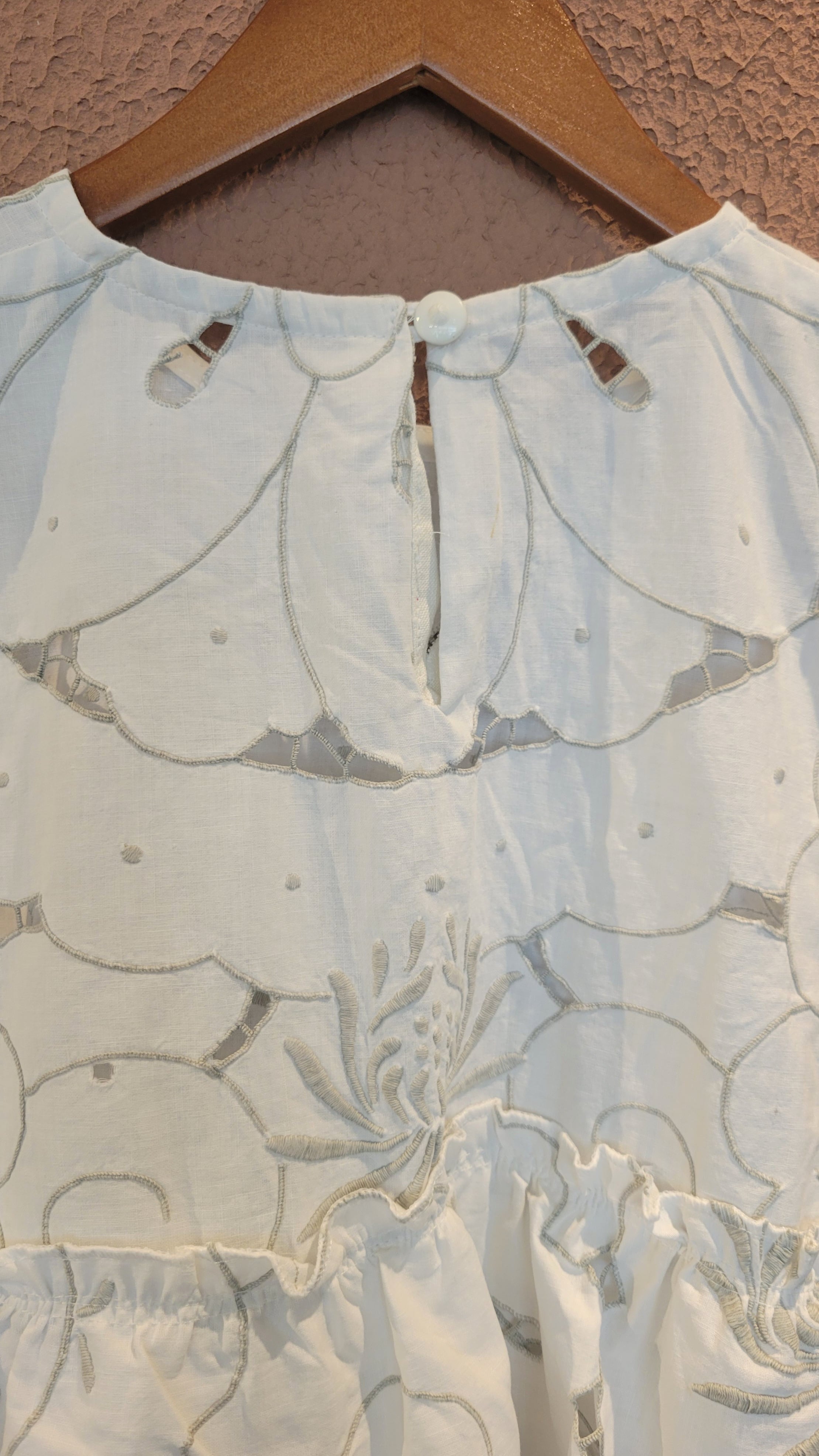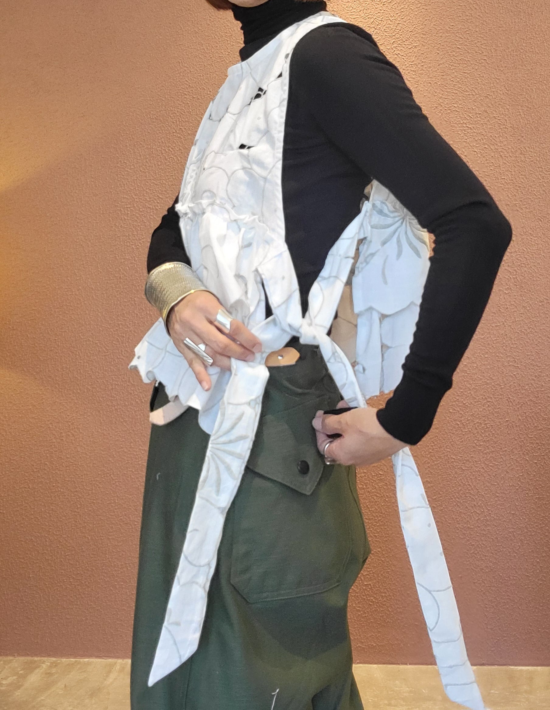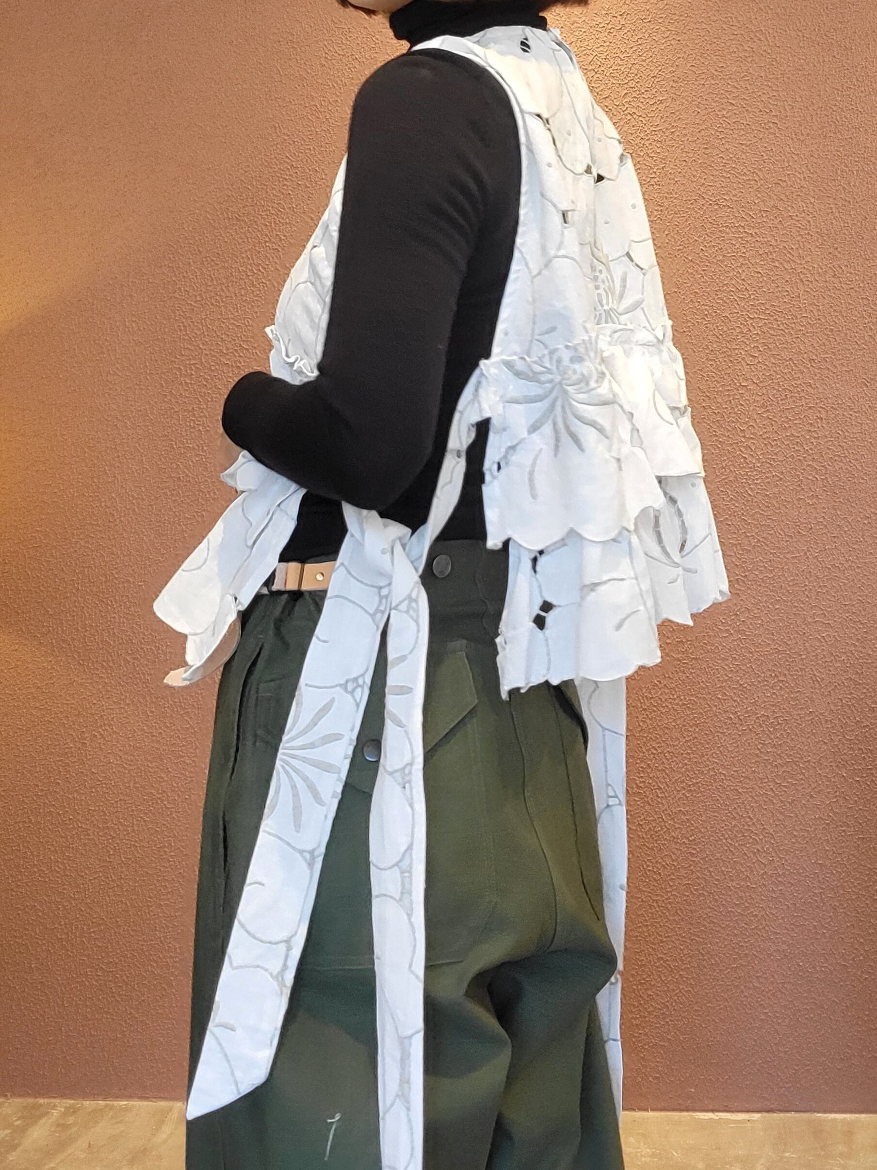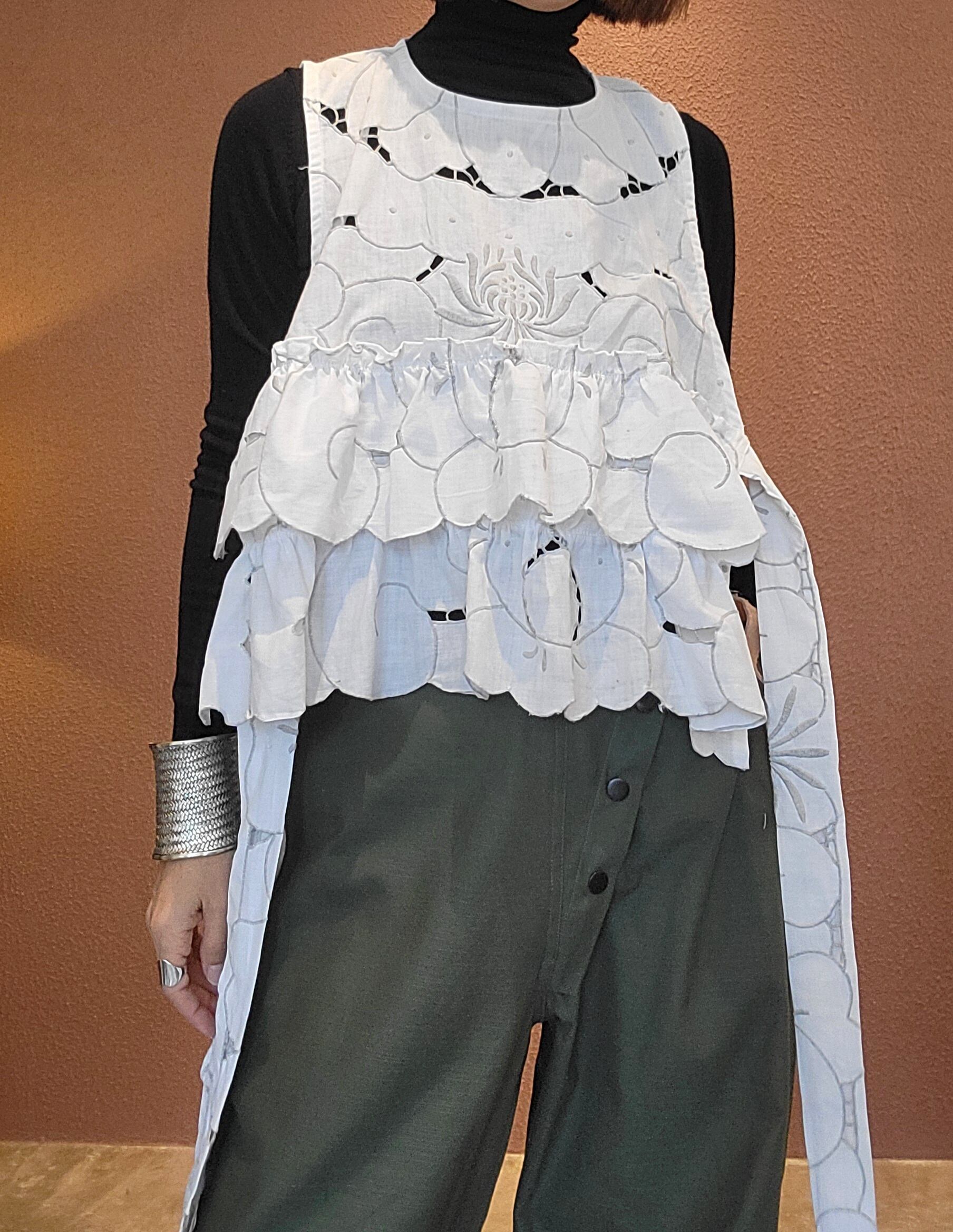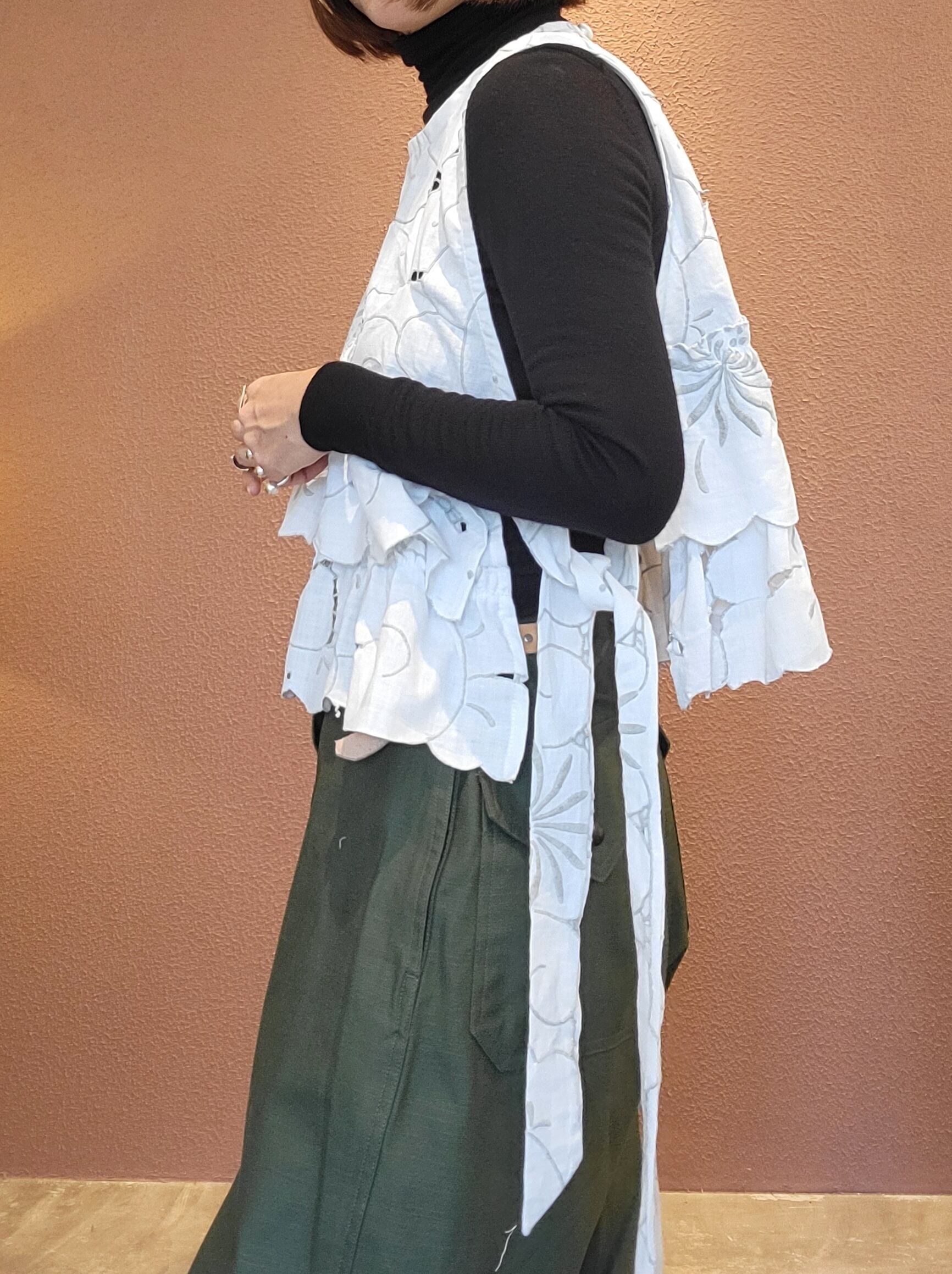 ヴィンテージのカットワークレースを使用したリメイクベスト。サイドオープンのポンチョタイプ、サイズフリーです。首後ろにボタンがひとつ付いています。サイドリボンは結んでもそのまま垂らしても素敵です。ニットやワンピース等の上にプラスしてレイヤードスタイルでお楽しみください。