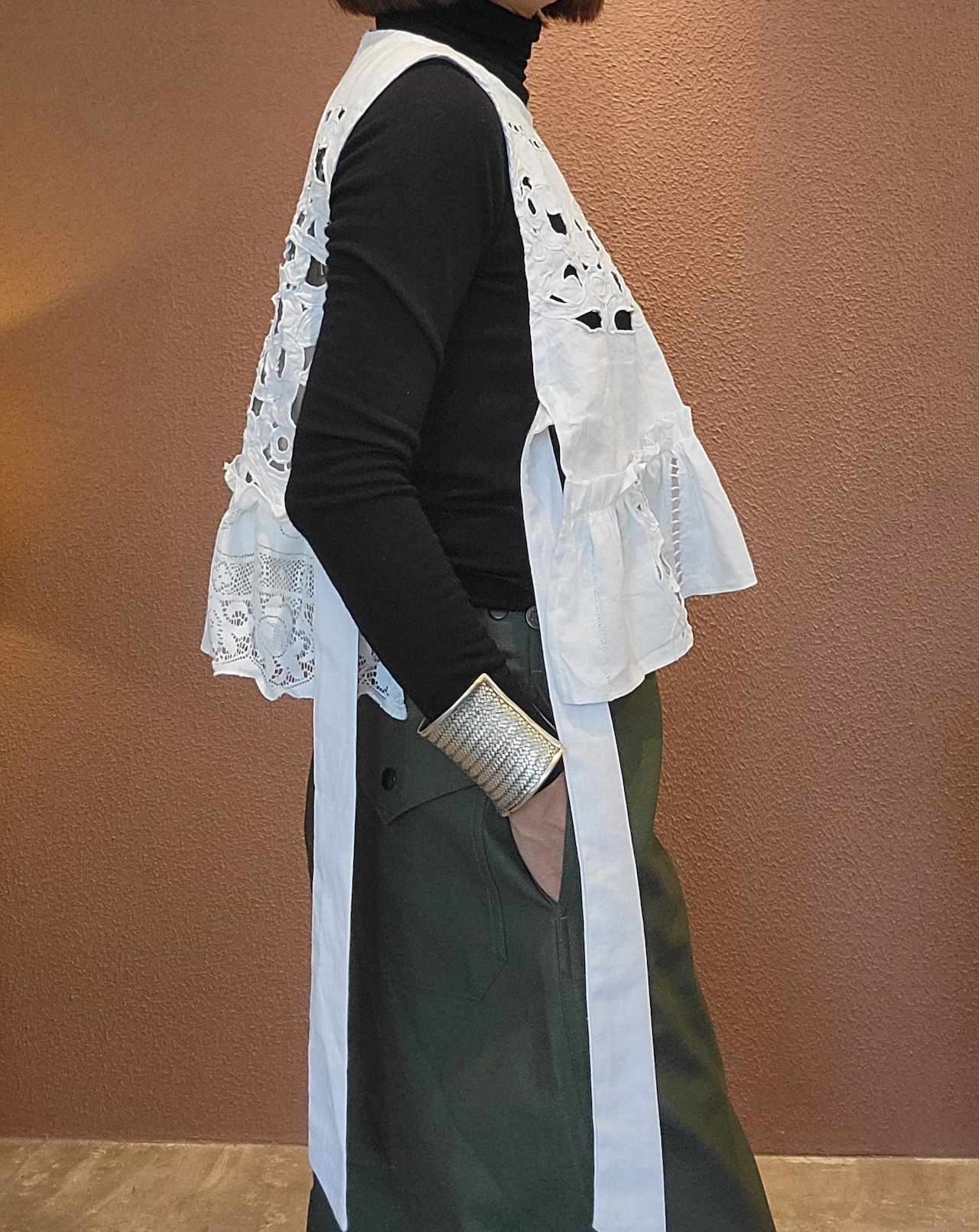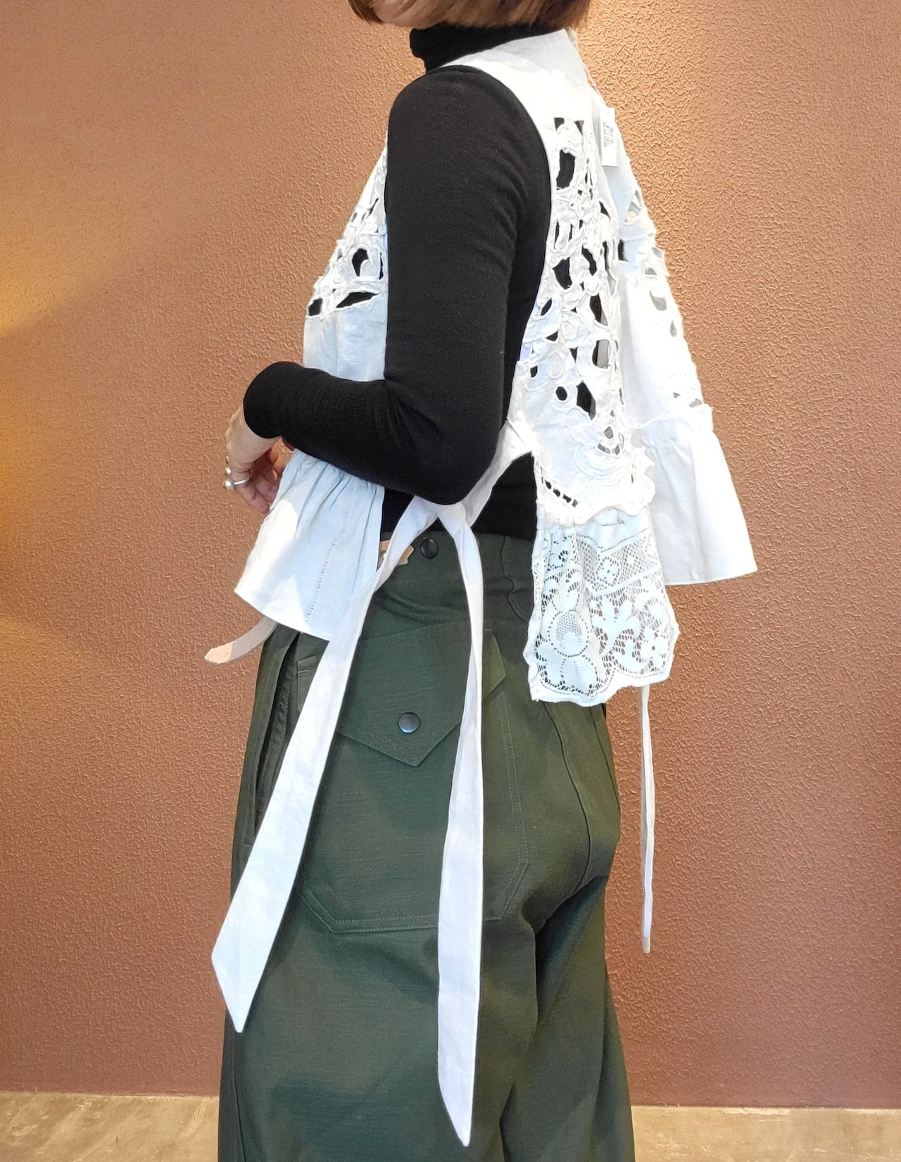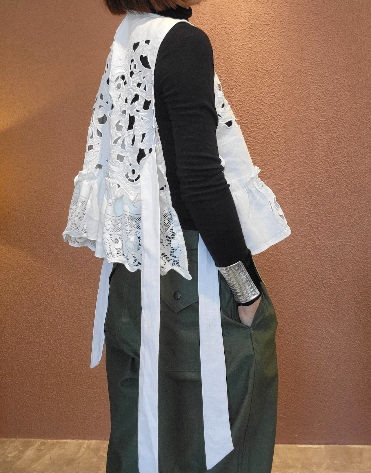 ヴィンテージのカットワークレースを使用したリメイクベスト。サイドオープンのポンチョタイプ、サイズフリーです。首後ろにボタンがひとつ付いています。サイドリボンは結んでもそのまま垂らしても素敵です。ニットやワンピース等の上にプラスしてレイヤードスタイルでお楽しみください。