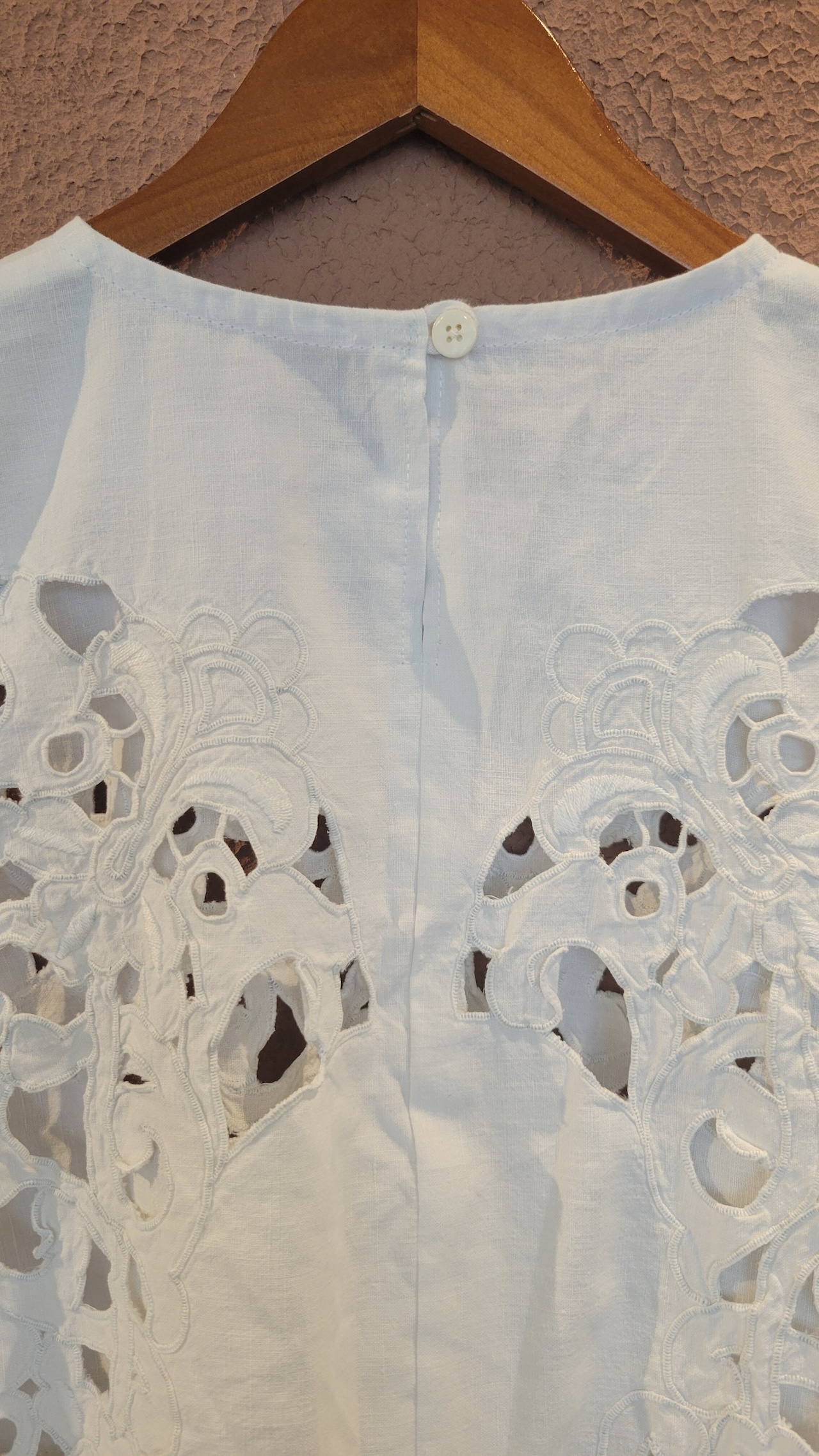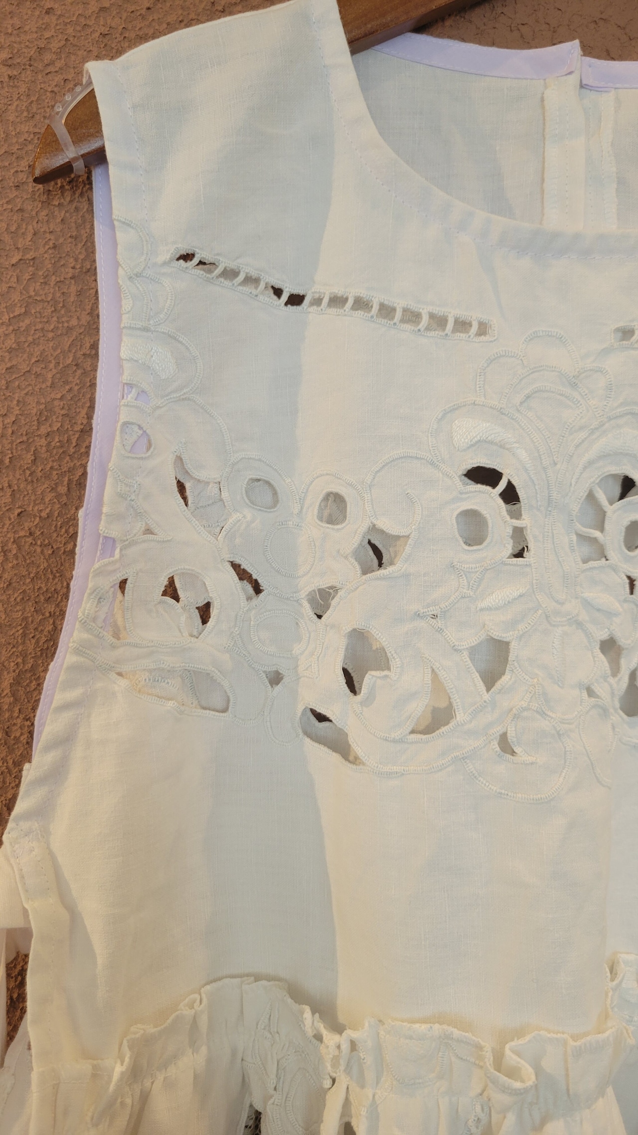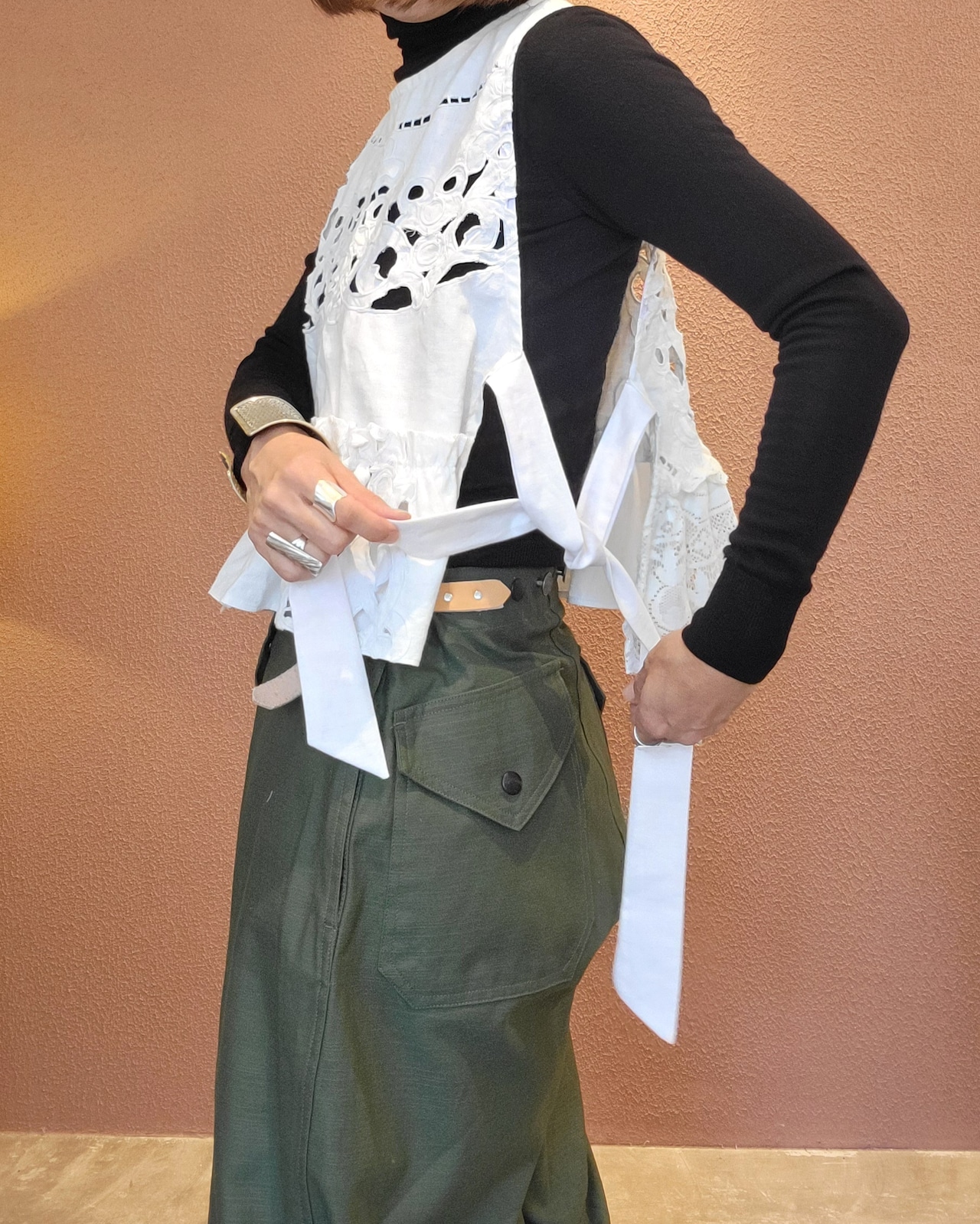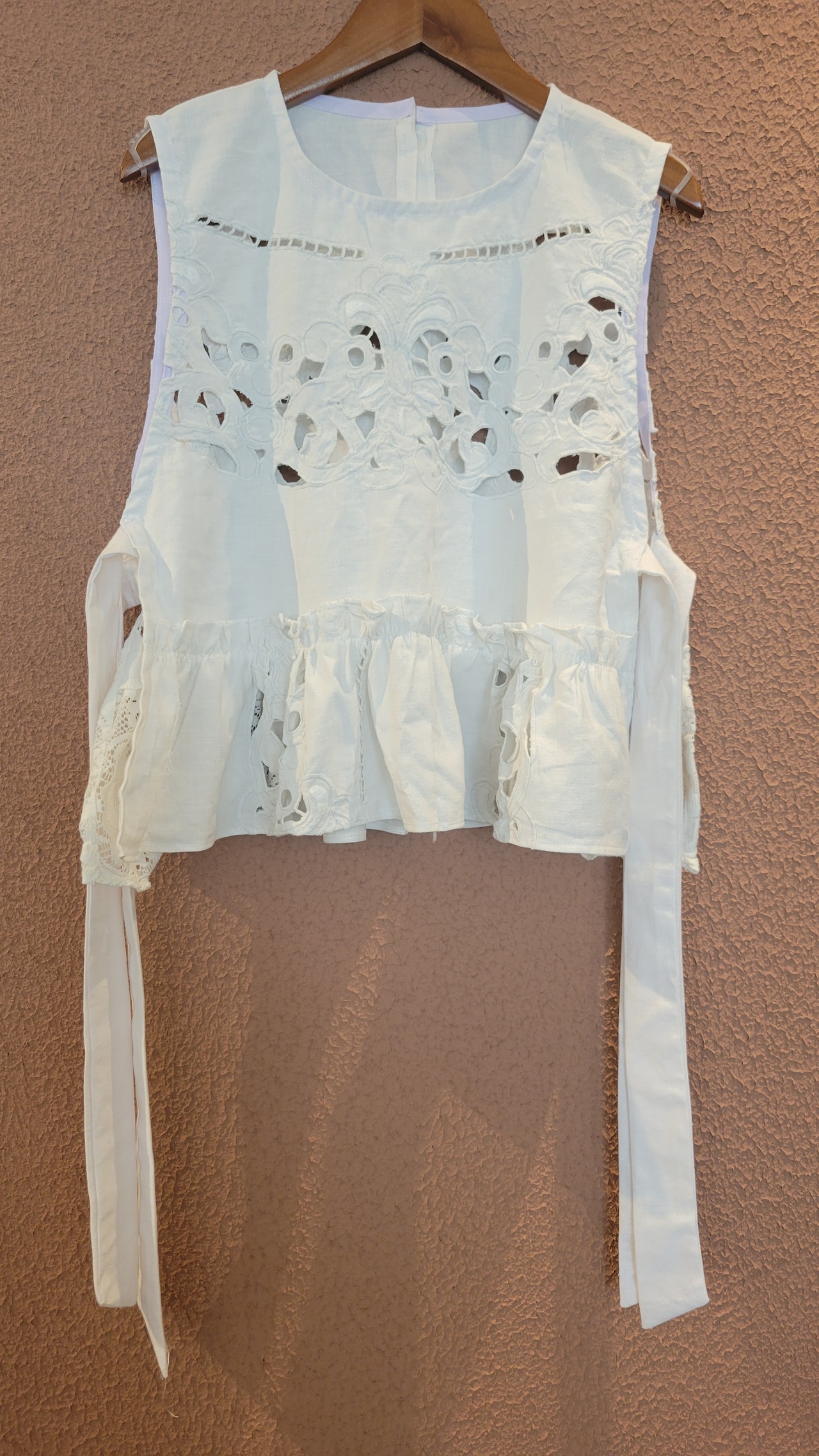 ヴィンテージのカットワークレースを使用したリメイクベスト。サイドオープンのポンチョタイプ、サイズフリーです。首後ろにボタンがひとつ付いています。サイドリボンは結んでもそのまま垂らしても素敵です。ニットやワンピース等の上にプラスしてレイヤードスタイルでお楽しみください。