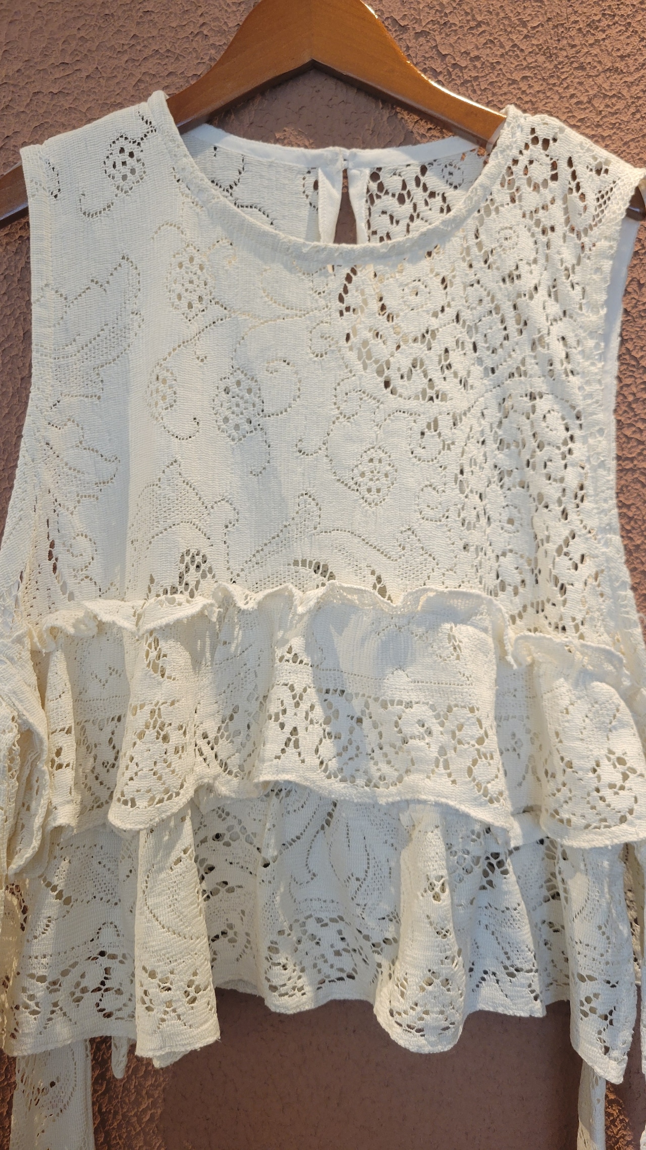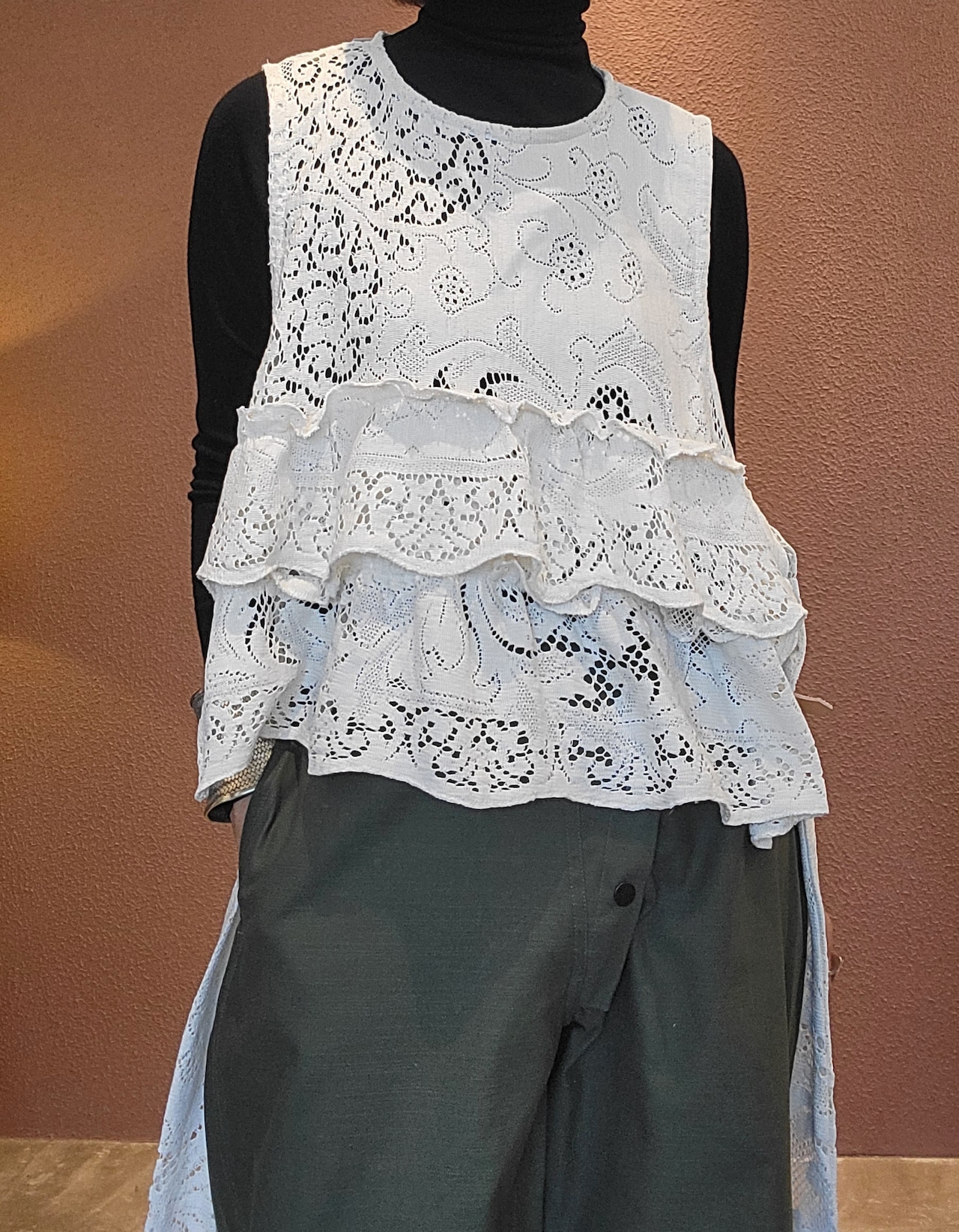 ヴィンテージのカットワークレースを使用したリメイクベスト。サイドオープンのポンチョタイプ、サイズフリーです。首後ろにボタンがひとつ付いています。サイドリボンは結んでもそのまま垂らしても素敵です。ニットやワンピース等の上にプラスしてレイヤードスタイルでお楽しみください。
