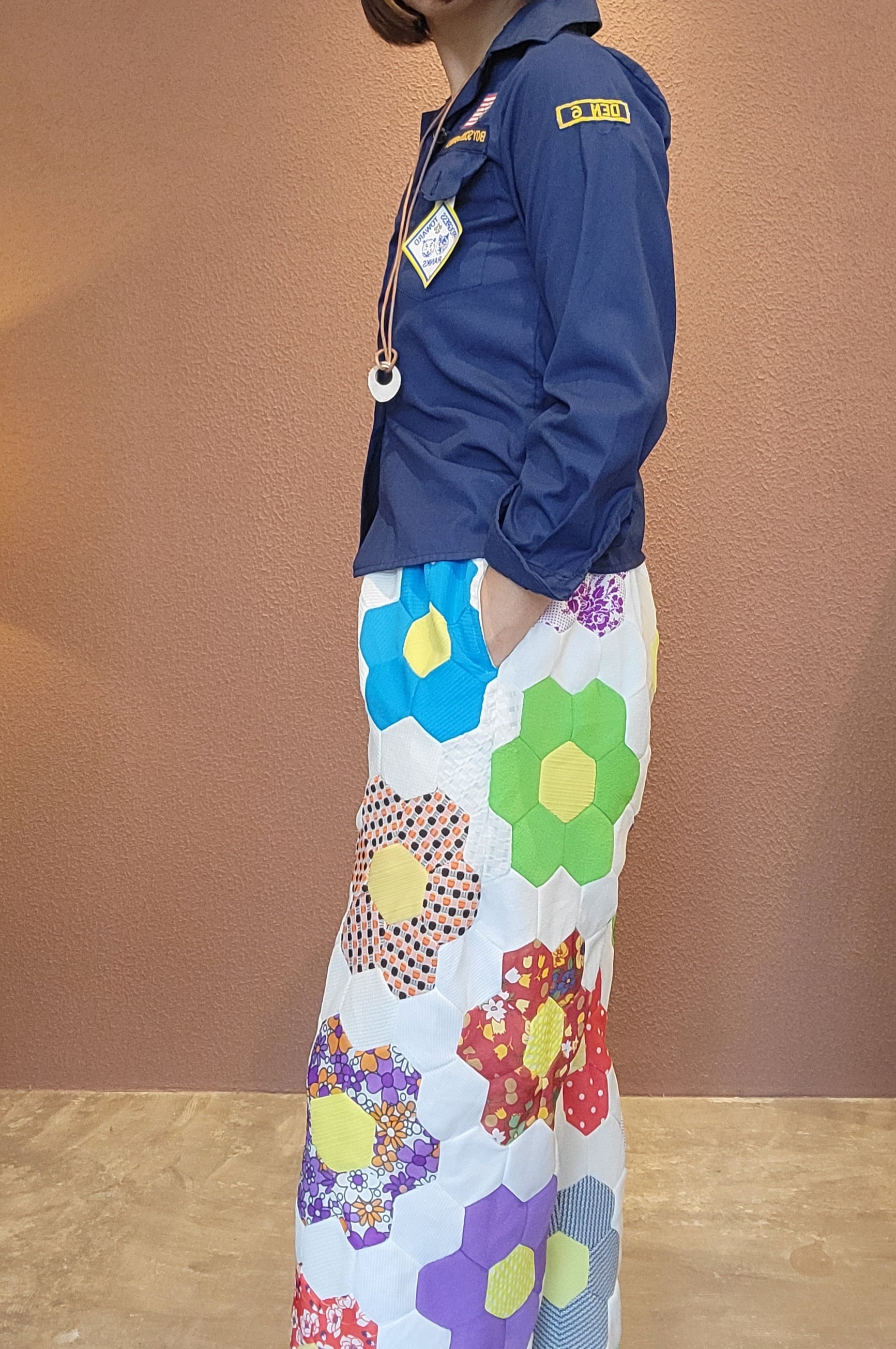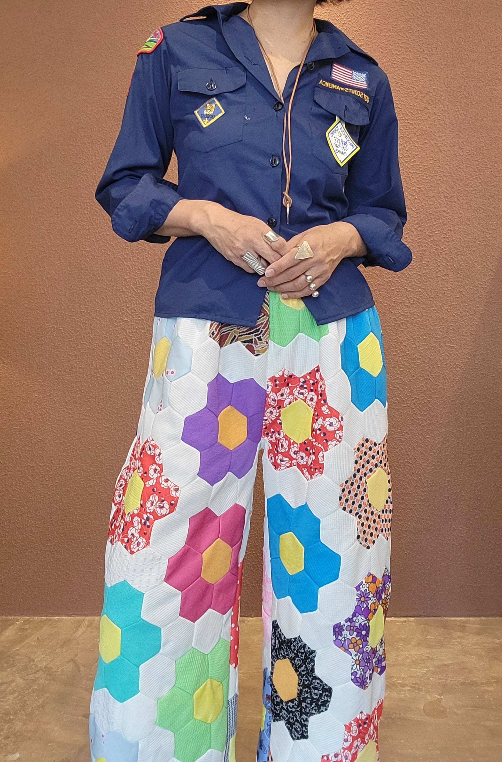 ヴィンテージのパッチワークキルト生地を使用したリメイクイージーパンツ。素材はポリエステルのようです。裏地付き。ウエストゴム、左右ポケット付きです。ほど良くワイドなシルエットと軽量な素材でとても動きやすく快適なはき心地です。