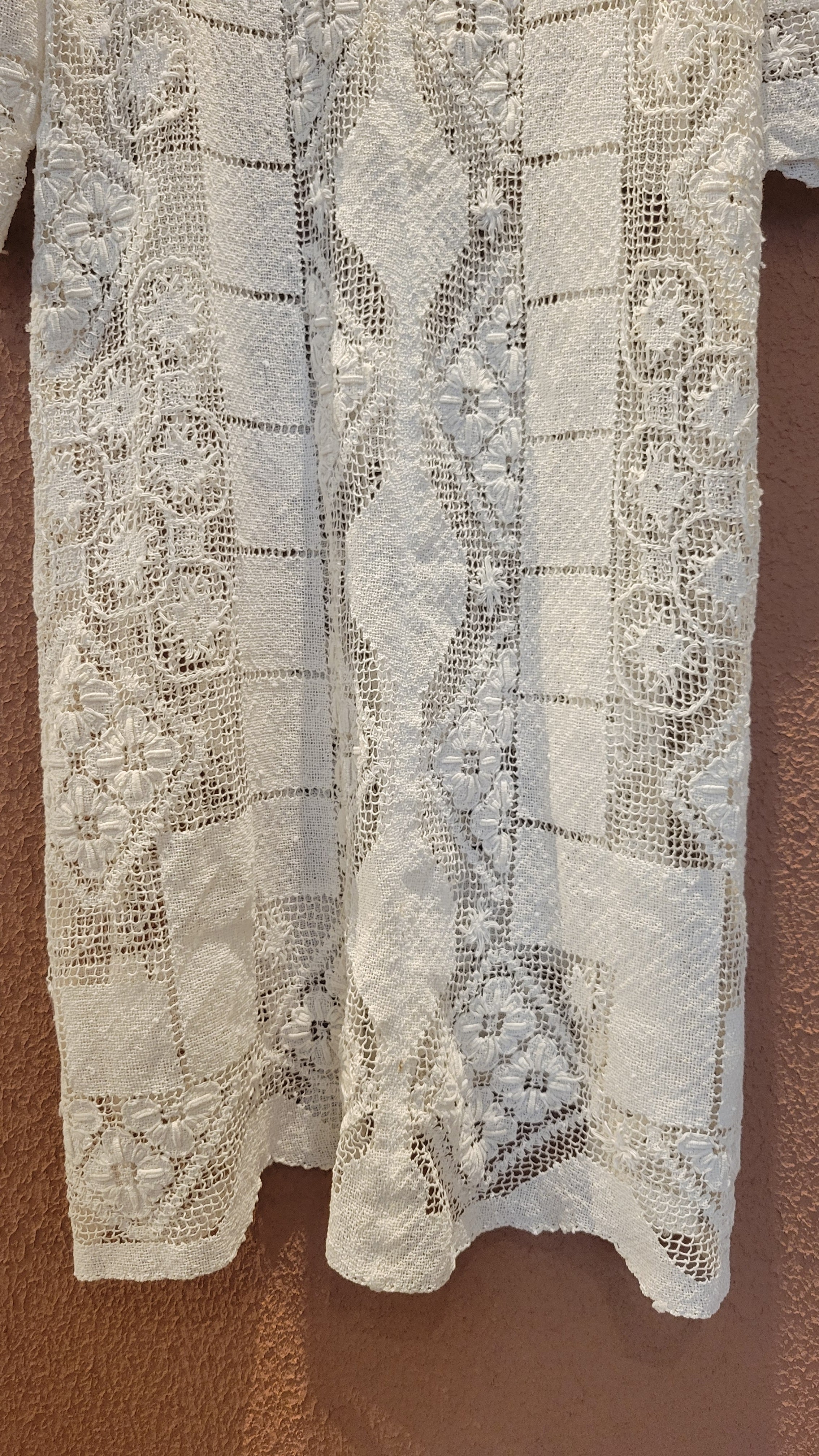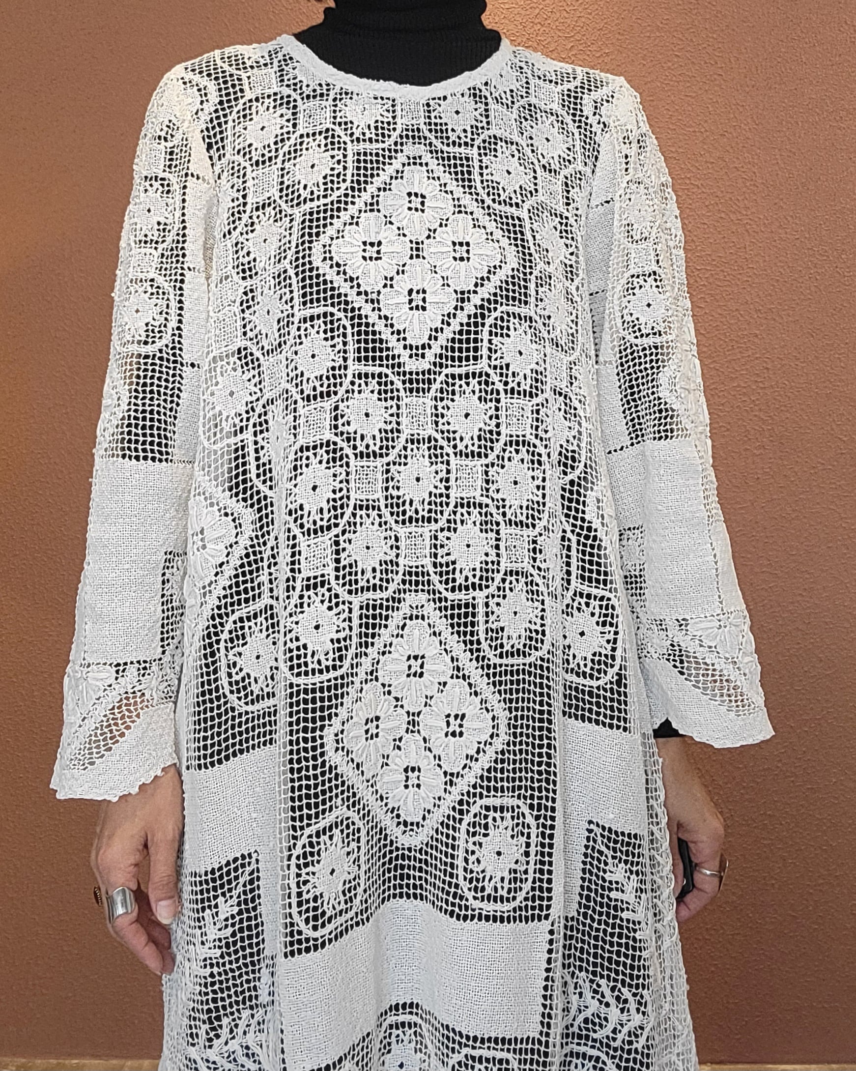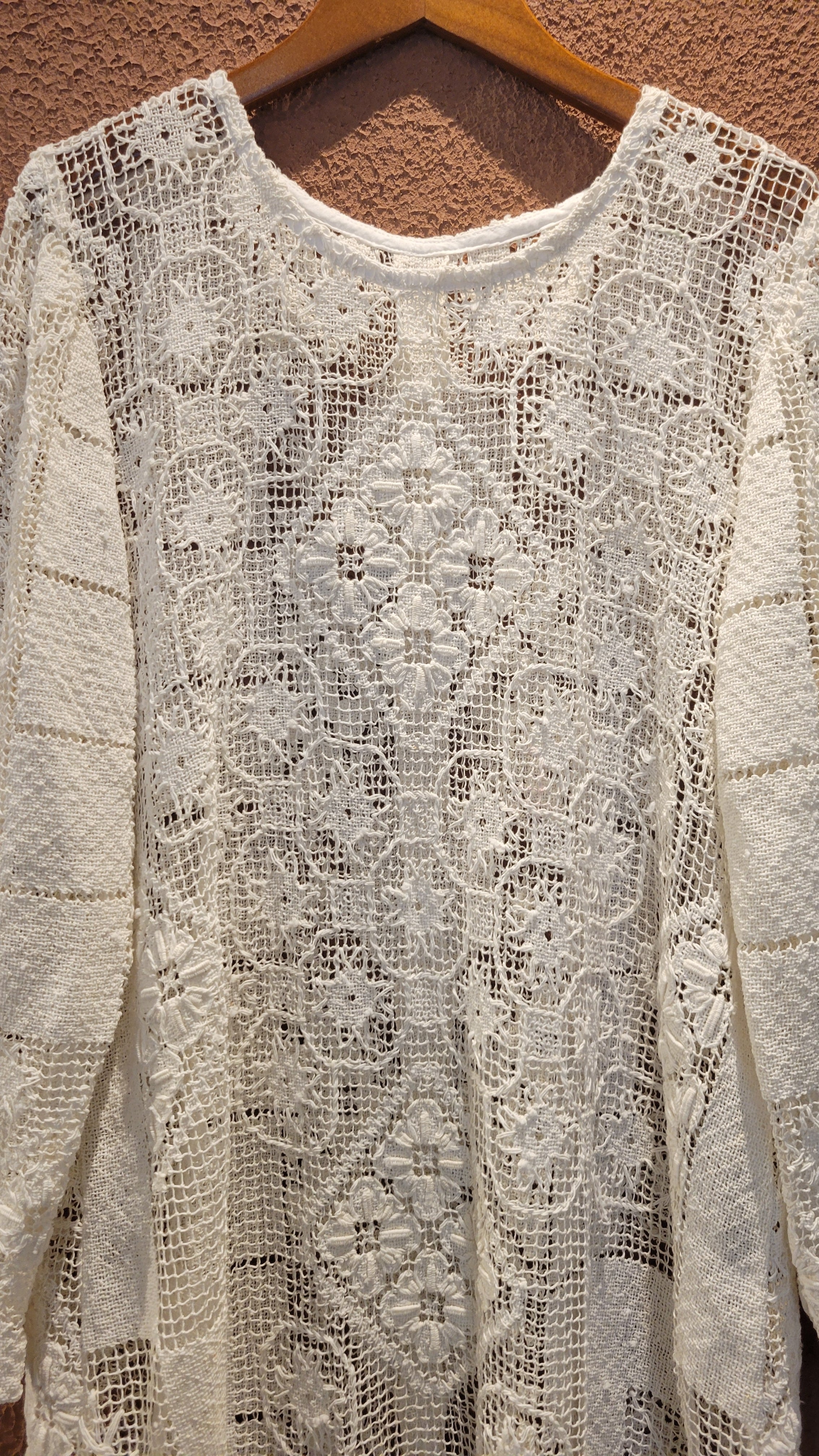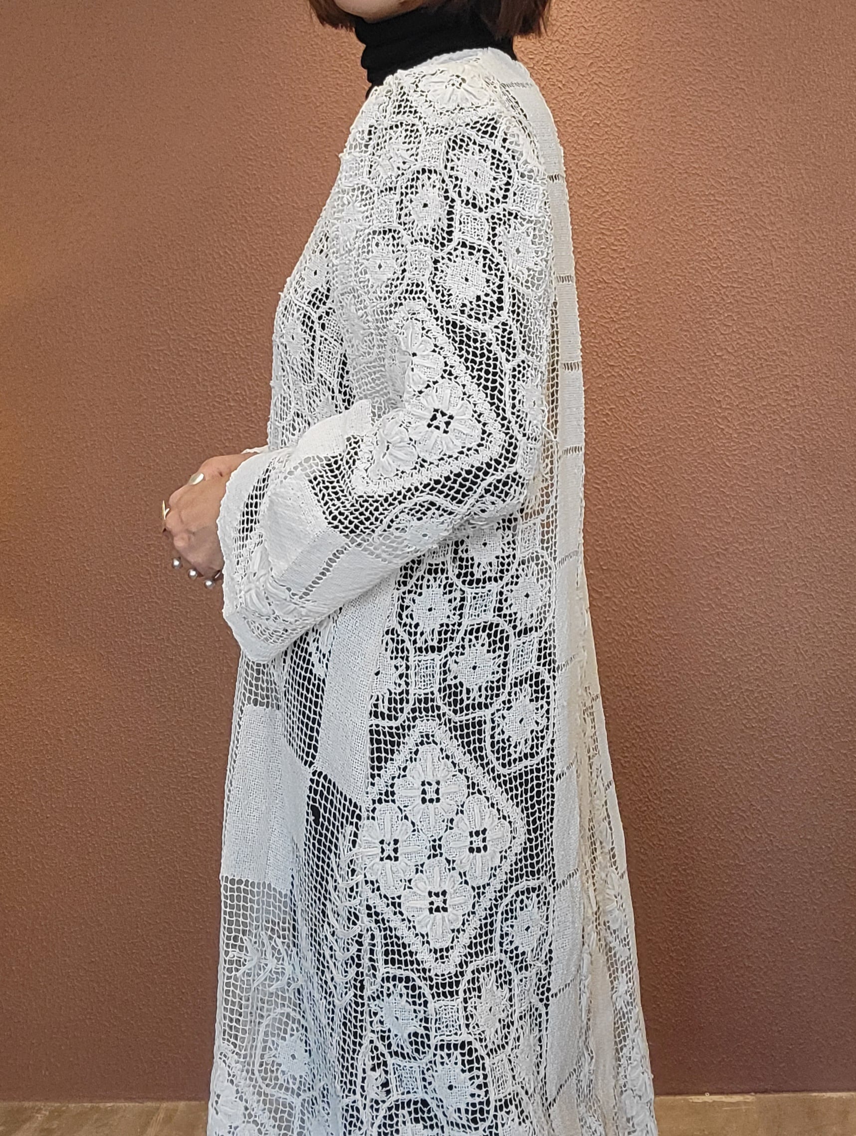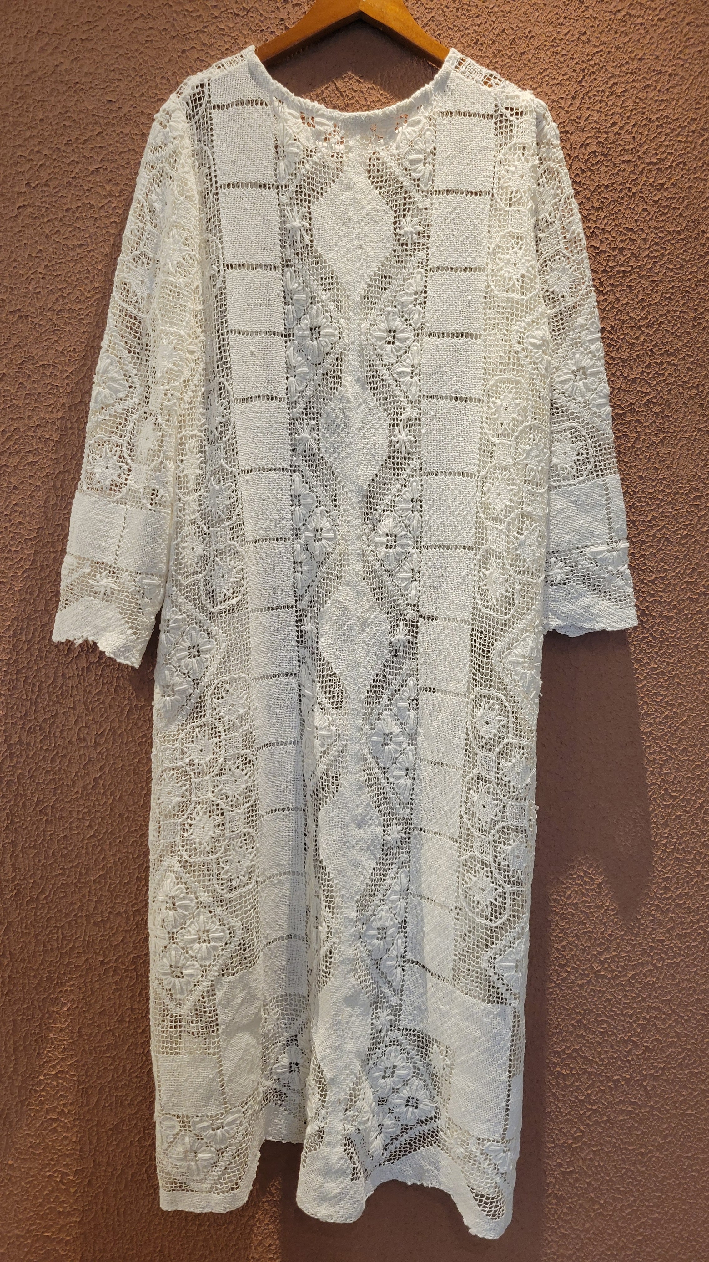 ヴィンテージレースを使用したリメイクワンピース。素材表記はありませんがコットンのようです。ファスナー等は付いておらず頭から被るようにして着用するプルオーバータイプです。秋冬はインナーにリブタートルニット等を合わせて。ブーツとの相性も良いです。