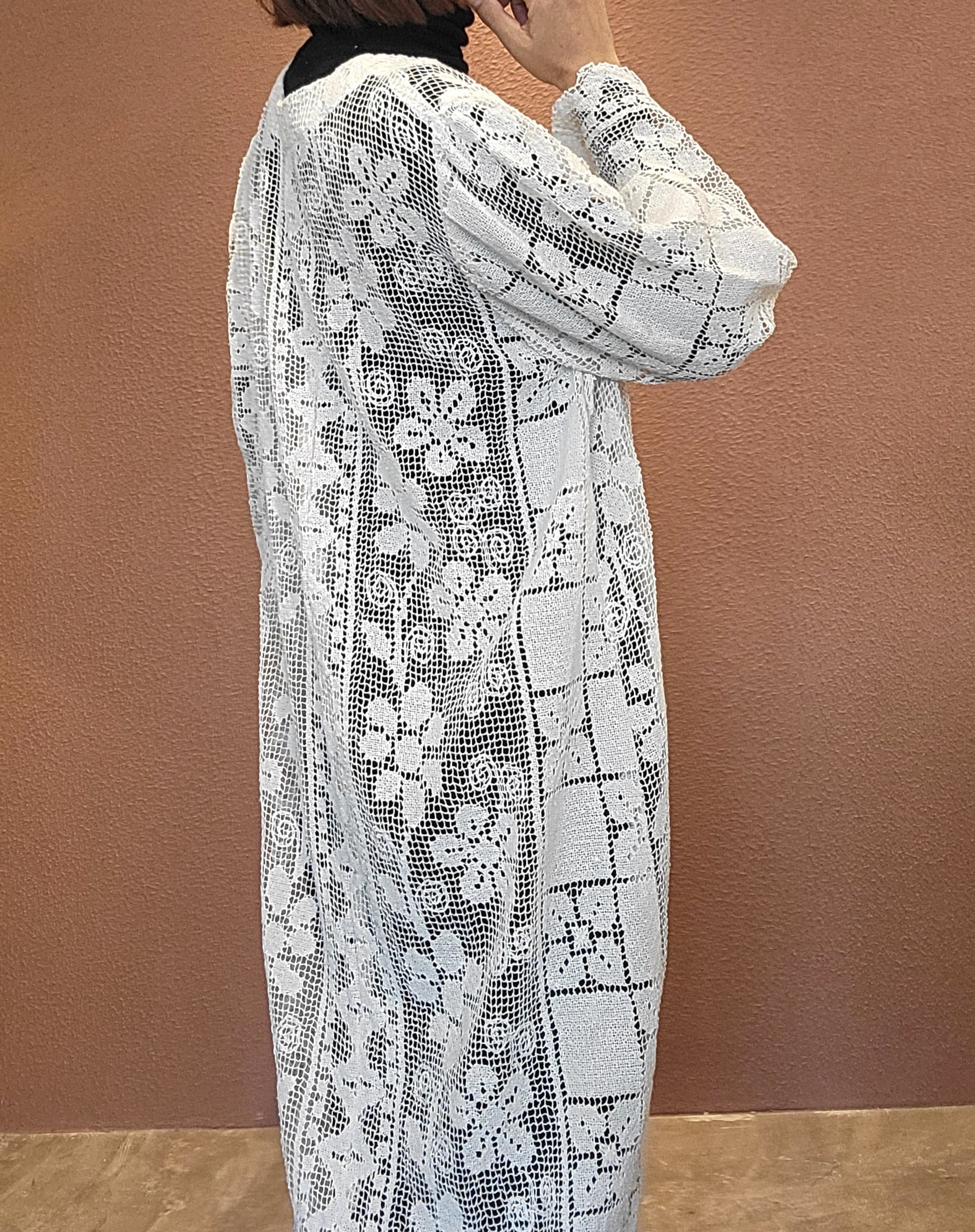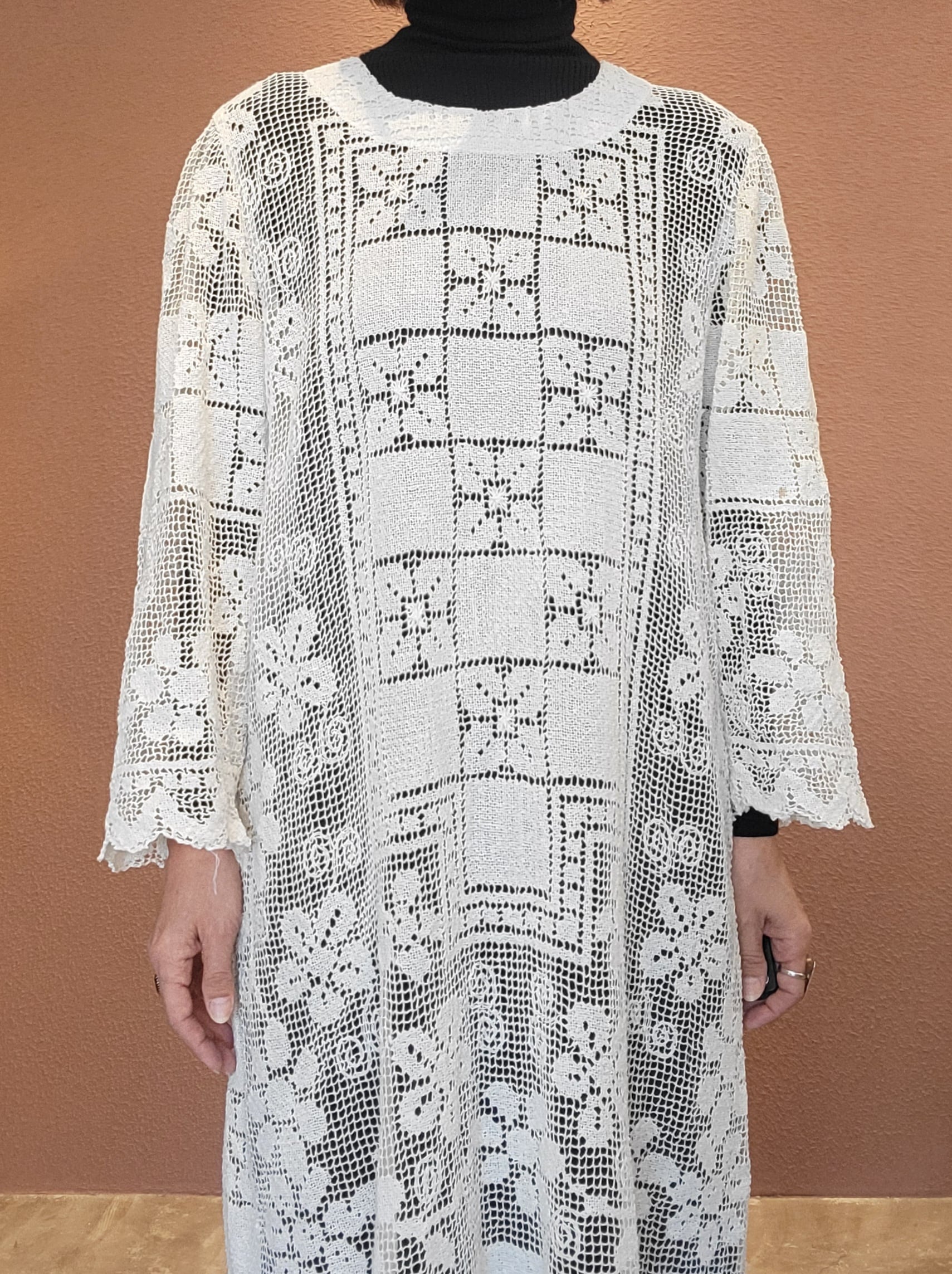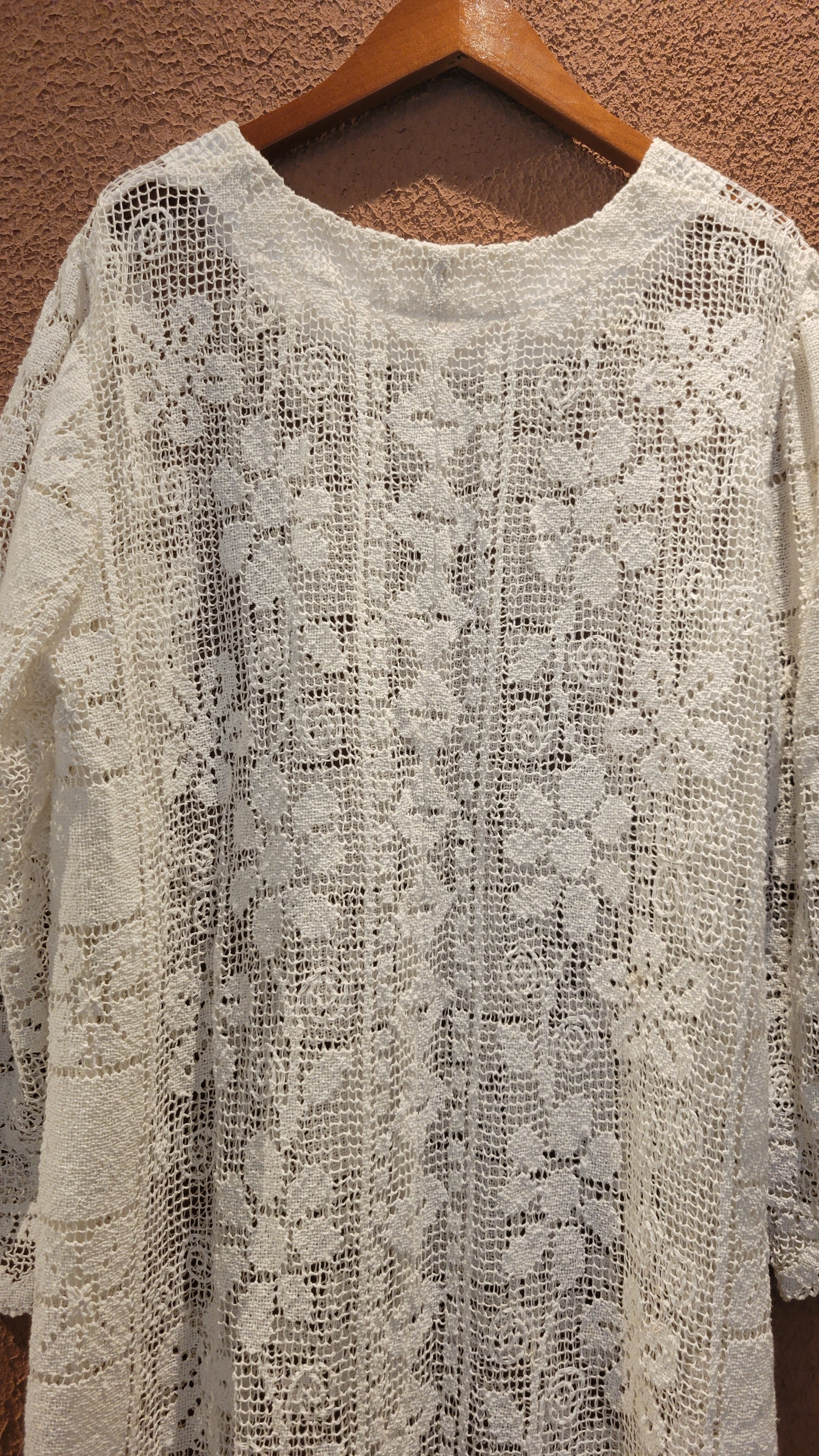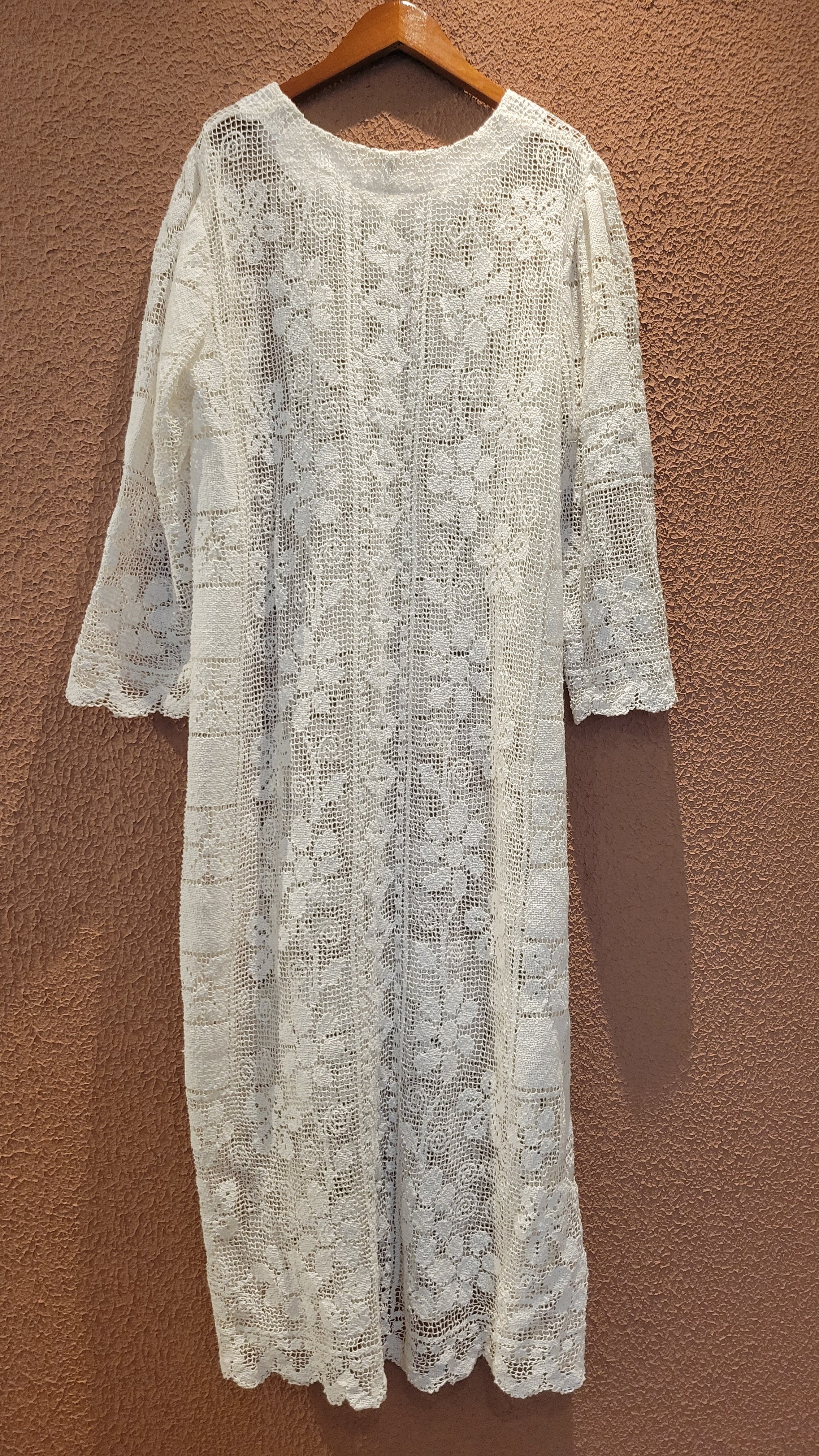 ヴィンテージレースを使用したリメイクワンピース。素材表記はありませんがコットンのようです。ファスナー等は付いておらず頭から被るようにして着用するプルオーバータイプです。秋冬はインナーにリブタートルニット等を合わせて。ブーツとの相性も良いです。*右袖に幅5ミリほどの薄いシミがあります。画像でご確認ください。