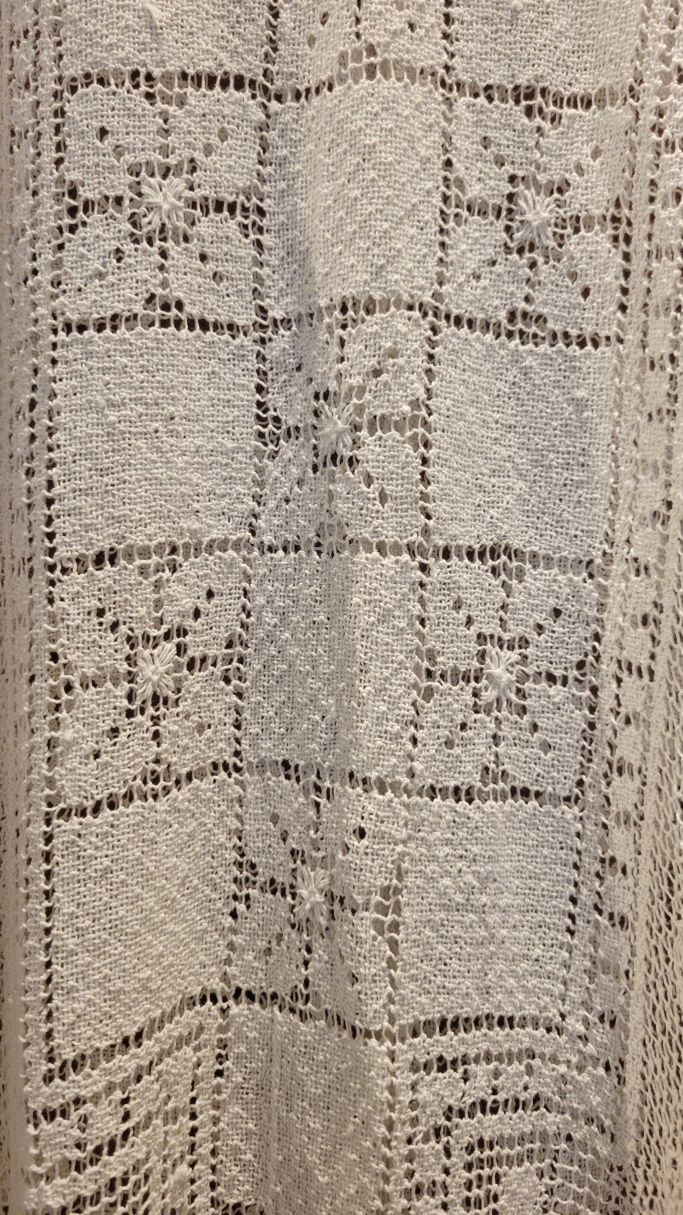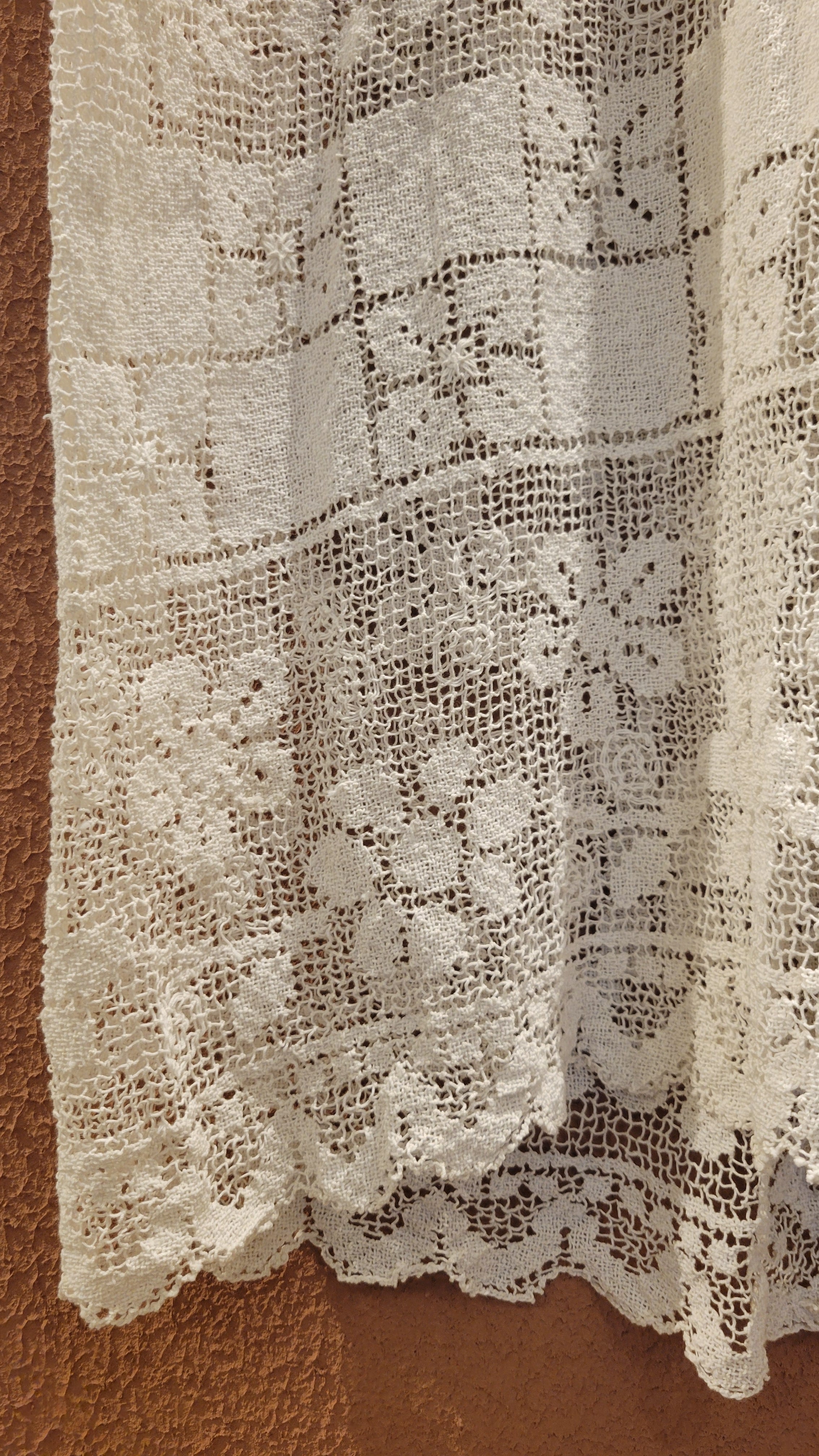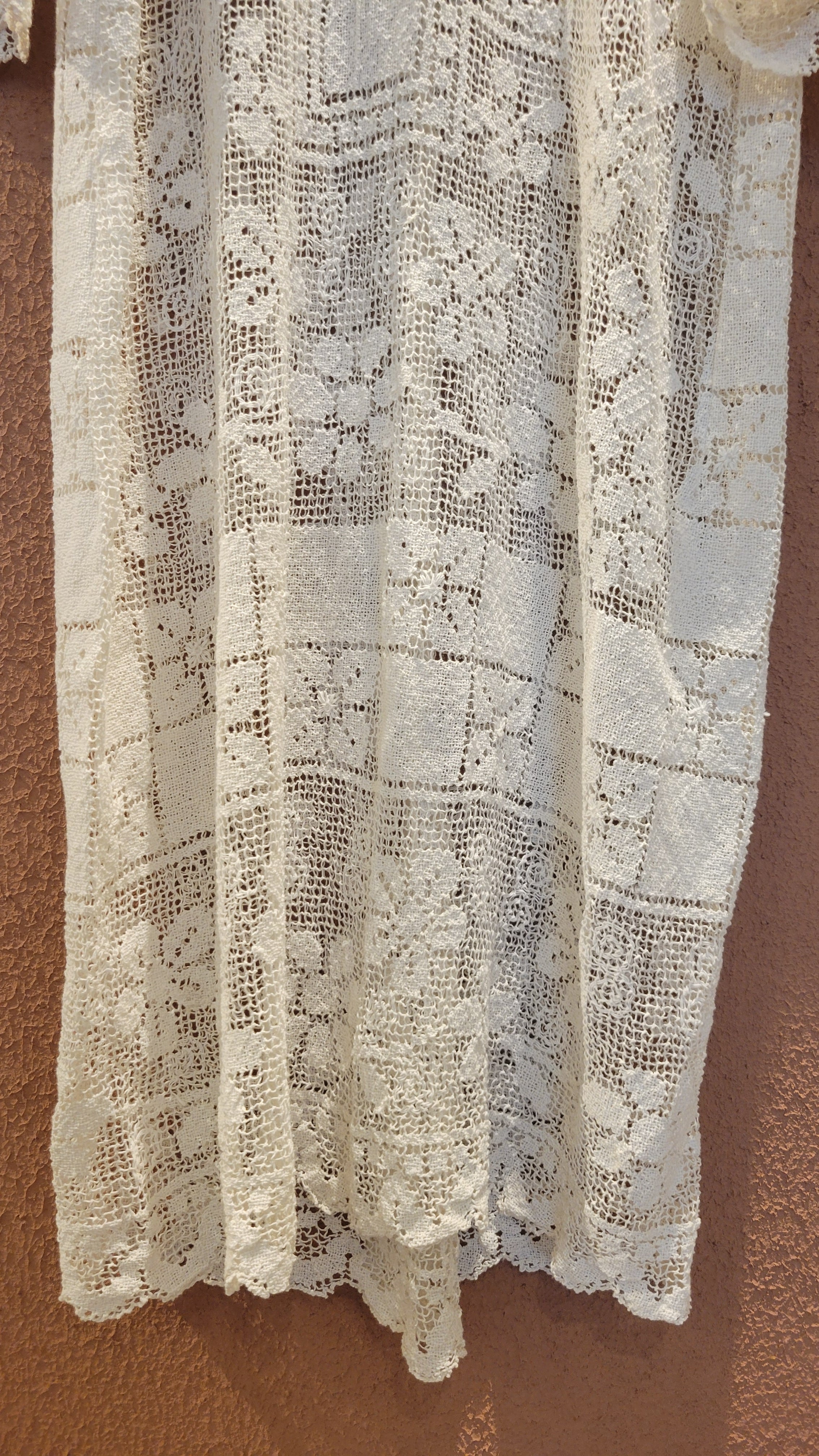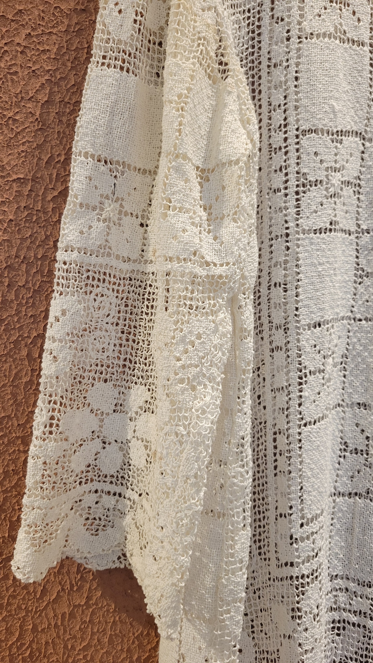 ヴィンテージレースを使用したリメイクワンピース。素材表記はありませんがコットンのようです。ファスナー等は付いておらず頭から被るようにして着用するプルオーバータイプです。秋冬はインナーにリブタートルニット等を合わせて。ブーツとの相性も良いです。*右袖に幅5ミリほどの薄いシミがあります。画像でご確認ください。