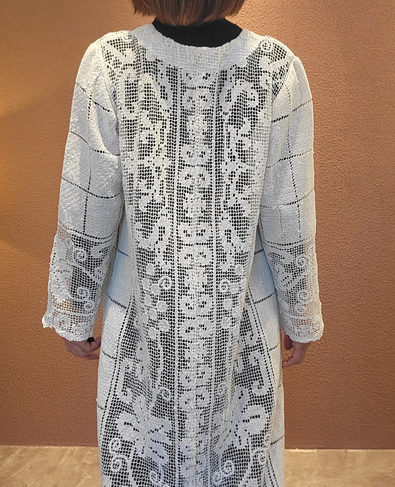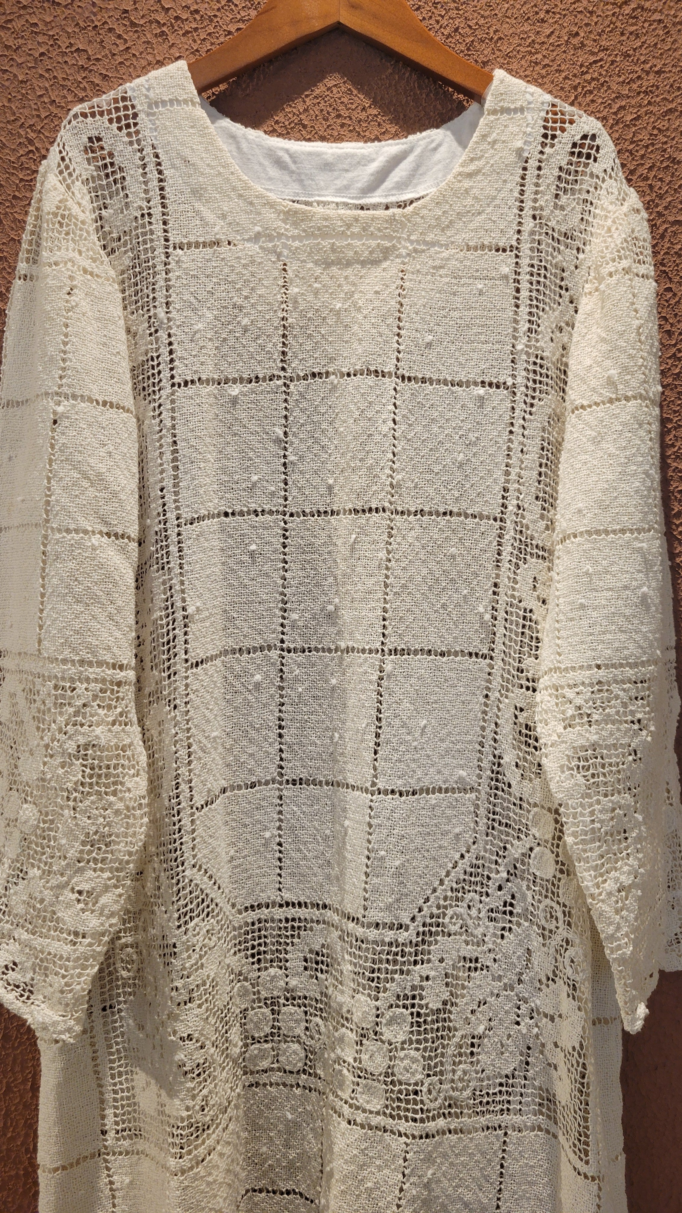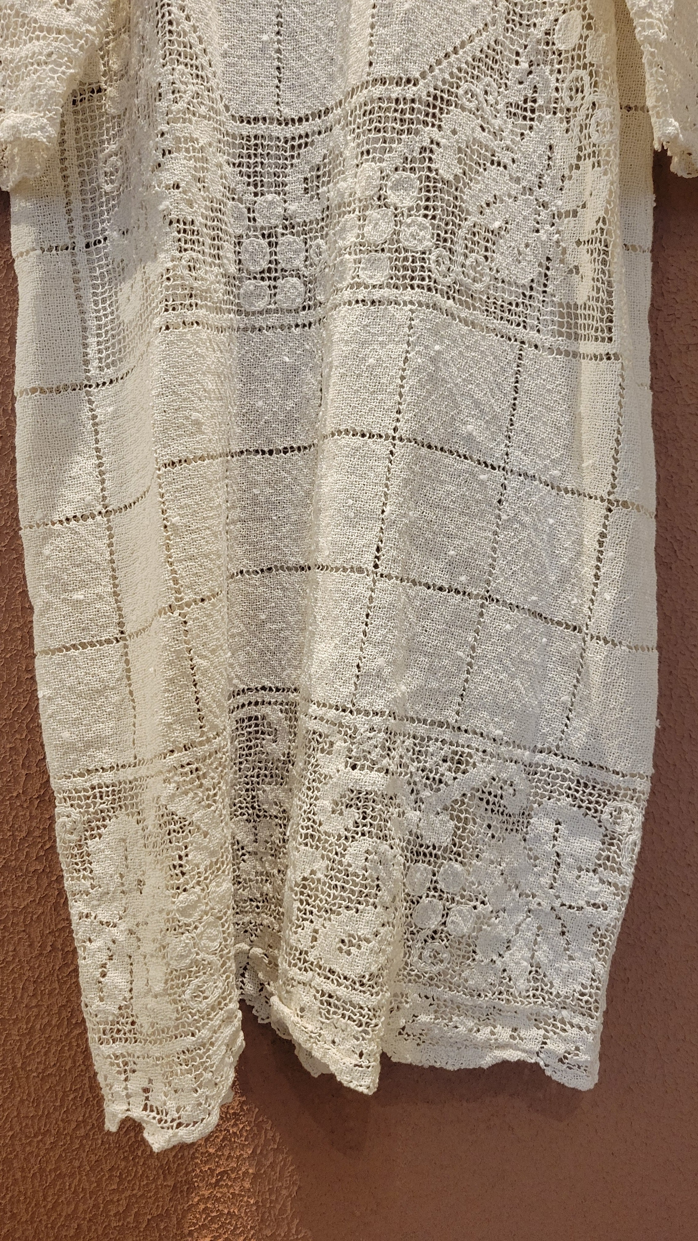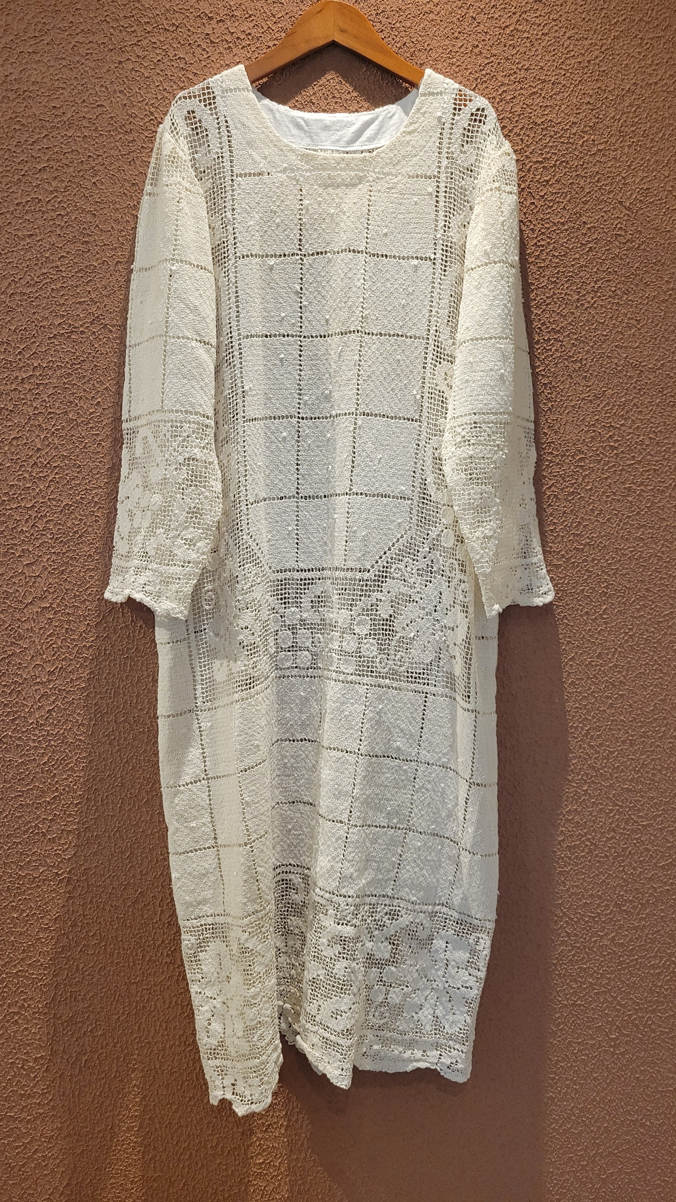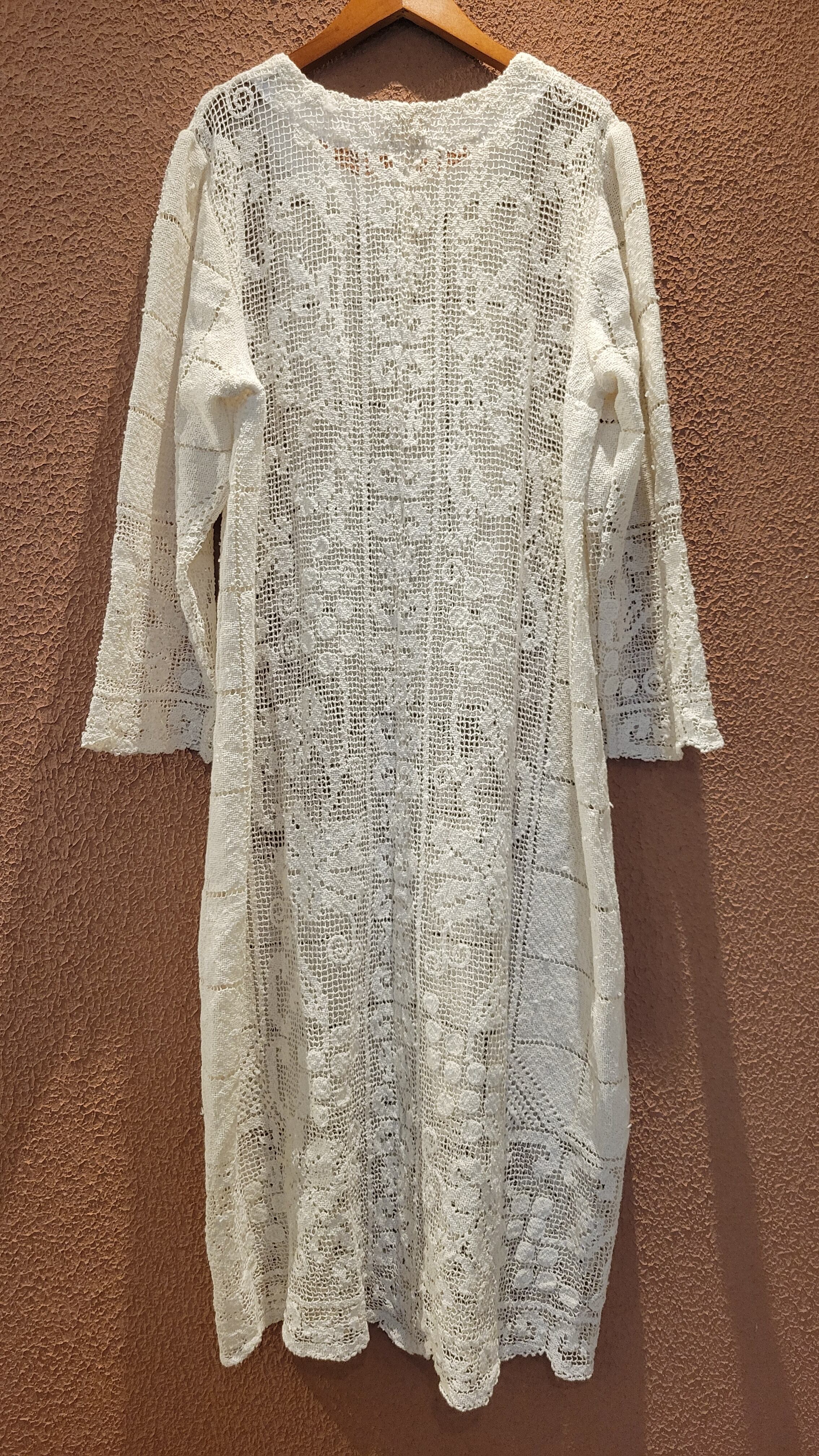ヴィンテージレースを使用したリメイクワンピース。素材表記はありませんがコットンのようです。ファスナー等は付いておらず頭から被るようにして着用するプルオーバータイプです。秋冬はインナーにリブタートルニット等を合わせて。ブーツとの相性も良いです。*全体にネップのような糸のポツポツが見られます。画像でご確認ください。