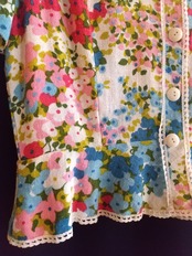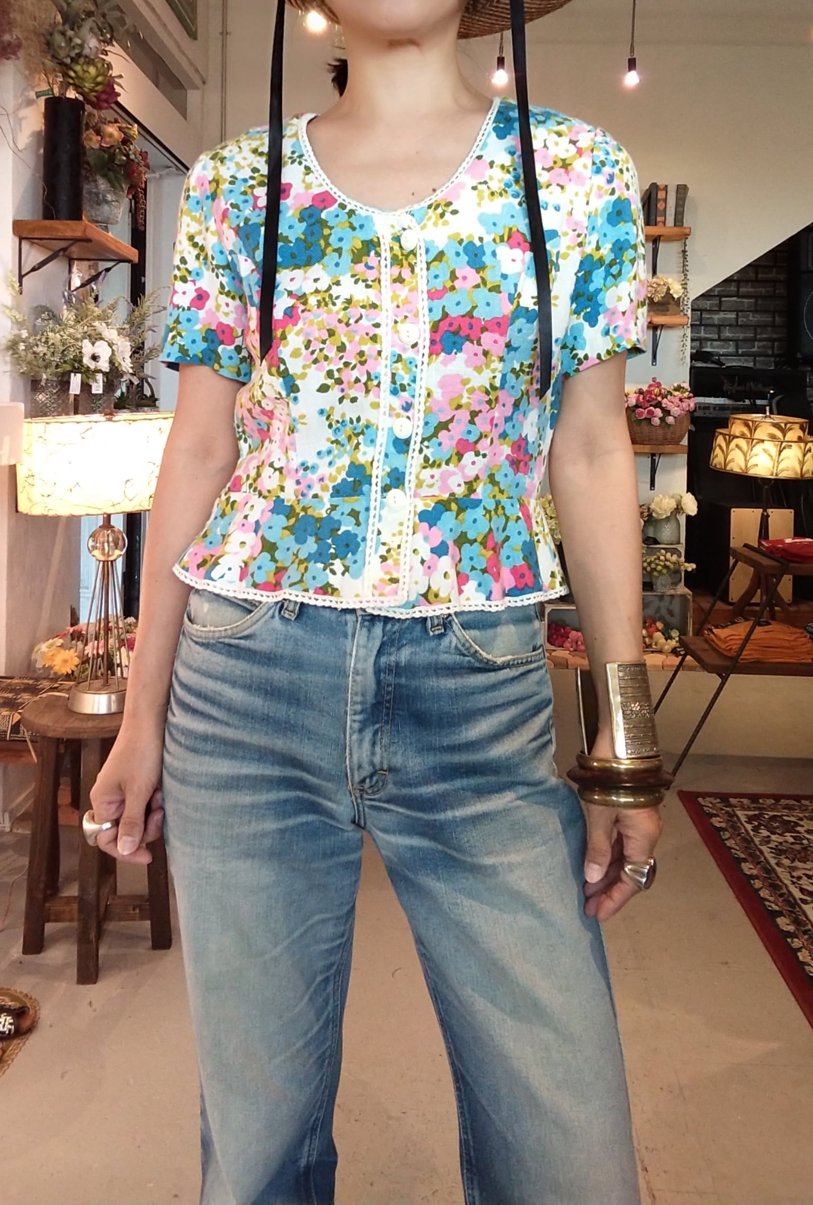やや厚手のやわらかいコットン素材のショートジャケット。ヴィンテージならではのファブリックの質感やプリントの発色が魅力です。控えめなレースの縁取りや裾のペプラム、コンパクトなサイジングはブラウスとしても着られます。