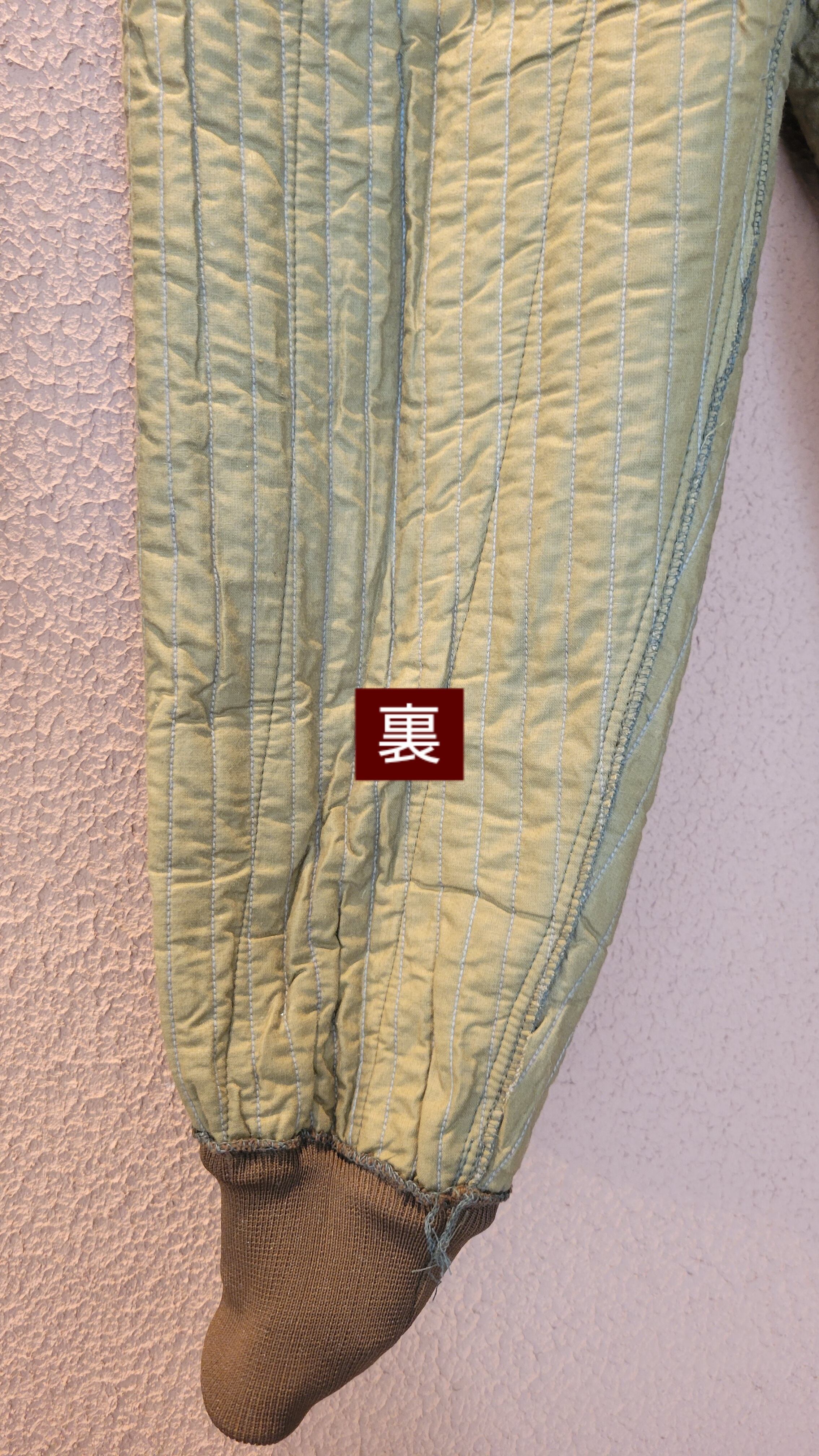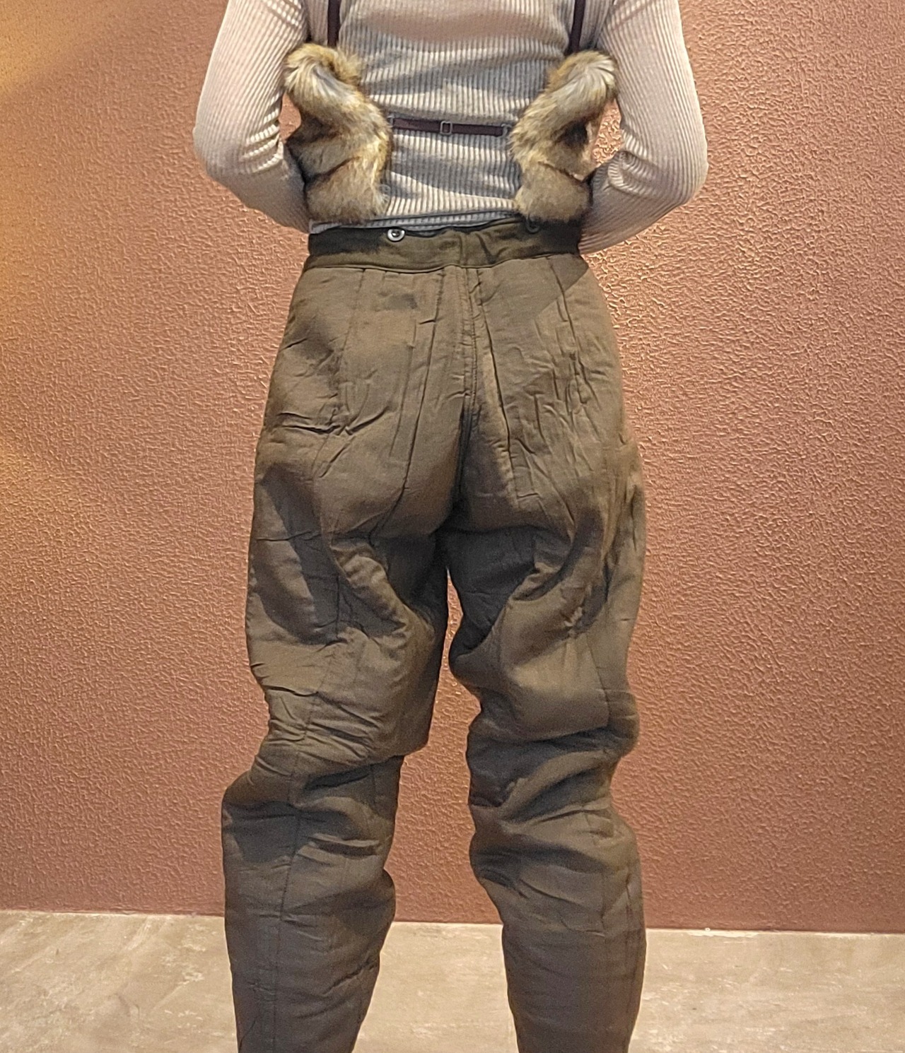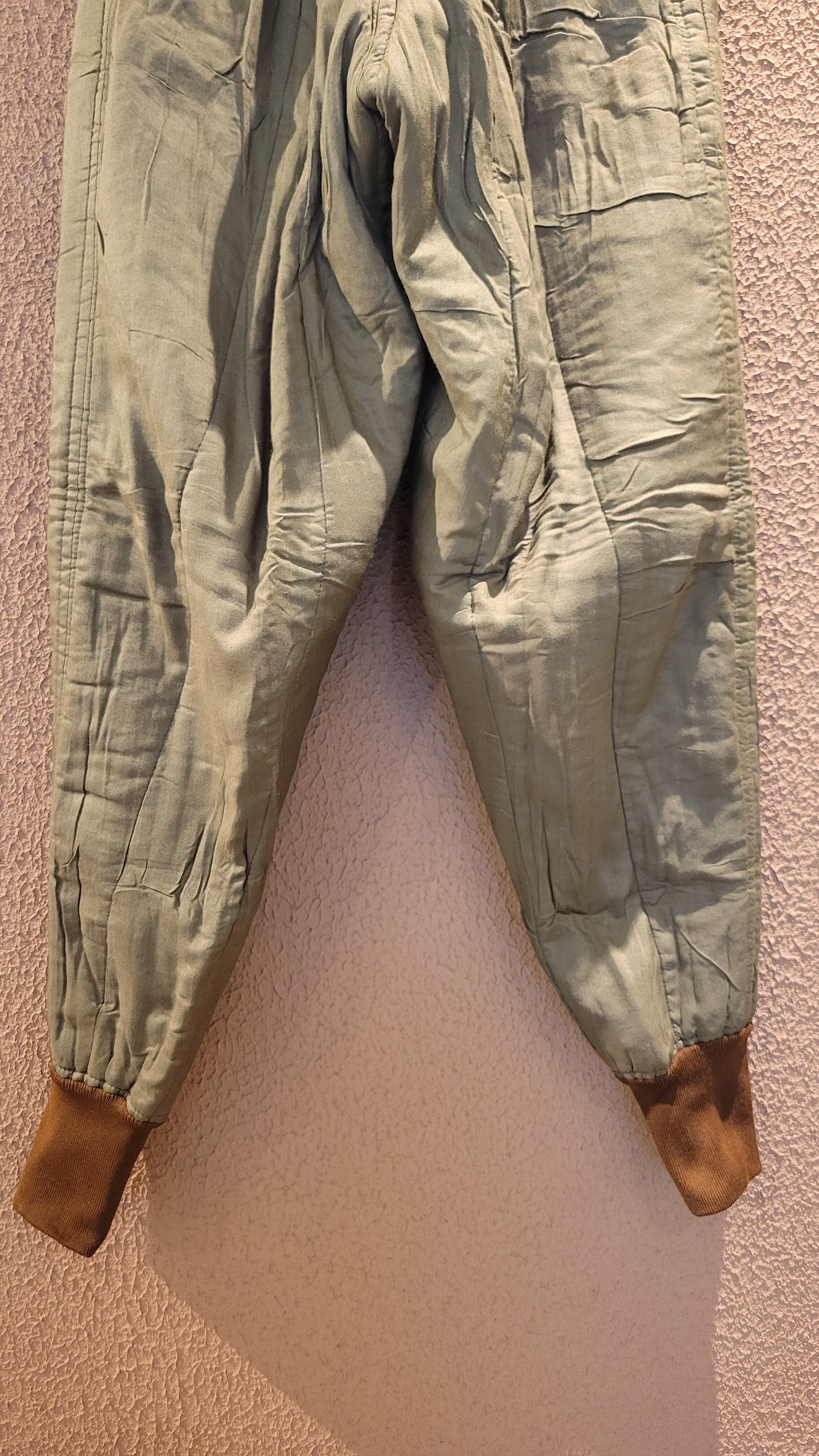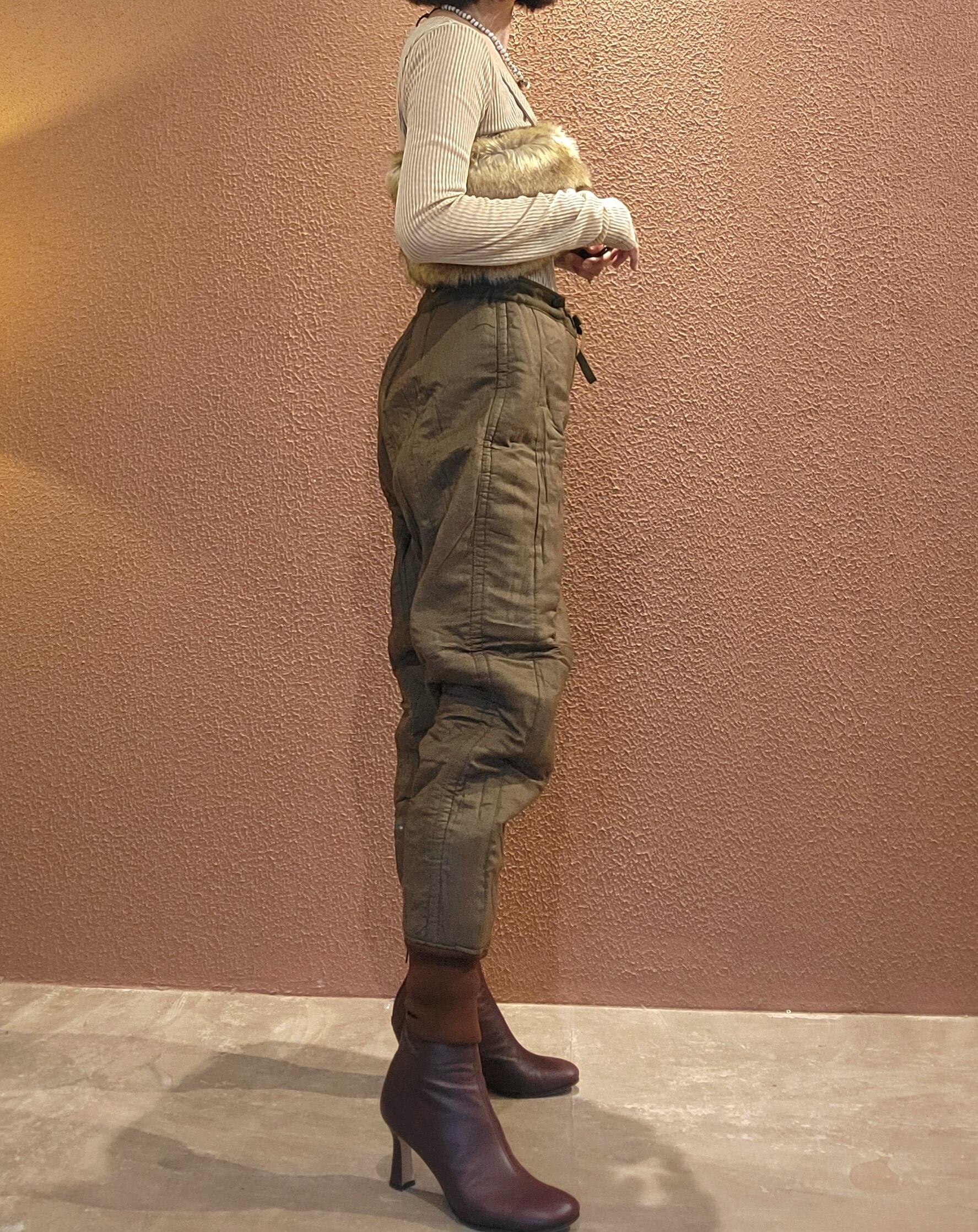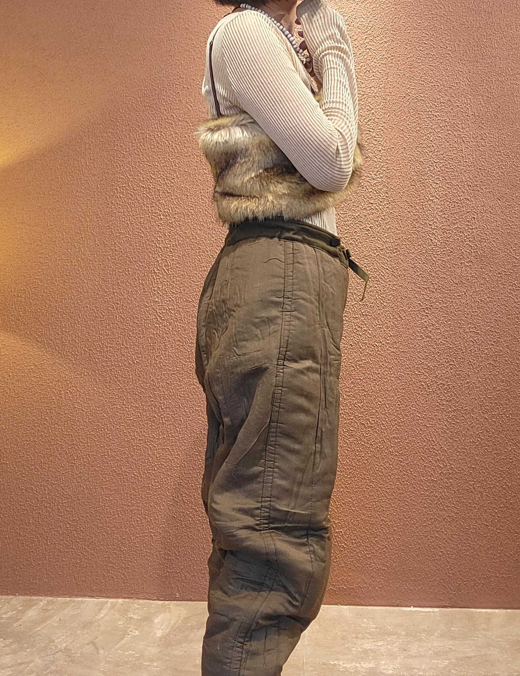 デッドストックのチェコ軍ライナーパンツ。生地は厚手ですが柔らかいコットンで中綿入りのキルティングのため保温性に優れています。ウエストはコードで調整可能。サスペンダー用のボタンが4つ付いています。裾はリブで体温を逃しにくい仕様になっています。機能性とファッション性を兼ね備えた1本。